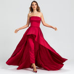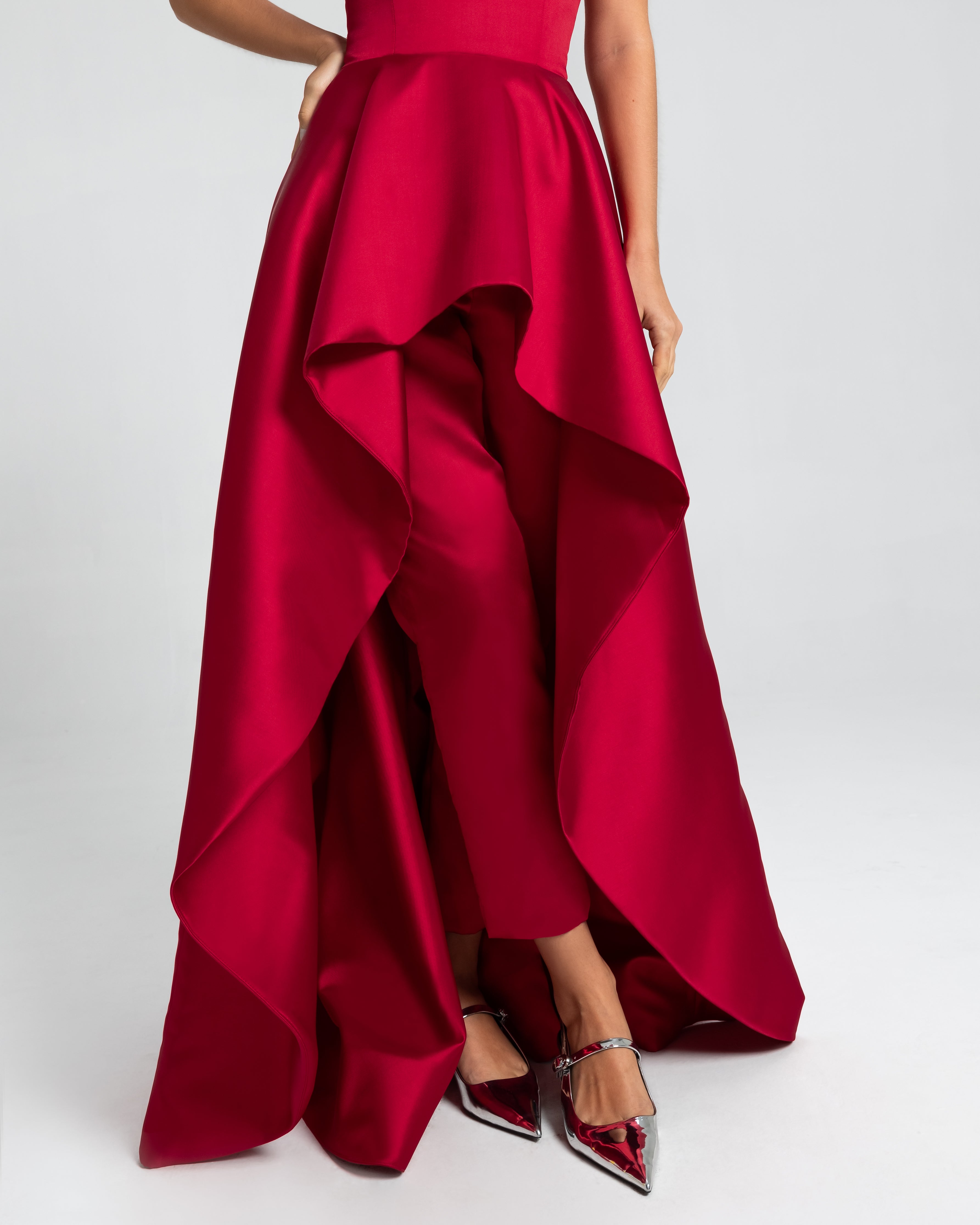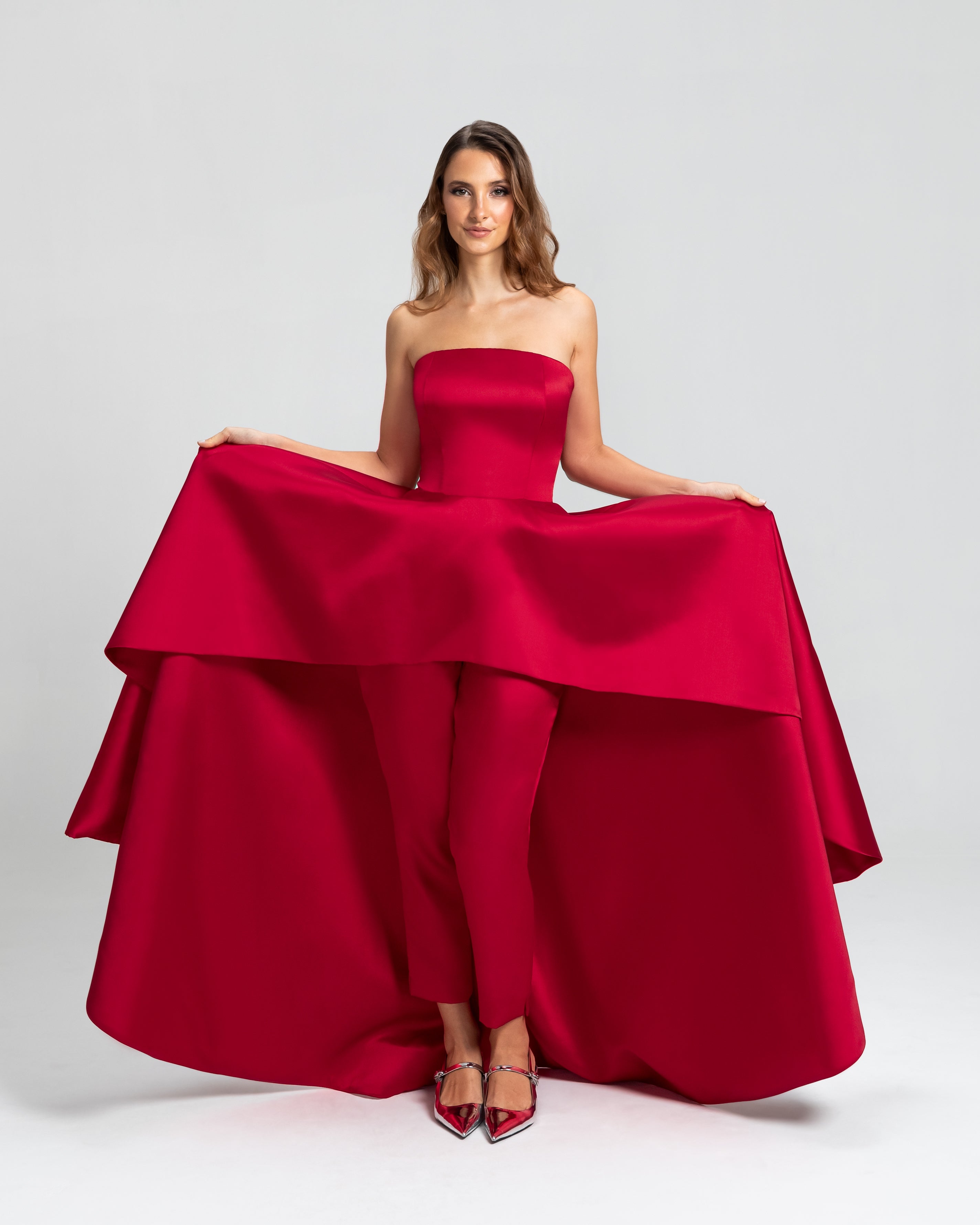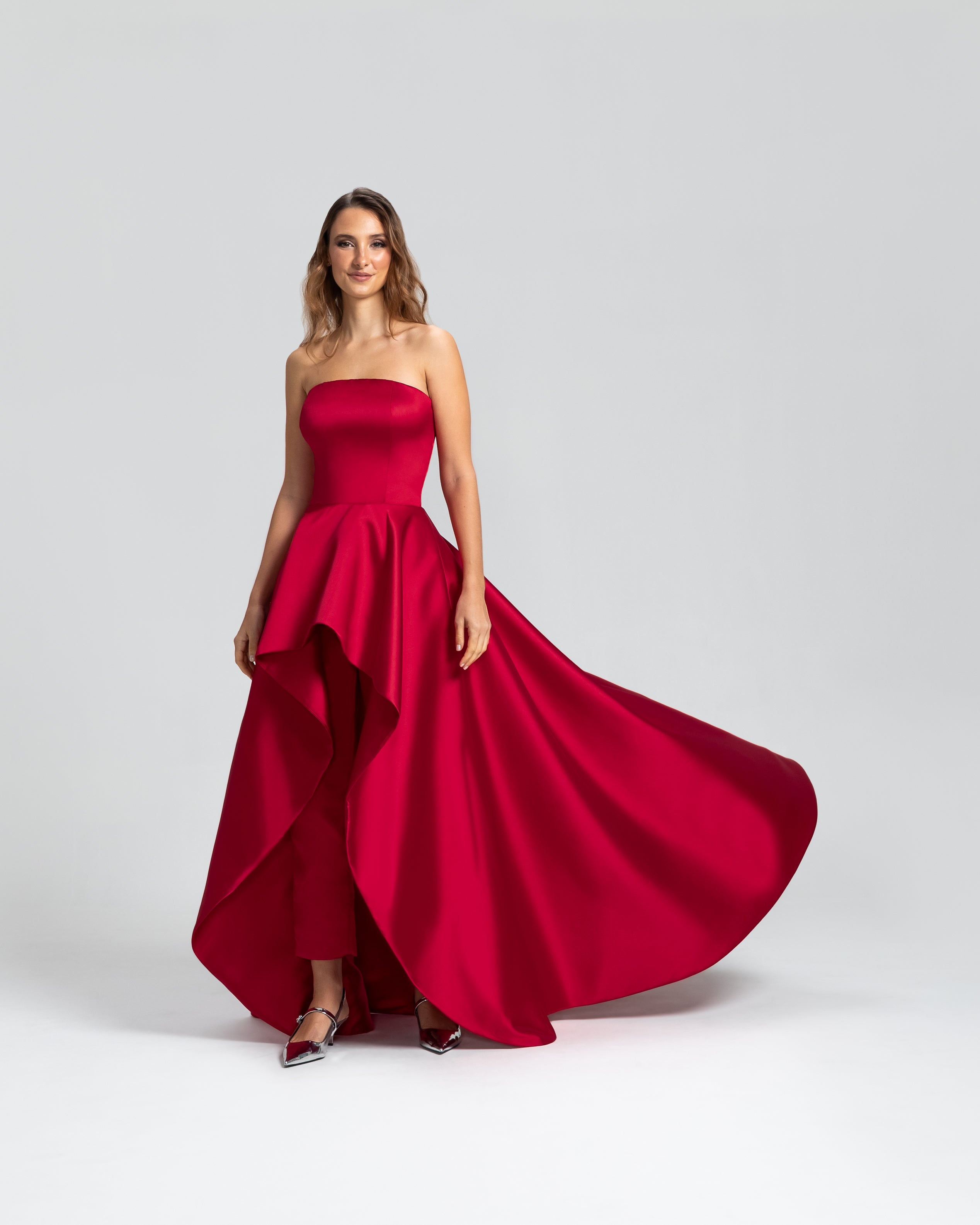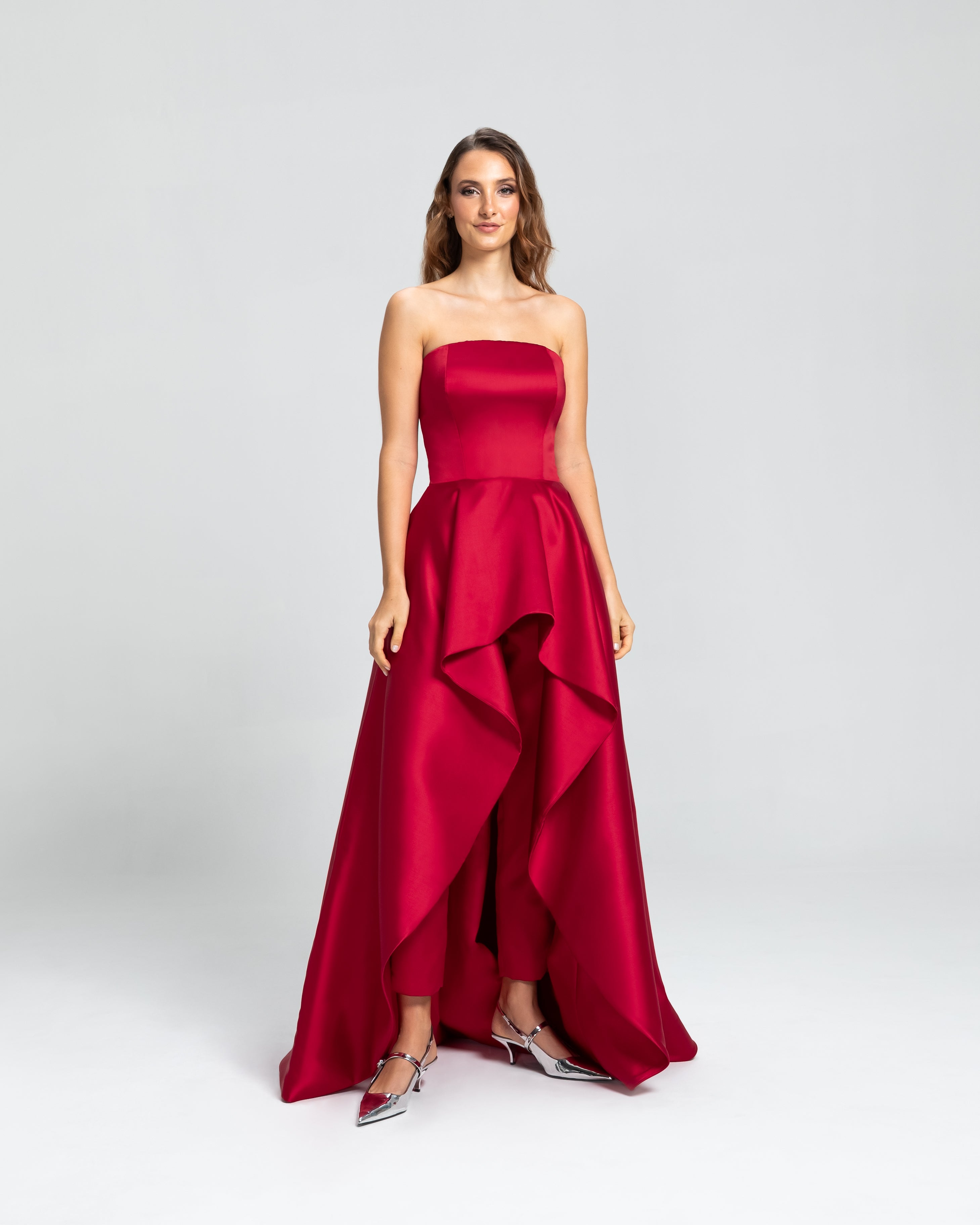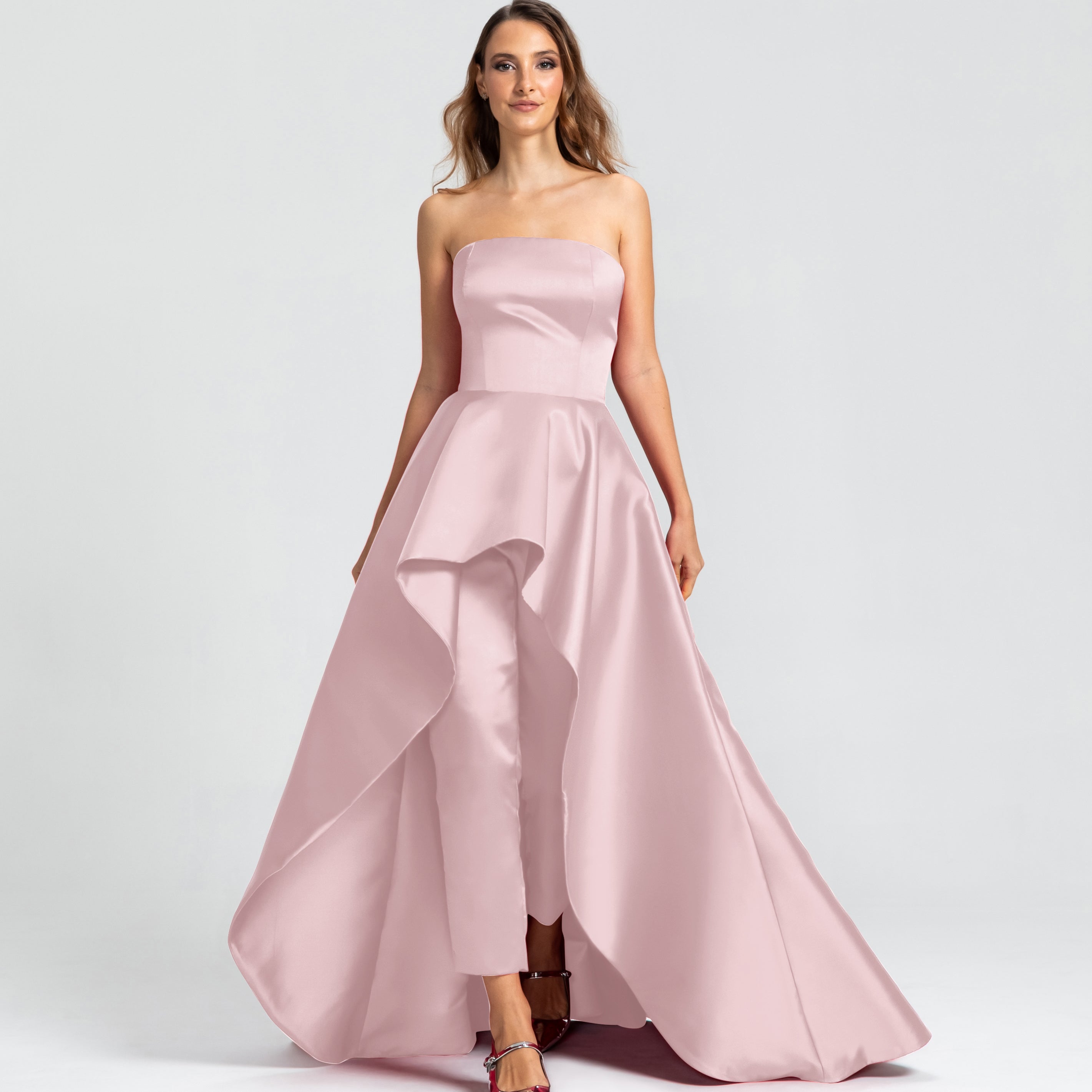 Este modelo é super irreverente! Visualmente é um vestido ou um macacão, mas sua construção é separada em duas peças. A parte de cima tem um decote tomara que caia e o corpo ajustado, a cintura marcada que realça a silhueta. Acompanhado de uma calça que aparece na parte frontal do vestido, enquanto a parte de trás se estende até o chão, oferecendo conforto e um visual surpreendente. Perfeito para quem busca ousadia e um toque fashionista sem abrir mão do bem-estar.