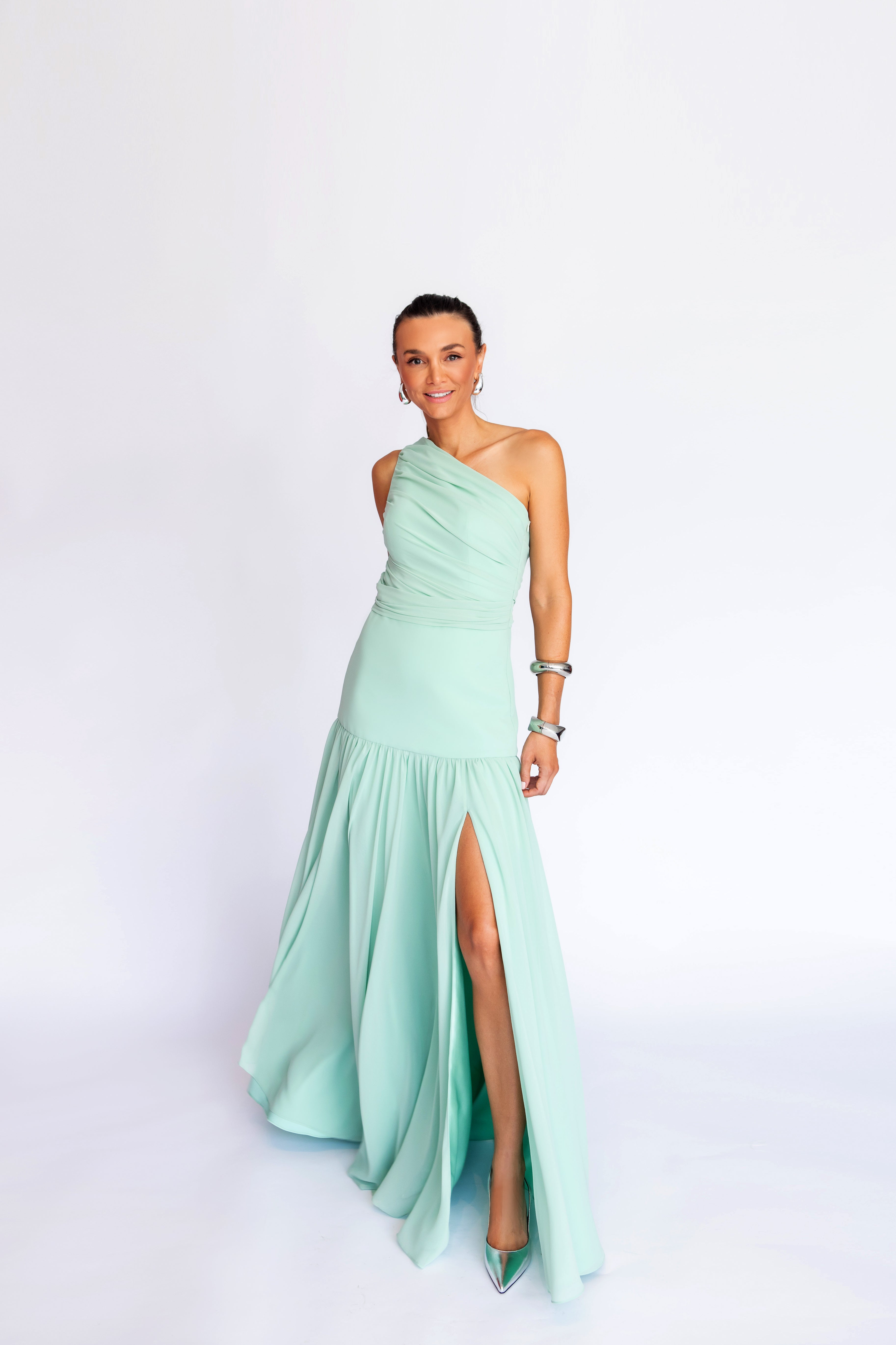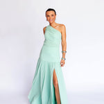 Vestido Longo Drapeado Assimétrico em Musselina Fluida com Fenda – REF: EG03.SM