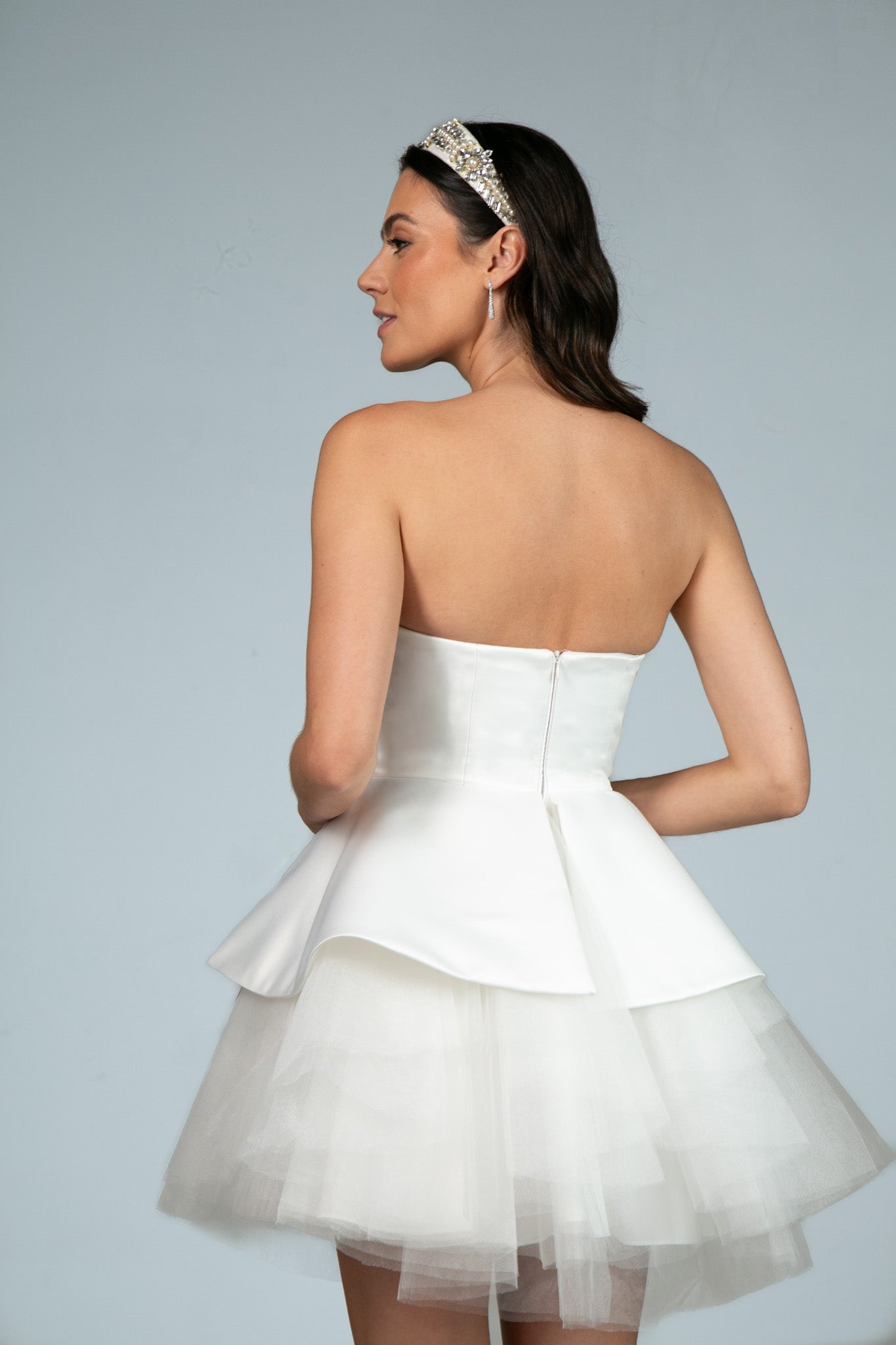 Uma versão curta e surpreendente para noivas ousadas. Este modelo mini mantém o corpo em zibeline com recortes marcantes e bicos que criam um visual moderno e cheio de personalidade. A saia peplum estruturada forma um volume escultural, que sobrepõe camadas de tule em pontas, criando movimento e leveza mesmo no comprimento curto. Ideal para quem quer brilhar com originalidade em um look autoral e inesquecível.