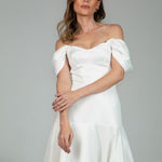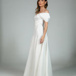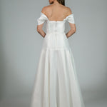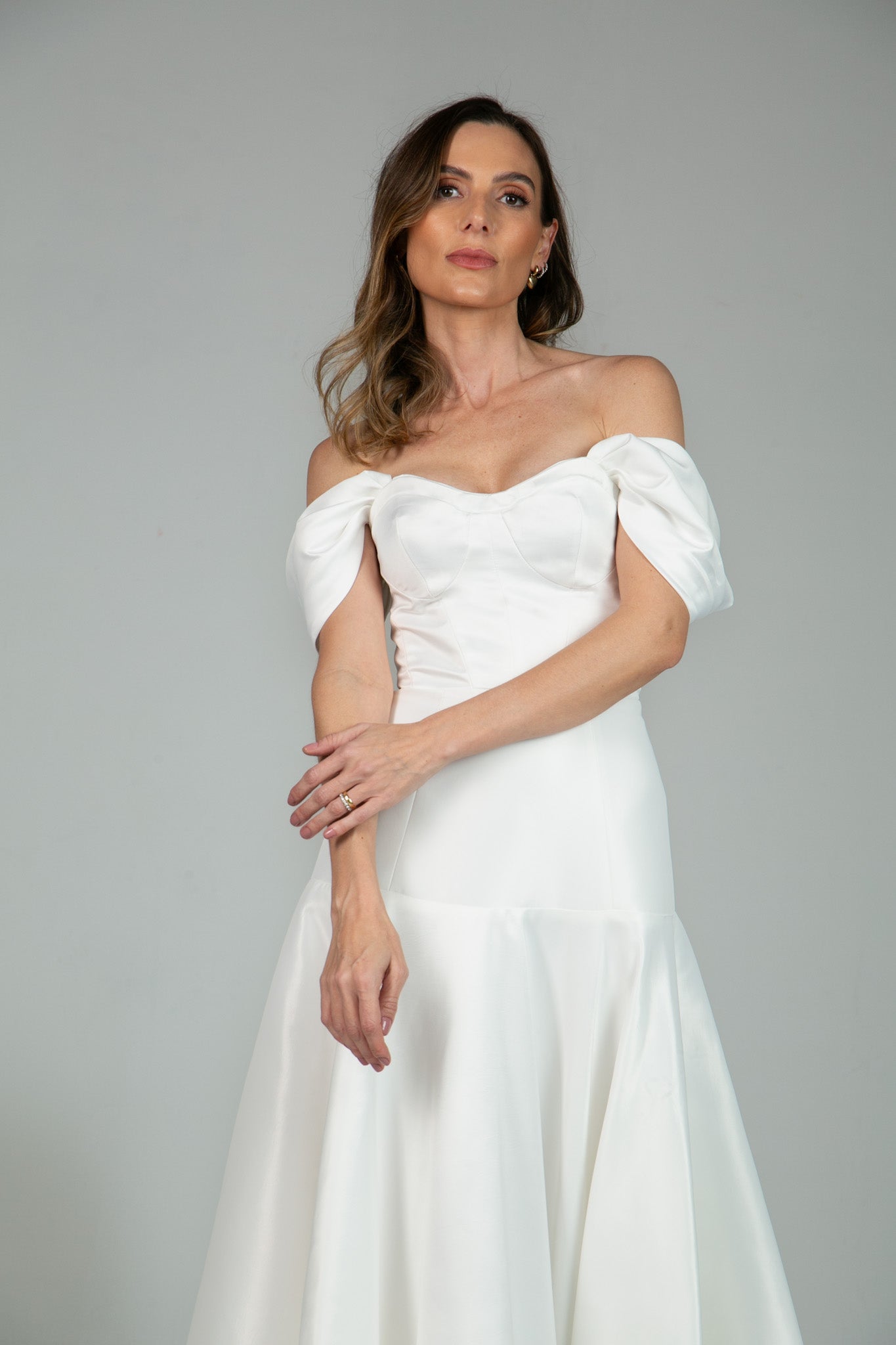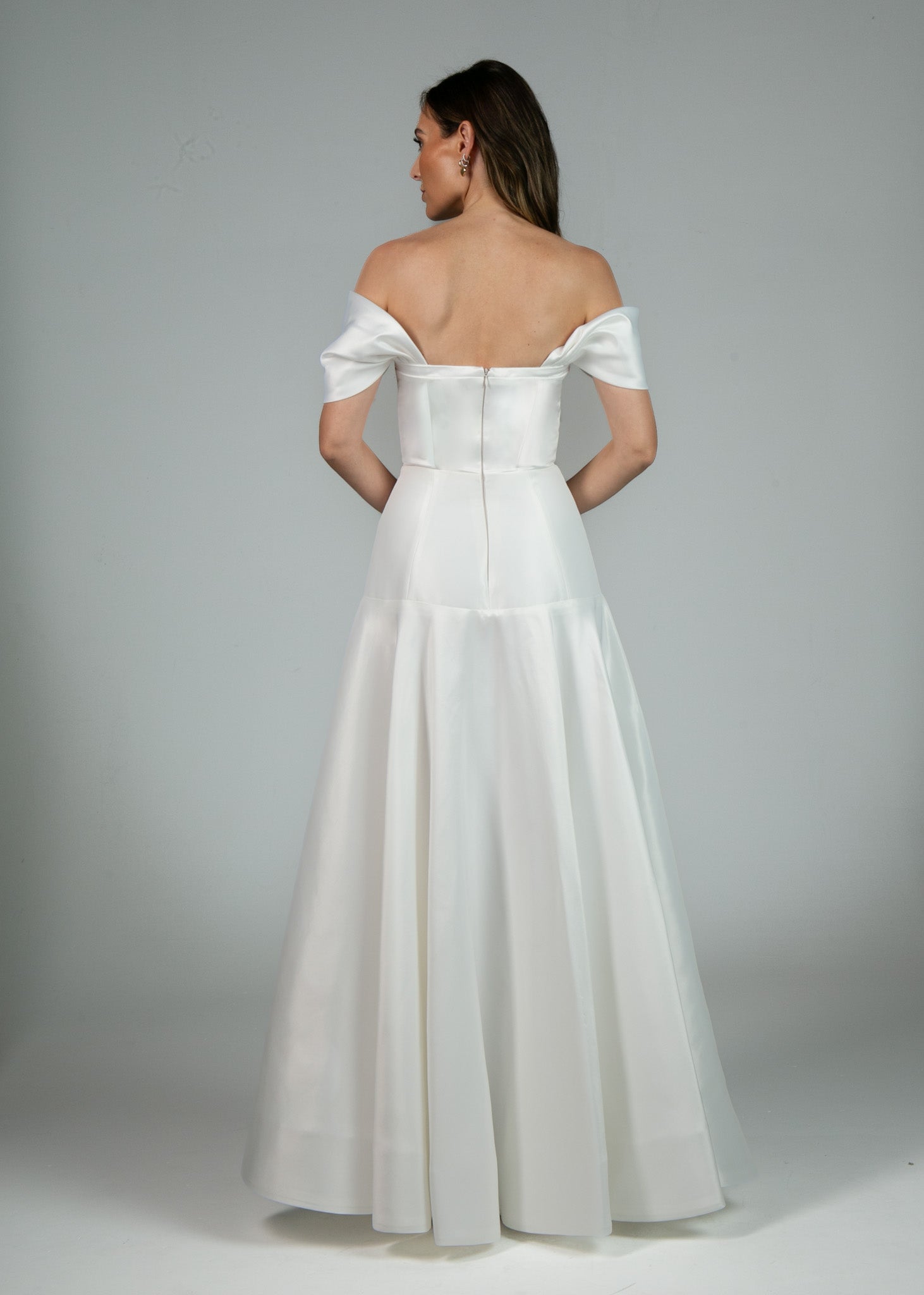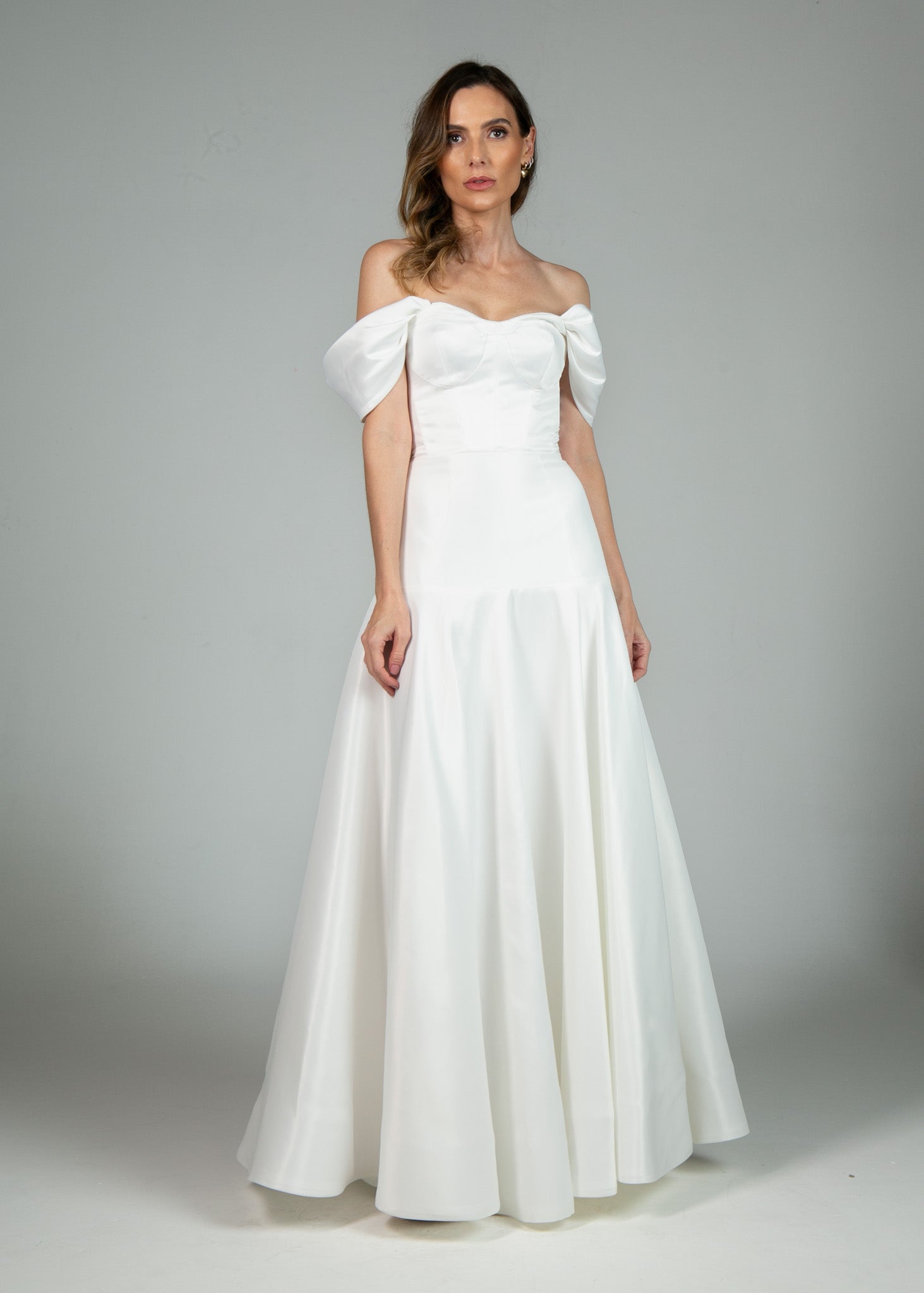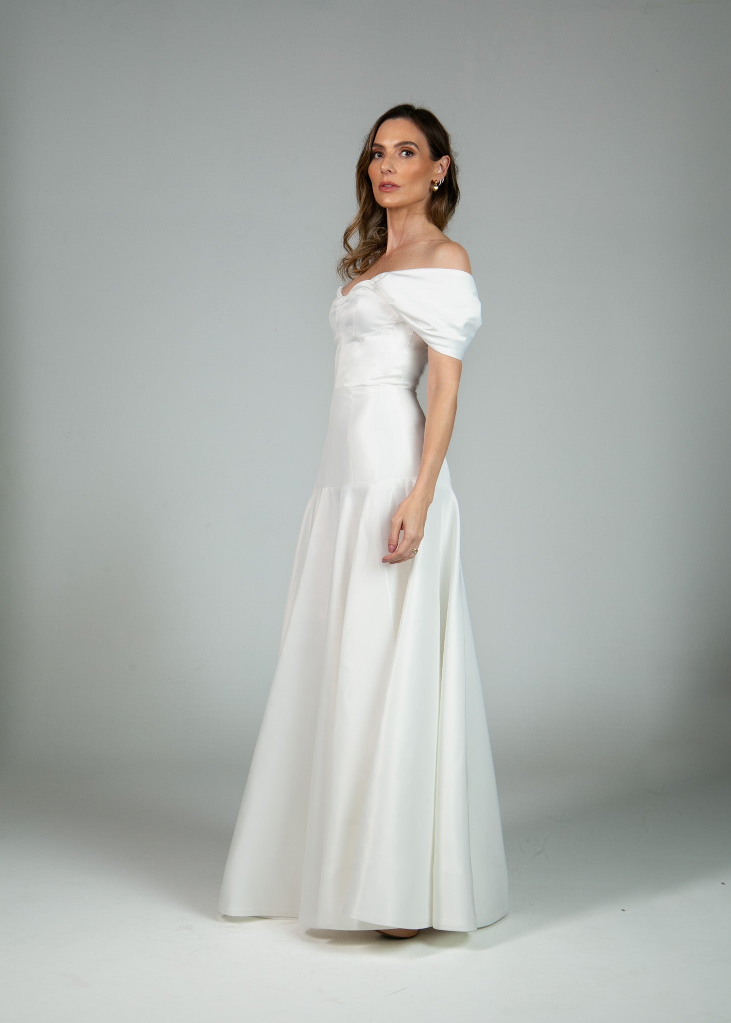 Uma peça magnífica que une sofisticação e um corte impecável. O corpo em forma de corselet, ajustado com precisão, modela a silhueta e valoriza o colo com mangas caídas que formam um elegante decote ombro a ombro. A saia ampla se abre suavemente abaixo do cadeirão, criando um visual equilibrado, romântico e imponente. Ideal para noivas que desejam elegância clássica com um toque de feminilidade marcante.