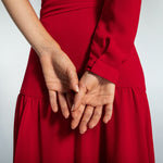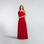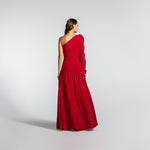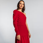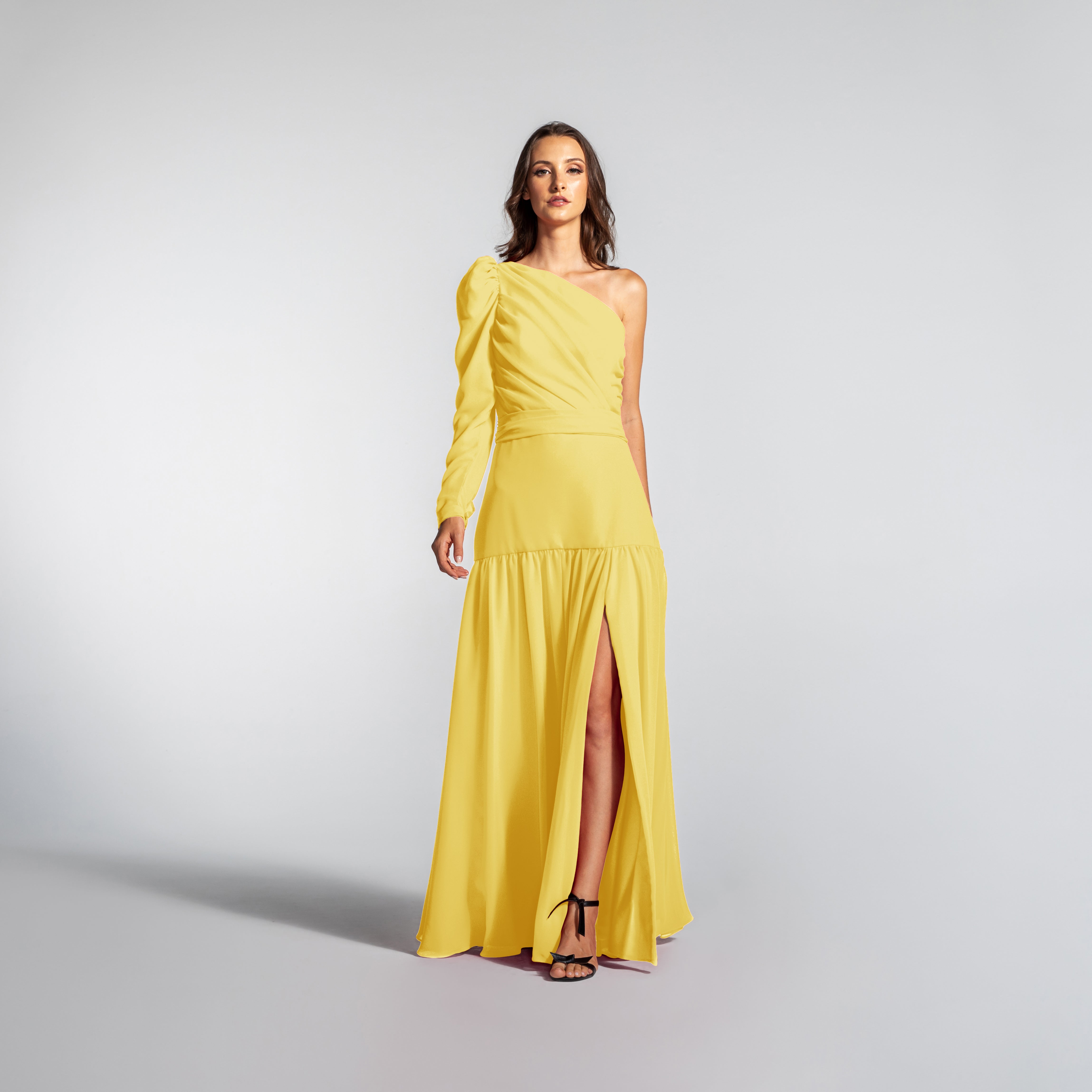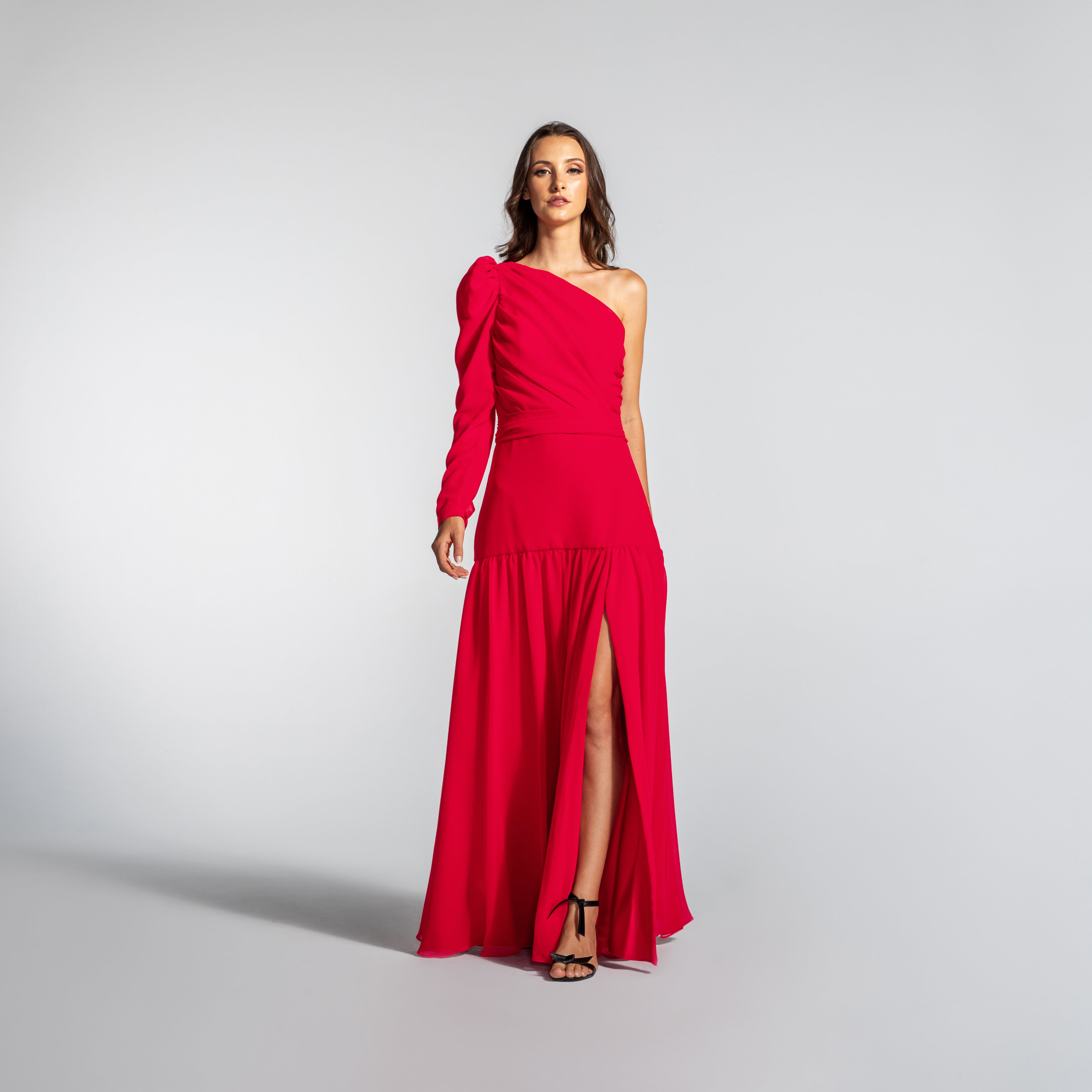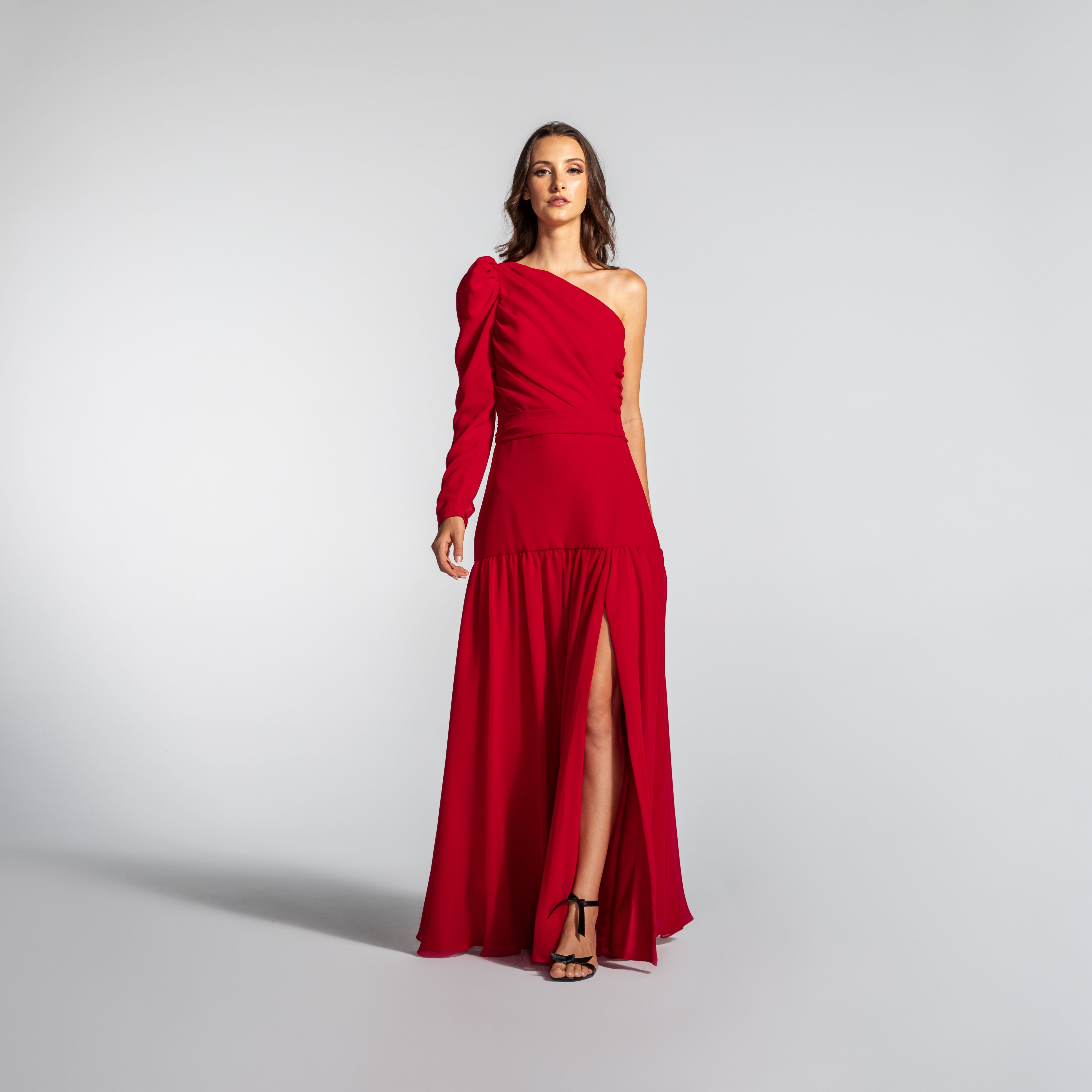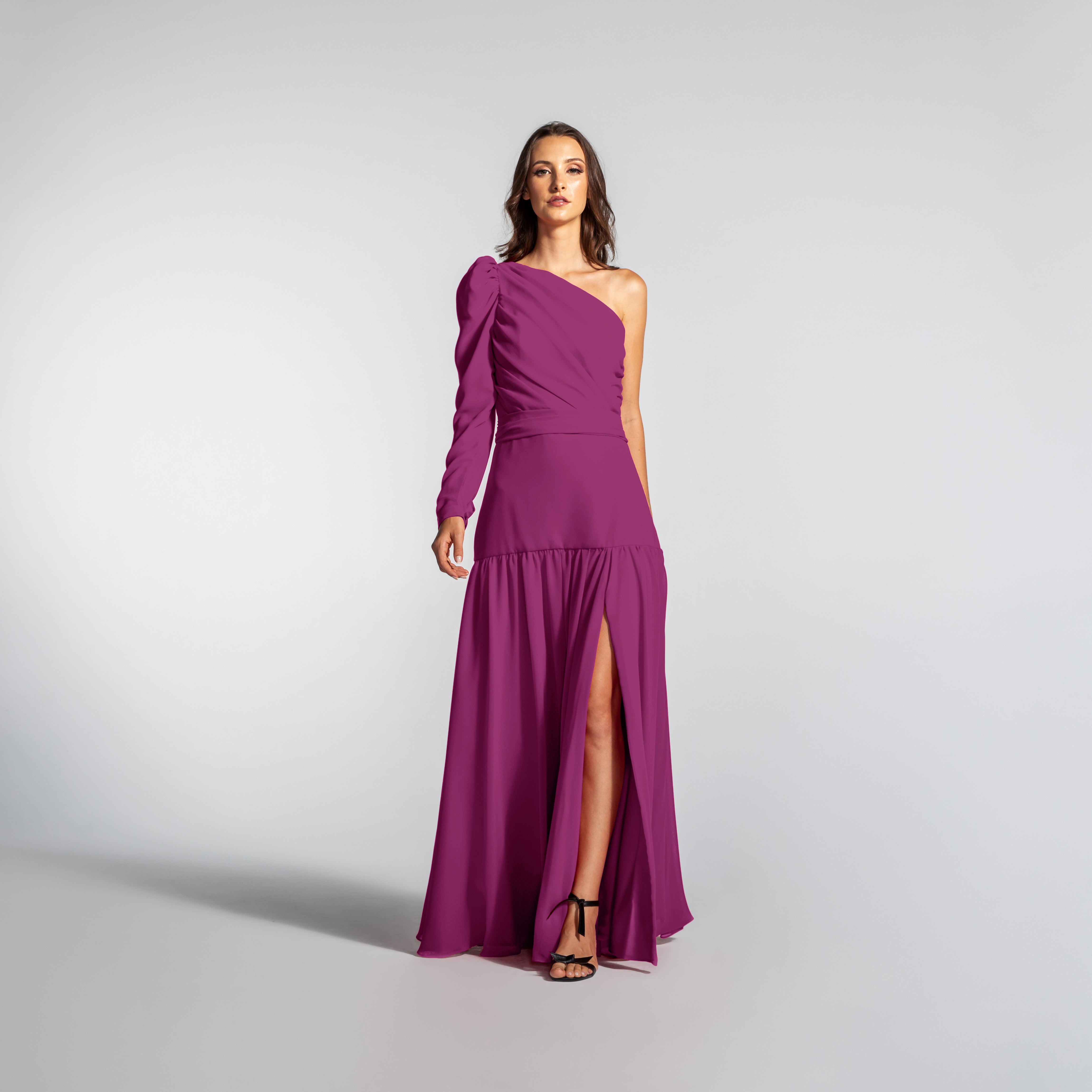 Uma peça única e irreverente. O decote assimétrico com uma manga longa cria um design moderno, enquanto o corpo todo drapeado valoriza a silhueta com cintura marcada e cadeirão ajustado. A saia ampla em godê fluido, complementada por uma fenda elegante, garante movimento e leveza. Perfeito para quem deseja um look ousado e sofisticado.