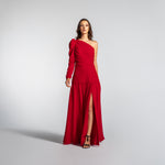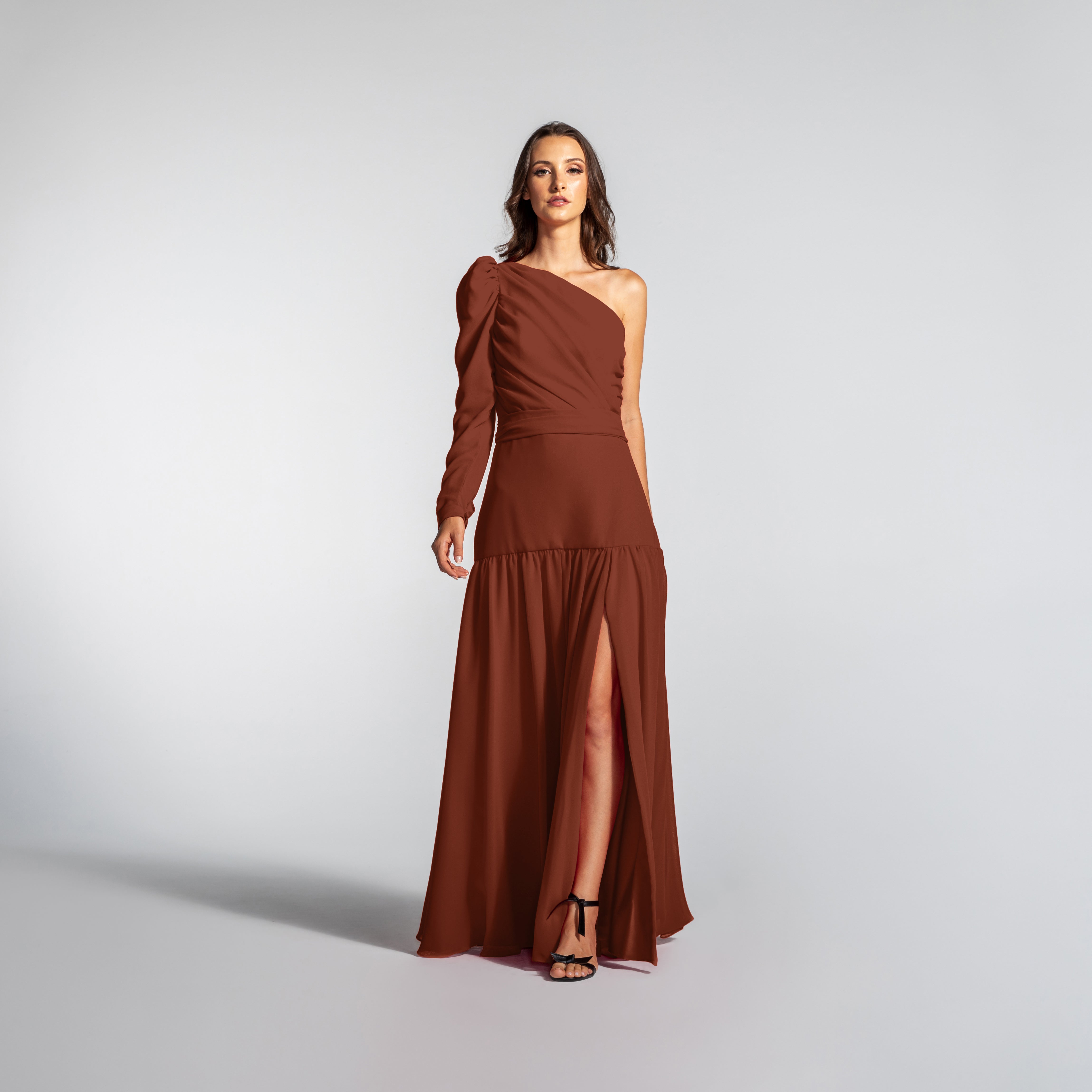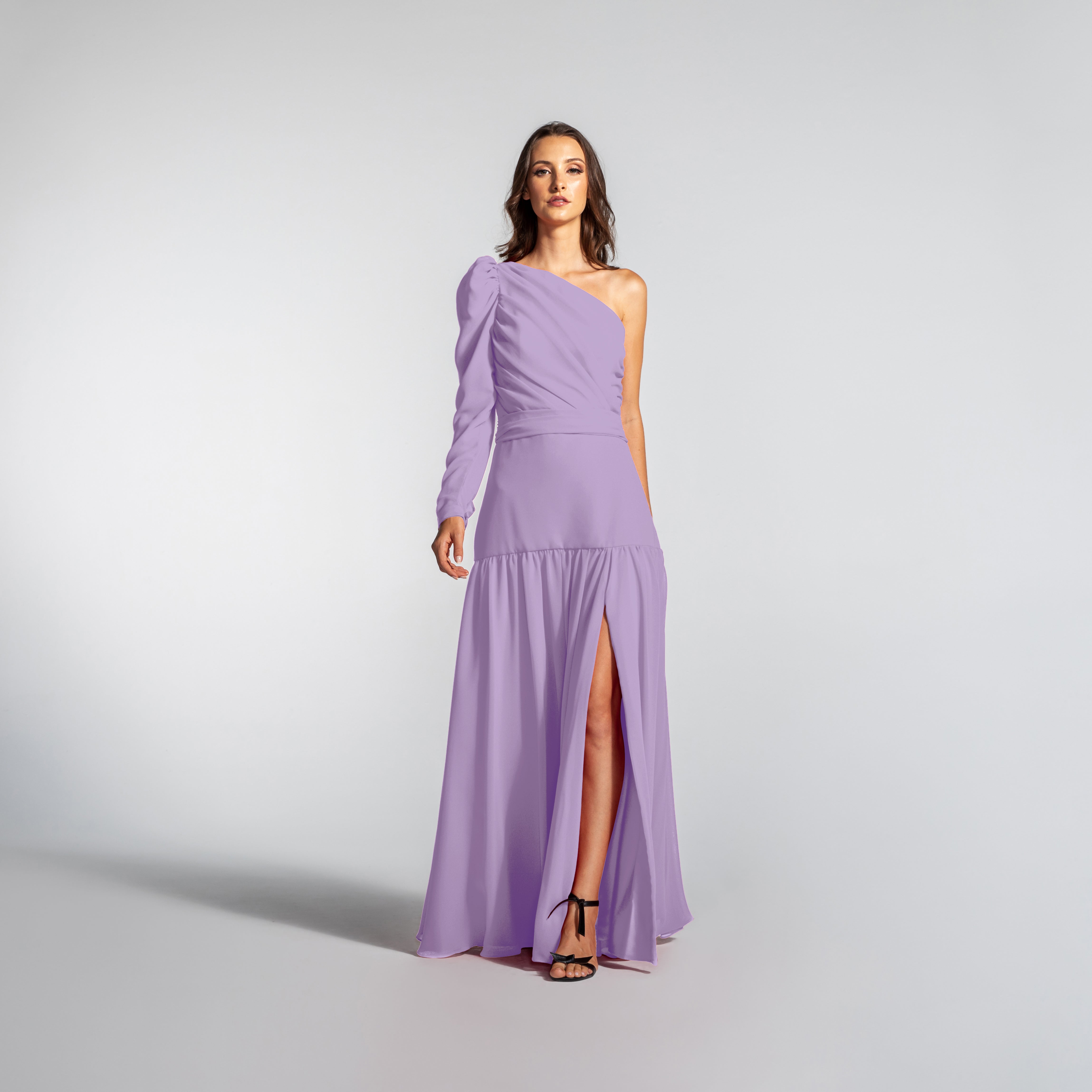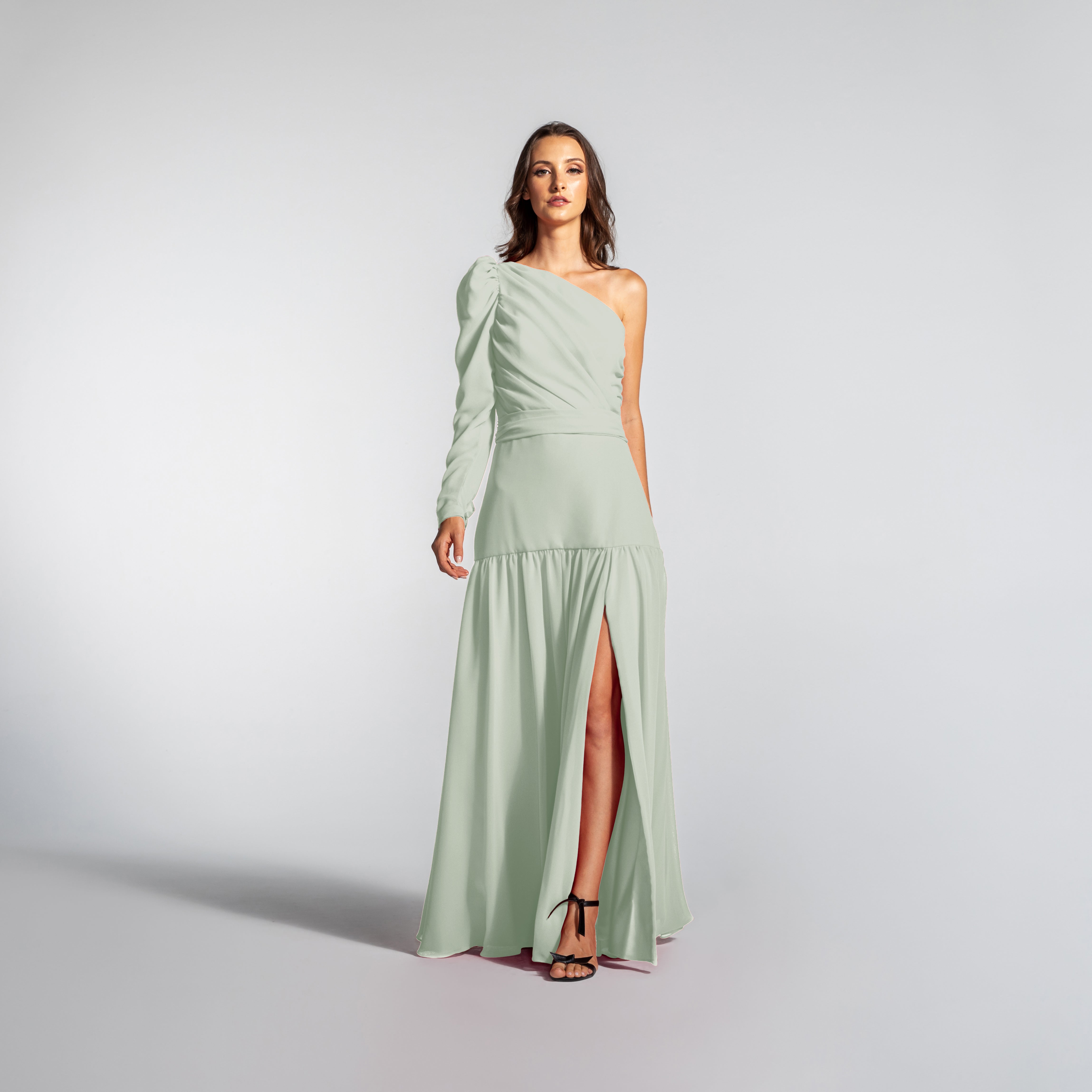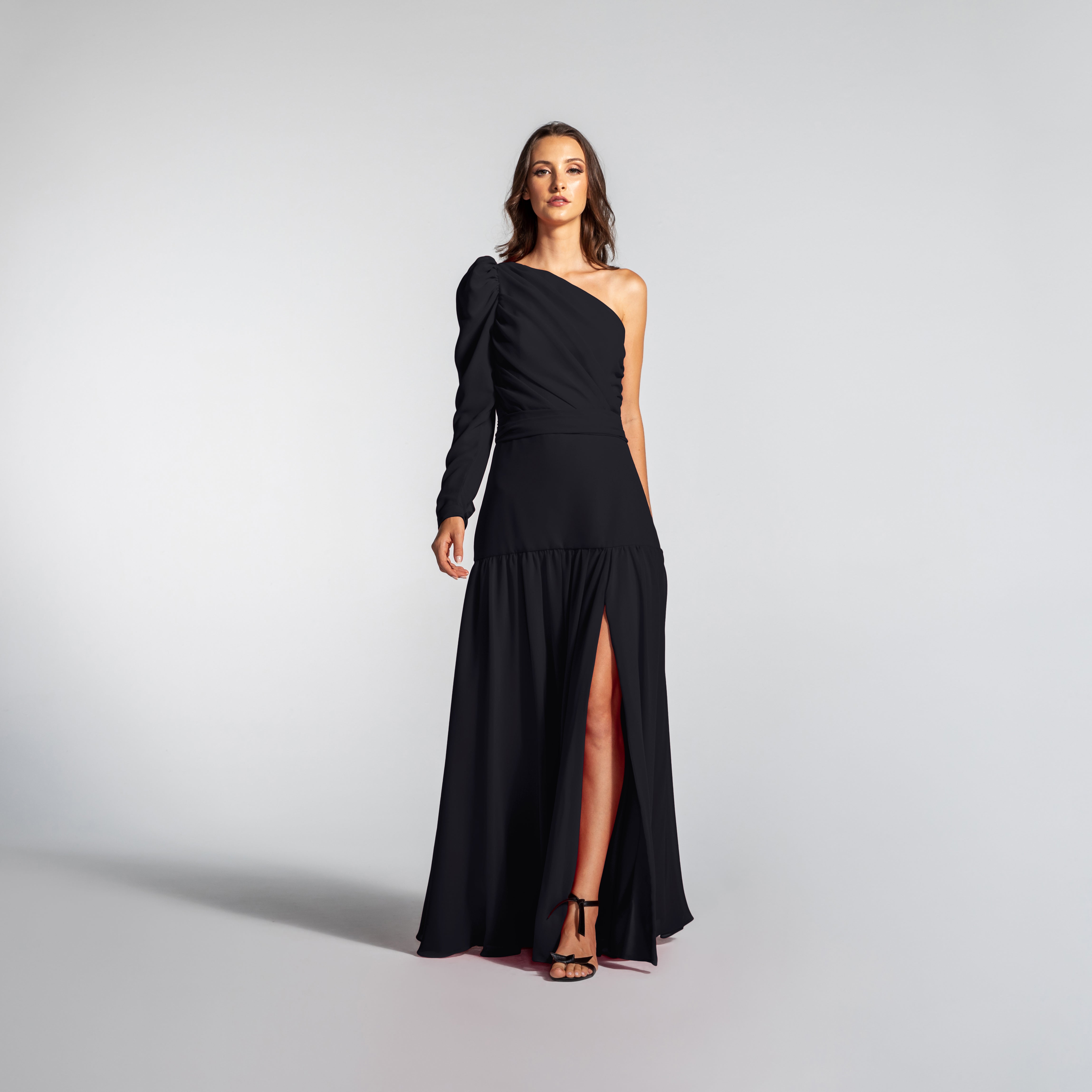 Vestido Longo Drapeado Assimétrico com Manga Longa em Musselina Fluida com Fenda – REF: EG03