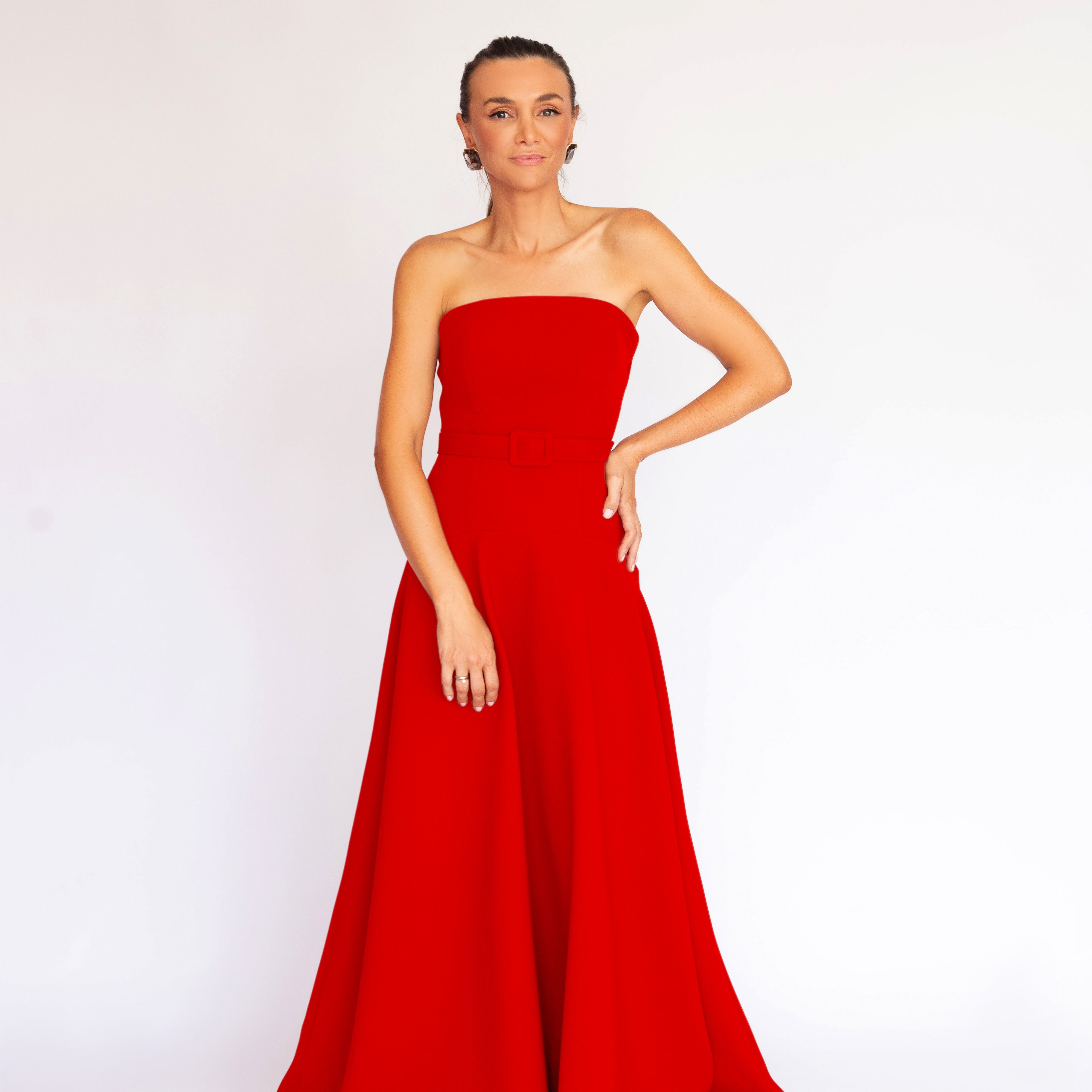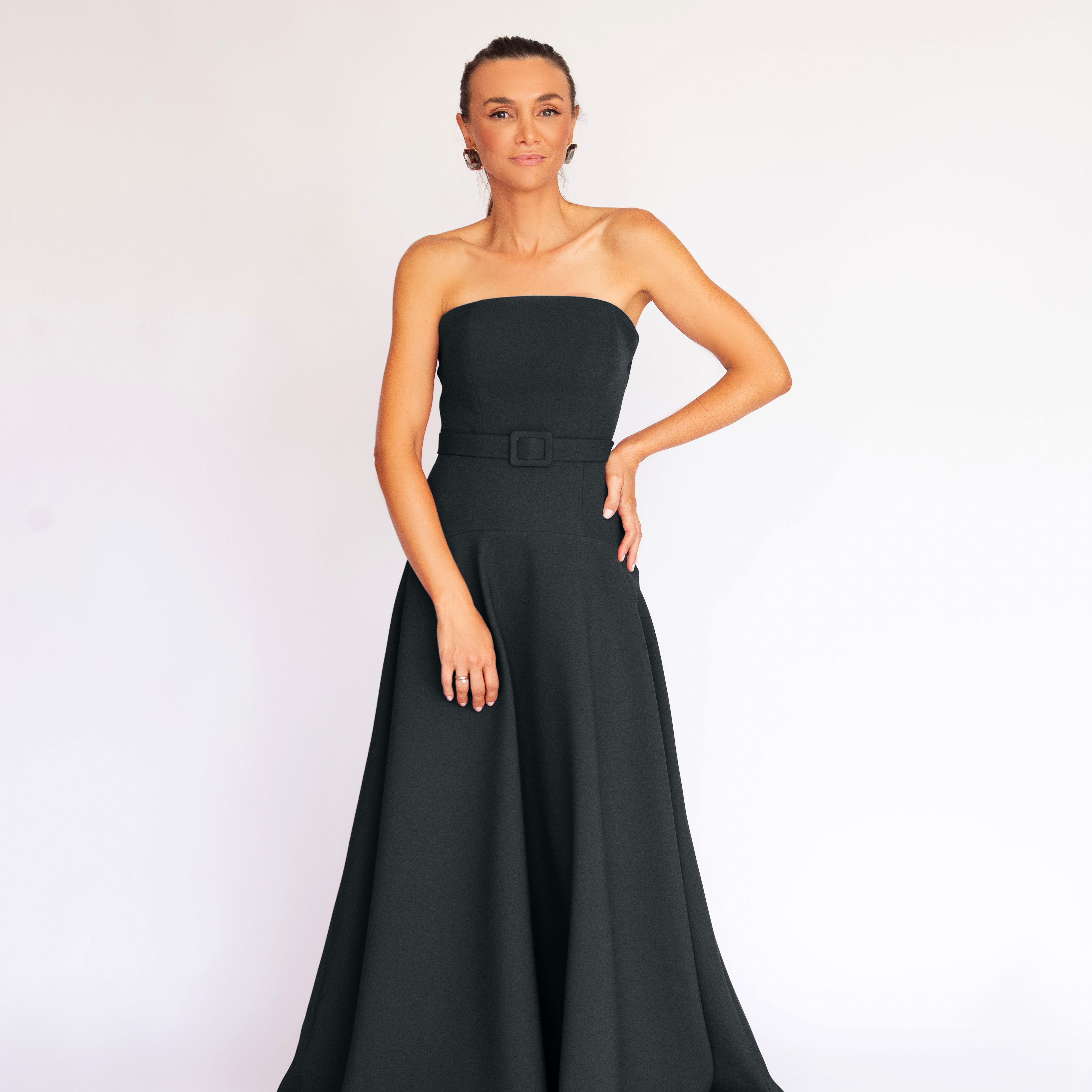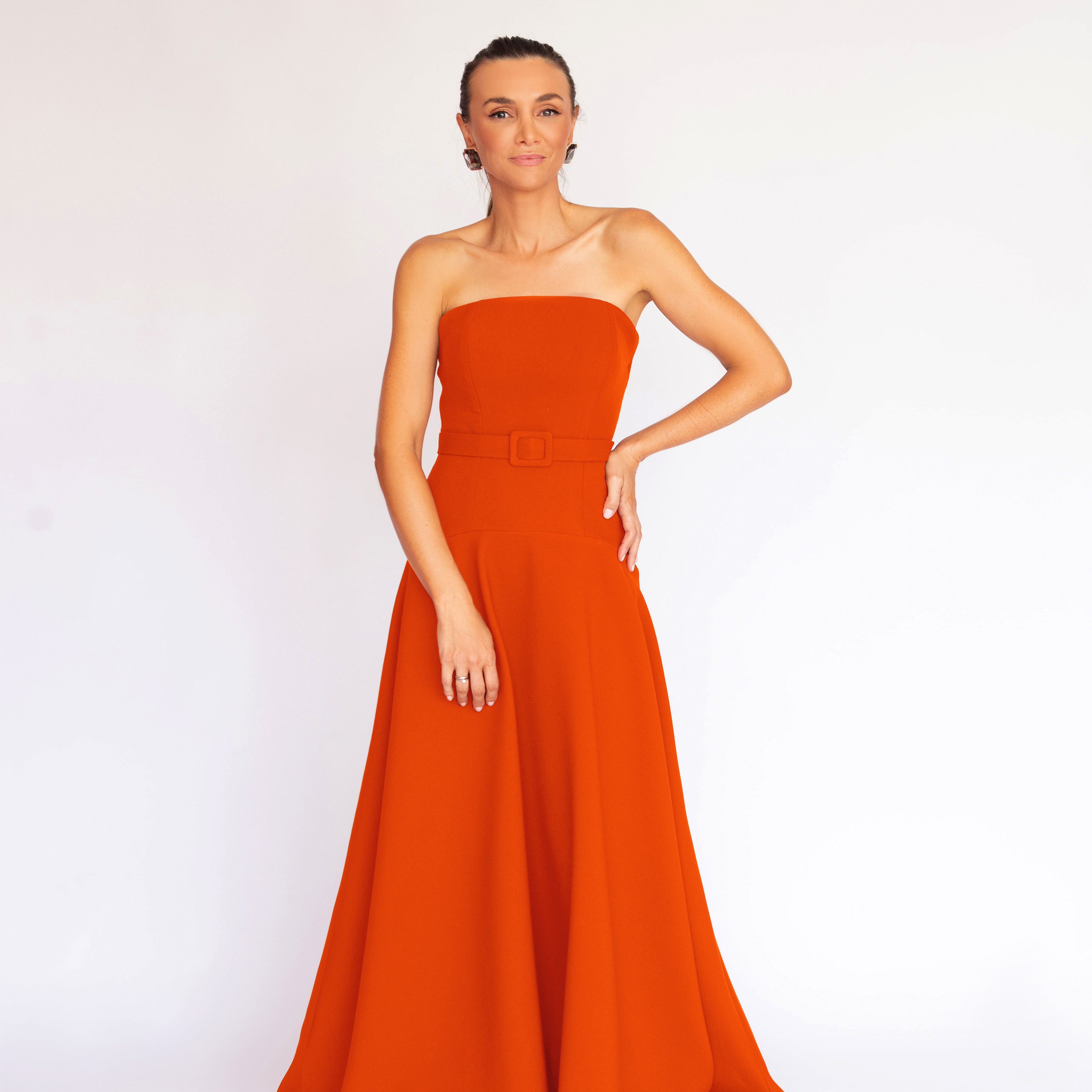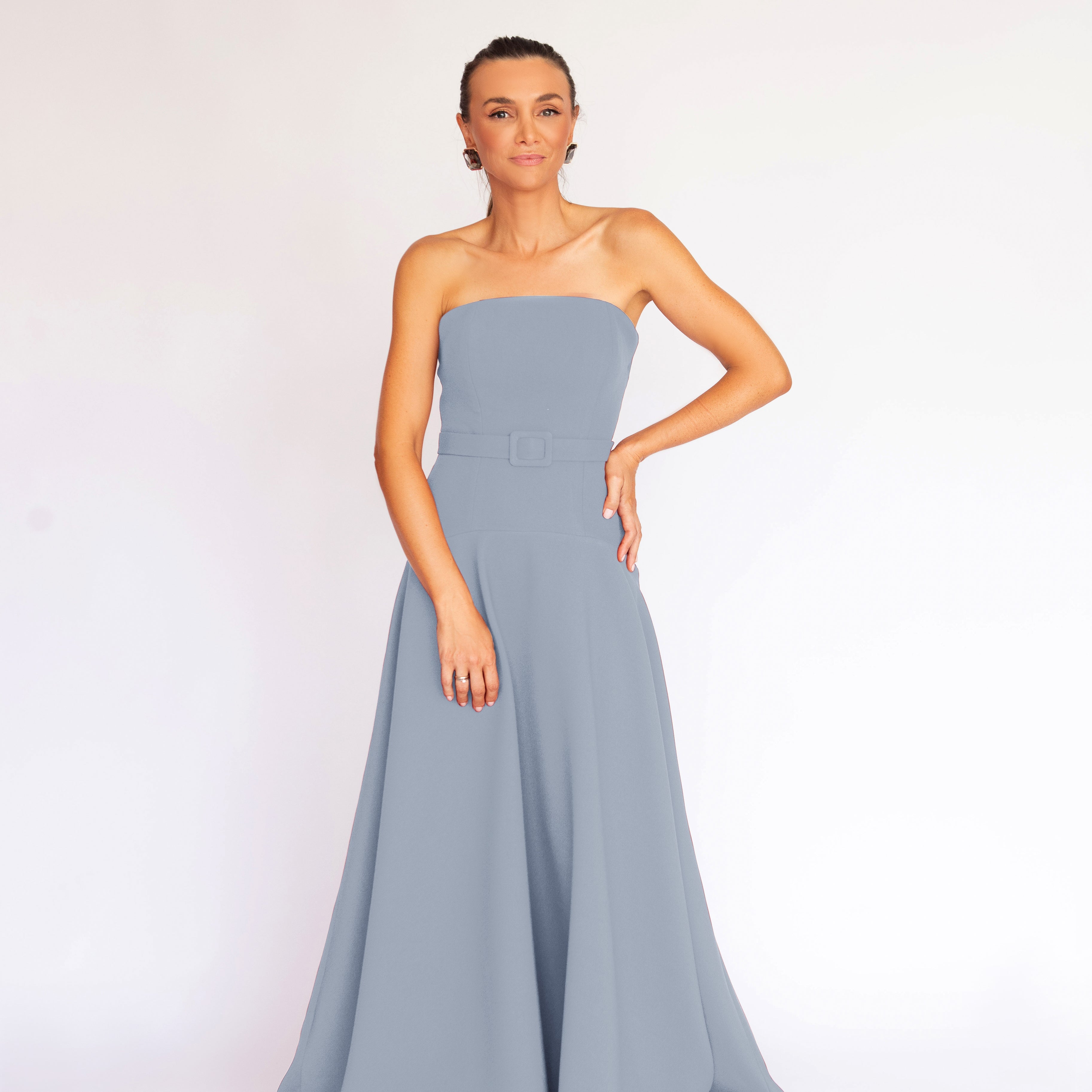 O modelo sucesso em zibeline (OD63) agora na versão fosca. Este vestido apresenta um decote tomara que caia e um corpo ajustado, com a cintura levemente baixa e acentuada por um cinto forrado que define as curvas com delicadeza. A saia godê se abre de forma ampla, proporcionando um visual elegante e cheio de movimento. Uma peça sofisticada, ideal para mulheres que valorizam elegância e estilo sem excessos.