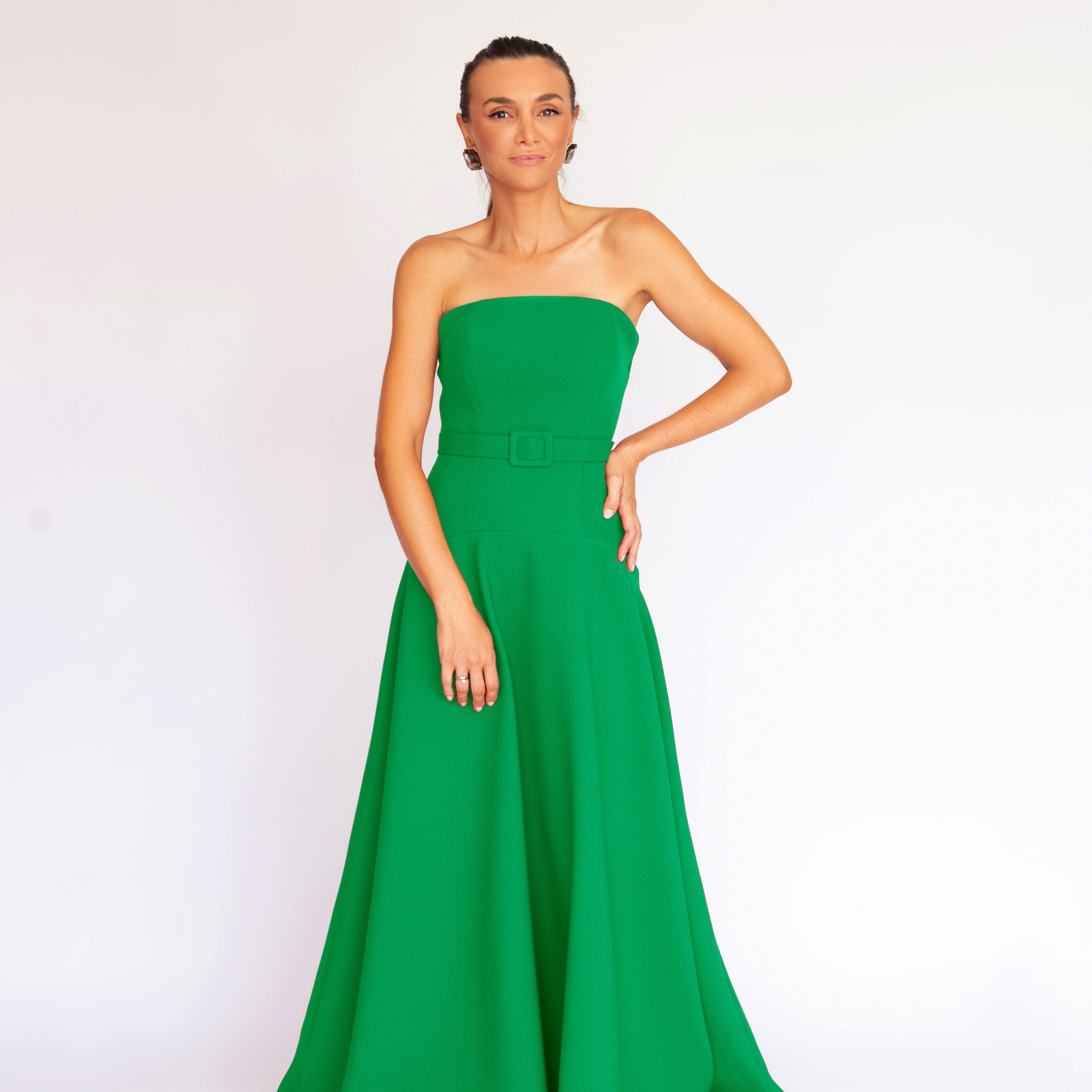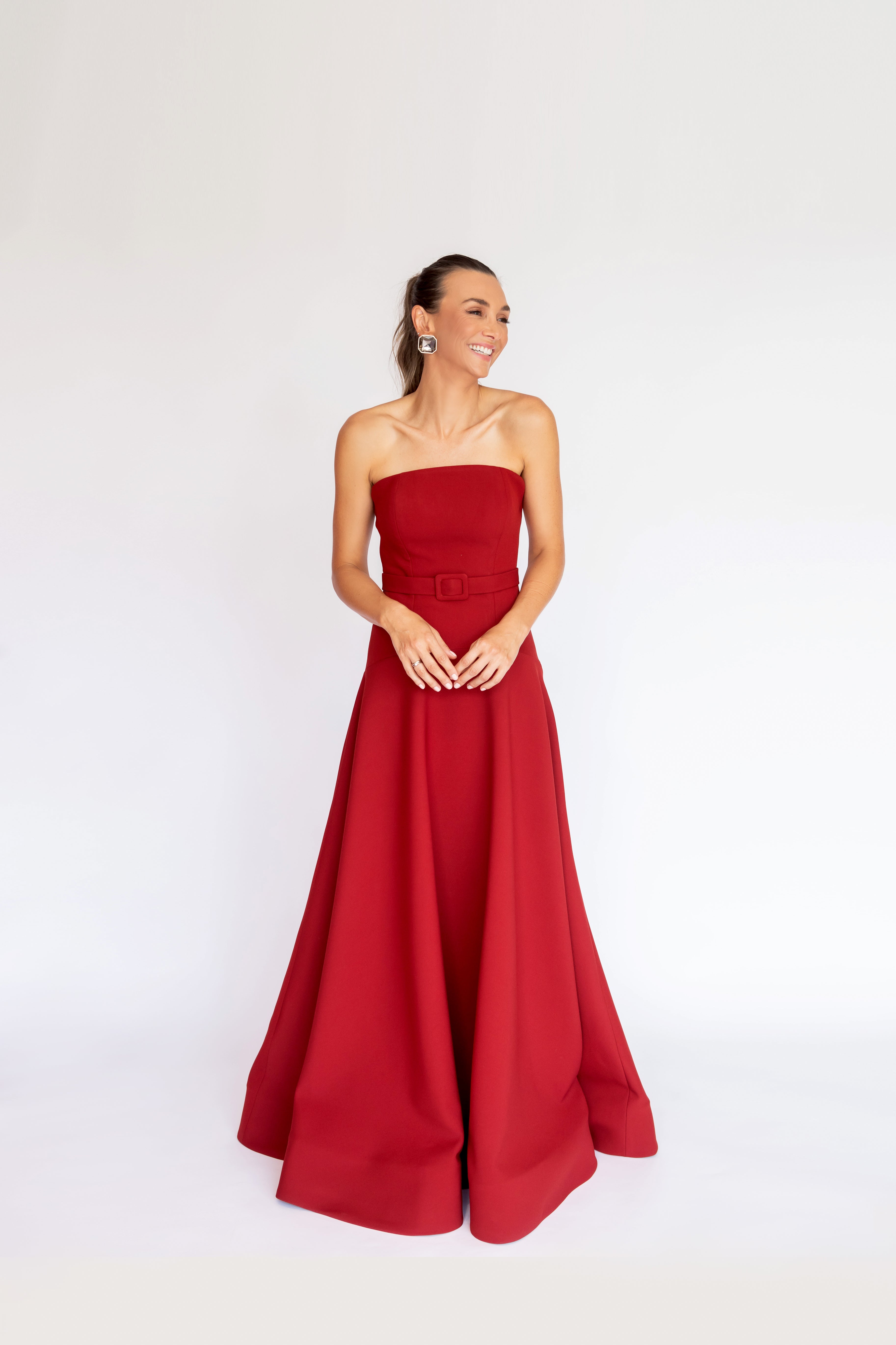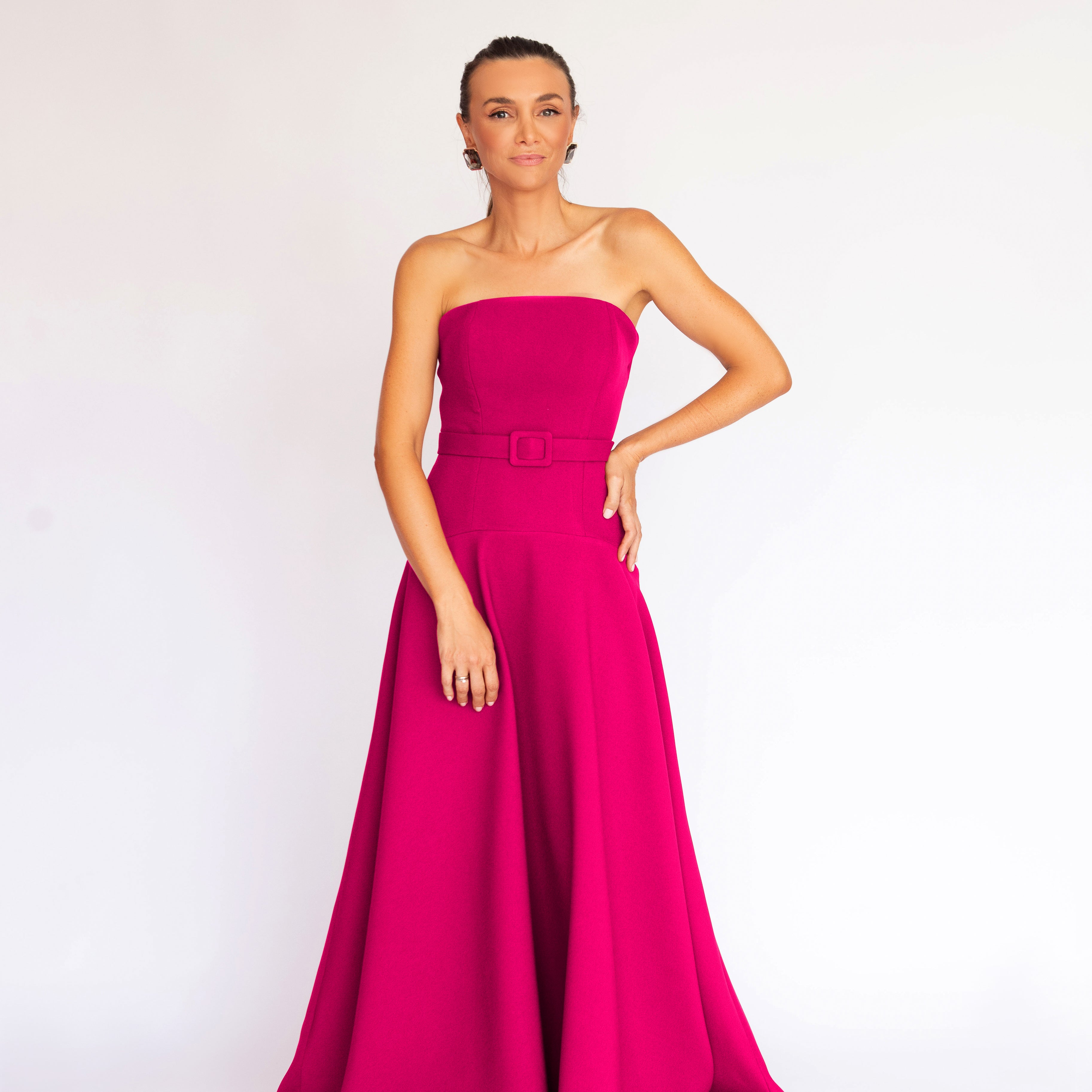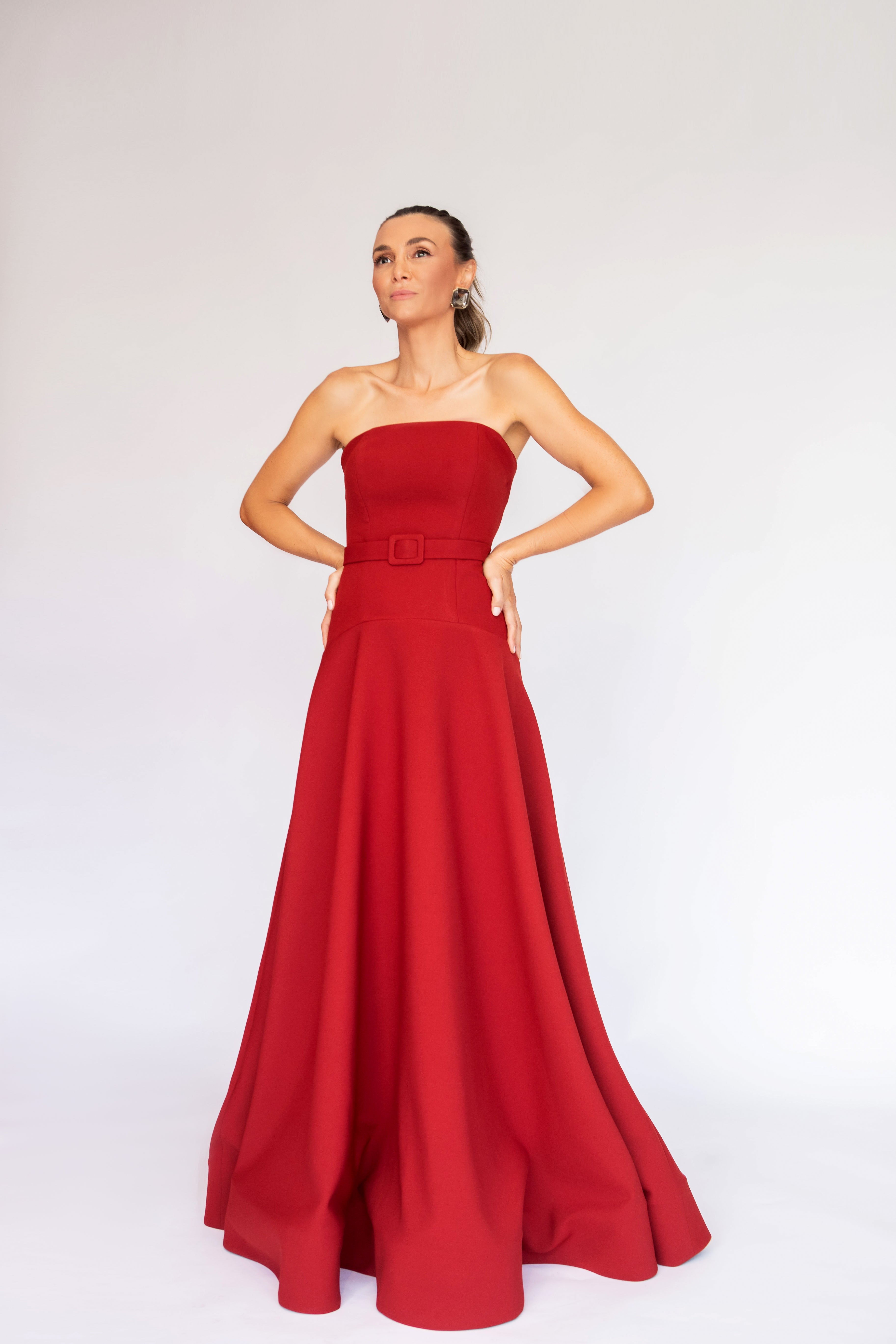 O modelo sucesso em zibeline (OD63) agora na versão fosca. Este vestido apresenta um decote tomara que caia e um corpo ajustado, com a cintura levemente baixa e acentuada por um cinto forrado que define as curvas com delicadeza. A saia godê se abre de forma ampla, proporcionando um visual elegante e cheio de movimento. Uma peça sofisticada, ideal para mulheres que valorizam elegância e estilo sem excessos.