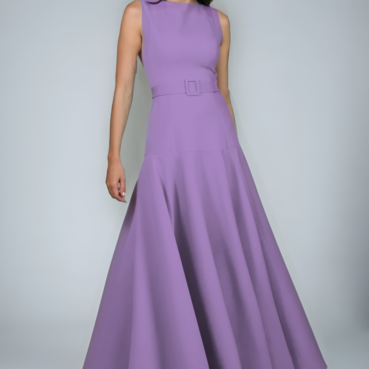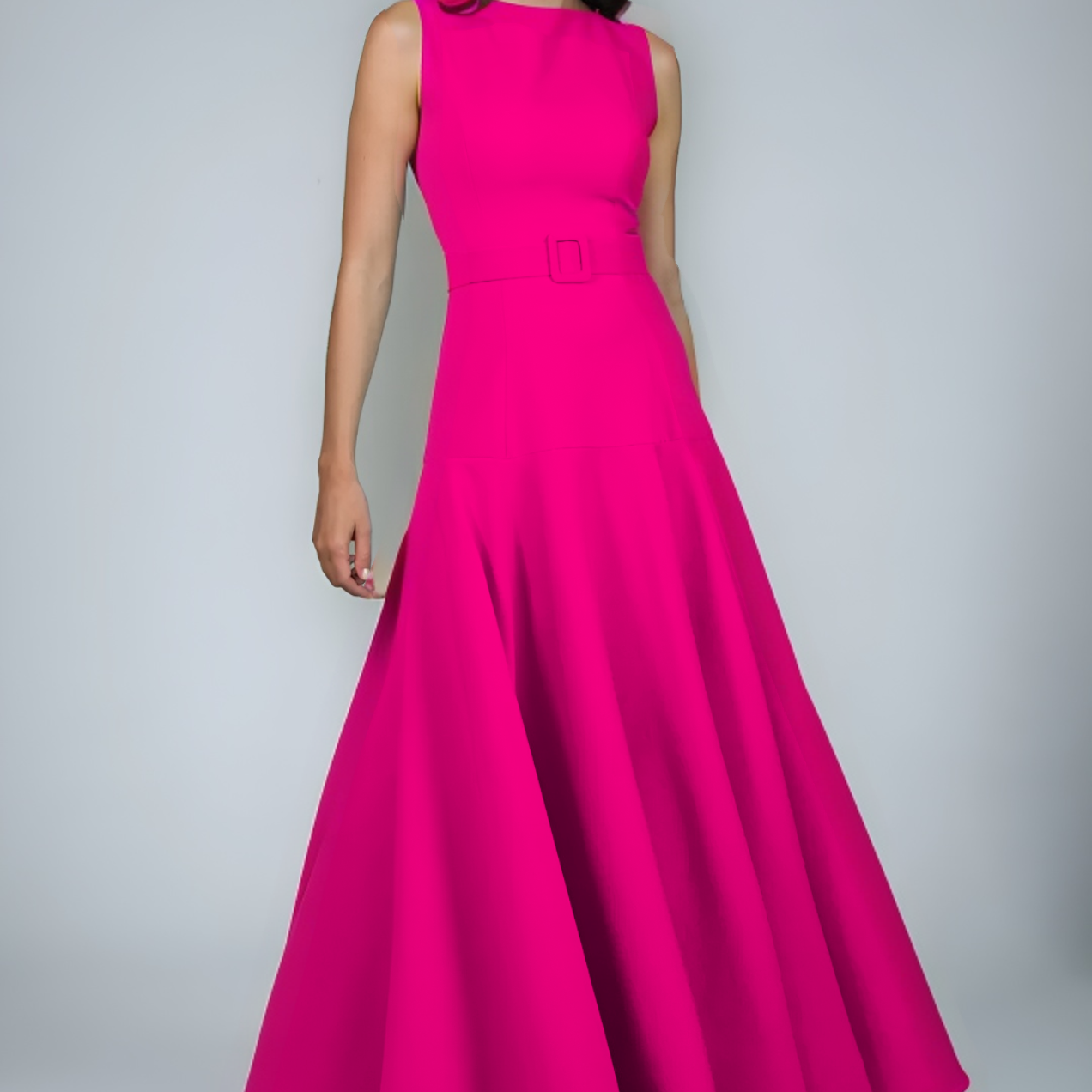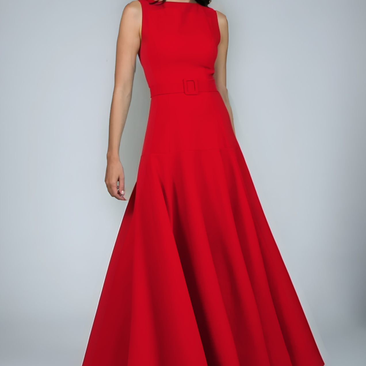 Luxuoso na sua simplicidade, este vestido minimalista é a definição de elegância discreta. Com decote alto e ombros cobertos, o corpo é todo ajustado até abaixo do cadeirão, valorizando a silhueta com sofisticação. A cintura é marcada por um cinto forrado, e a saia ampla em godê se abre com fluidez e caimento impecável. Ideal para quem prefere destacar-se com sobriedade e feminilidade. E mais: é perfeito para quem deseja usar sutiã com conforto e segurança.