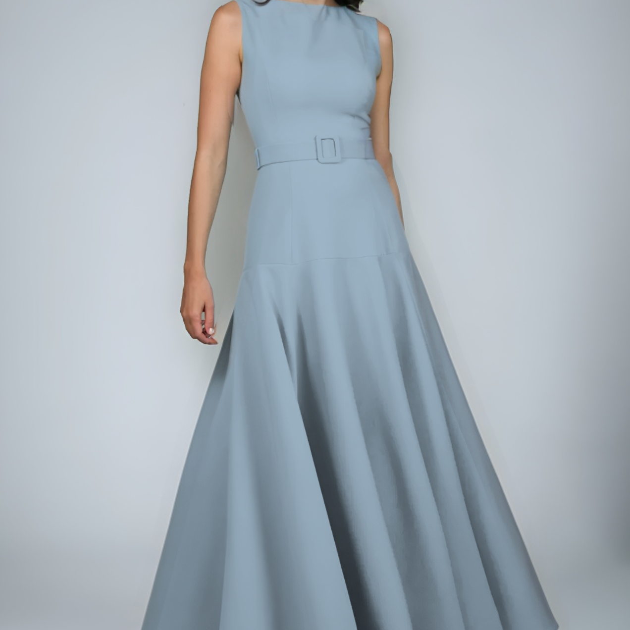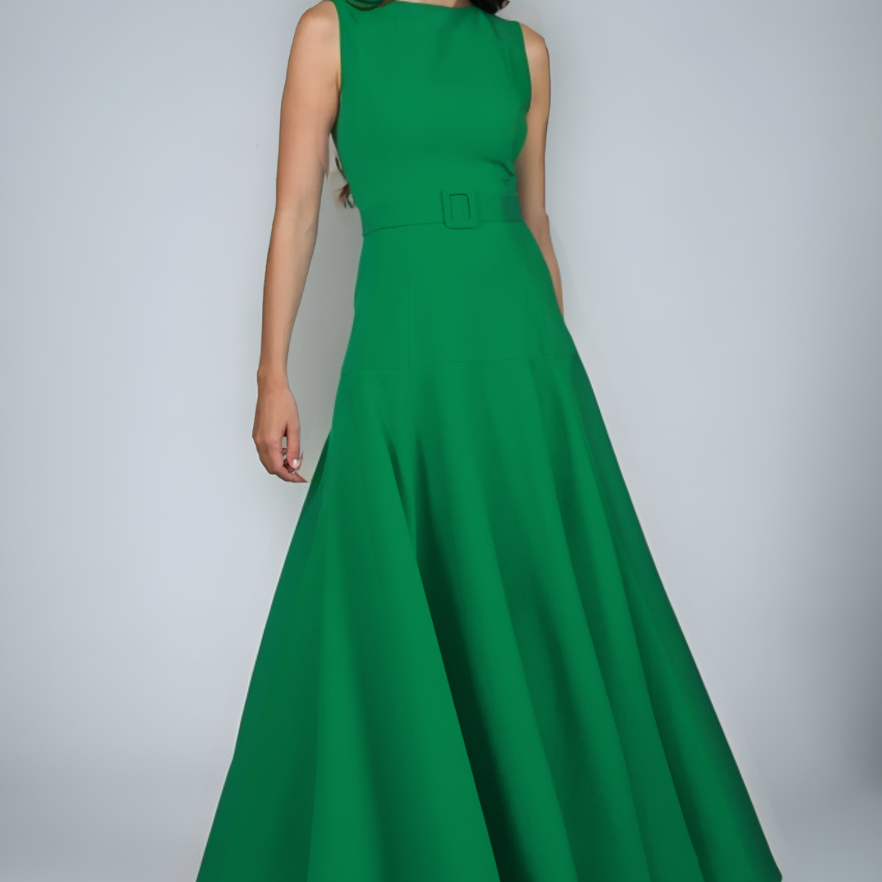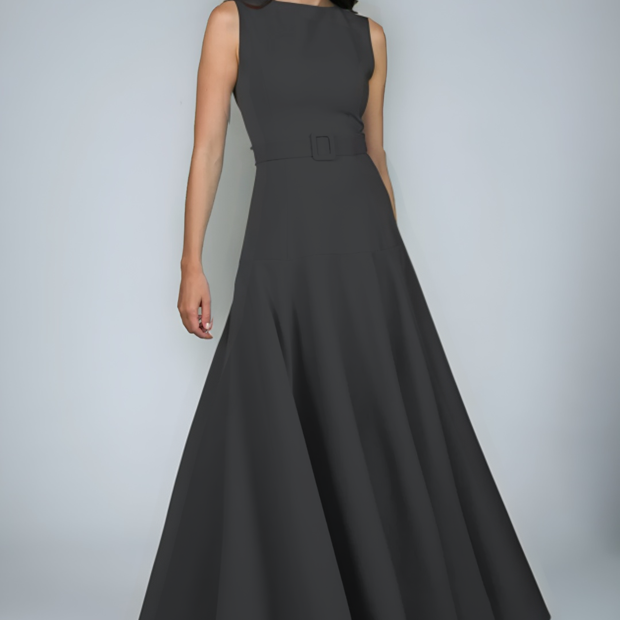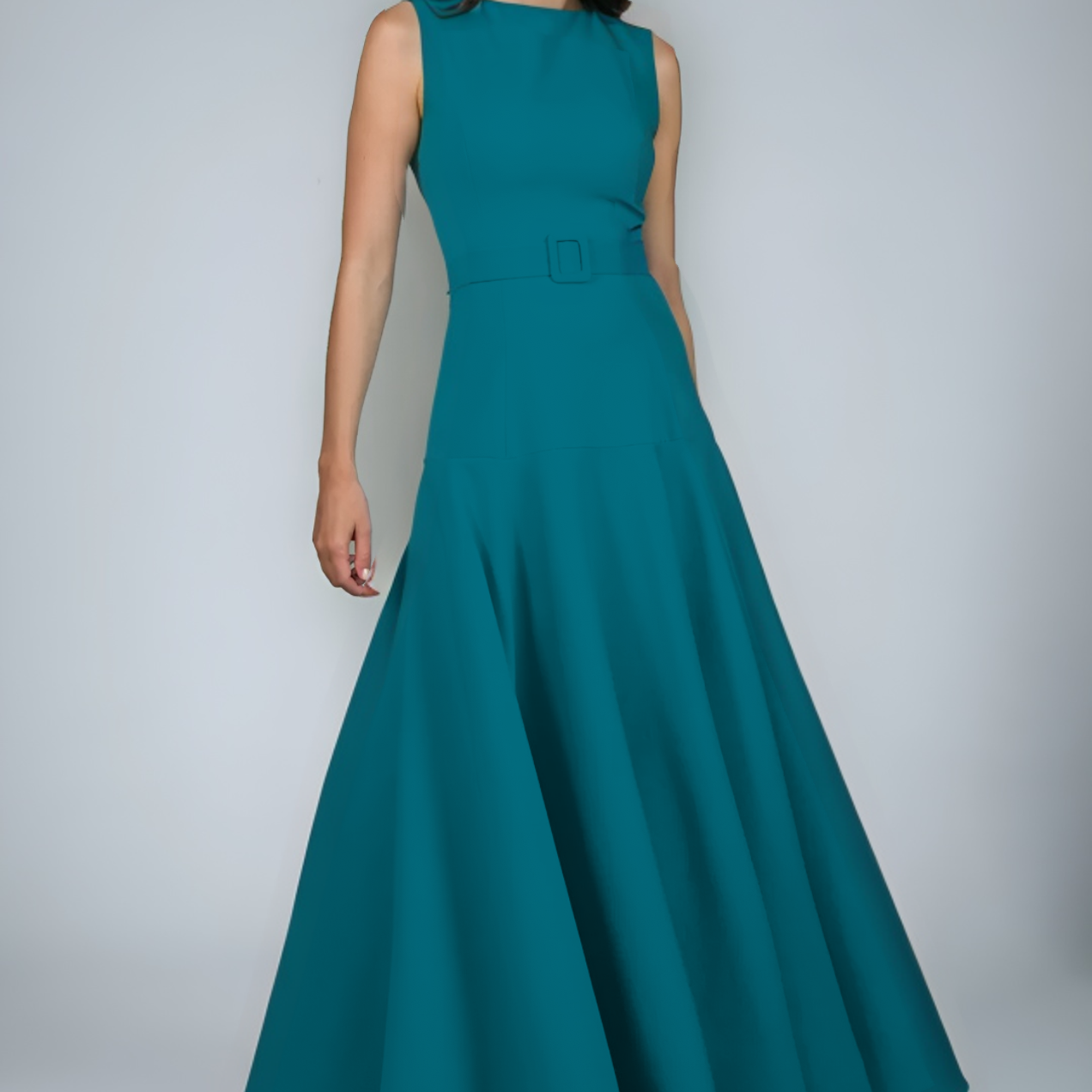 Luxuoso na sua simplicidade, este vestido minimalista é a definição de elegância discreta. Com decote alto e ombros cobertos, o corpo é todo ajustado até abaixo do cadeirão, valorizando a silhueta com sofisticação. A cintura é marcada por um cinto forrado, e a saia ampla em godê se abre com fluidez e caimento impecável. Ideal para quem prefere destacar-se com sobriedade e feminilidade. E mais: é perfeito para quem deseja usar sutiã com conforto e segurança.