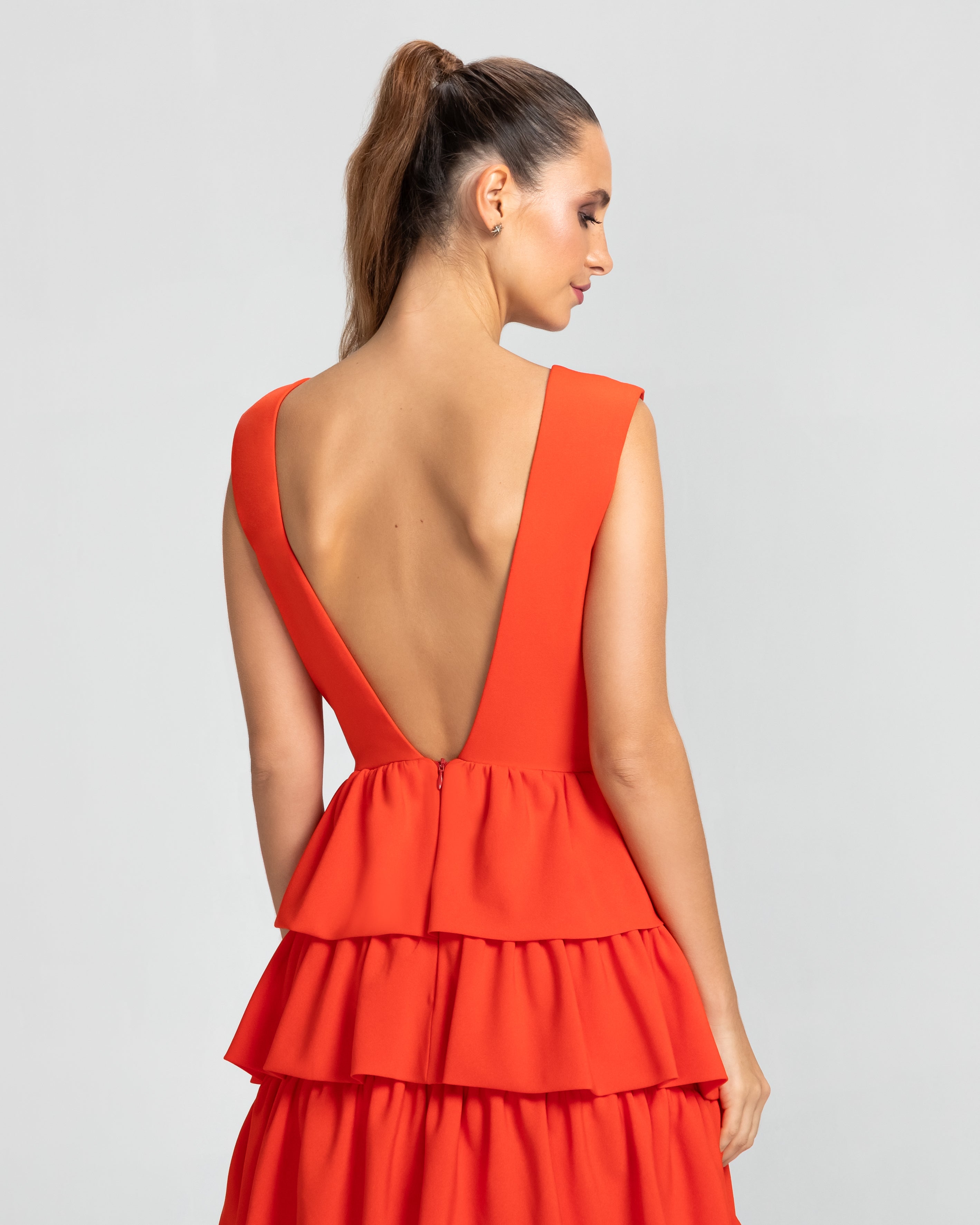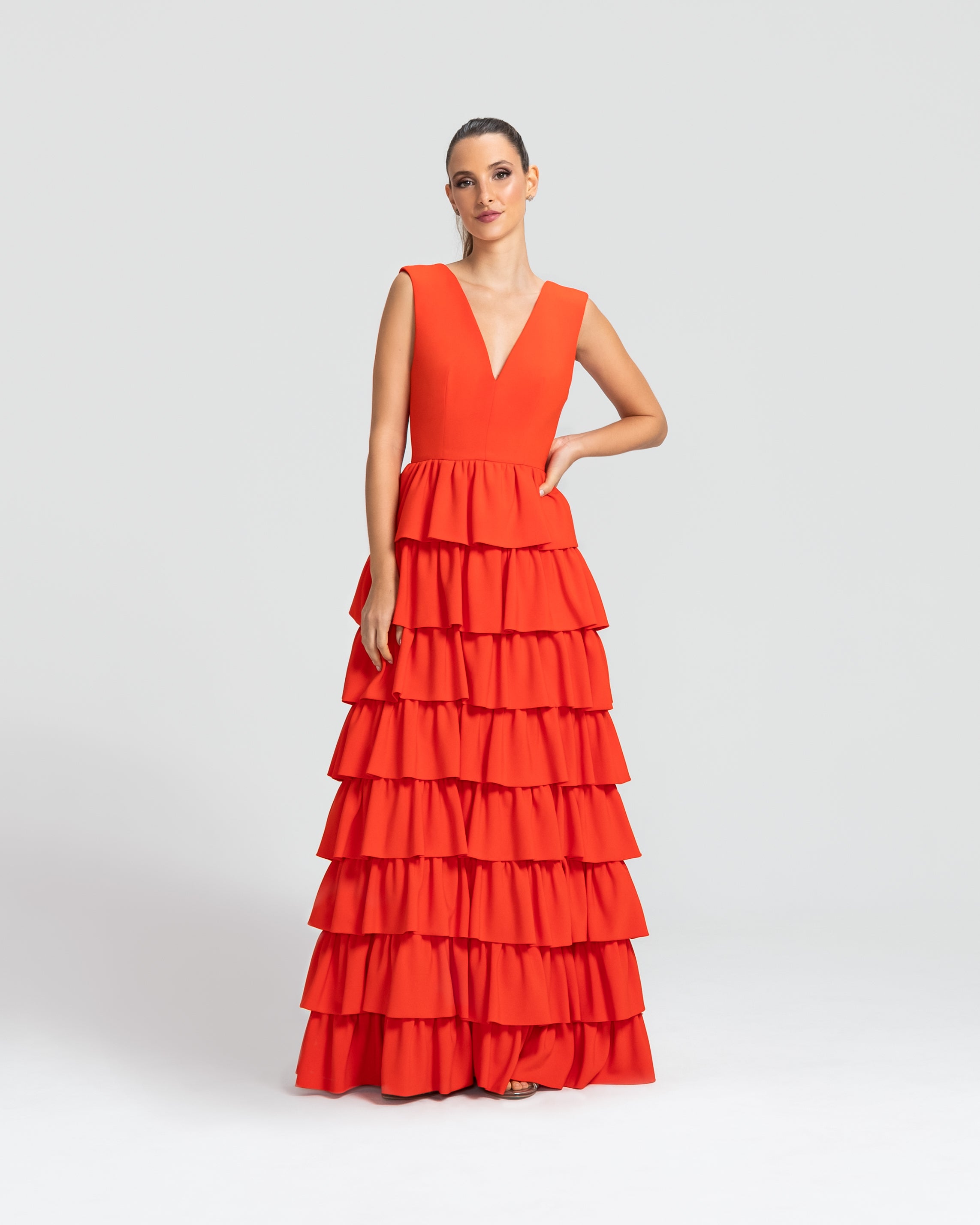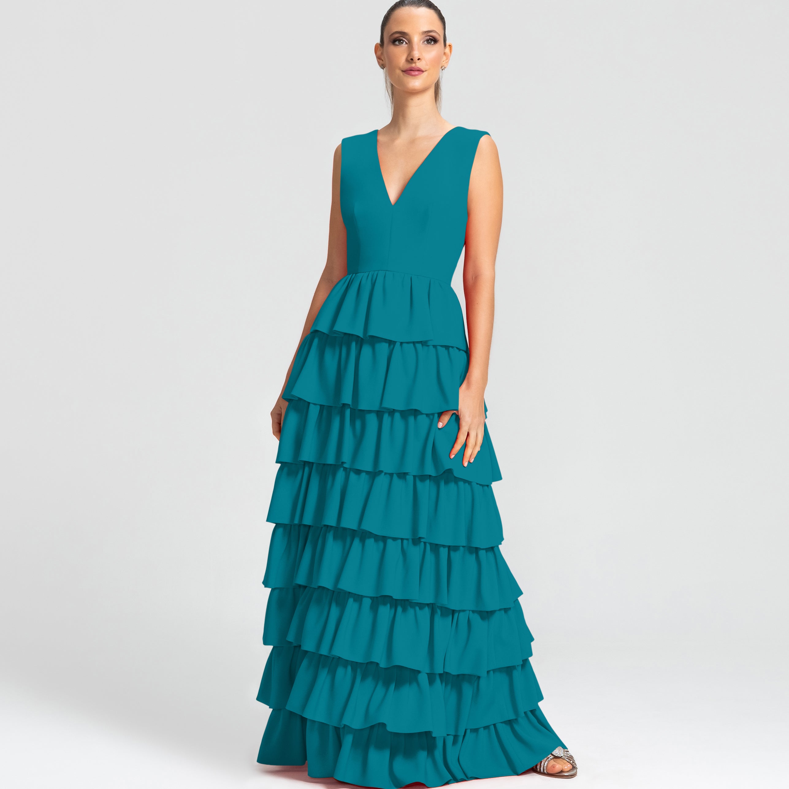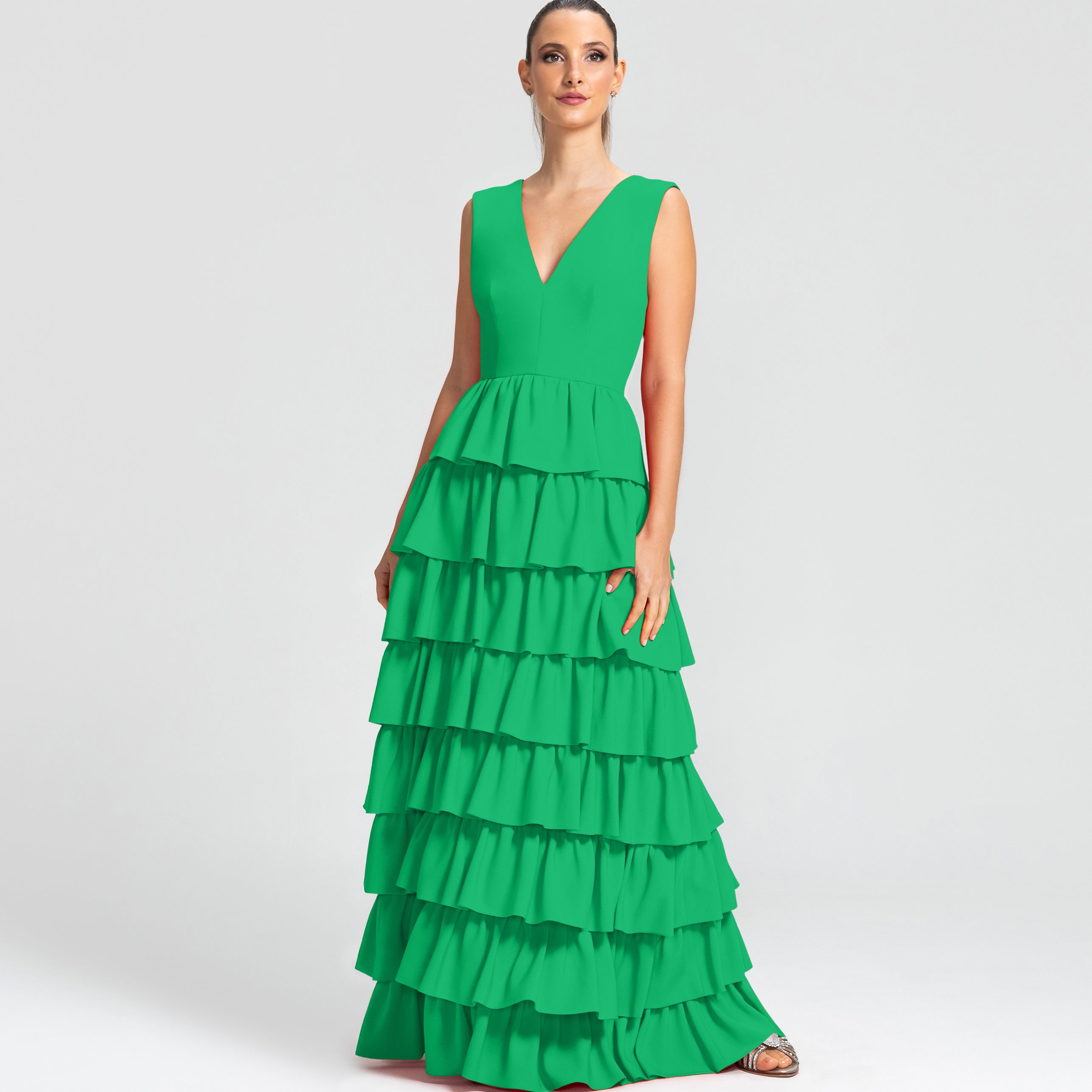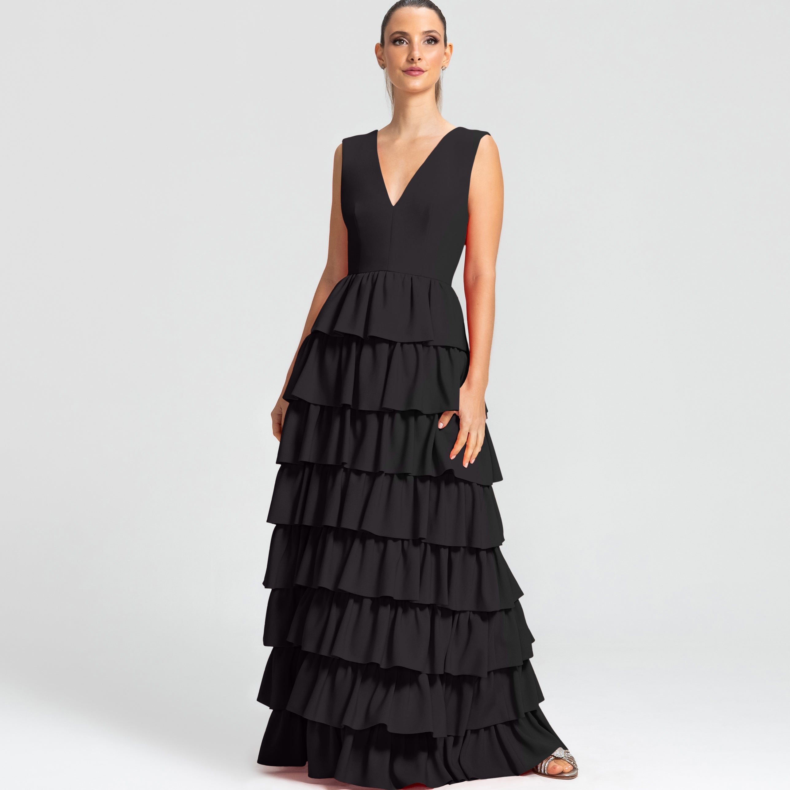 Moderno e sofisticado, este vestido apresenta um decote V na frente e um profundo nas costas, os ombros largos criam um visual marcante. O corpo justo e a cintura bem definida realçam as curvas, enquanto a saia em várias camadas de babados adiciona um toque estiloso e volumoso. Ideal para mulheres que amam sofisticação sem perder a modernidade e a jovialidade.