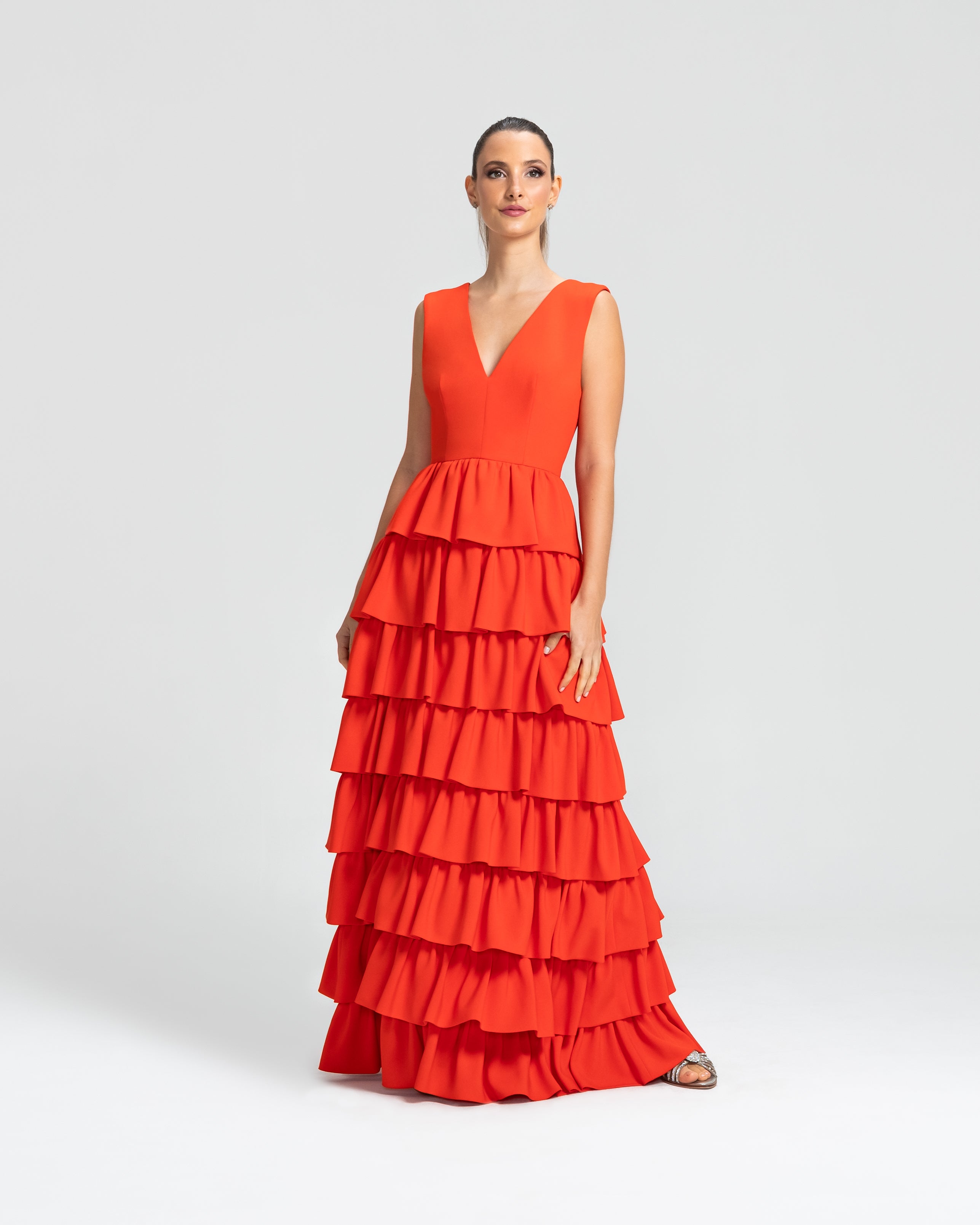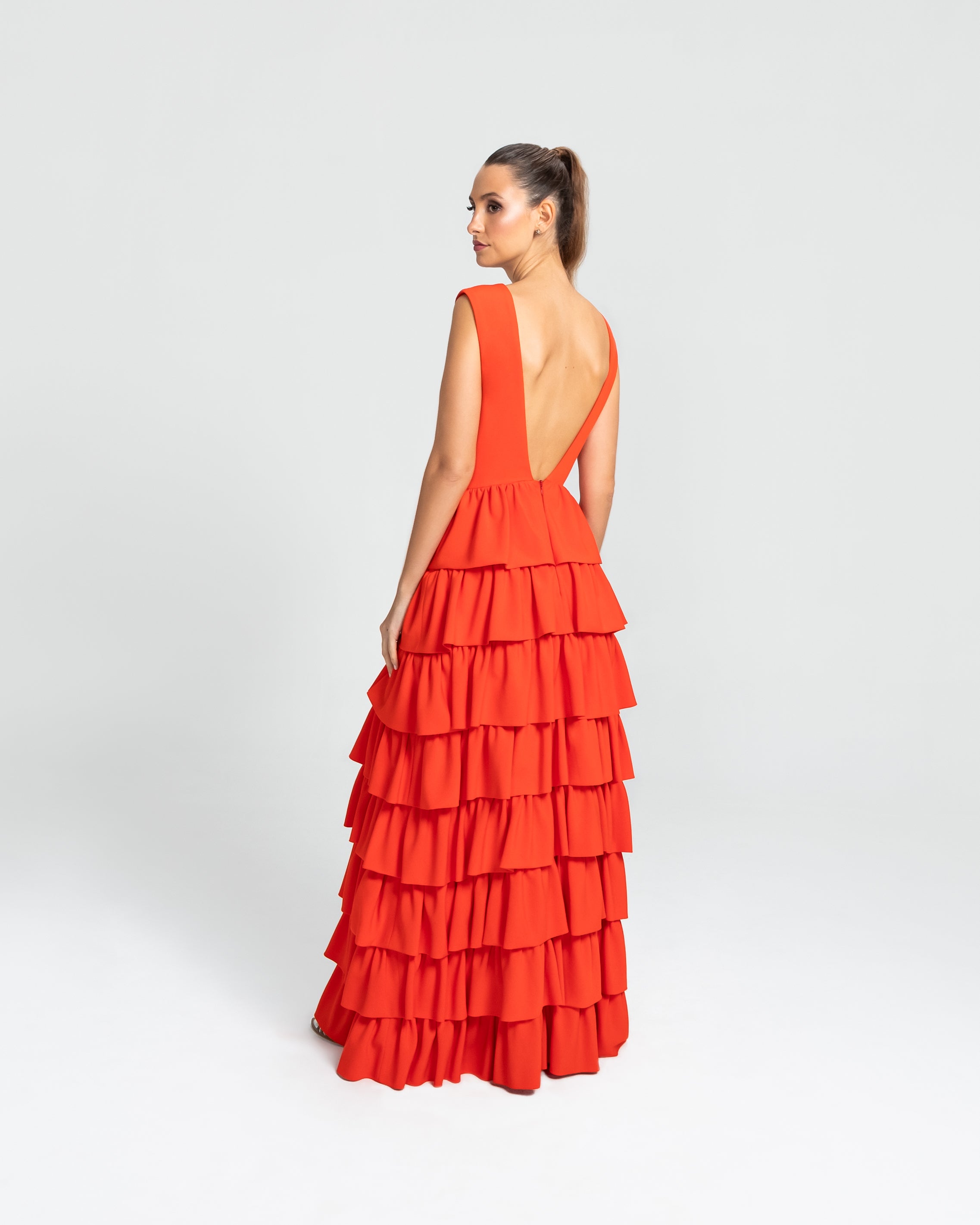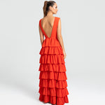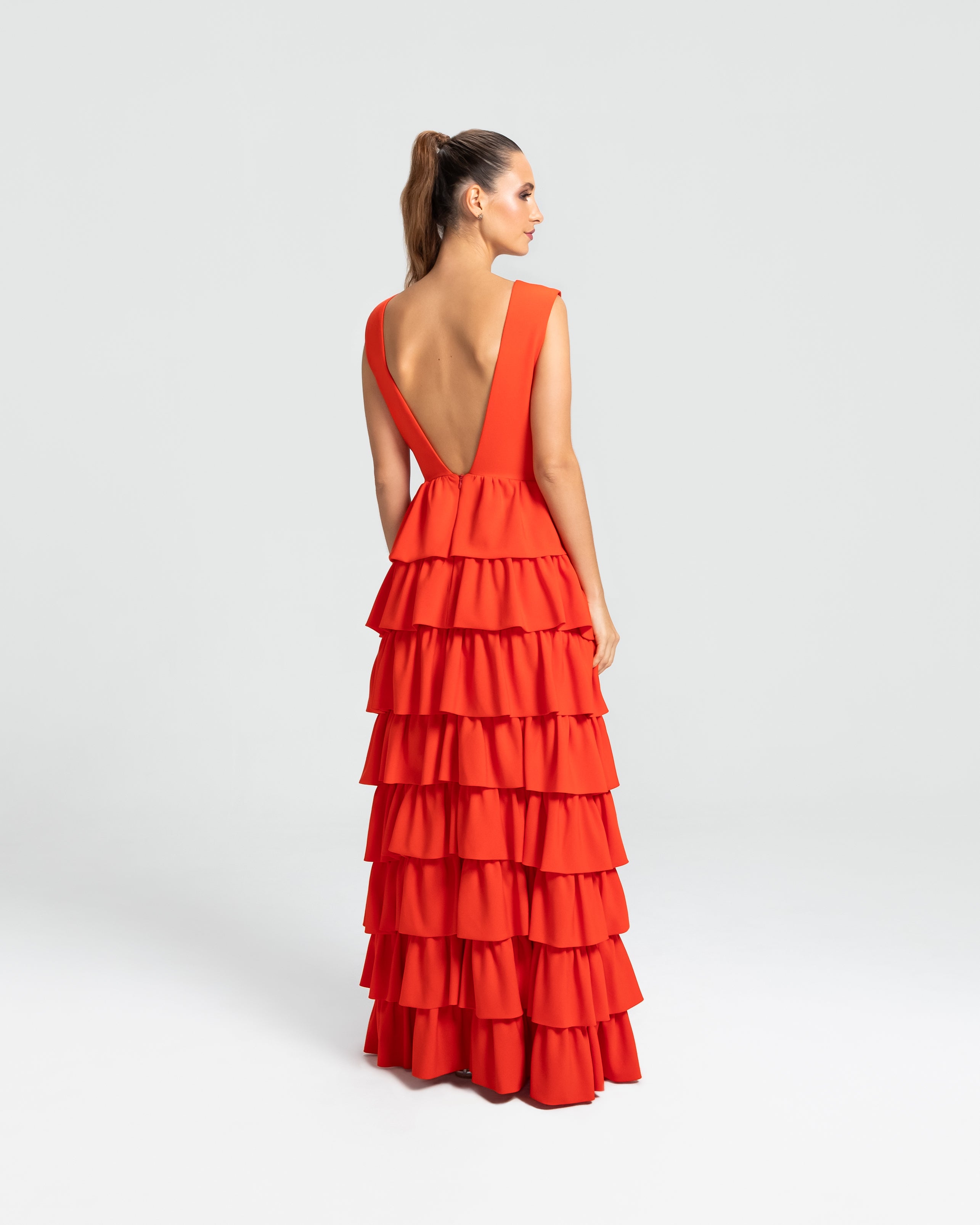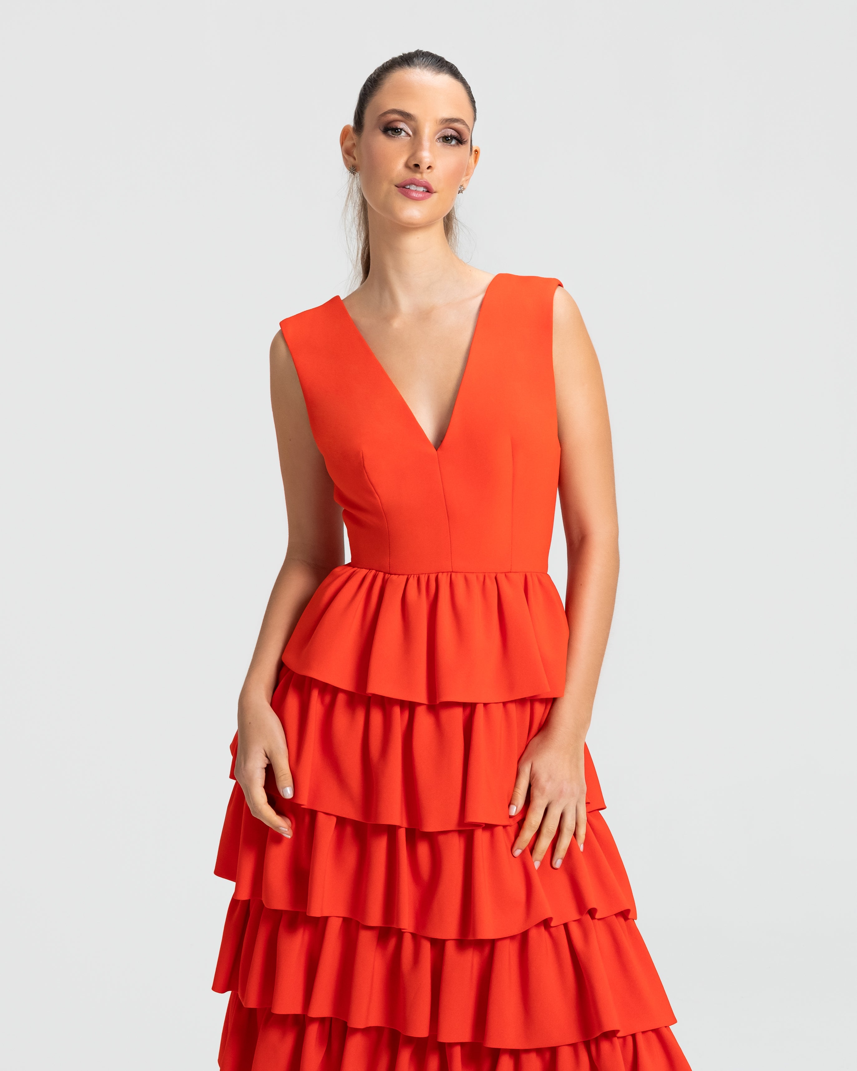 Moderno e sofisticado, este vestido apresenta um decote V na frente e um profundo nas costas, os ombros largos criam um visual marcante. O corpo justo e a cintura bem definida realçam as curvas, enquanto a saia em várias camadas de babados adiciona um toque estiloso e volumoso. Ideal para mulheres que amam sofisticação sem perder a modernidade e a jovialidade.