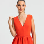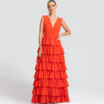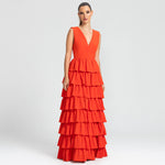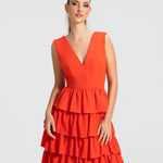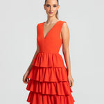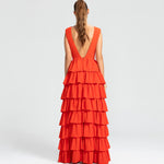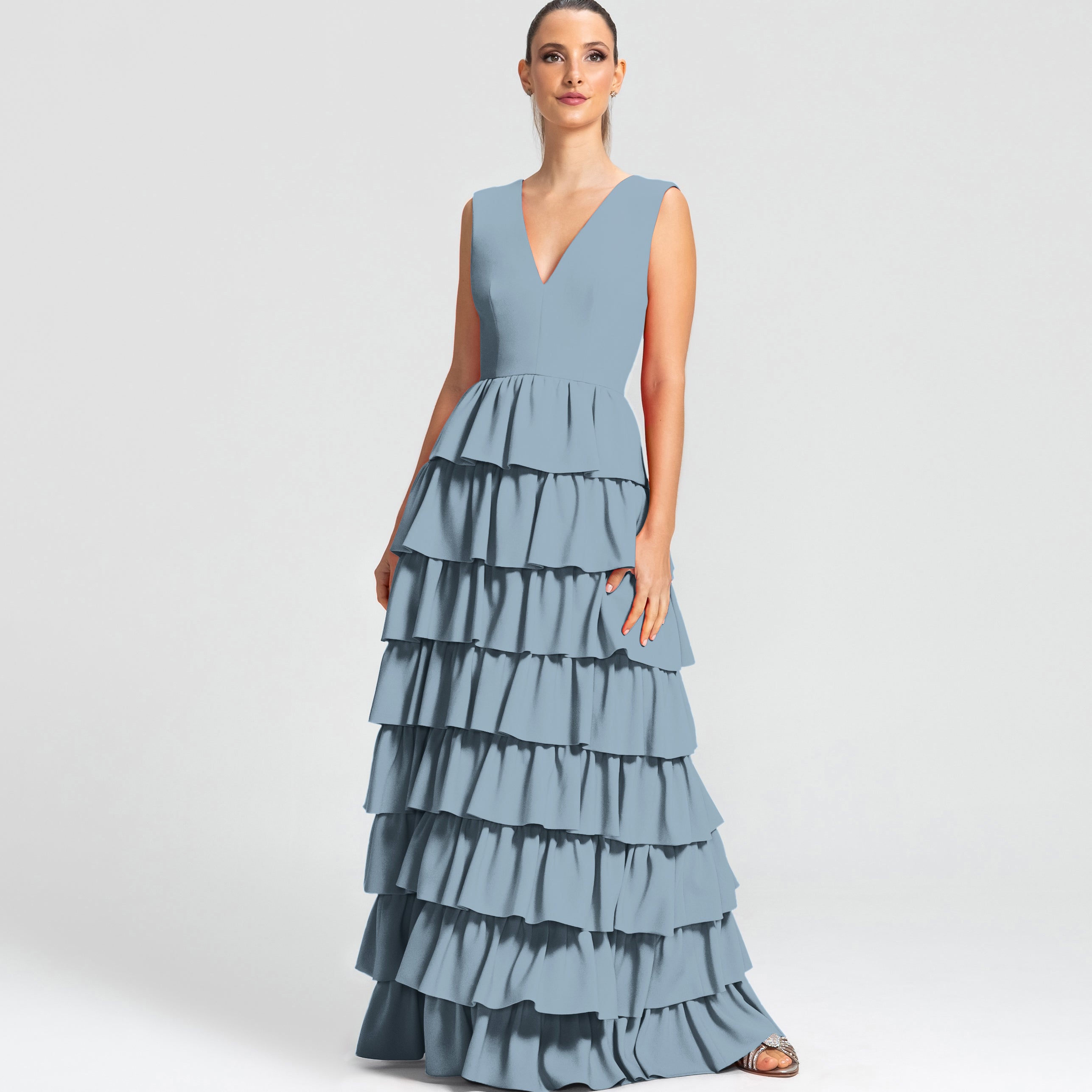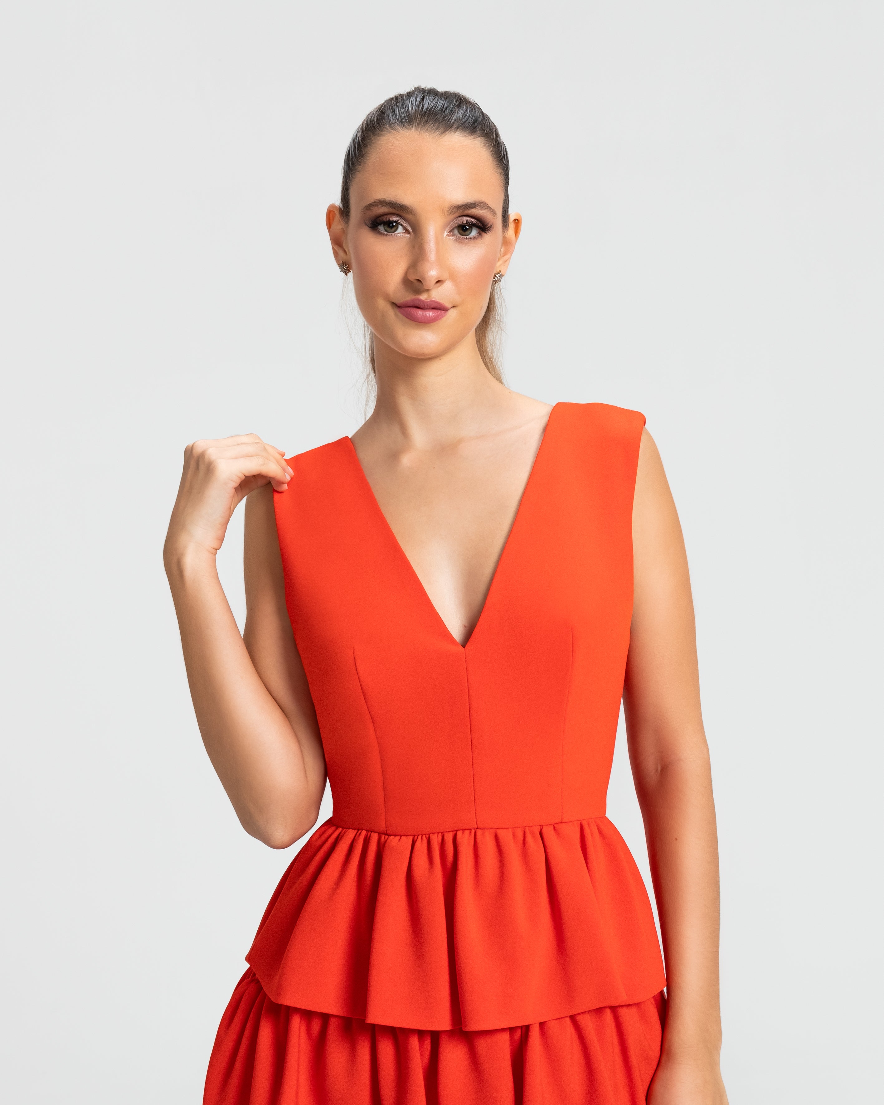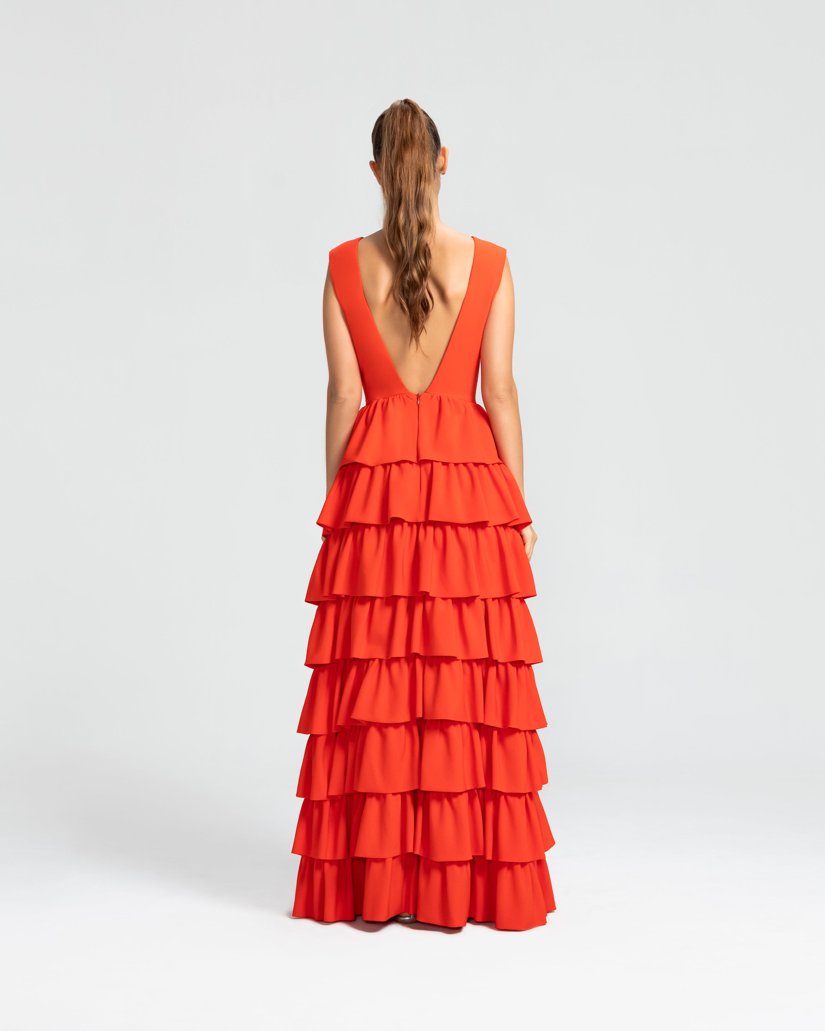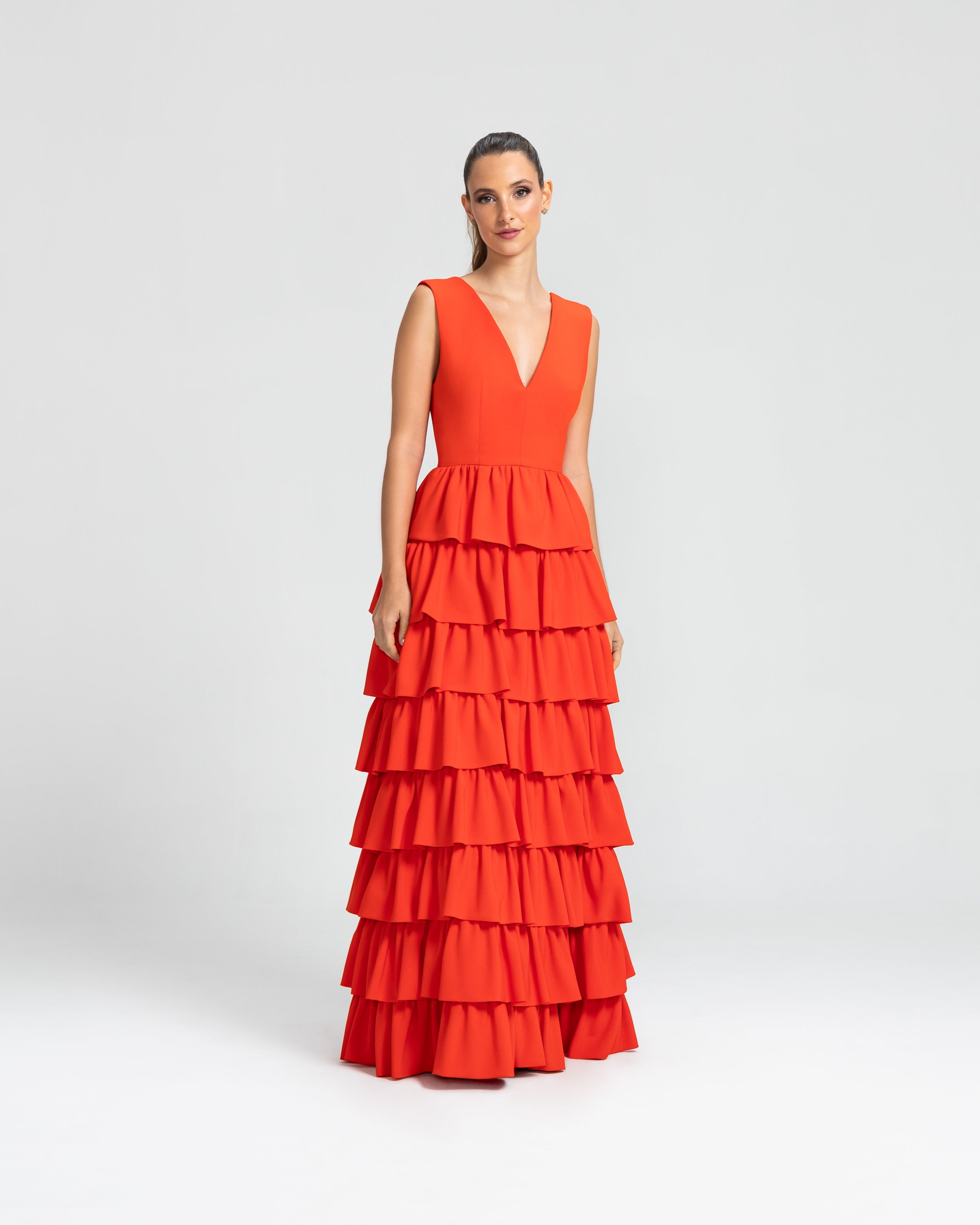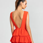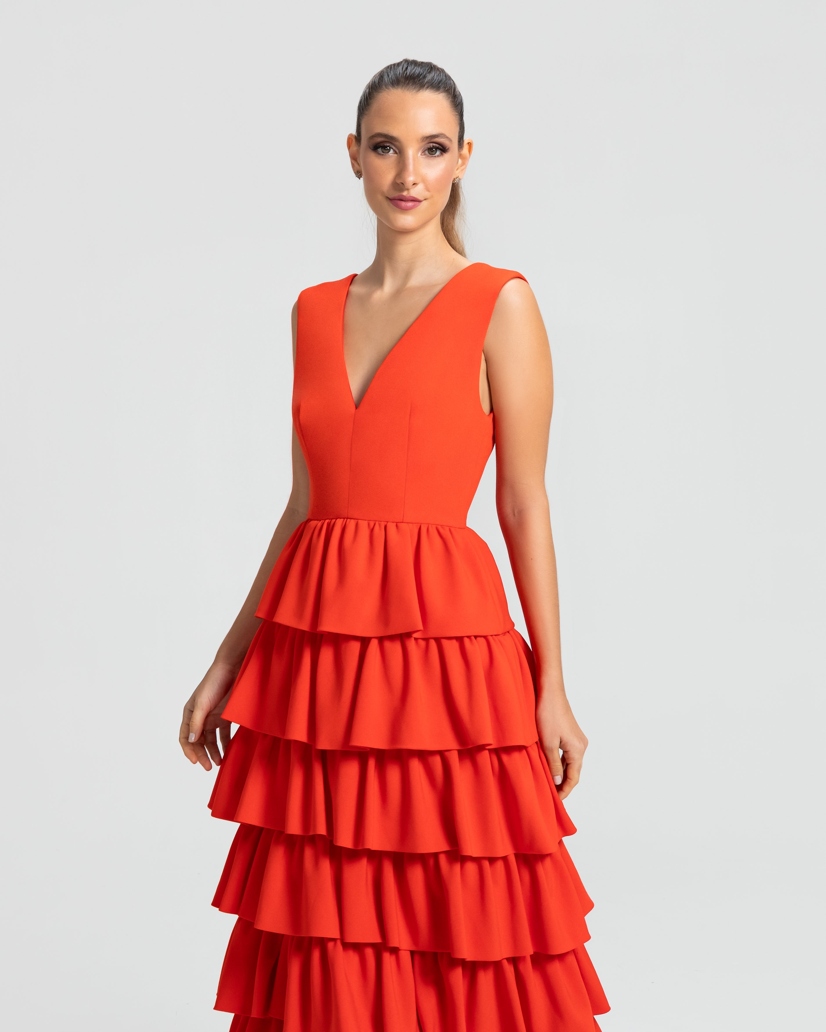 Moderno e sofisticado, este vestido apresenta um decote V na frente e um profundo nas costas, os ombros largos criam um visual marcante. O corpo justo e a cintura bem definida realçam as curvas, enquanto a saia em várias camadas de babados adiciona um toque estiloso e volumoso. Ideal para mulheres que amam sofisticação sem perder a modernidade e a jovialidade.