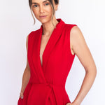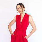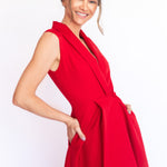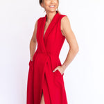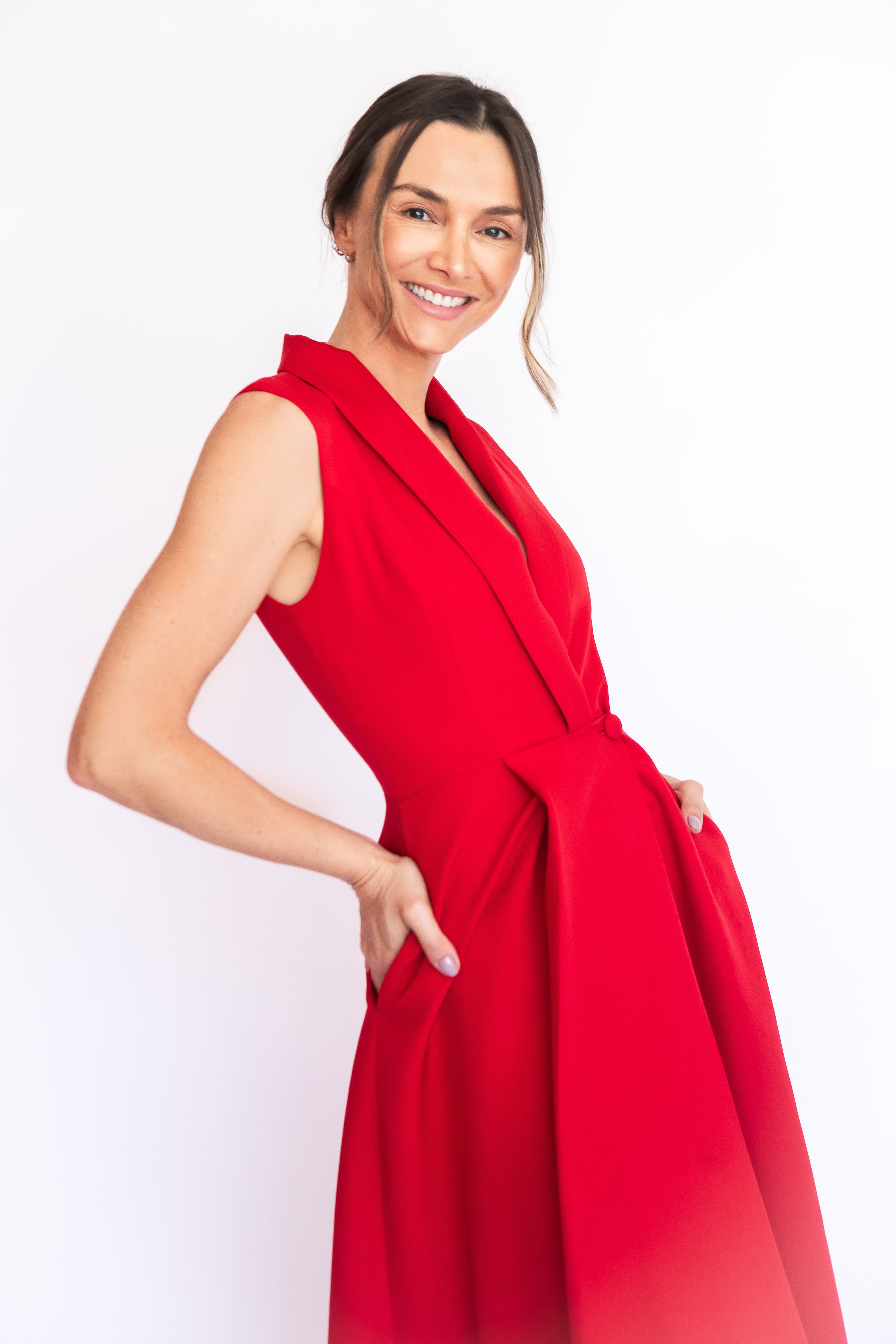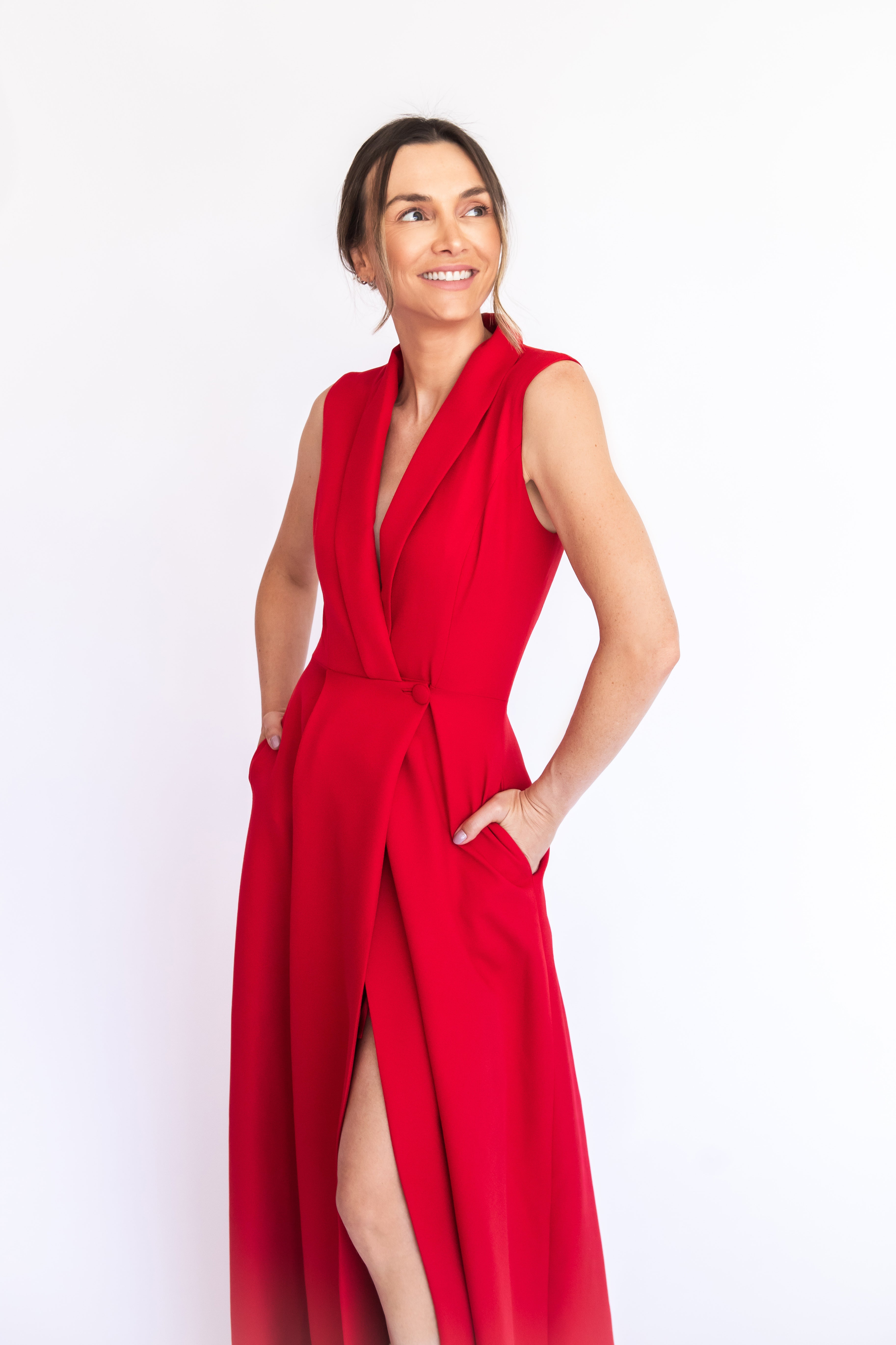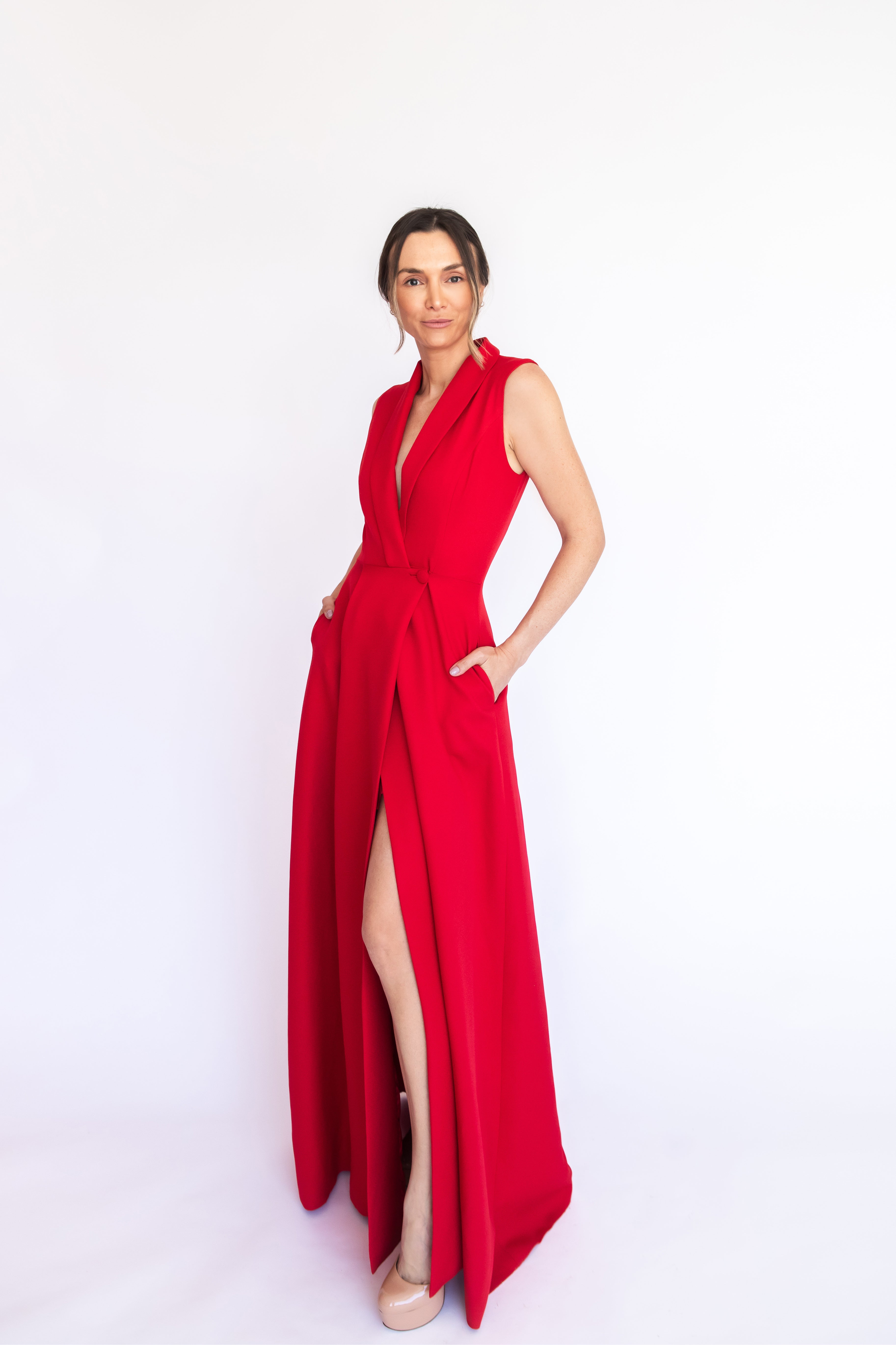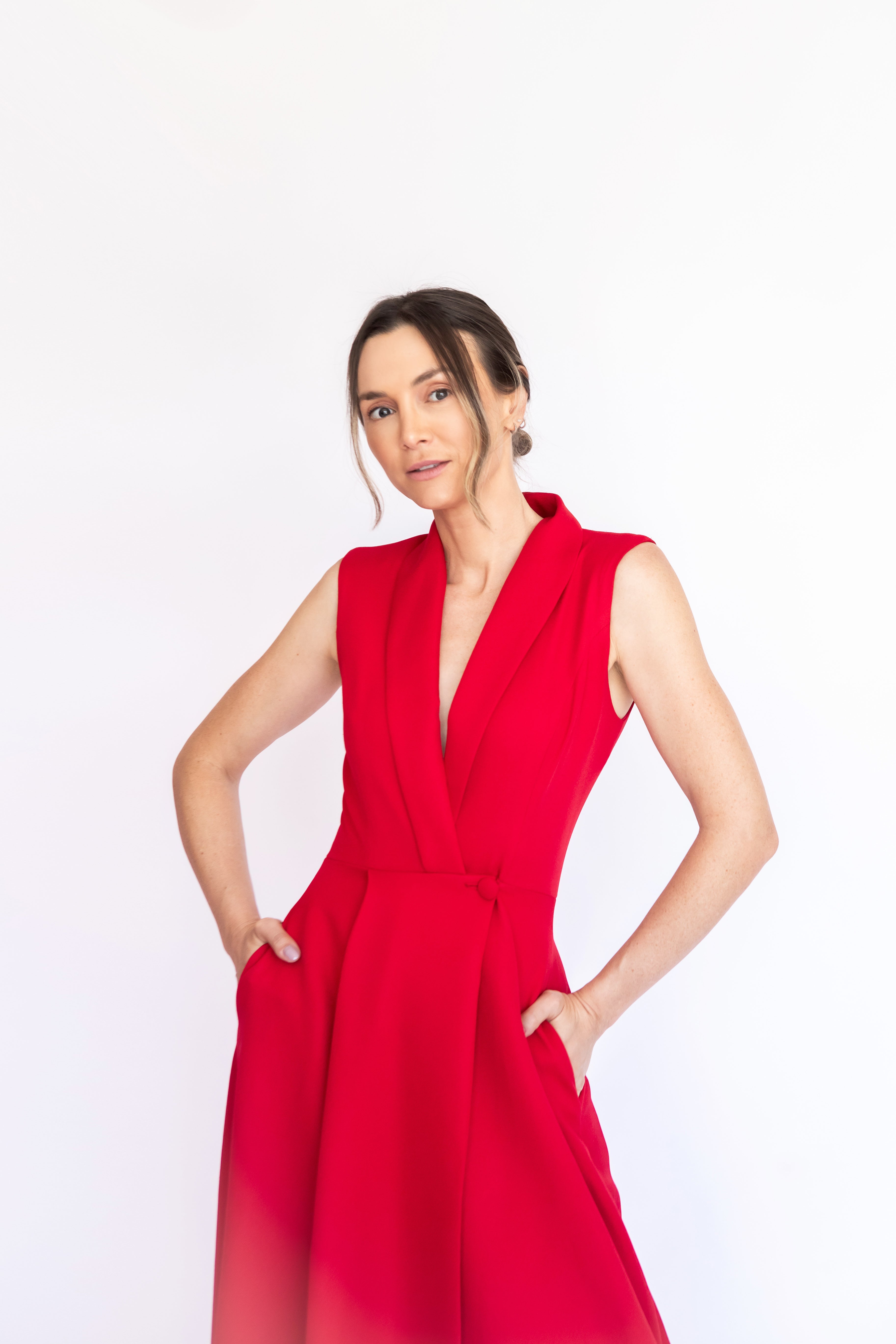 Sofisticado e minimalista, este vestido traz a elegância da alfaiataria para um design impecável. Com decote V e corpo estruturado em estilo blazer, apresenta lapela transpassada e um caimento levemente solto, garantindo conforto e refinamento. A cintura marcada pelo transpasse e a saia assimétrica com fenda criam uma silhueta poderosa e atemporal. Um verdadeiro clássico, perfeito para mulheres que apreciam sofisticação discreta – e um sucesso absoluto de vendas.