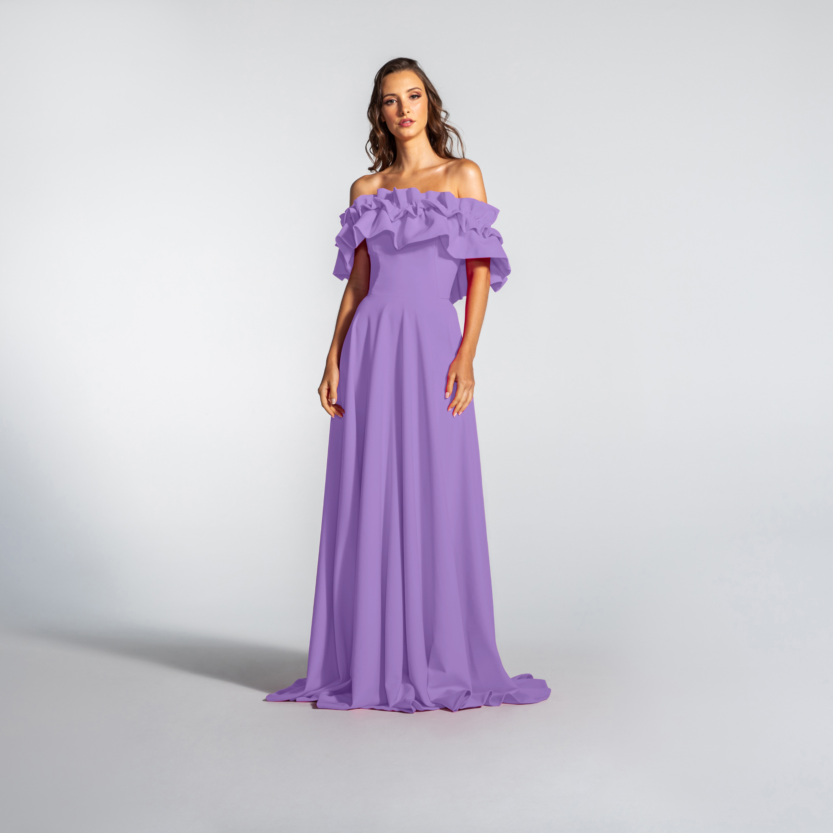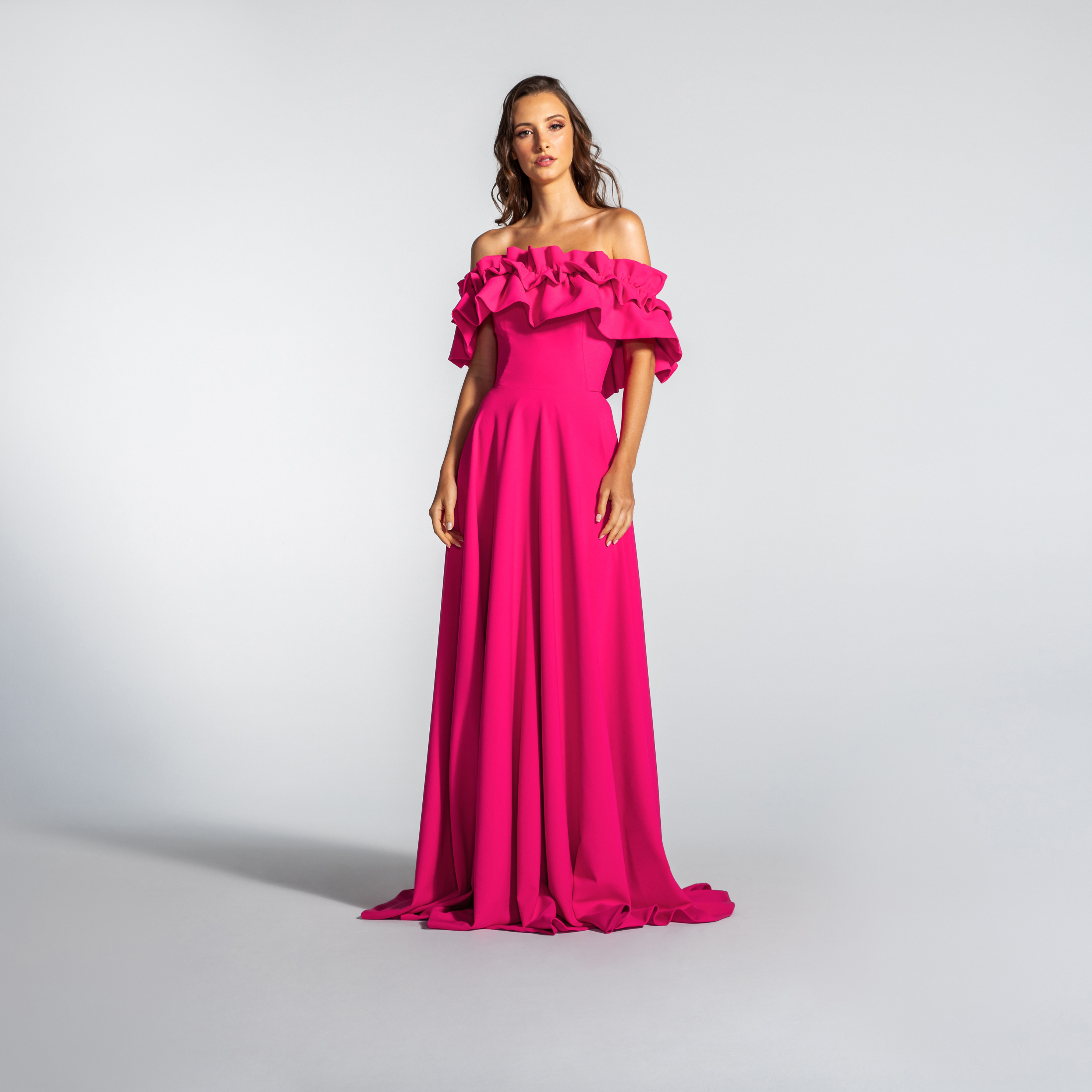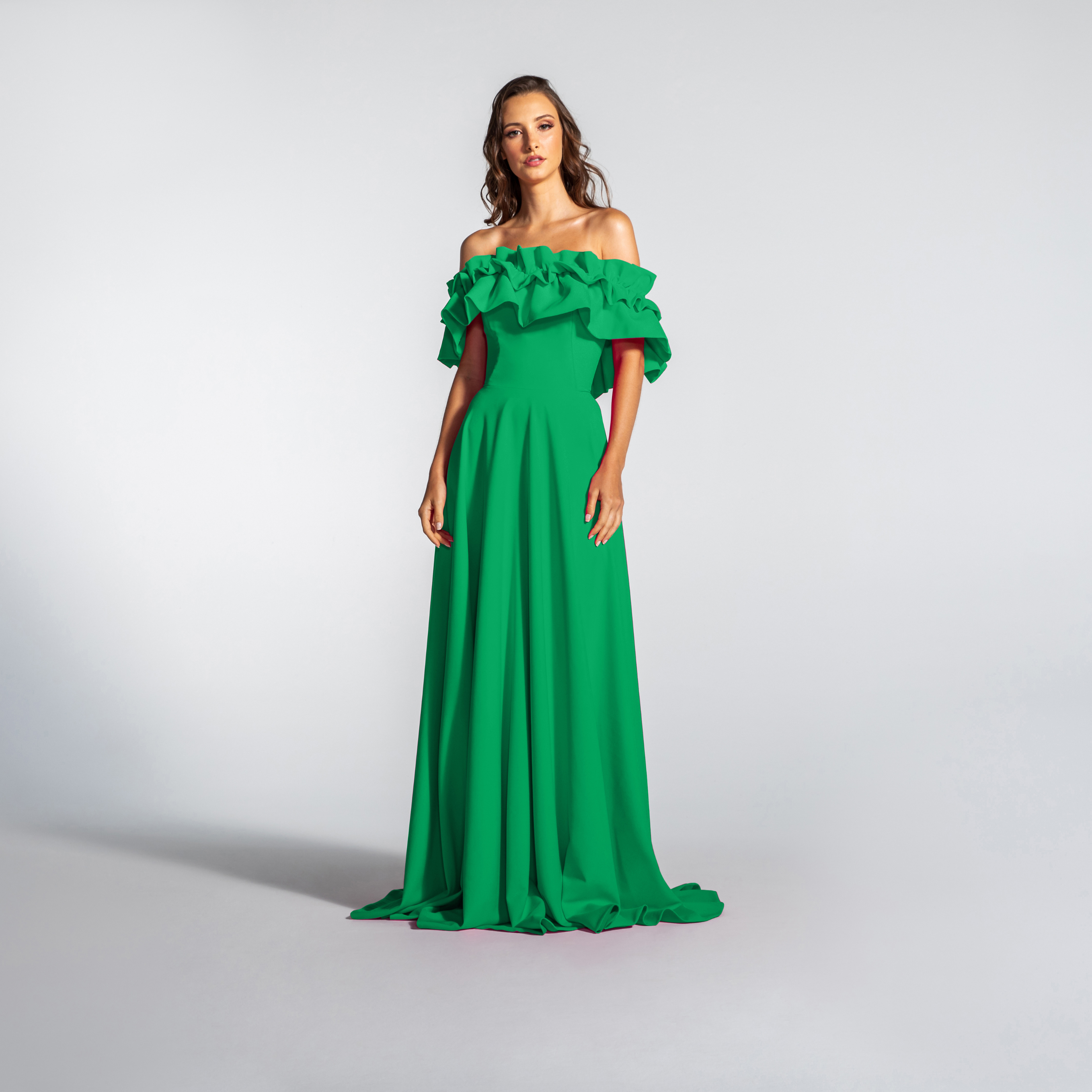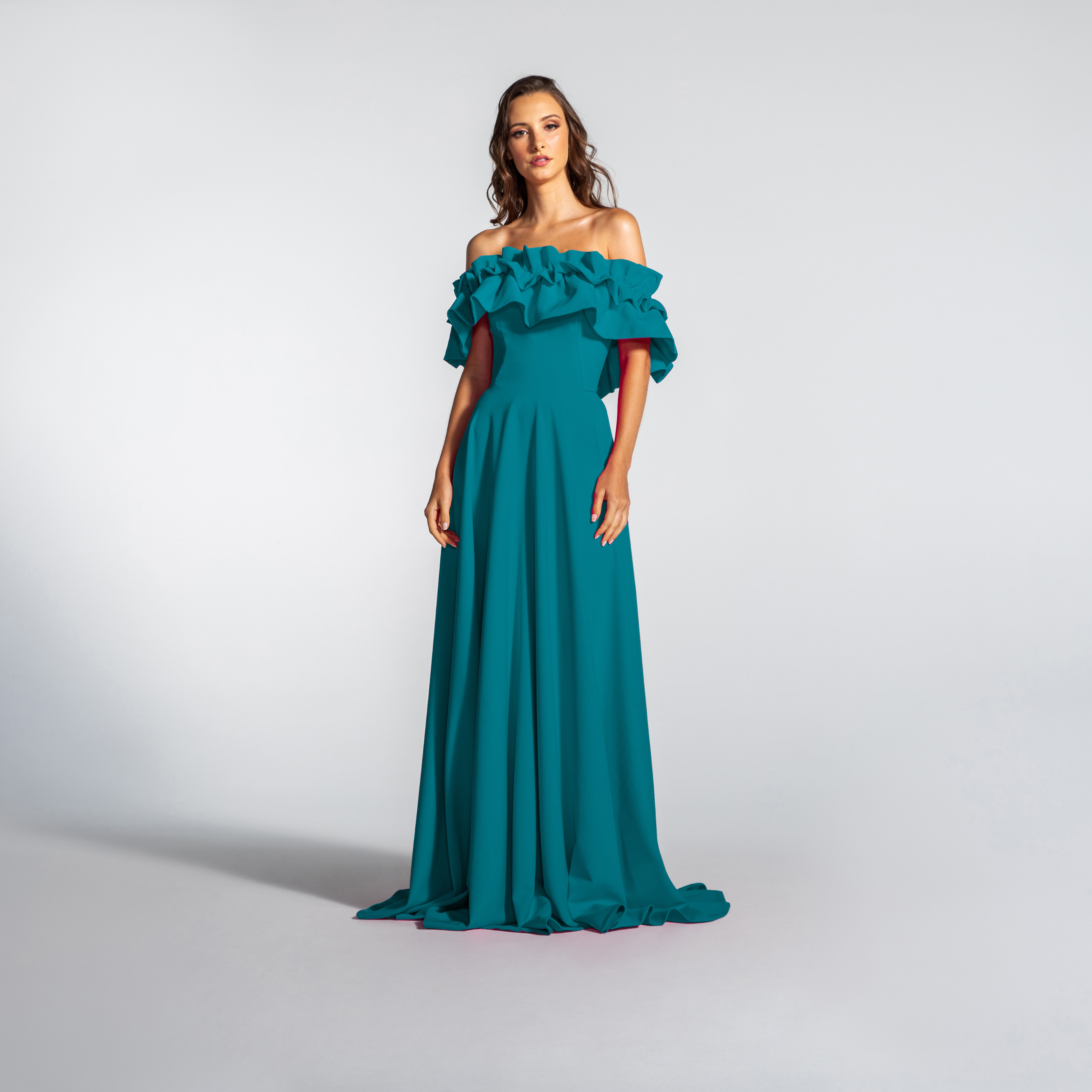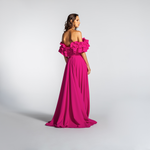 Vestido Longo em Crepe Ombro a Ombro com Babados – REF: EG16