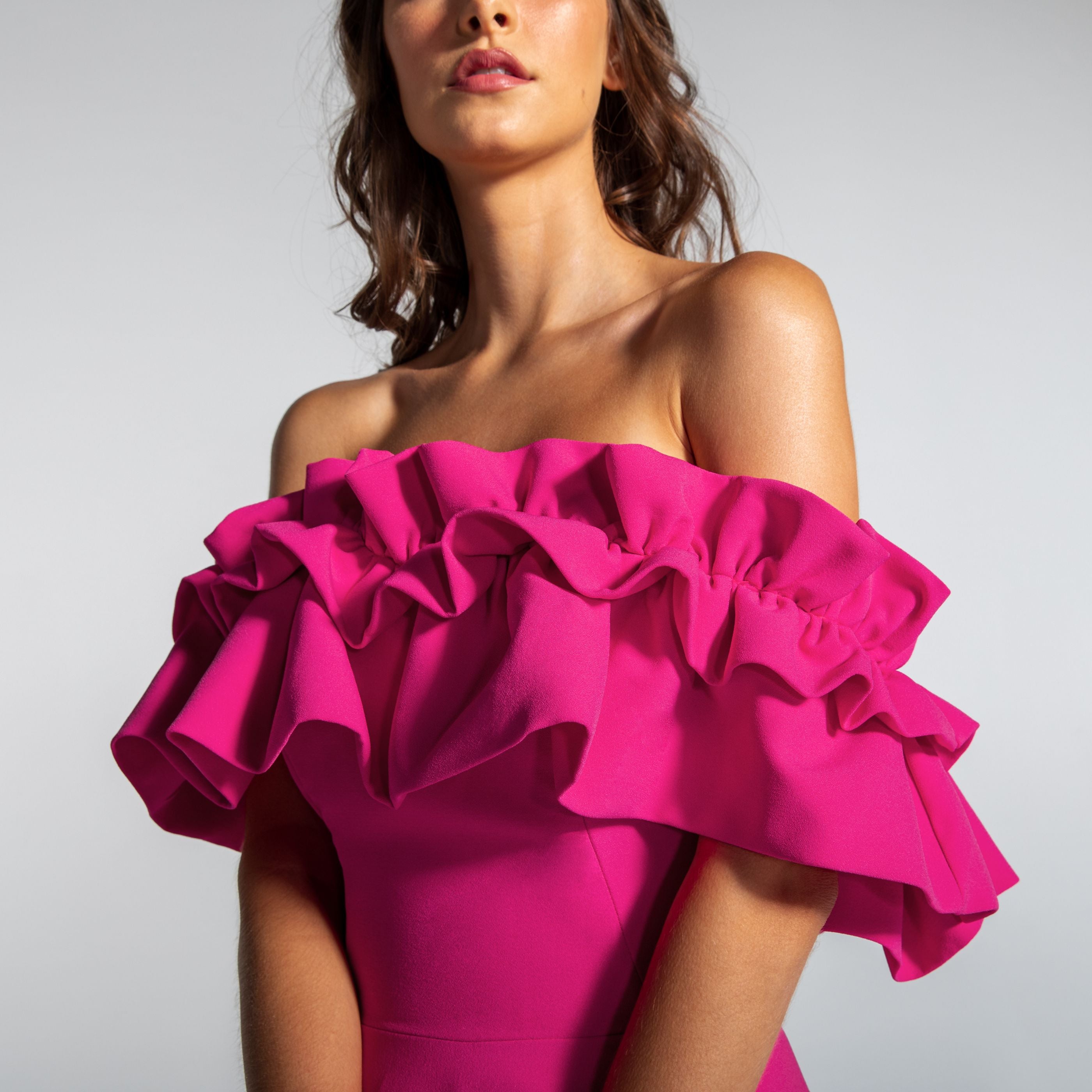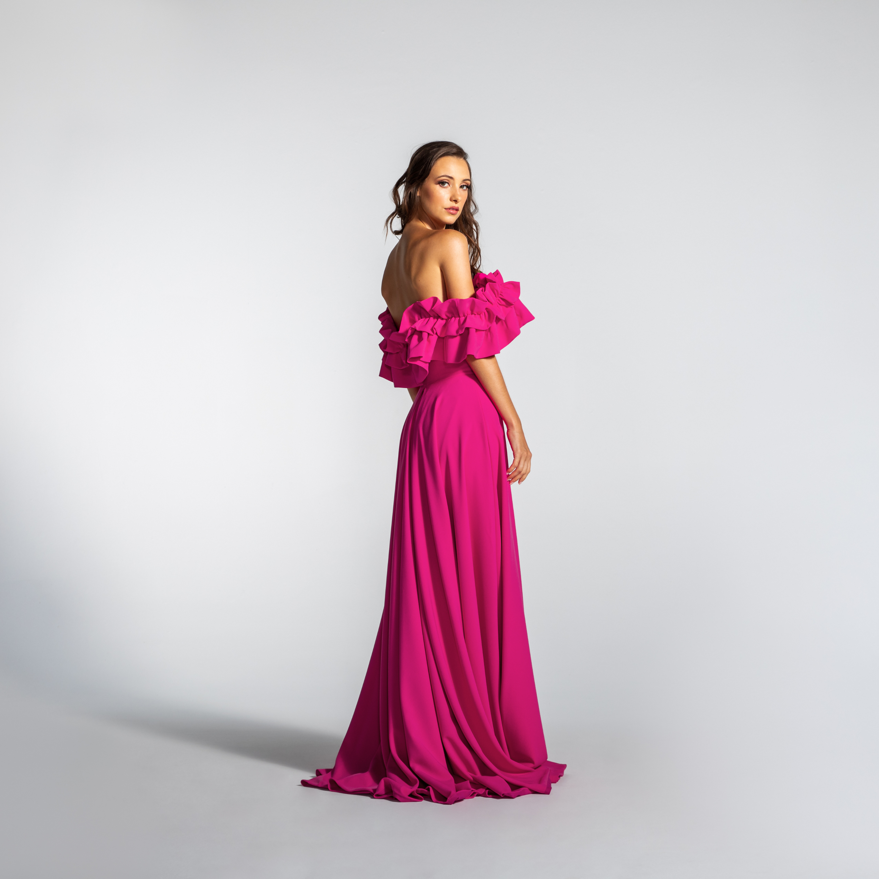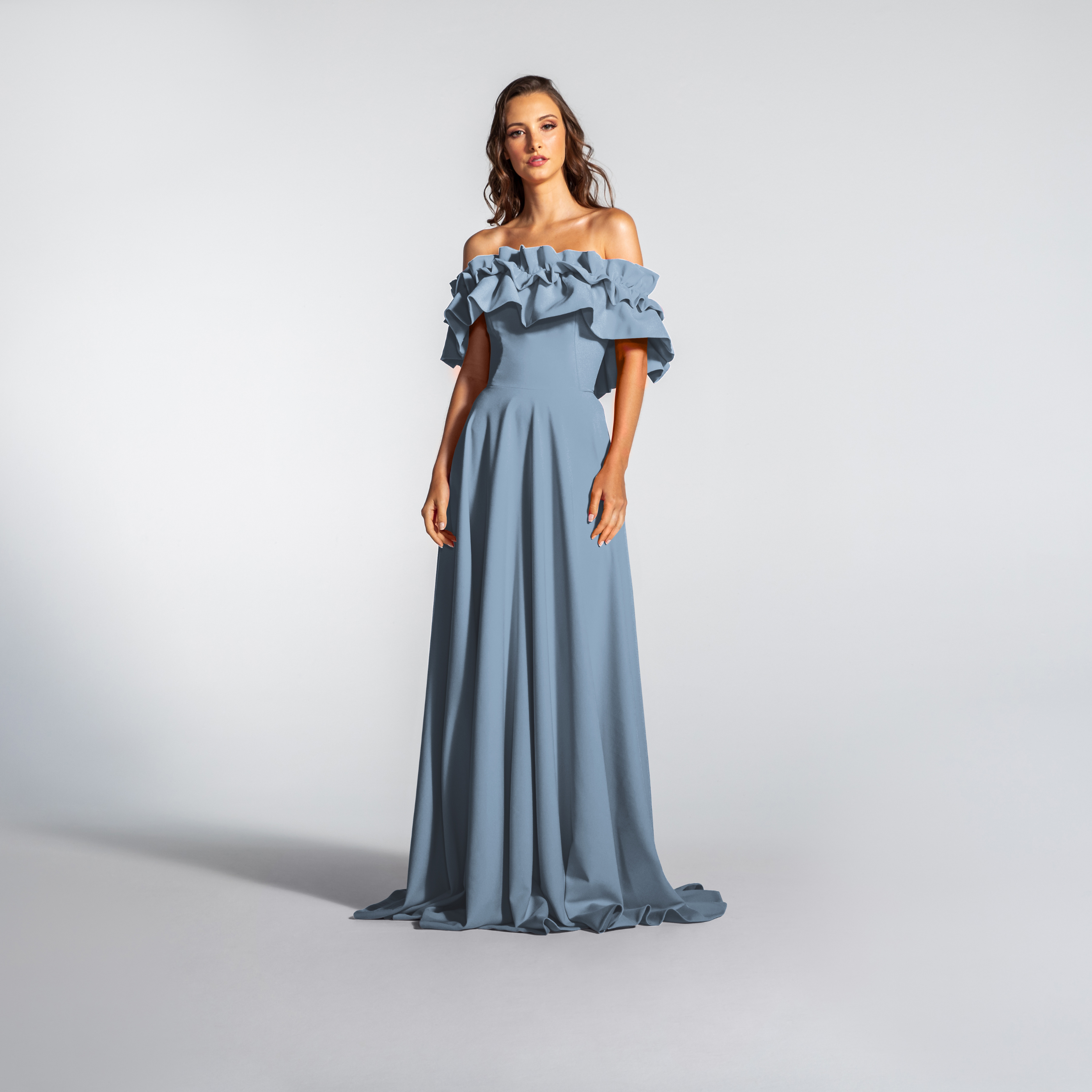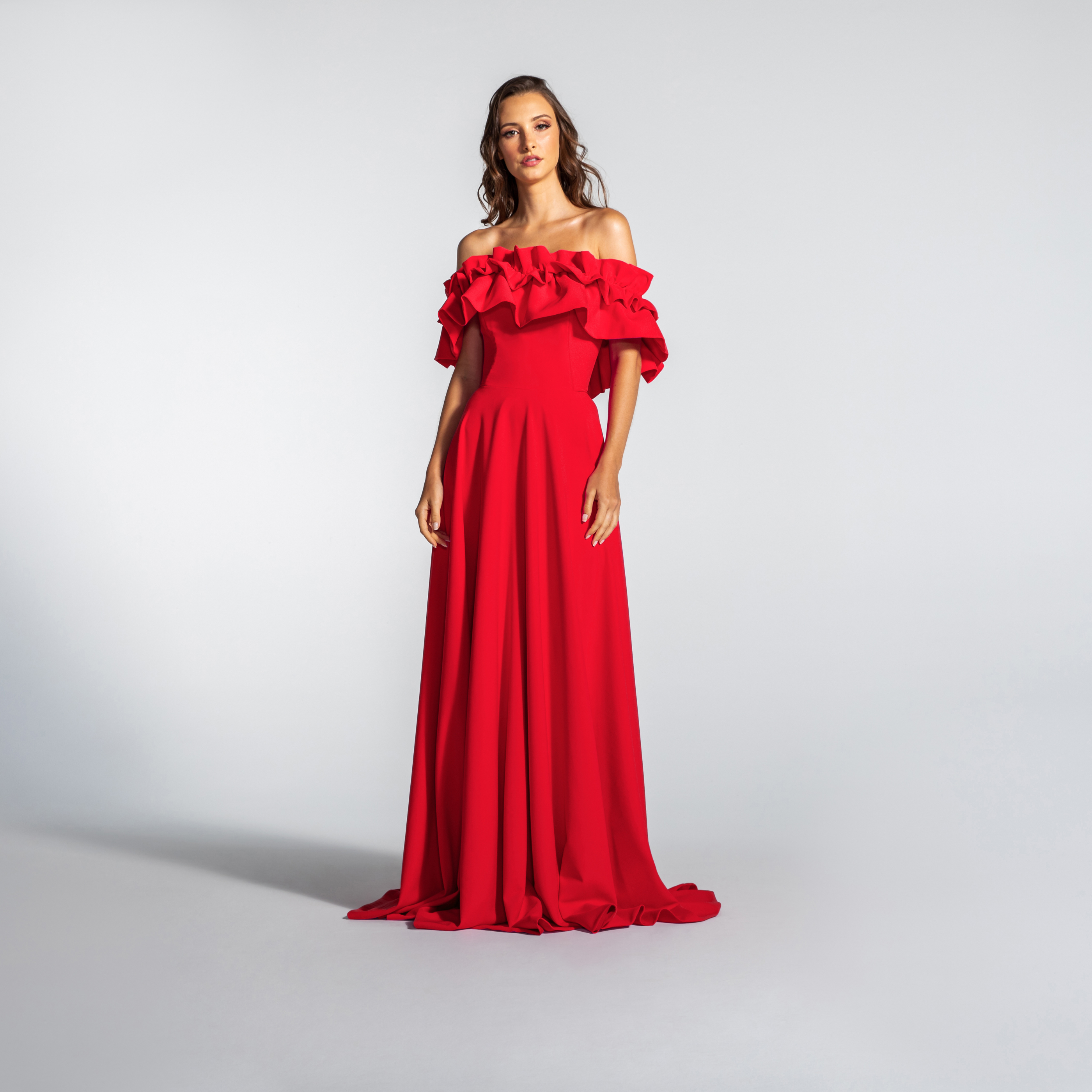 Vestido Longo em Crepe Ombro a Ombro com Babados – REF: EG16