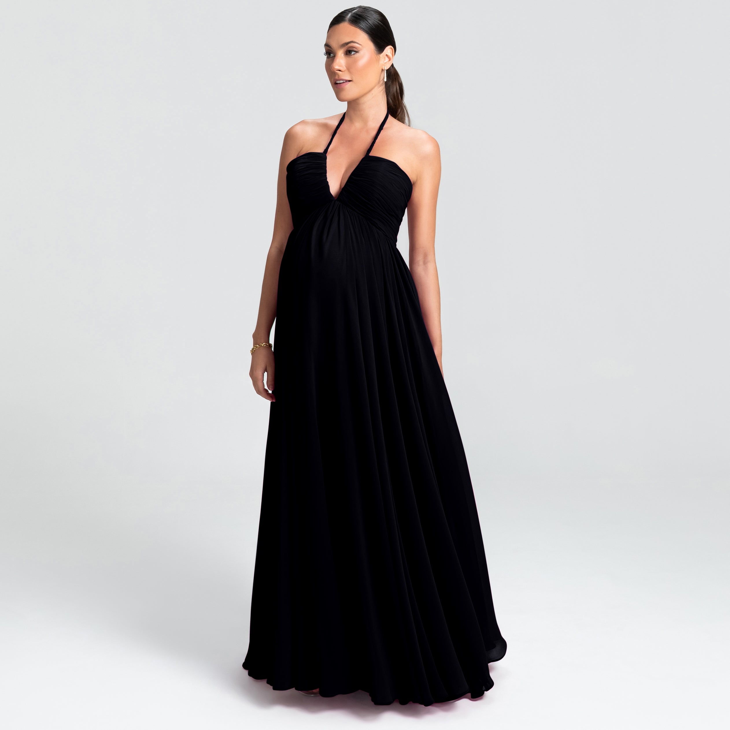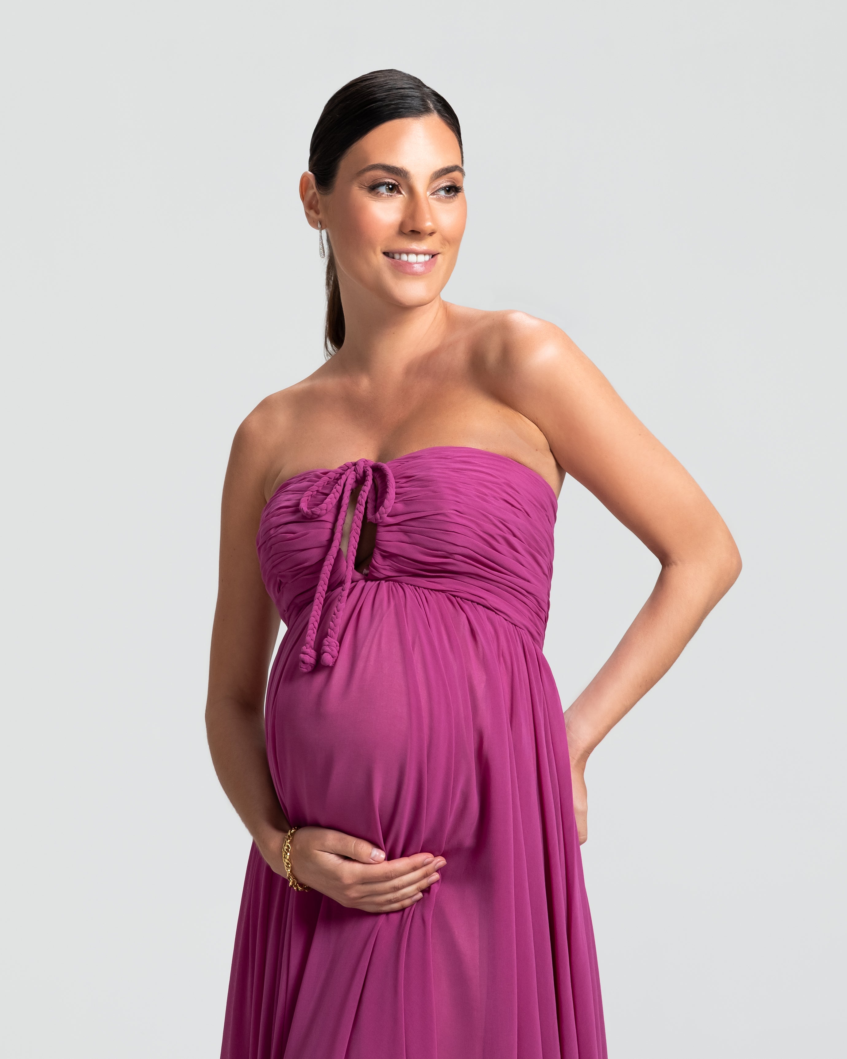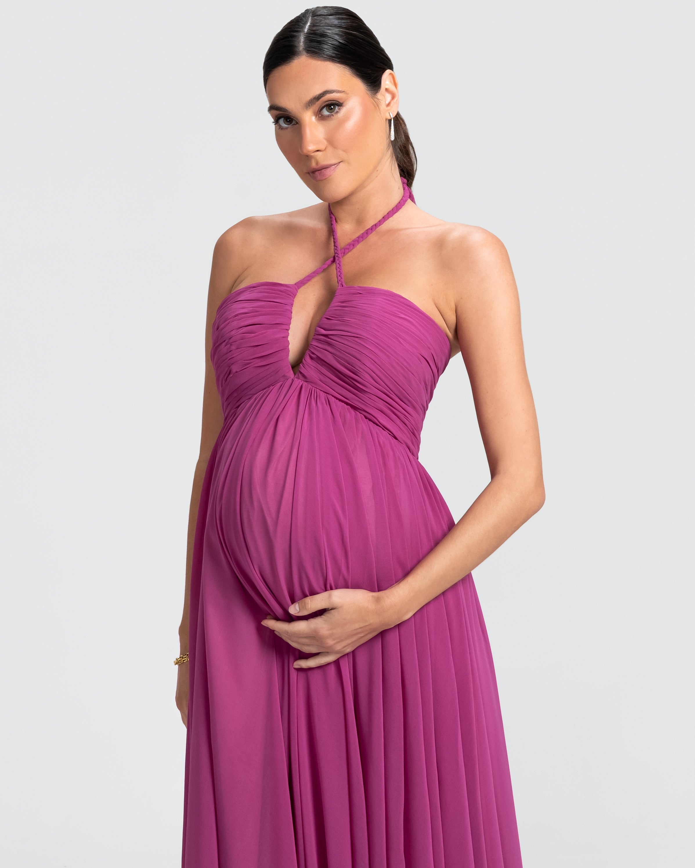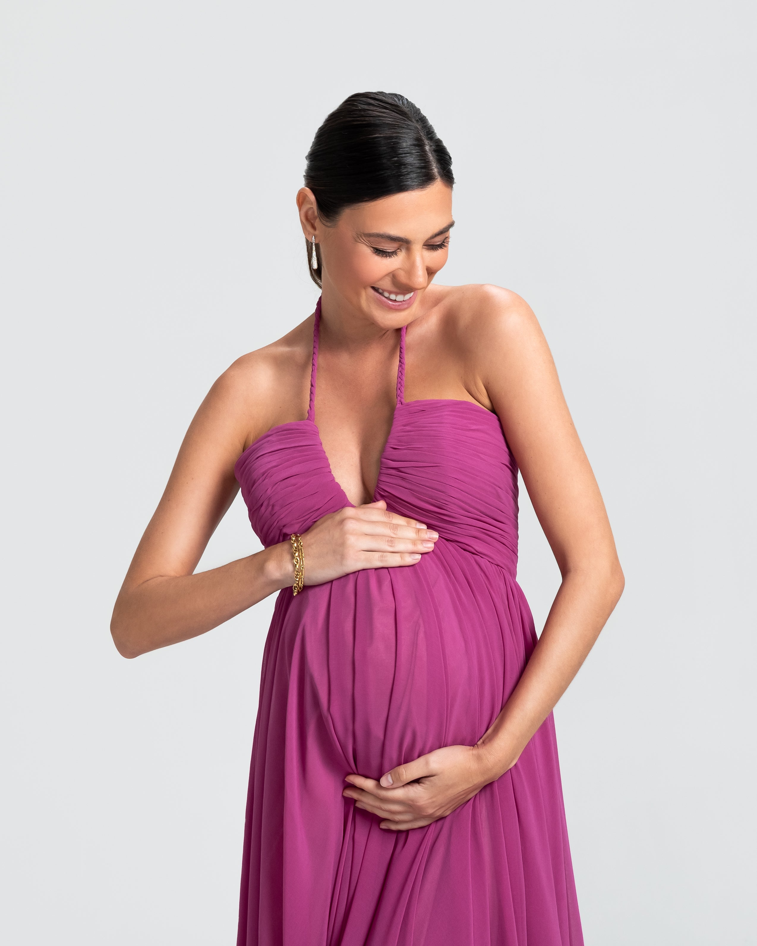 Leve e esvoaçante, este vestido de corte império destaca-se pelo busto drapeado com uma trança delicada que pode ser amarrada de diversas formas – atrás do pescoço, cruzada em X ou até tomara que caia com um laço na frente. A cintura solta garante conforto, tornando-o ideal para gestantes ou para quem prefere um caimento fluido e elegante. A saia ampla e franzida confere movimento e leveza, perfeito para quem busca feminilidade e liberdade no look.