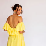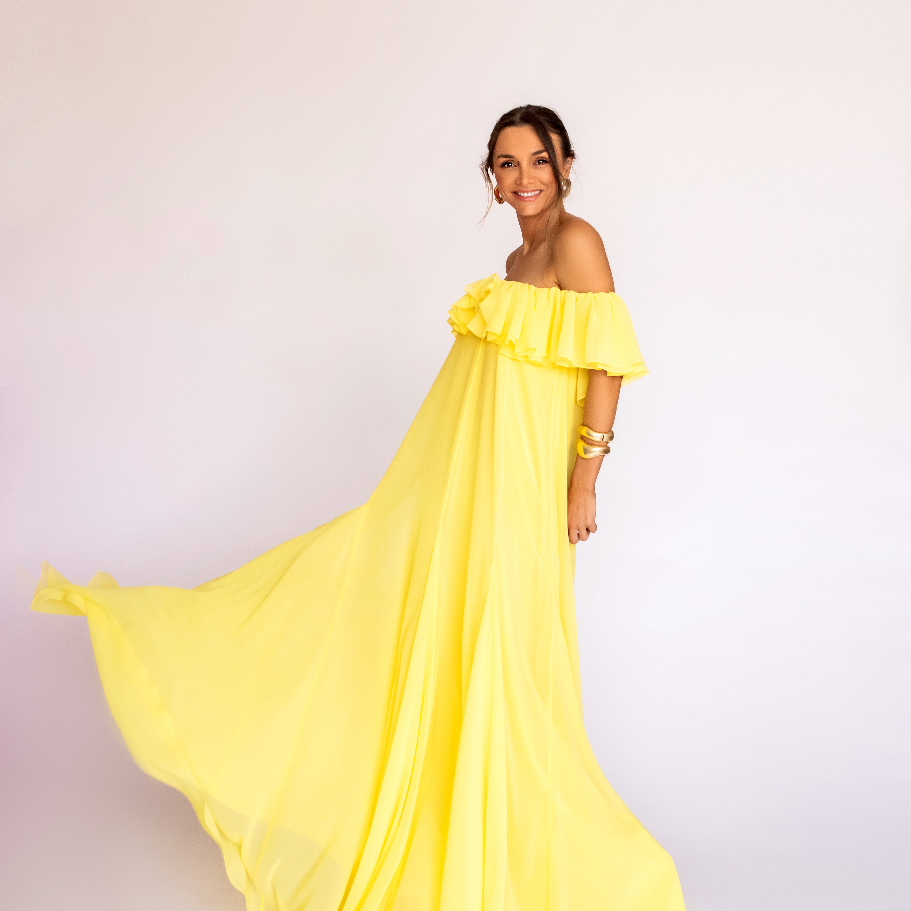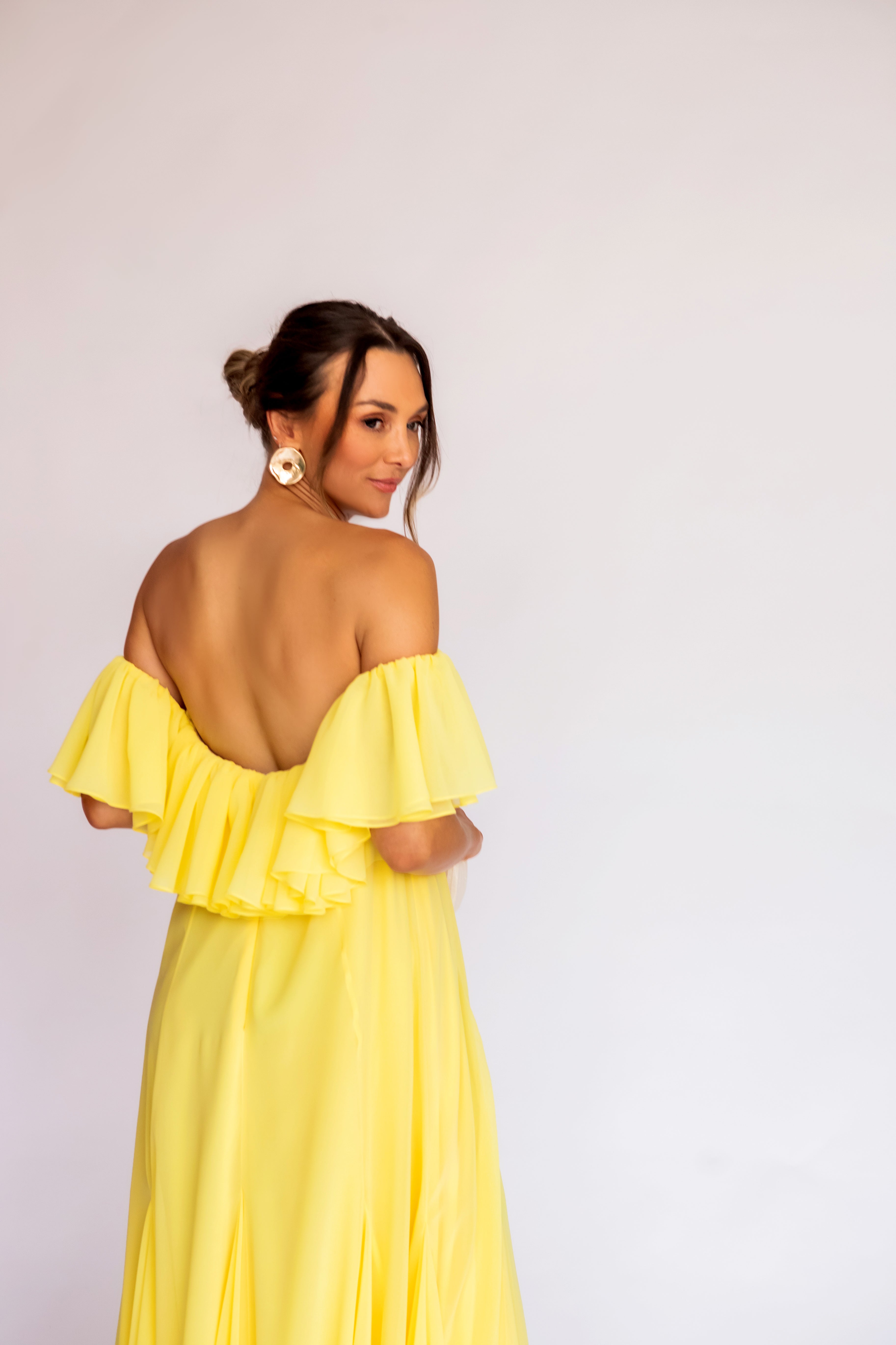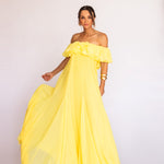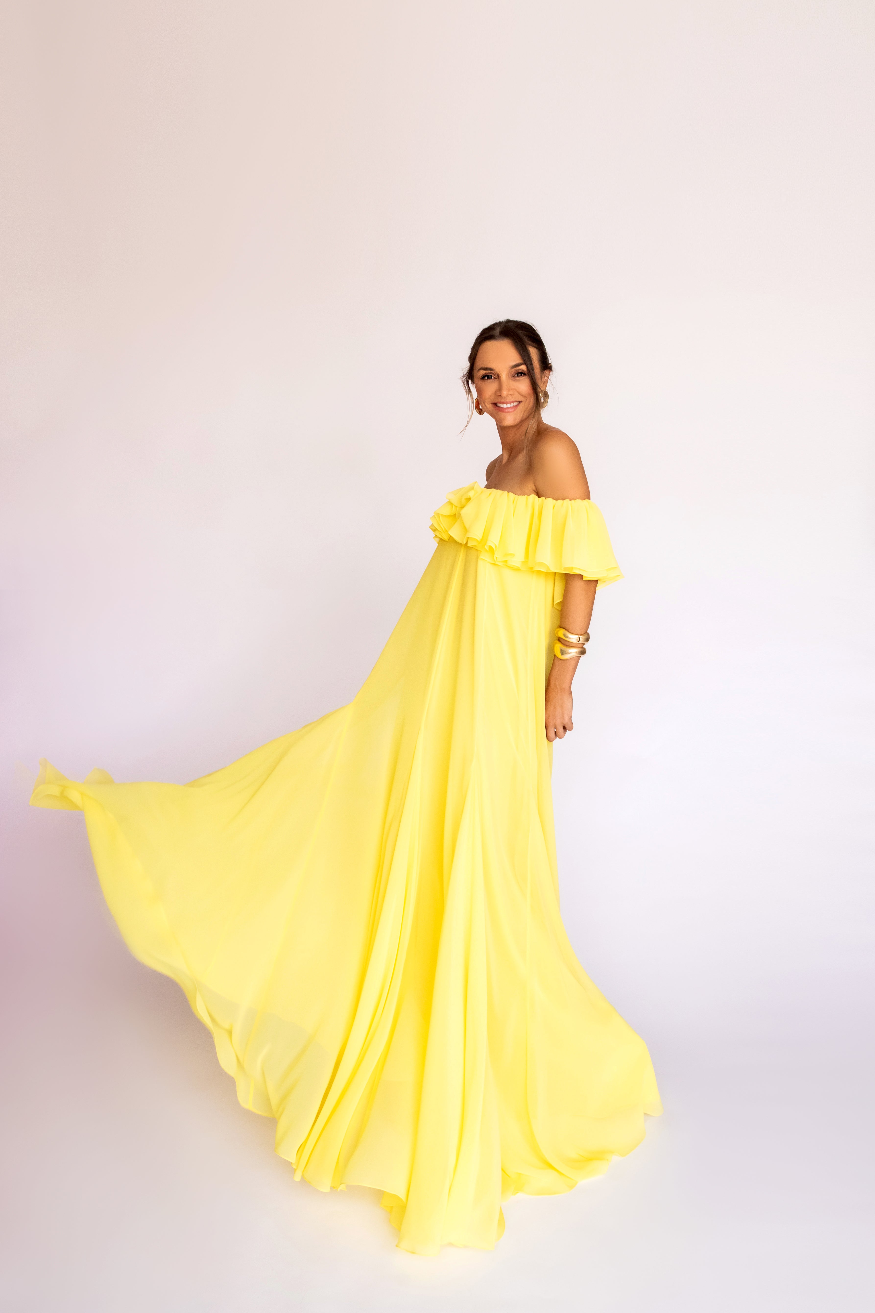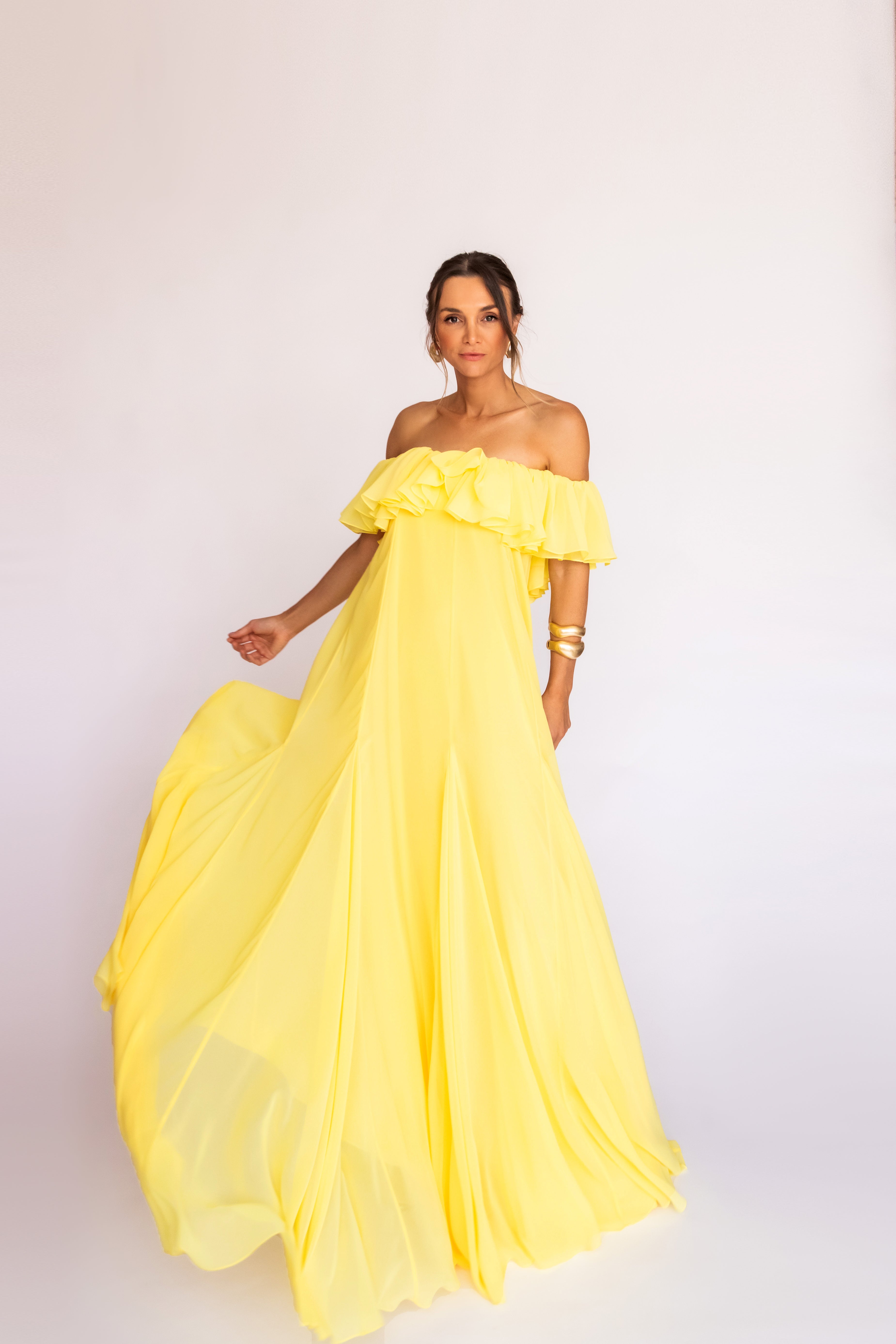 Vestido Longo em Musseline Fluida Amplo com Babados Ombro a Ombro – REF: OD89