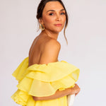 Amplo e esvoaçante, este vestido em musseline fluida conquista pela leveza e movimento. Os recortes verticais com aplicações de tecido ampliam o caimento, criando uma silhueta elegante e delicada. O decote ombro a ombro é adornado por várias camadas de babados fluidos, que voam com naturalidade e garantem um visual marcante. Por baixo, o corpo conta com um sutiã estruturado estilo tomara que caia, oferecendo sustentação sem perder a leveza do design.