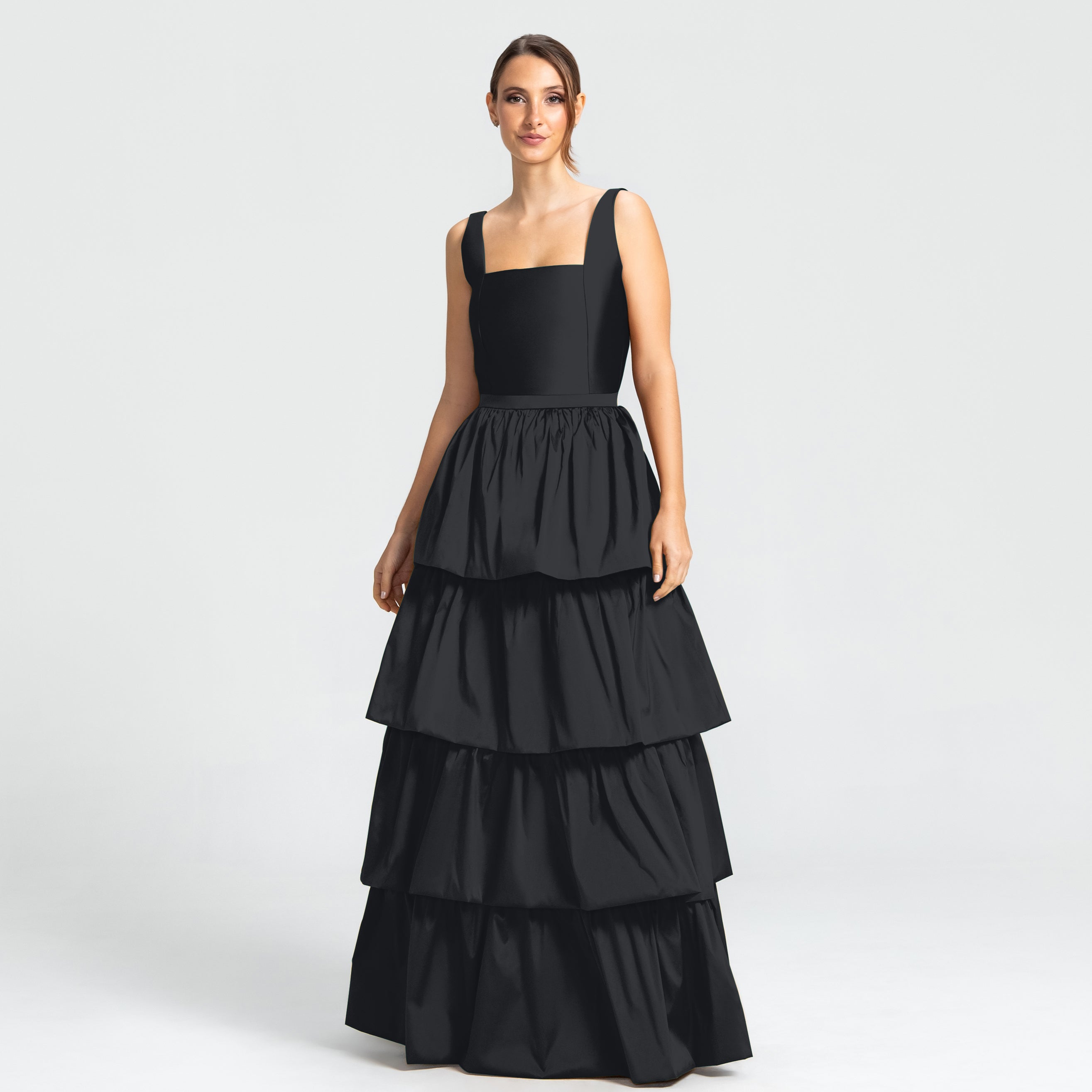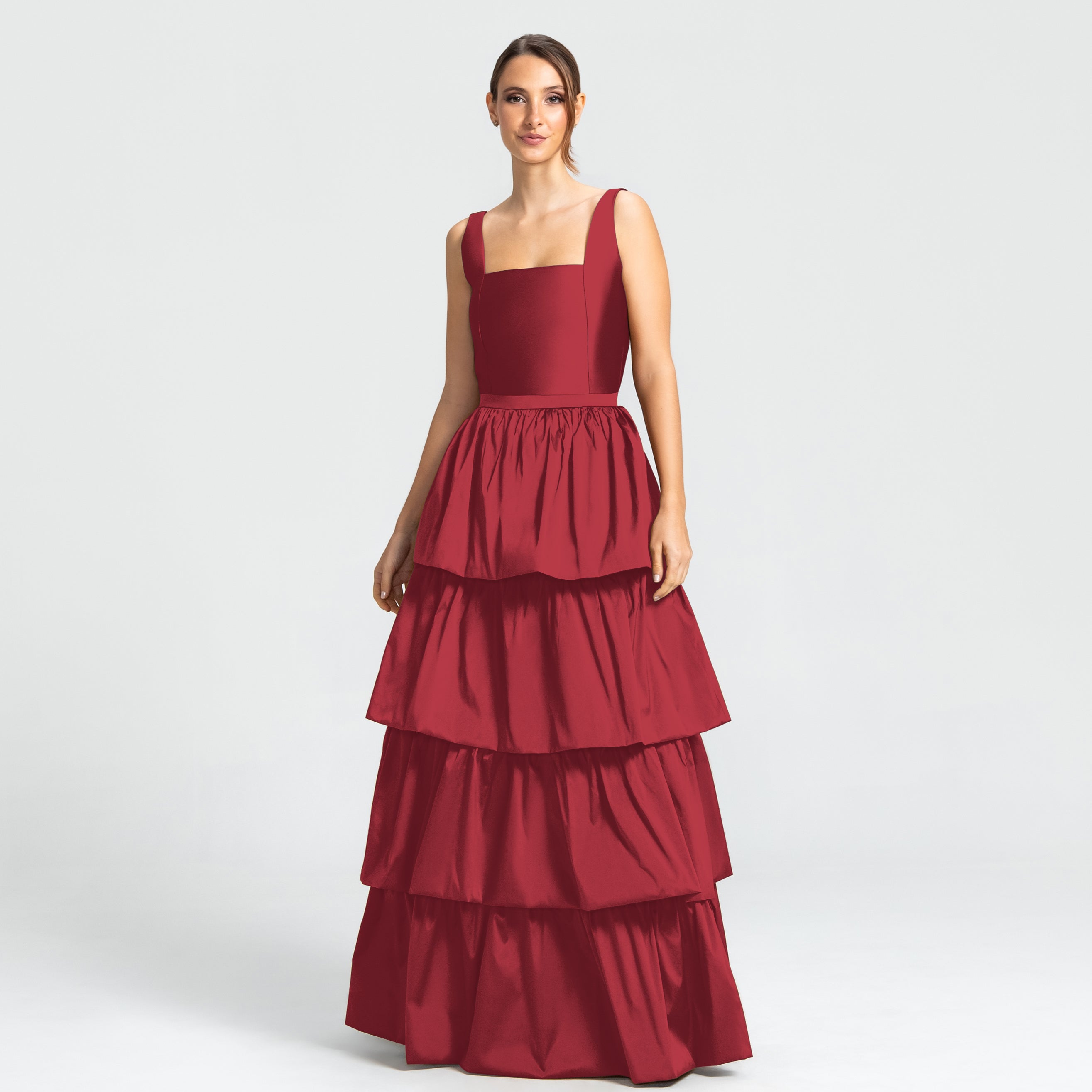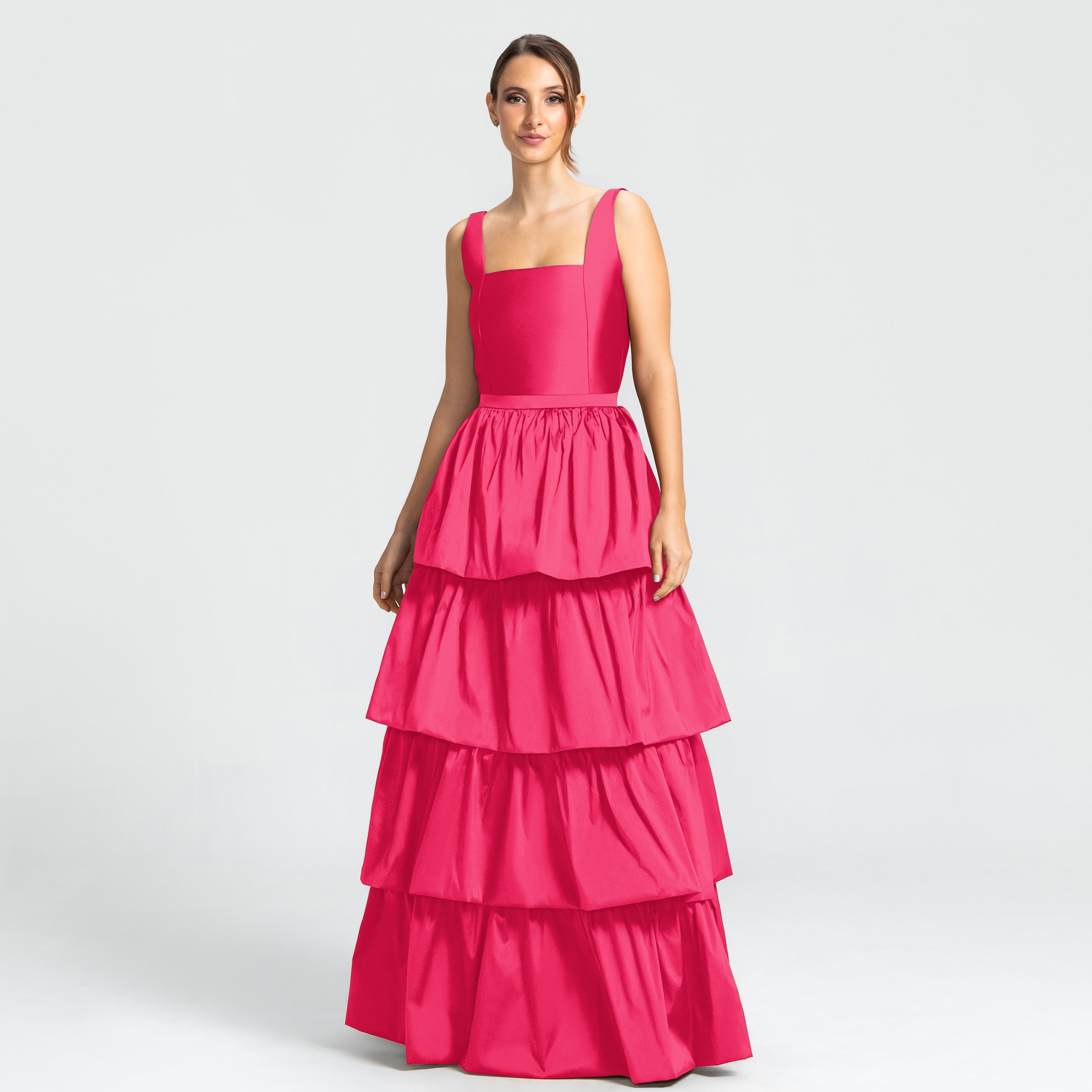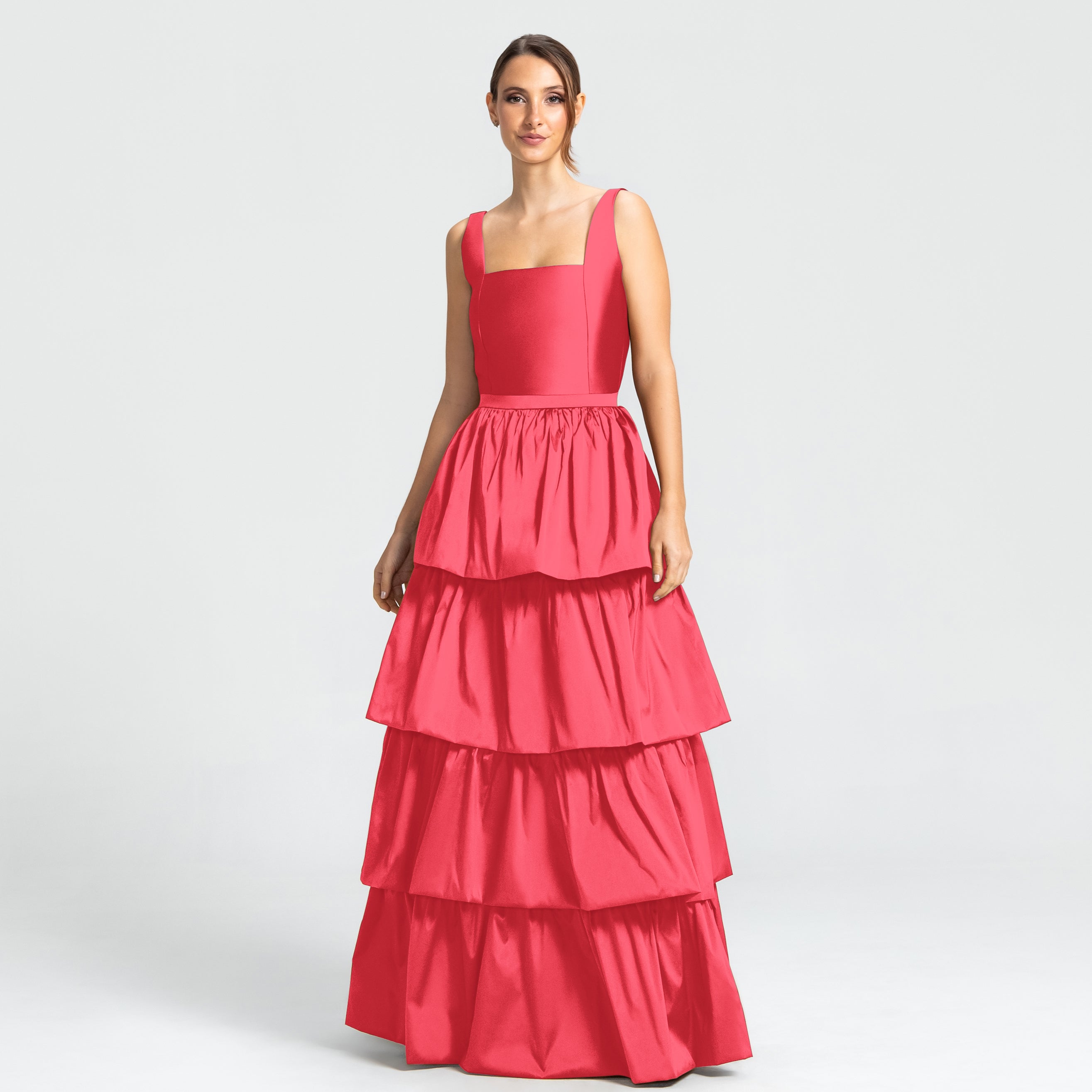 Sofisticado e feminino, este vestido apresenta um decote quadrado e um corpo ajustado que realça a silhueta. A saia em camadas de tafetá cria um efeito volumoso e imponente, enquanto as costas abertas com amarração finalizada por um laço conferem um toque romântico e delicado.