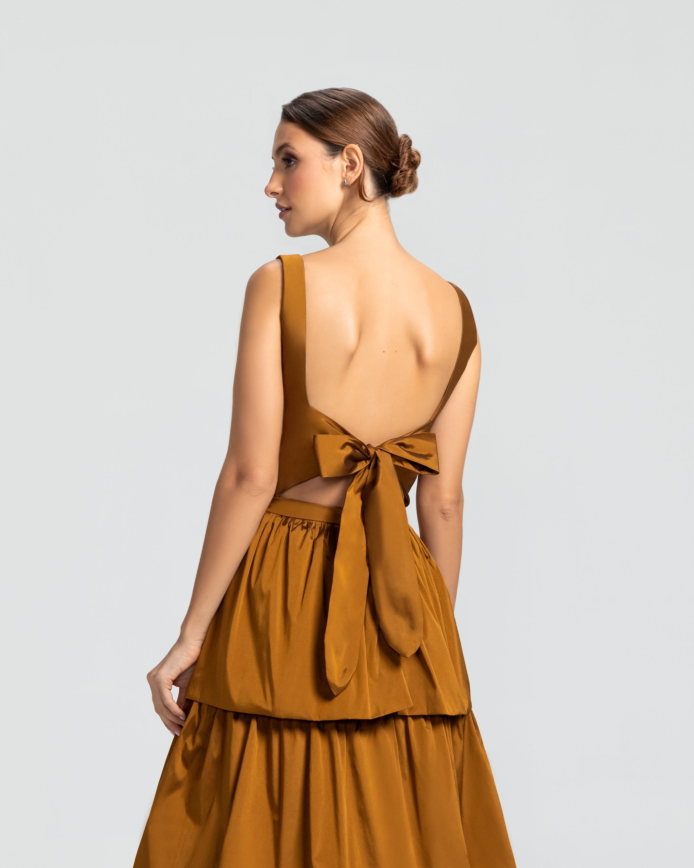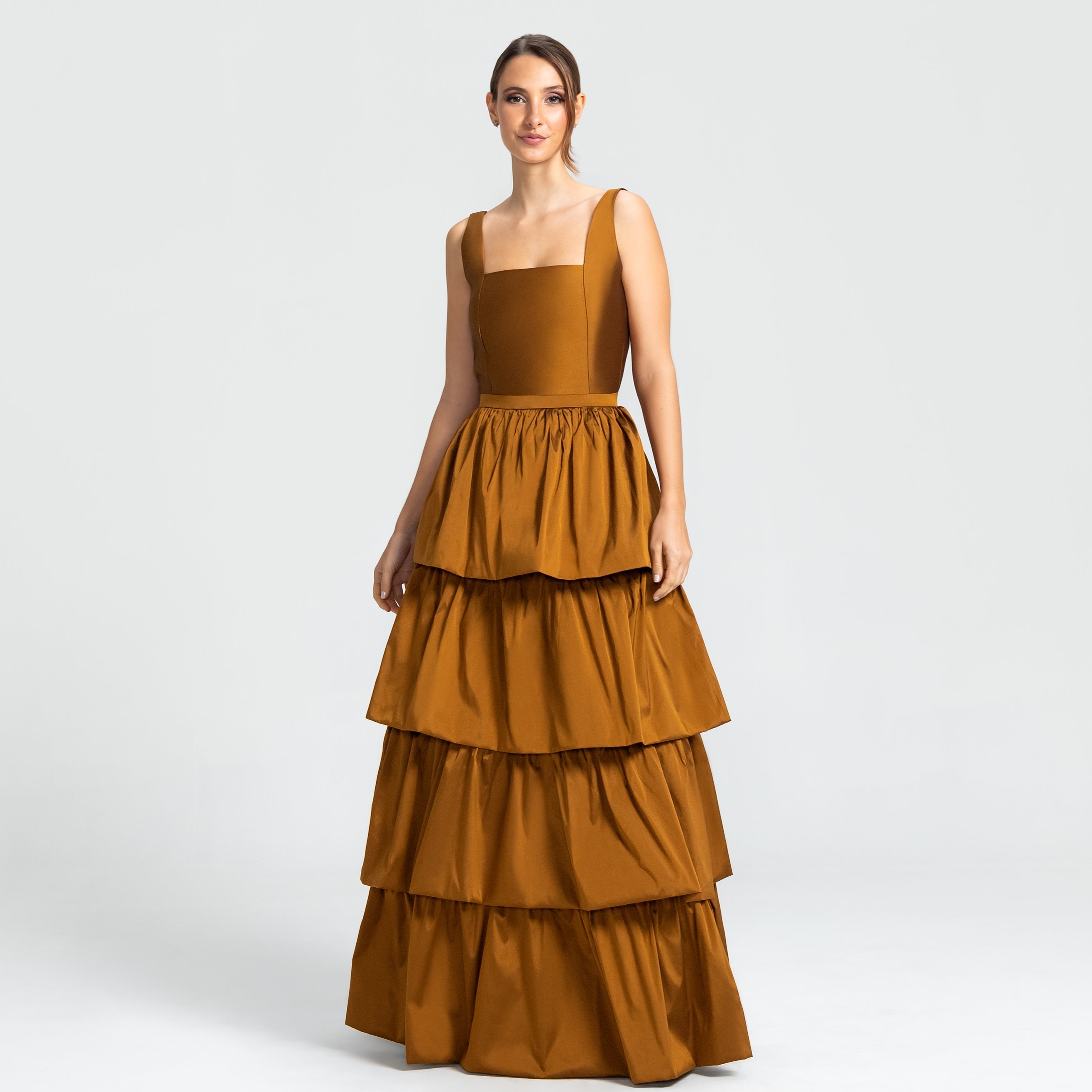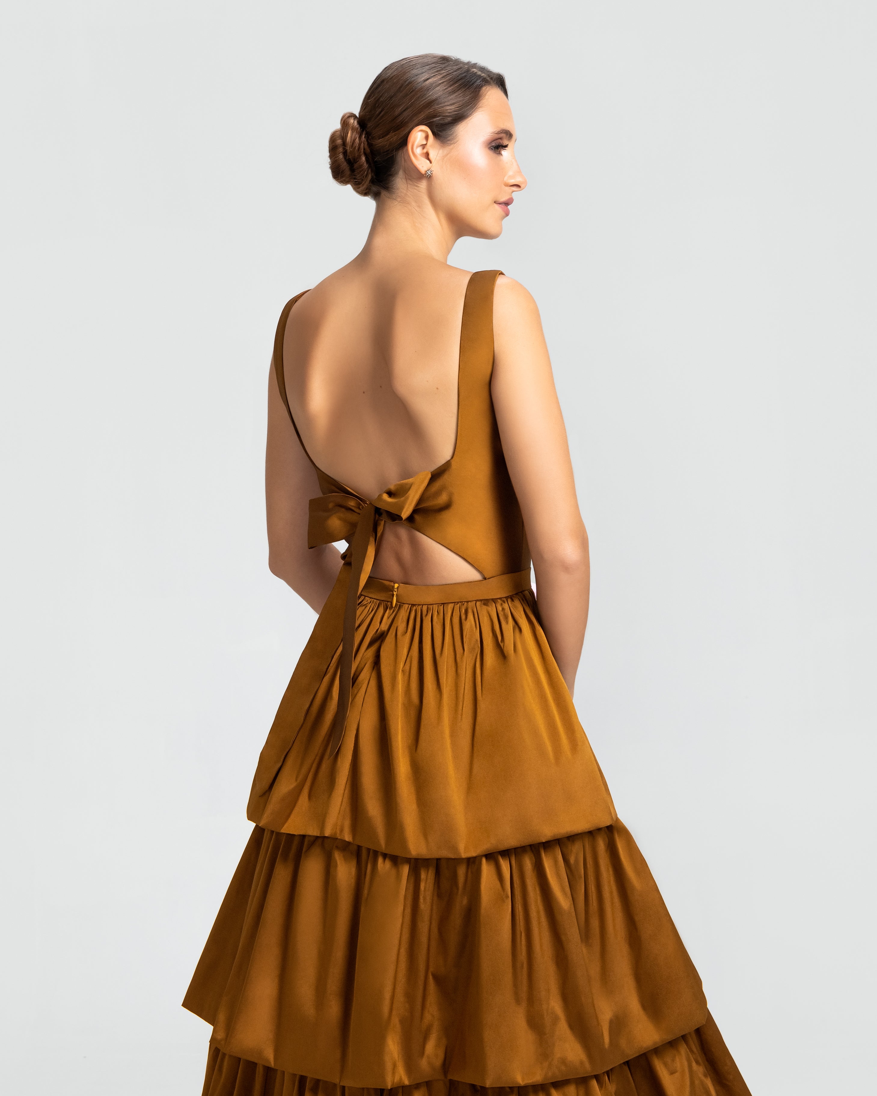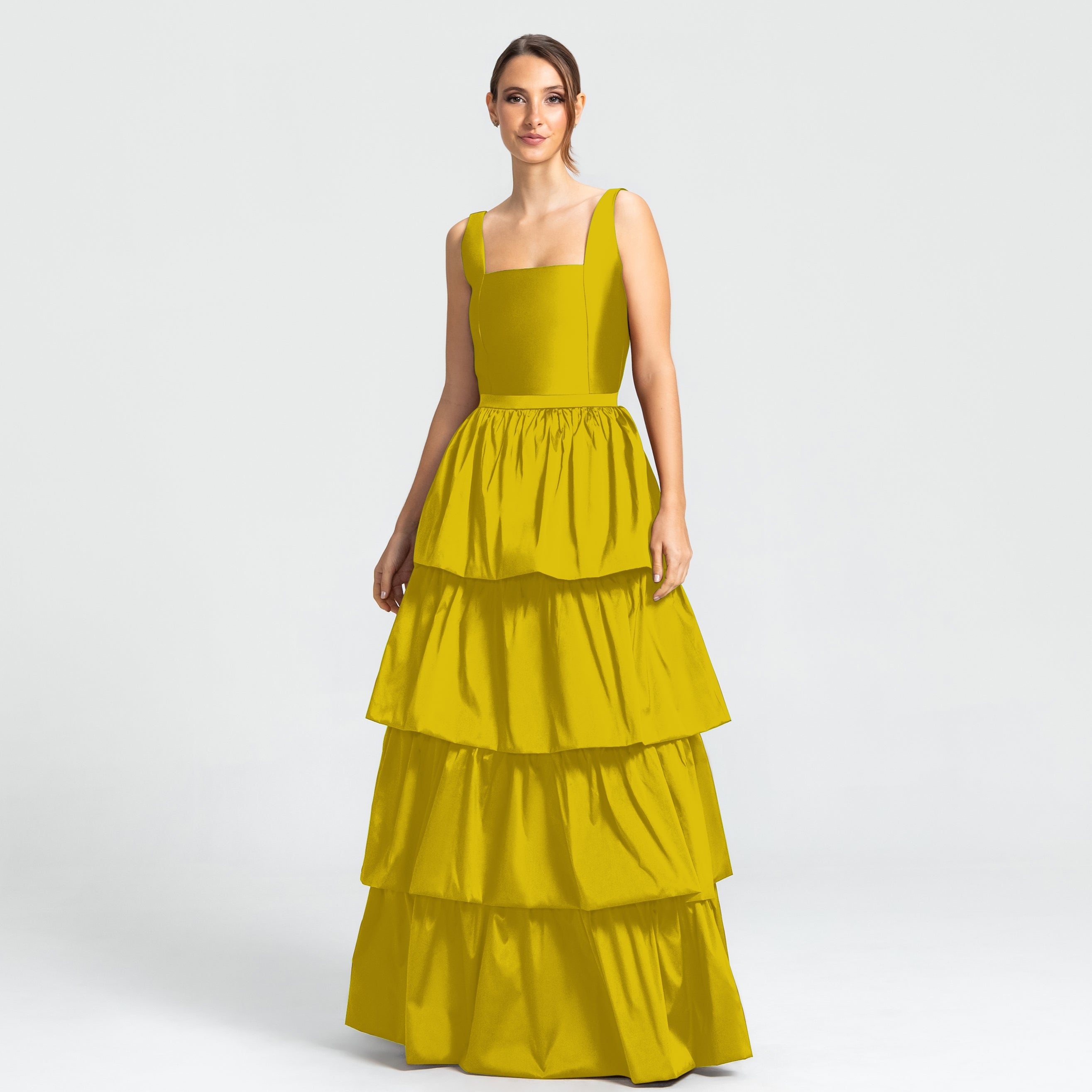 Sofisticado e feminino, este vestido apresenta um decote quadrado e um corpo ajustado que realça a silhueta. A saia em camadas de tafetá cria um efeito volumoso e imponente, enquanto as costas abertas com amarração finalizada por um laço conferem um toque romântico e delicado.