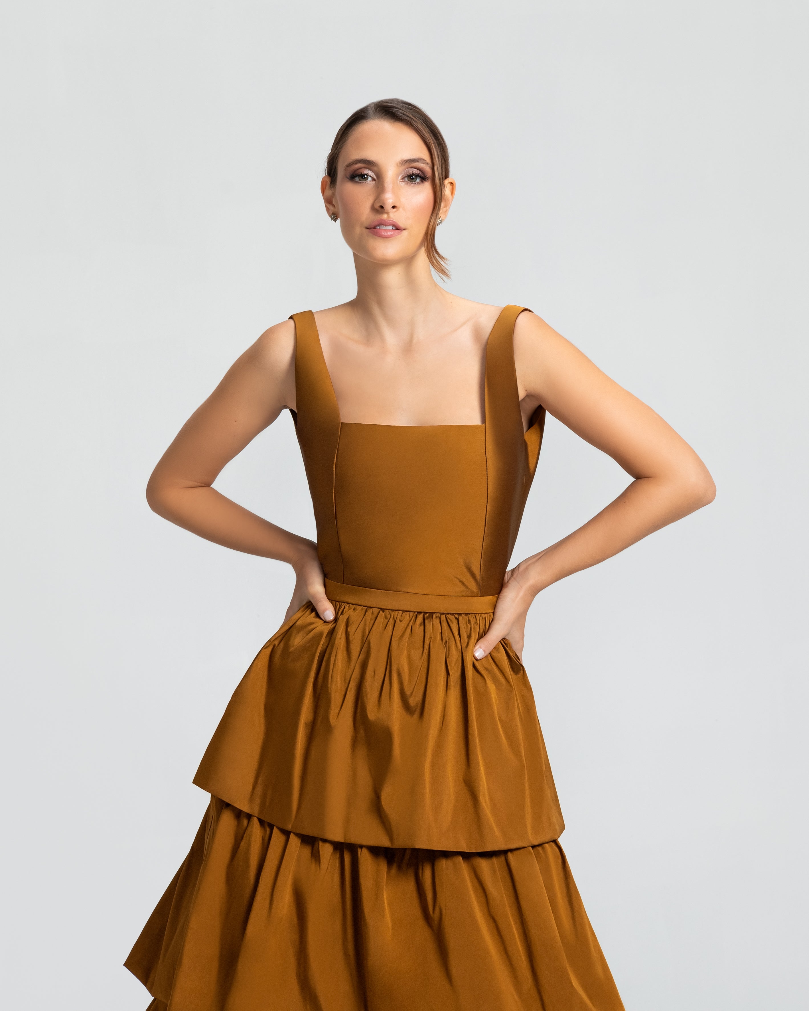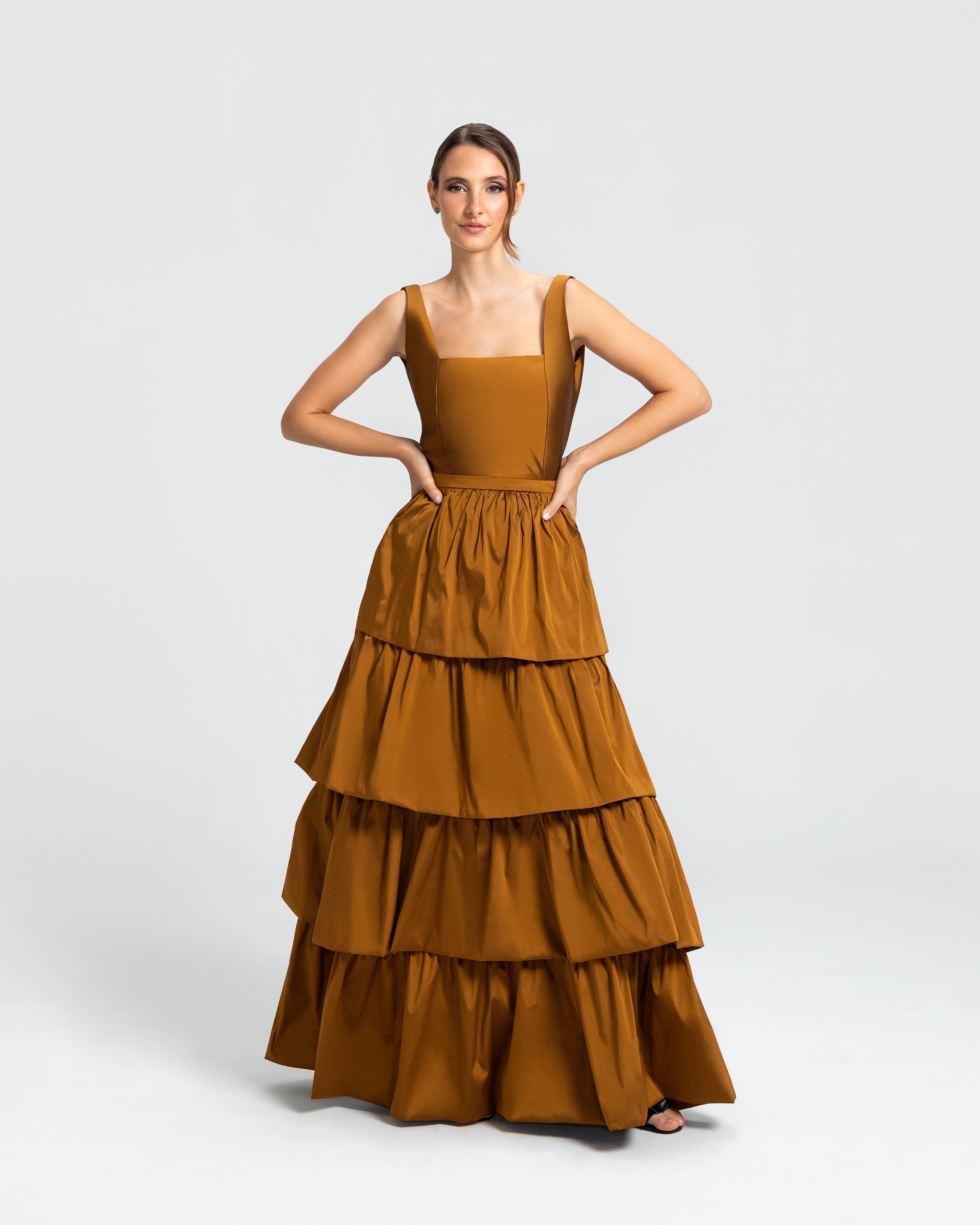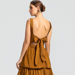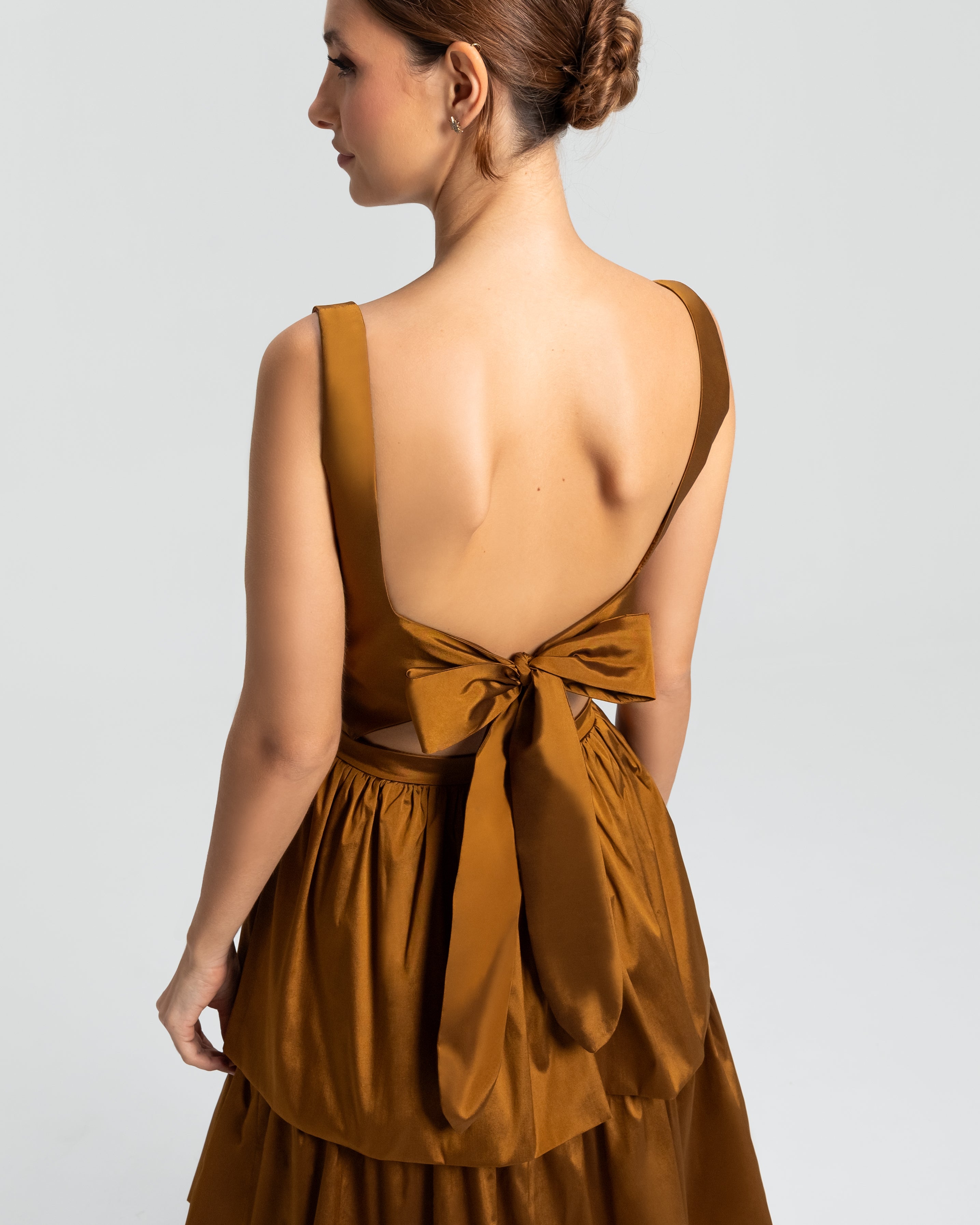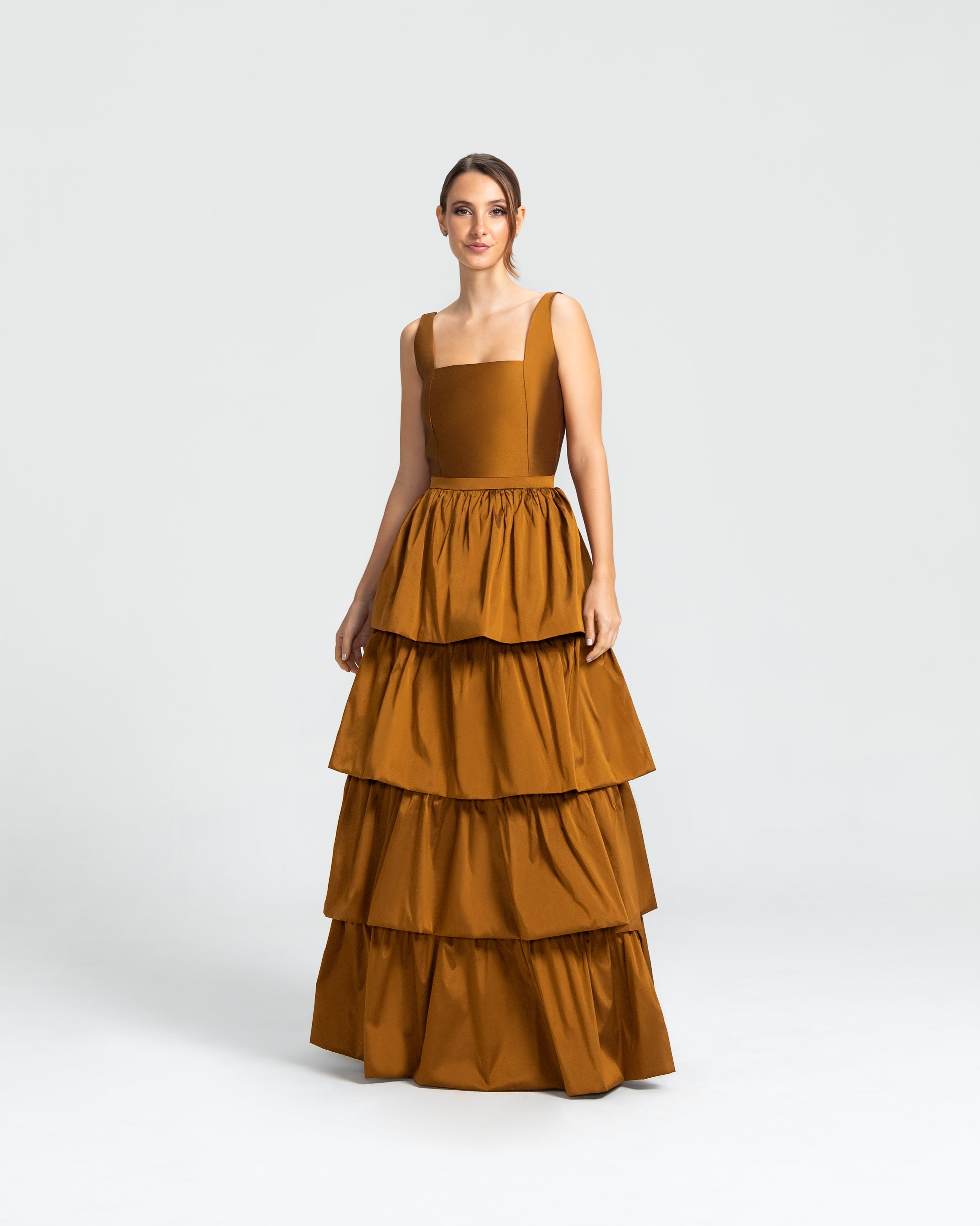 Sofisticado e feminino, este vestido apresenta um decote quadrado e um corpo ajustado que realça a silhueta. A saia em camadas de tafetá cria um efeito volumoso e imponente, enquanto as costas abertas com amarração finalizada por um laço conferem um toque romântico e delicado.