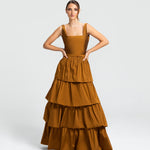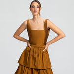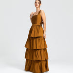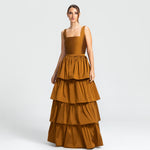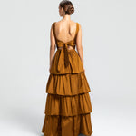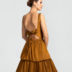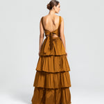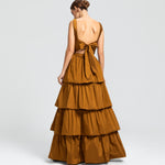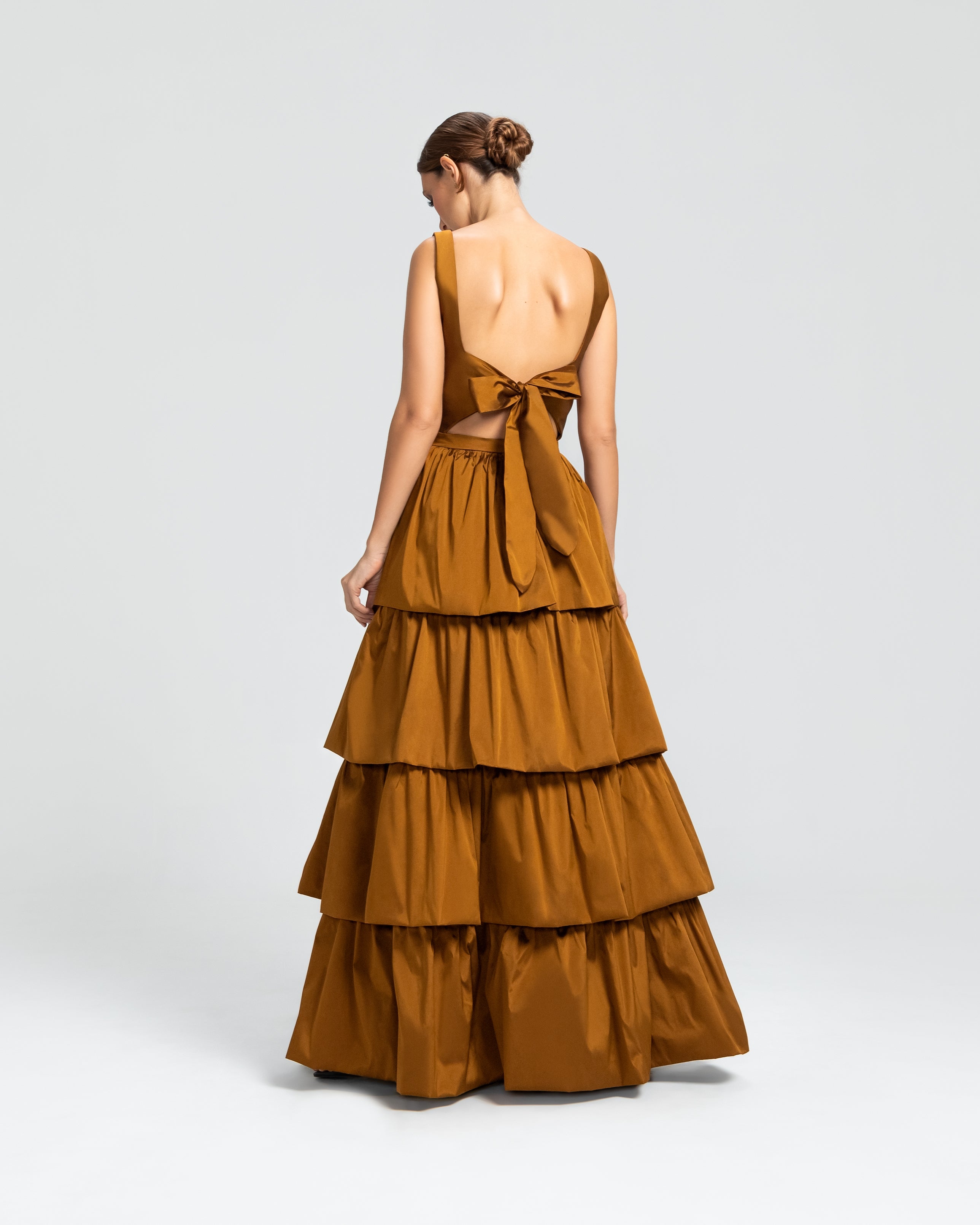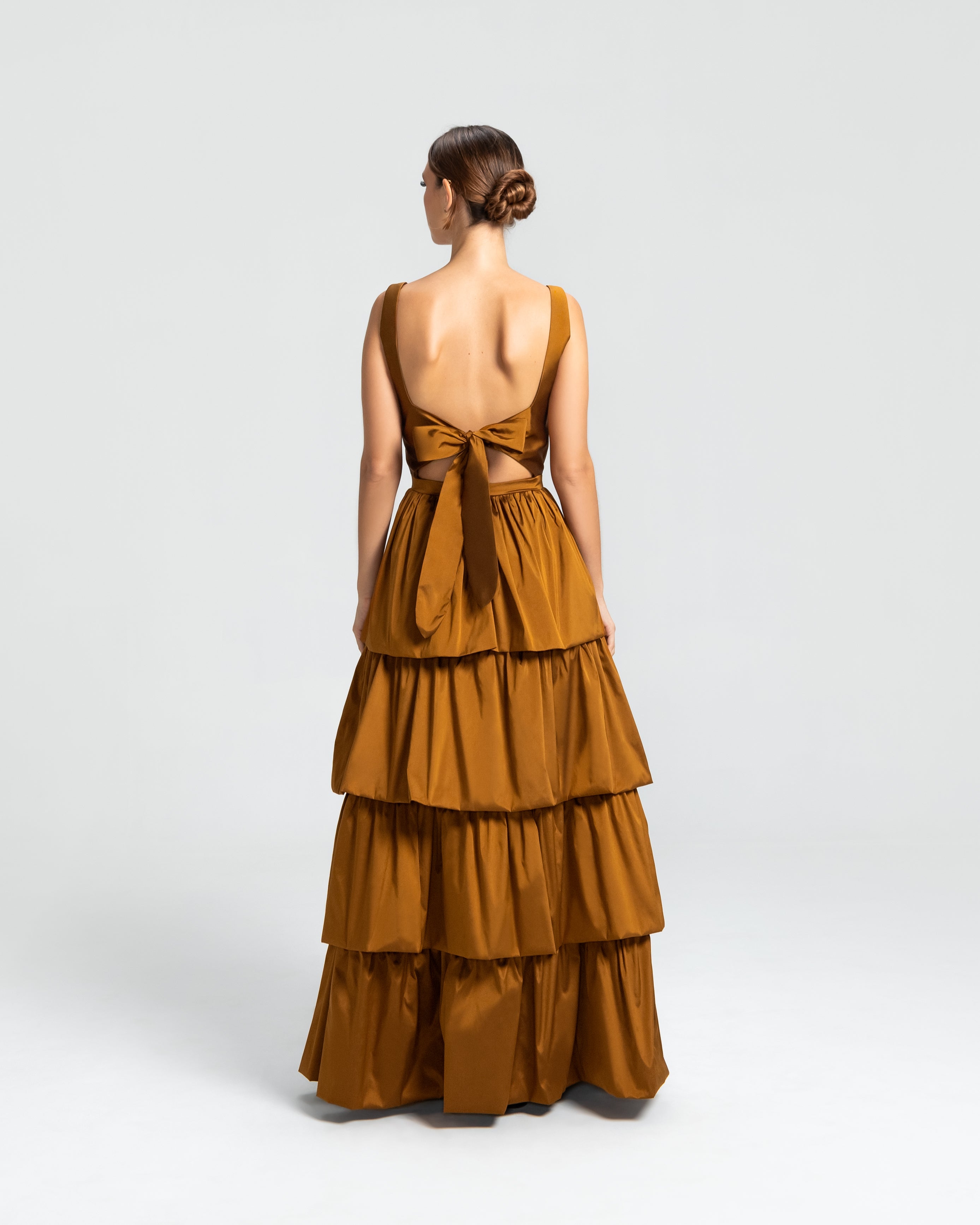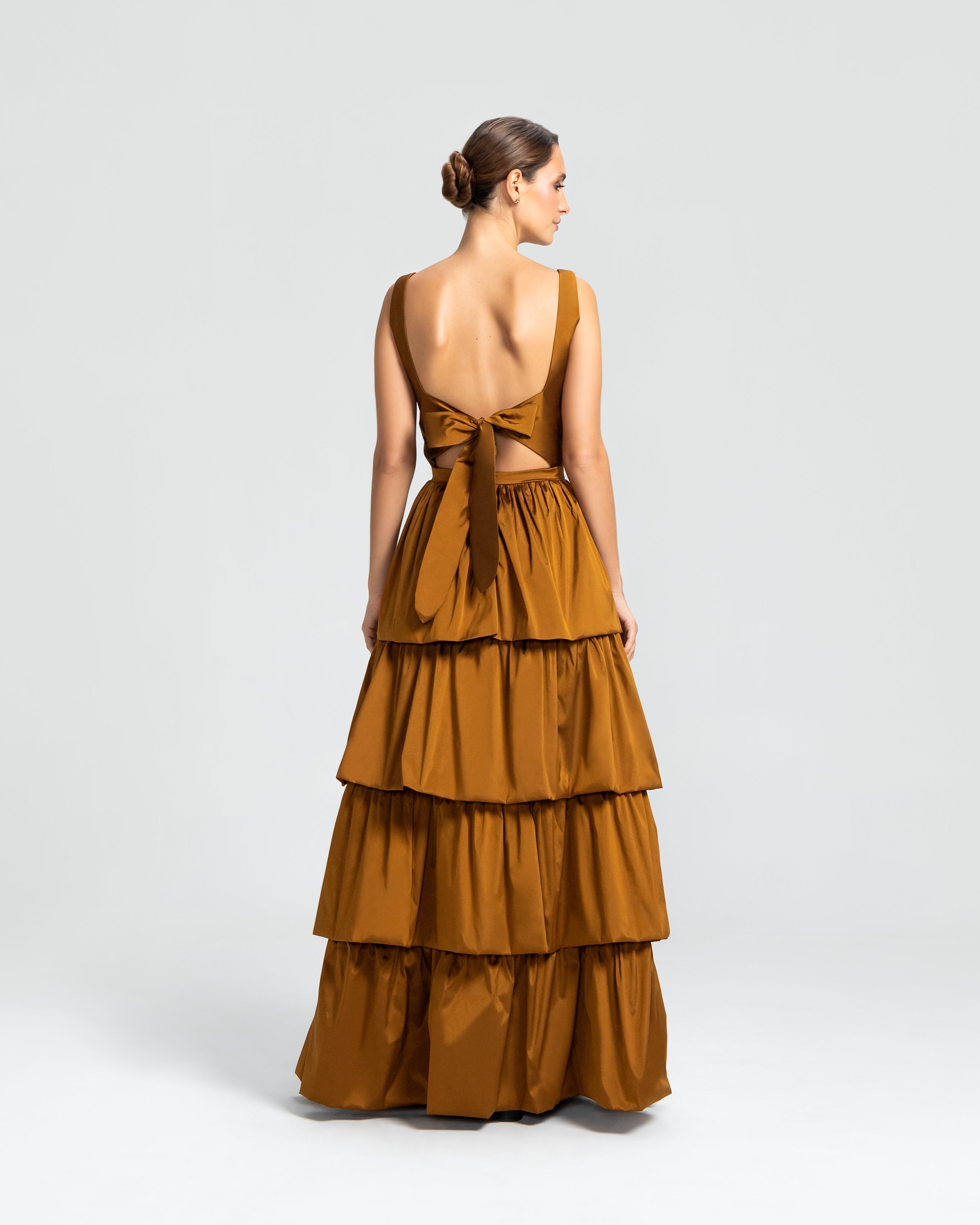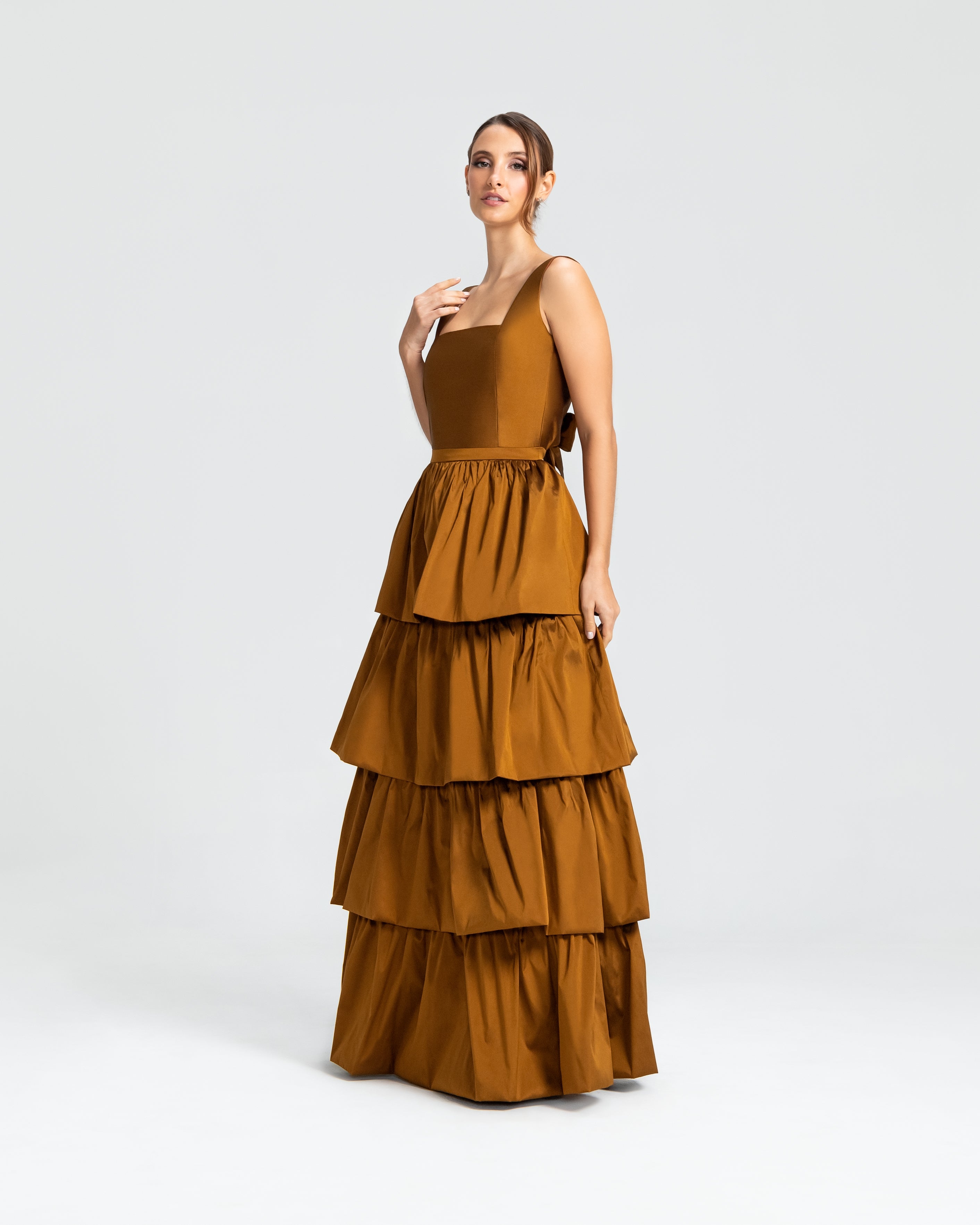 Sofisticado e feminino, este vestido apresenta um decote quadrado e um corpo ajustado que realça a silhueta. A saia em camadas de tafetá cria um efeito volumoso e imponente, enquanto as costas abertas com amarração finalizada por um laço conferem um toque romântico e delicado.
