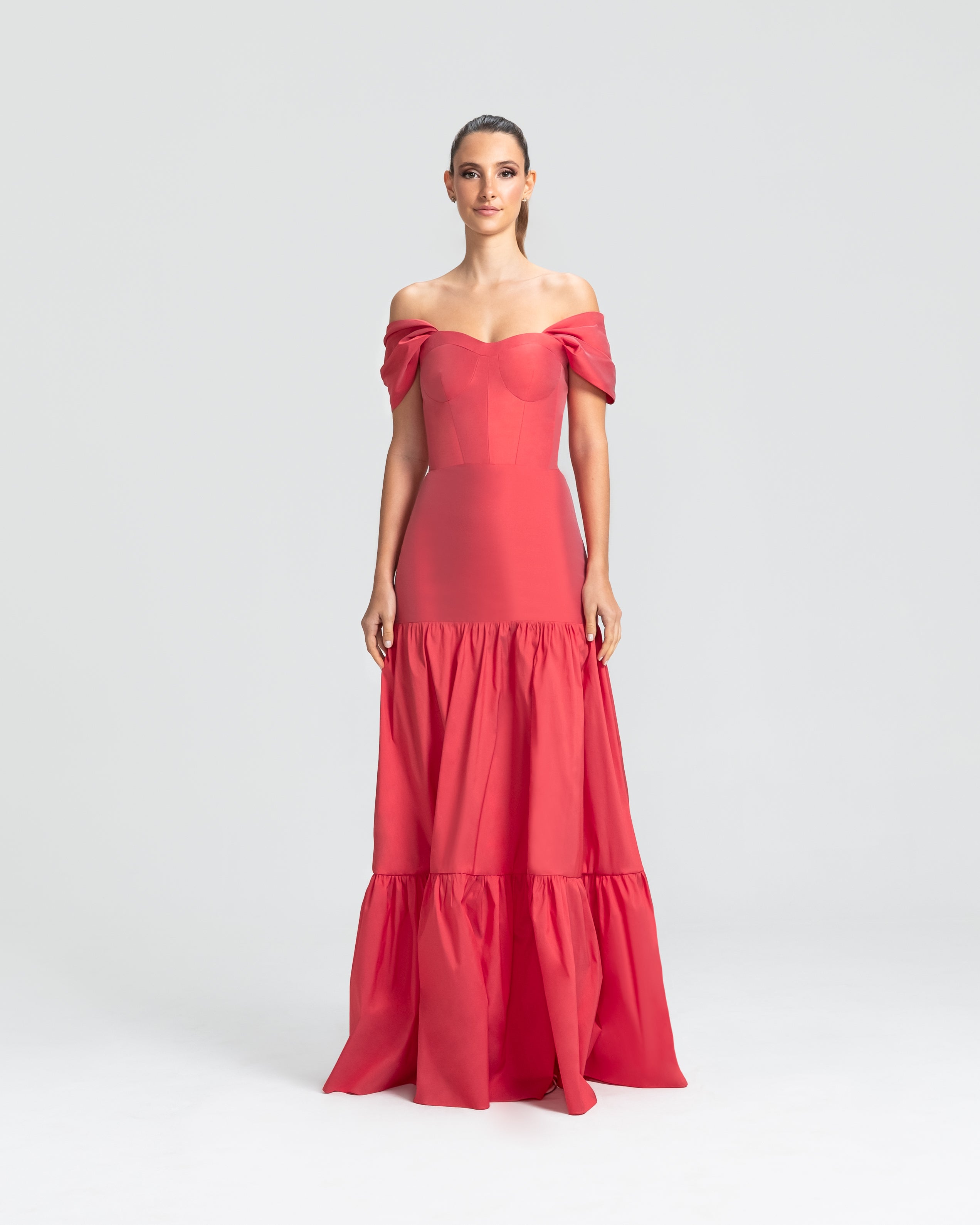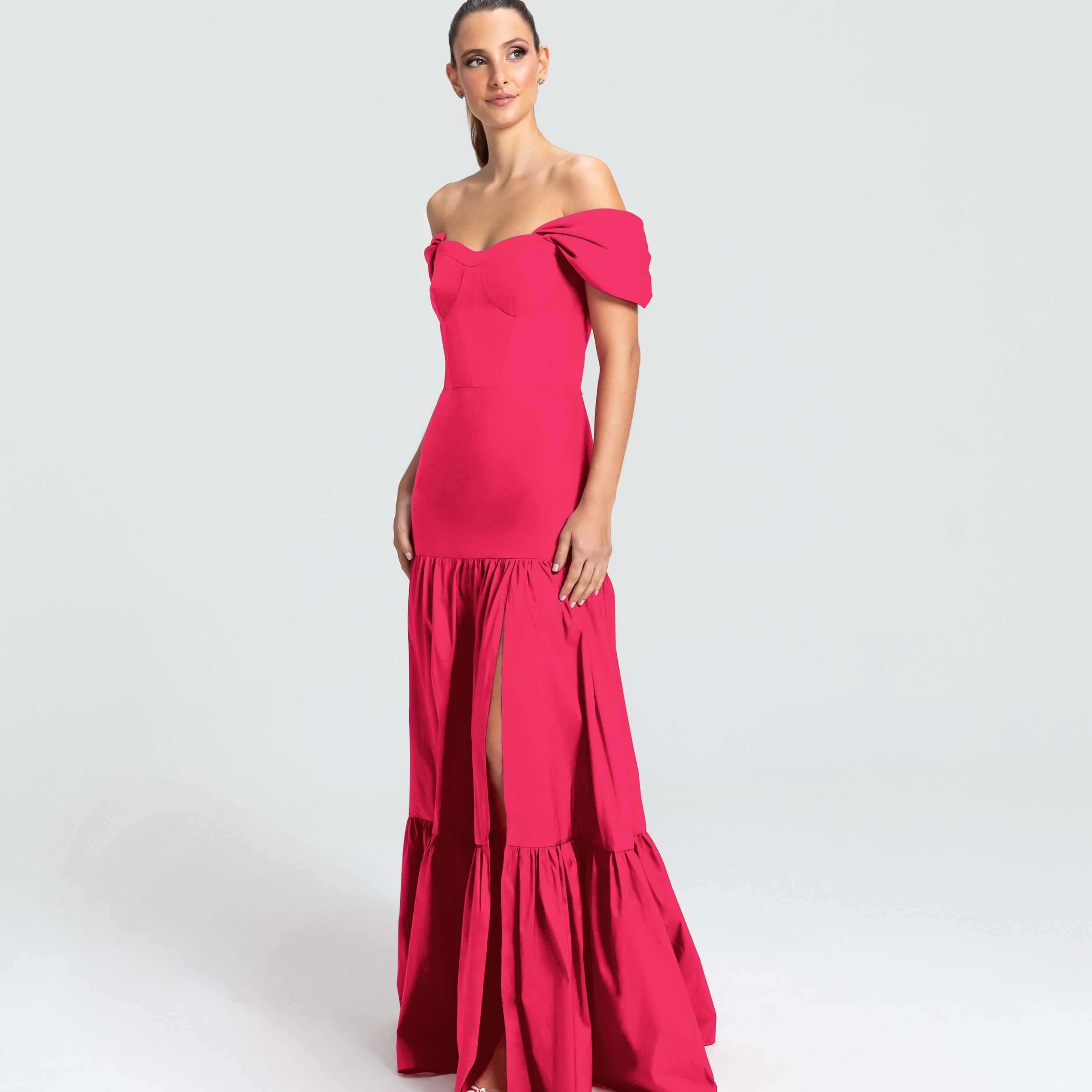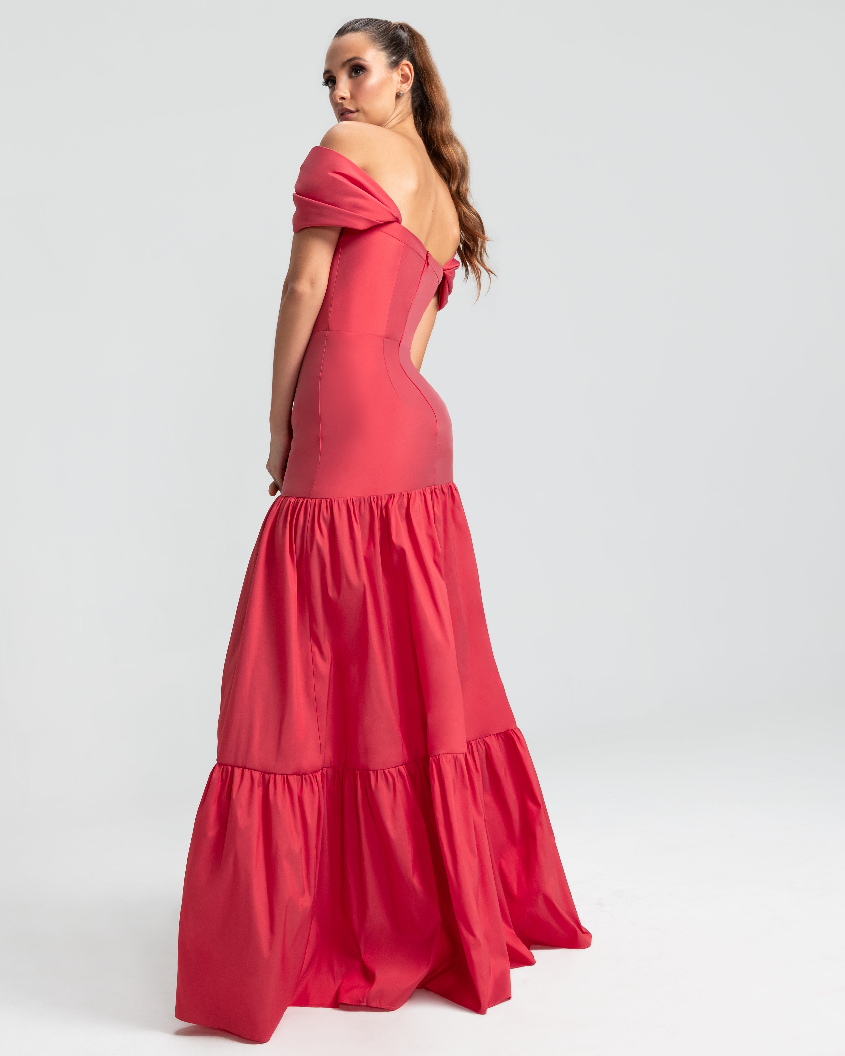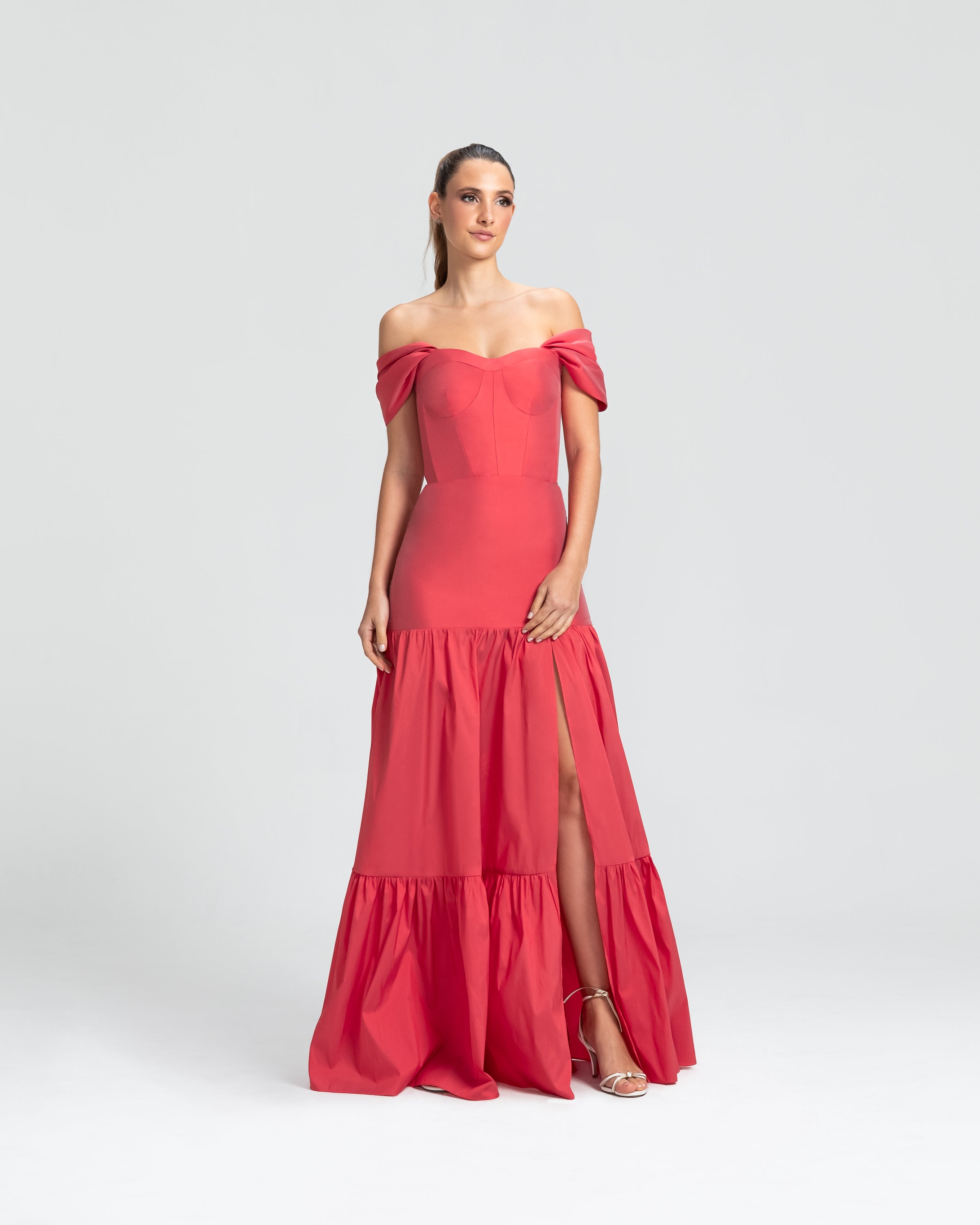 Vestido Longo em Tafetá Ombro a Ombro Cadeirão e Saia Franzida – REF: EG25
