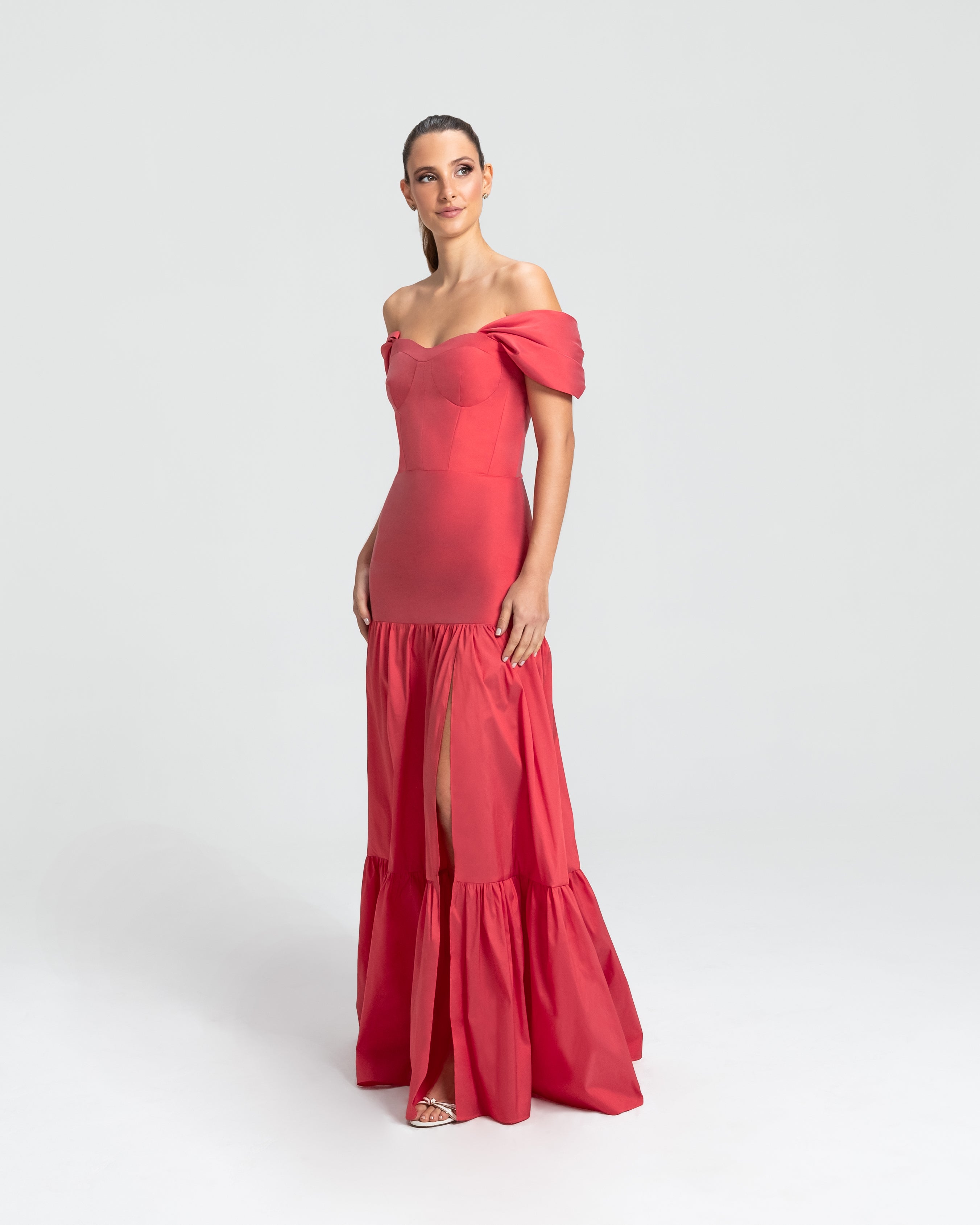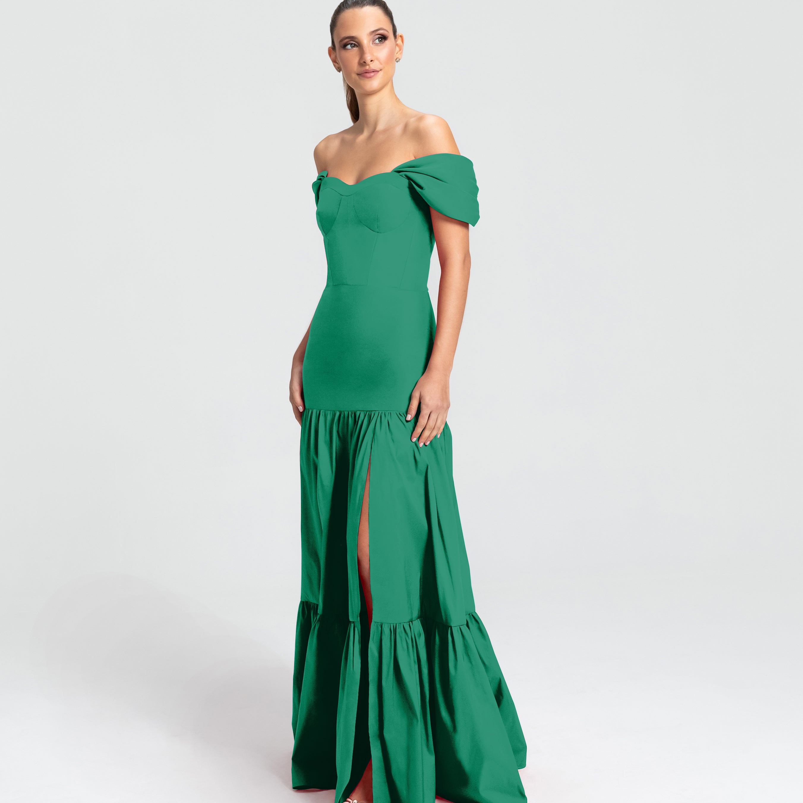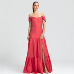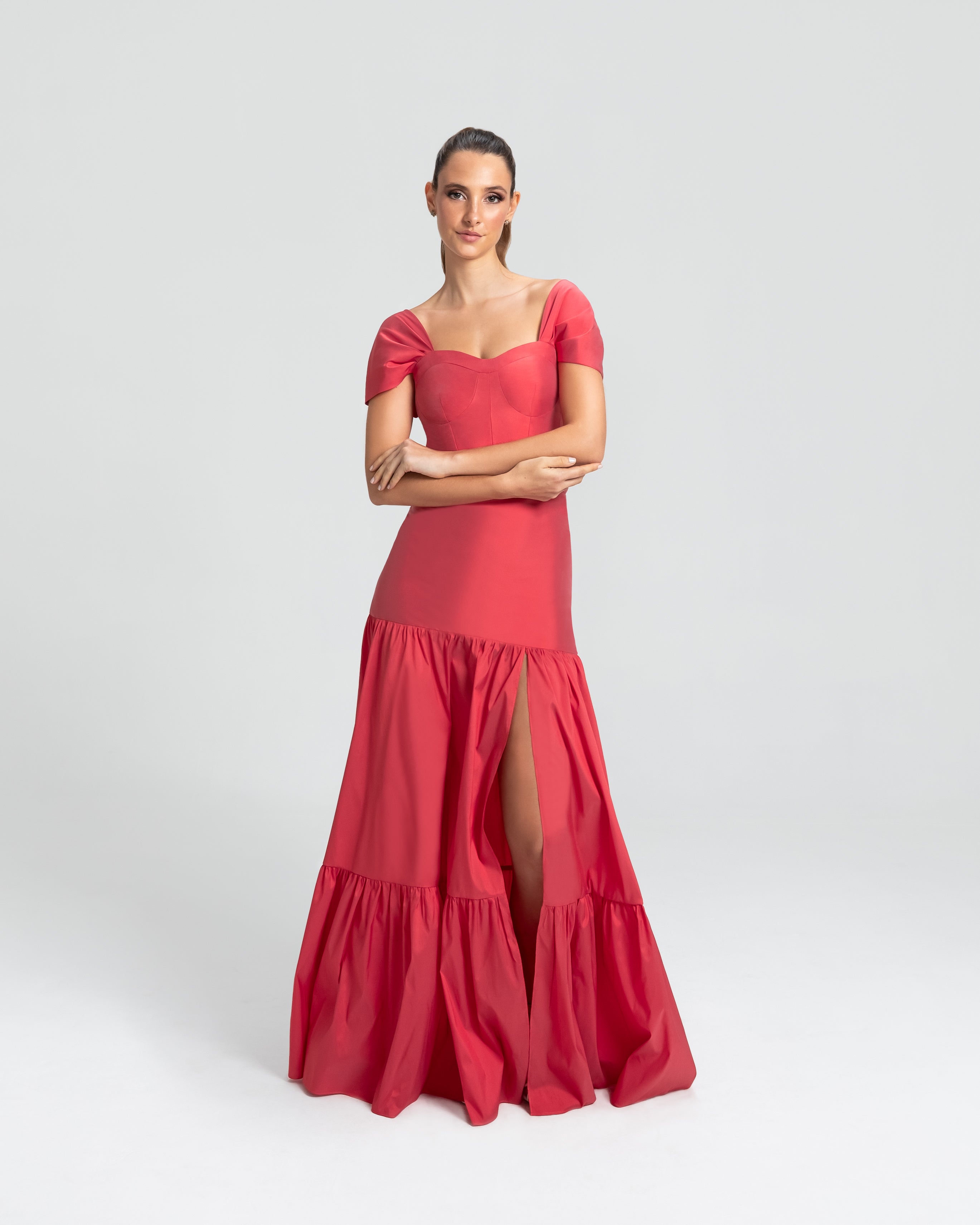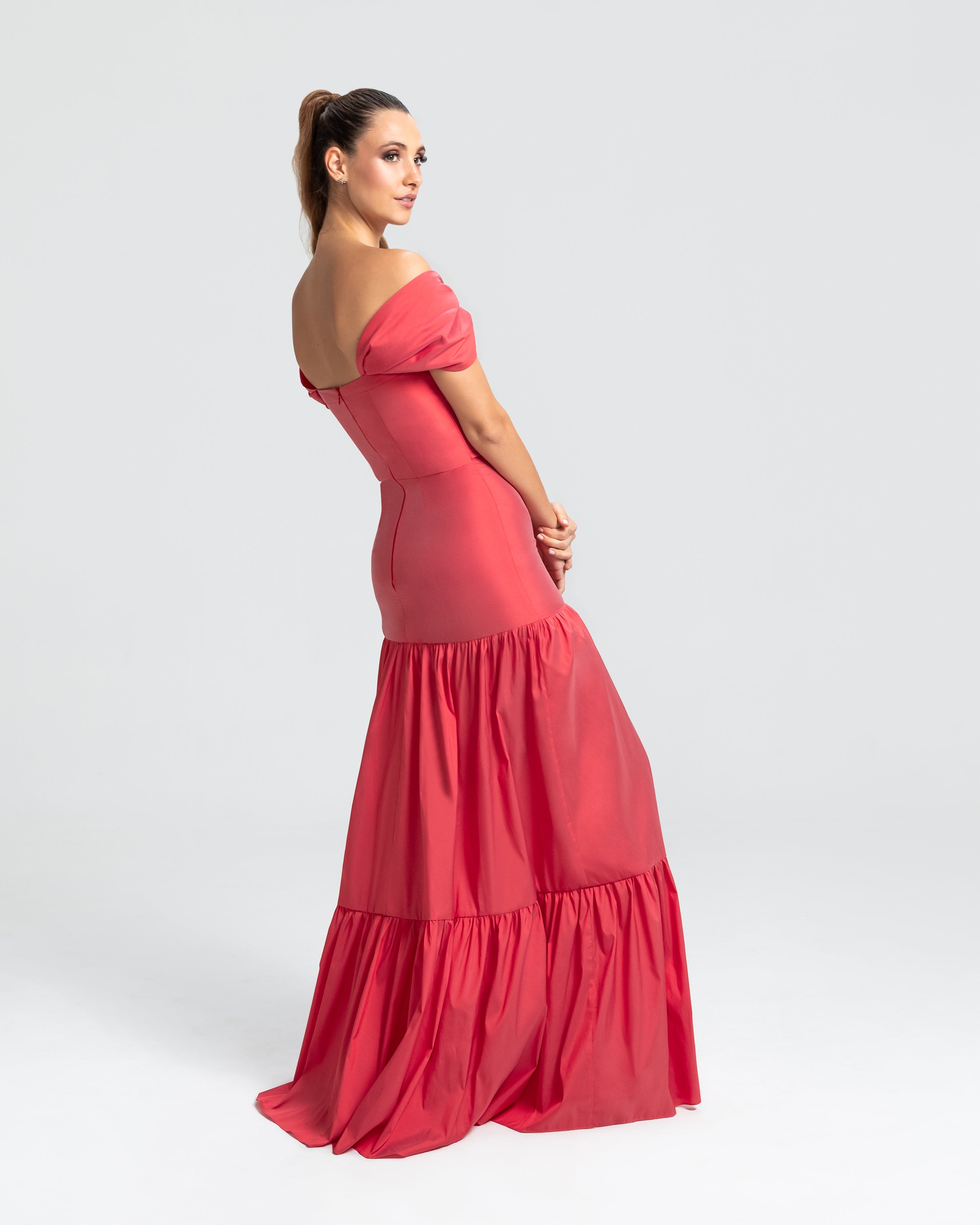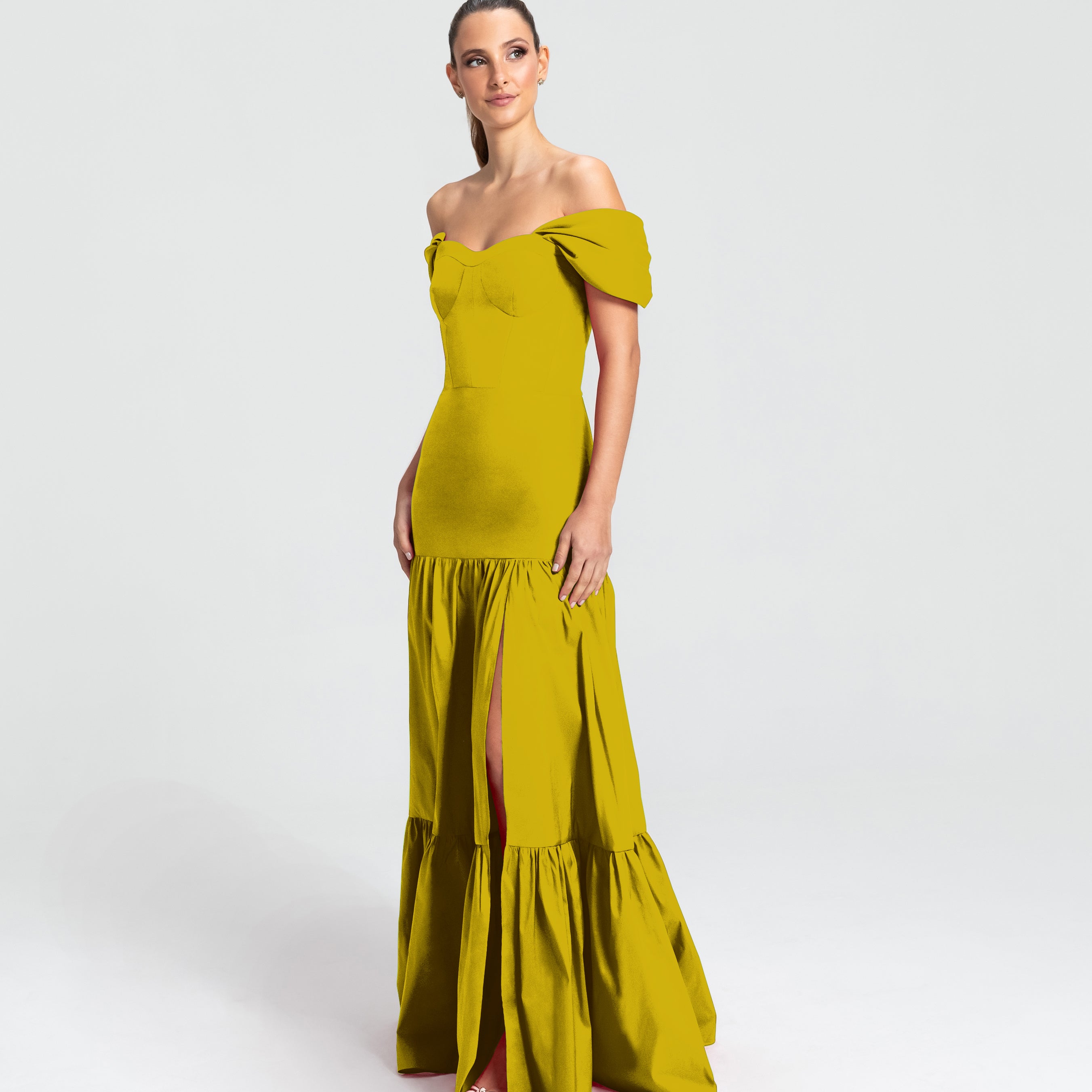 Vestido Longo em Tafetá Ombro a Ombro Cadeirão e Saia Franzida – REF: EG25