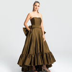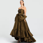 Um verdadeiro statement de elegância e ousadia. Este vestido em tafetá apresenta uma silhueta A impecável, com corpo ajustado e saia ampla em godê, finalizada com babados volumosos na barra. O cinto com um laço enorme, que pode ser usado na frente ou atrás, adiciona um toque de sofisticação dramática. Perfeito para eventos formais que pedem um visual marcante e inesquecível.