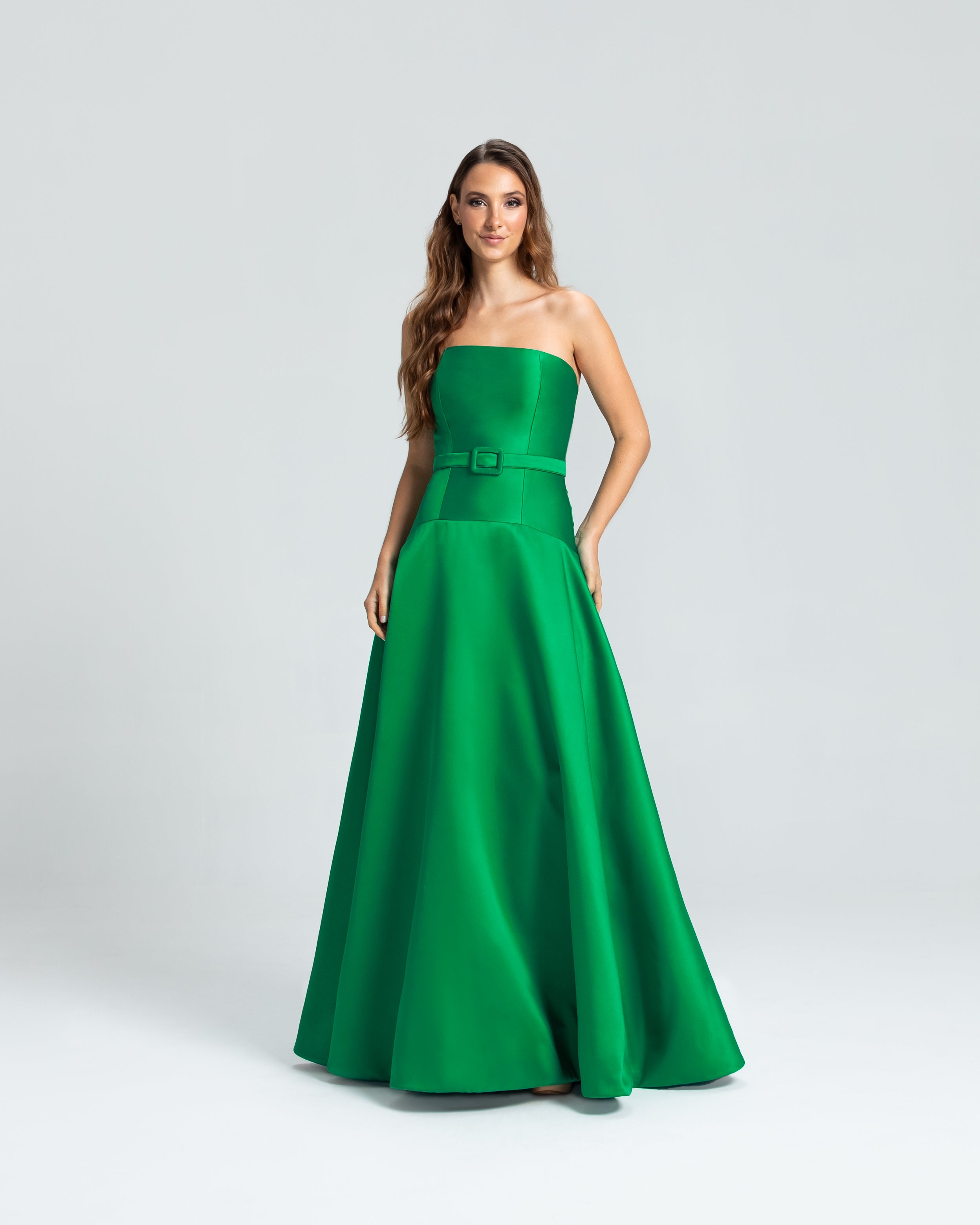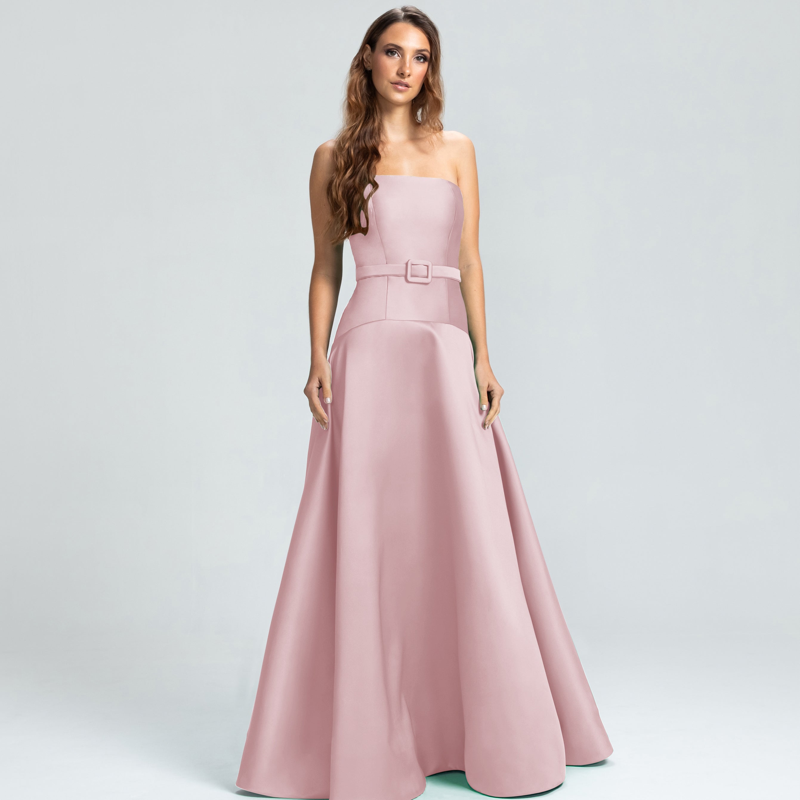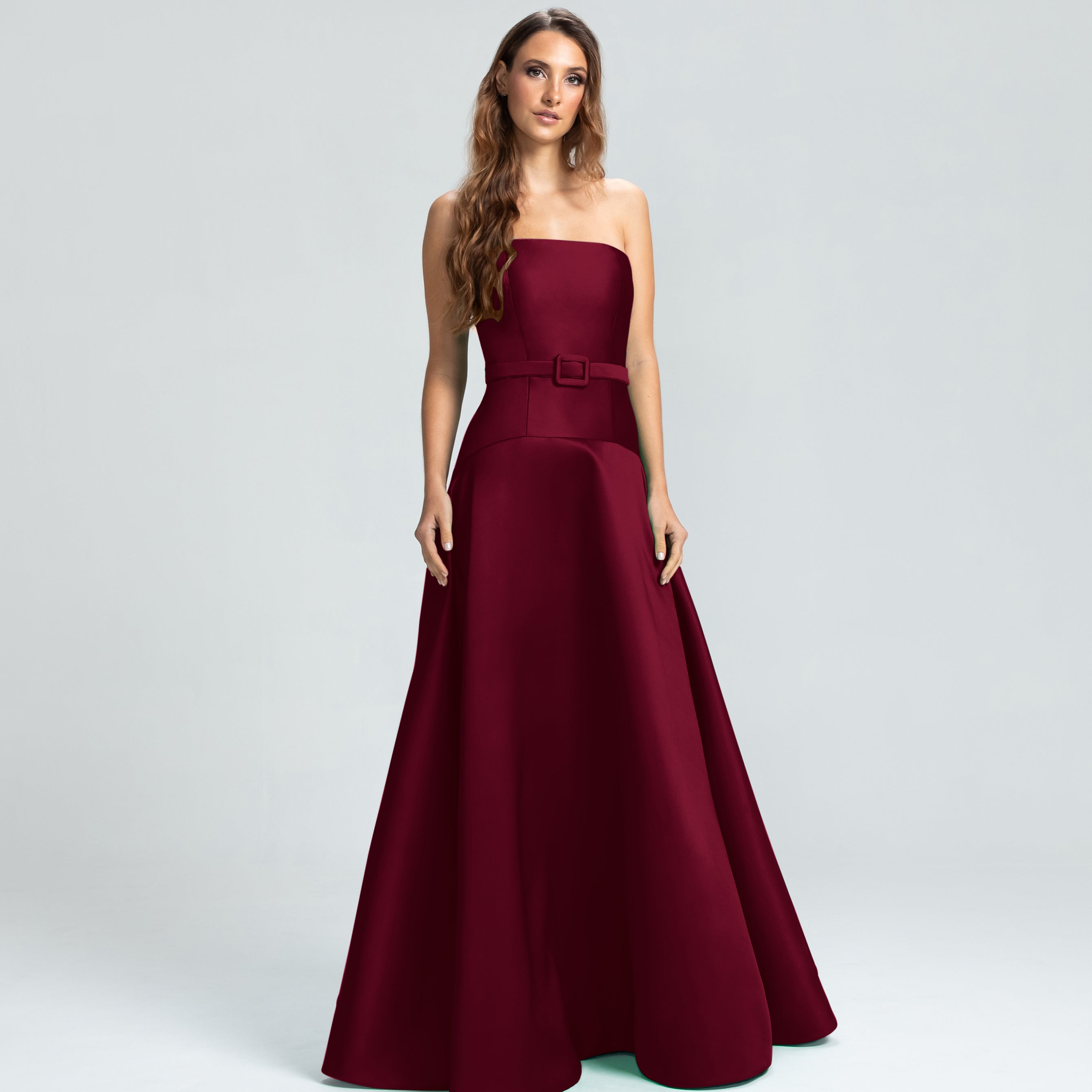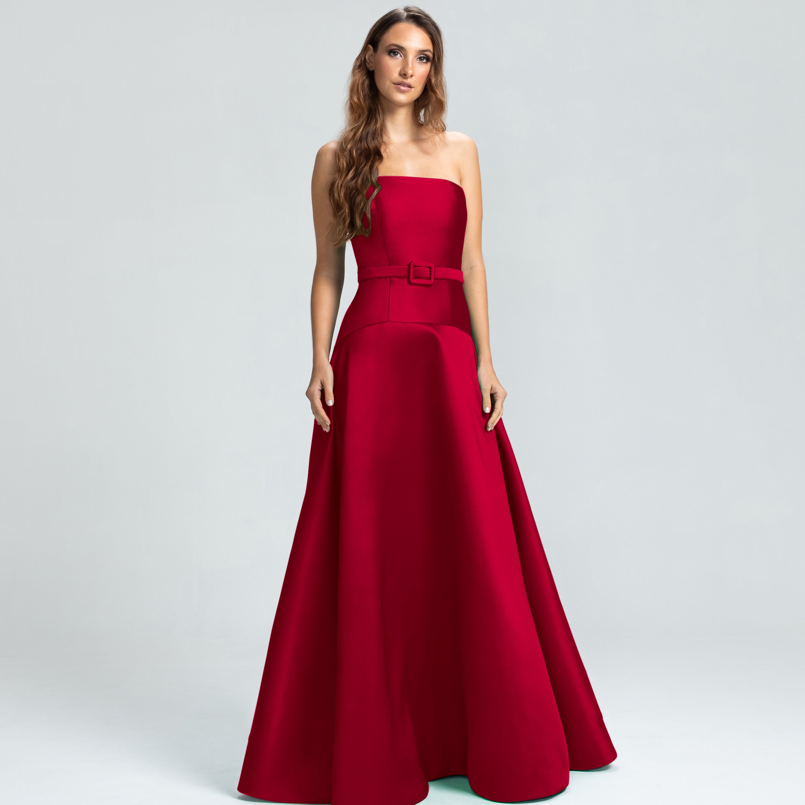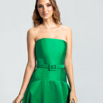 Este vestido apresenta um decote tomara que caia e um corpo ajustado, com a cintura levemente baixa e acentuada por um cinto forrado que define as curvas com delicadeza. A saia godê se abre de forma ampla, proporcionando um visual elegante e cheio de movimento. Uma peça sofisticada, ideal para mulheres que valorizam elegância e estilo sem excessos.