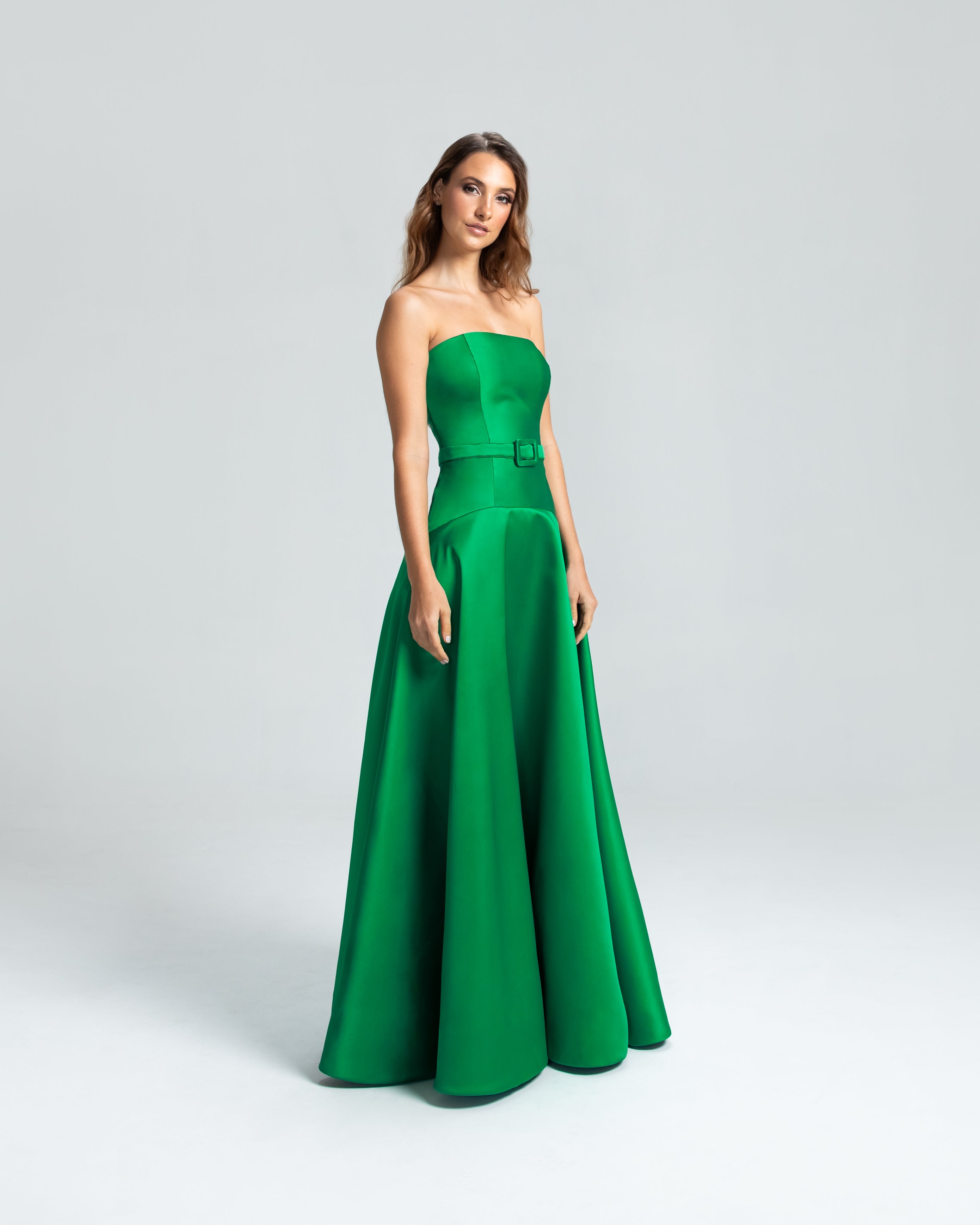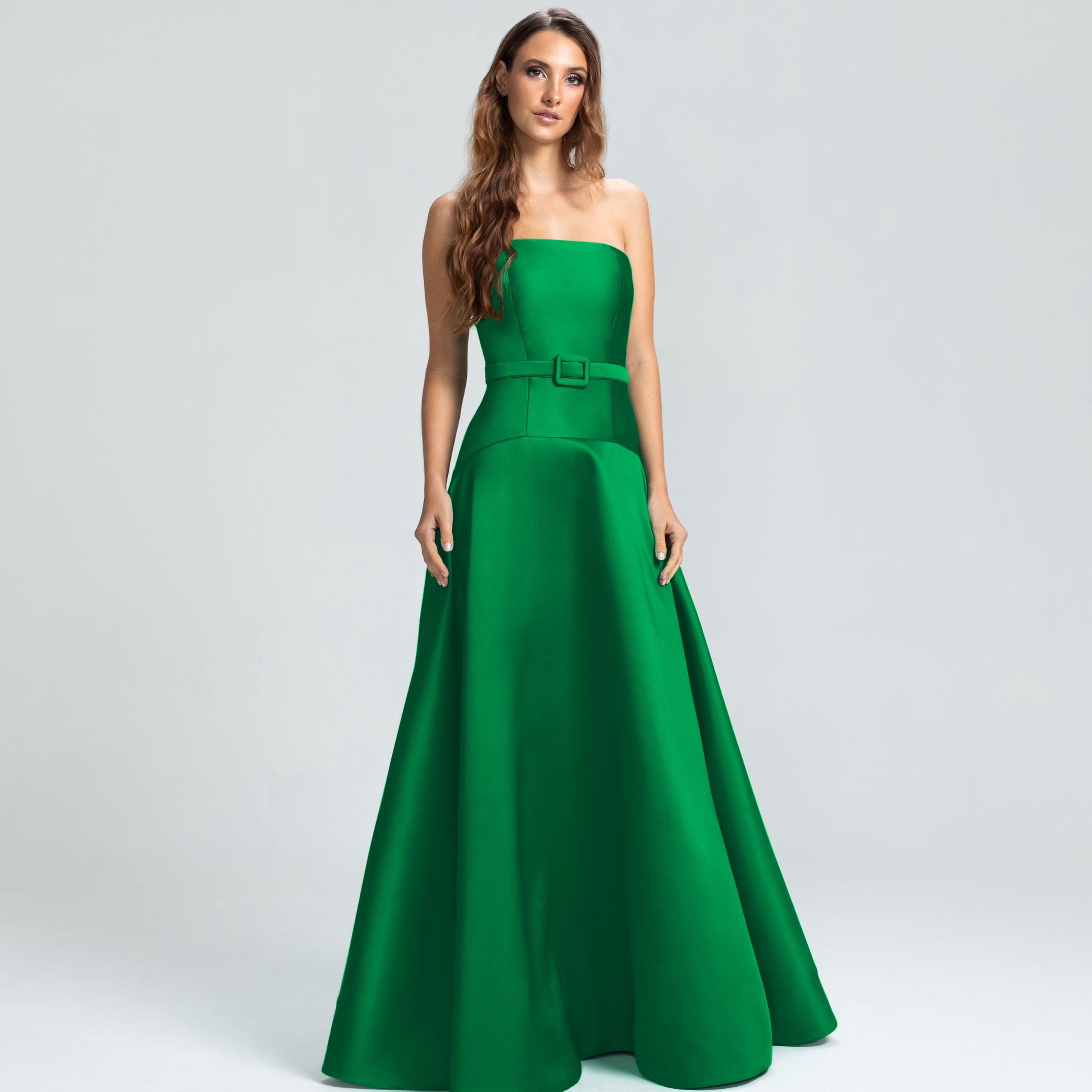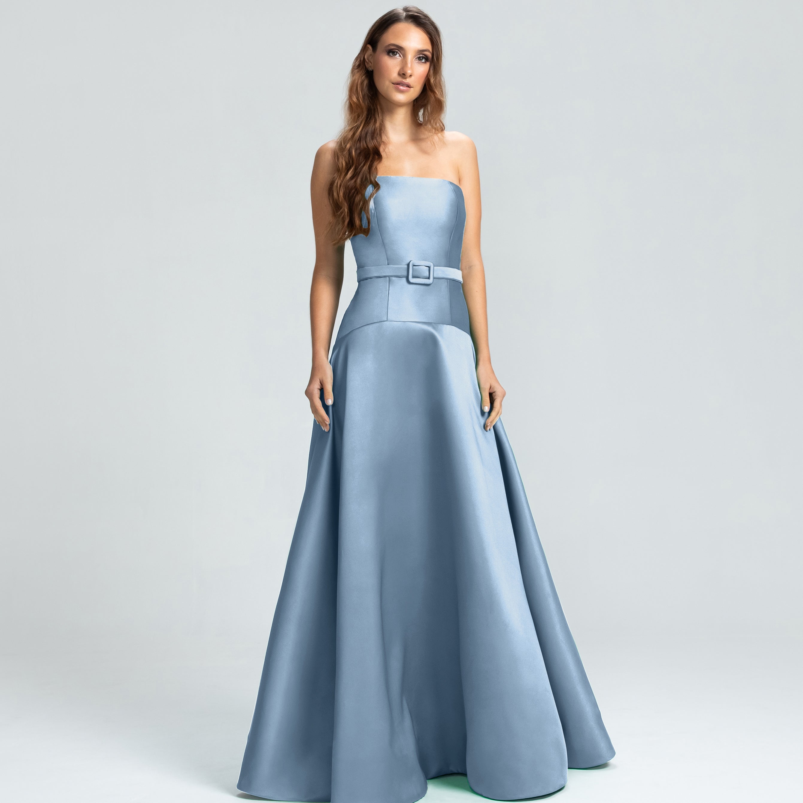 Este vestido apresenta um decote tomara que caia e um corpo ajustado, com a cintura levemente baixa e acentuada por um cinto forrado que define as curvas com delicadeza. A saia godê se abre de forma ampla, proporcionando um visual elegante e cheio de movimento. Uma peça sofisticada, ideal para mulheres que valorizam elegância e estilo sem excessos.