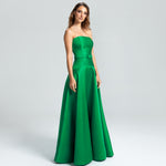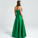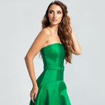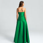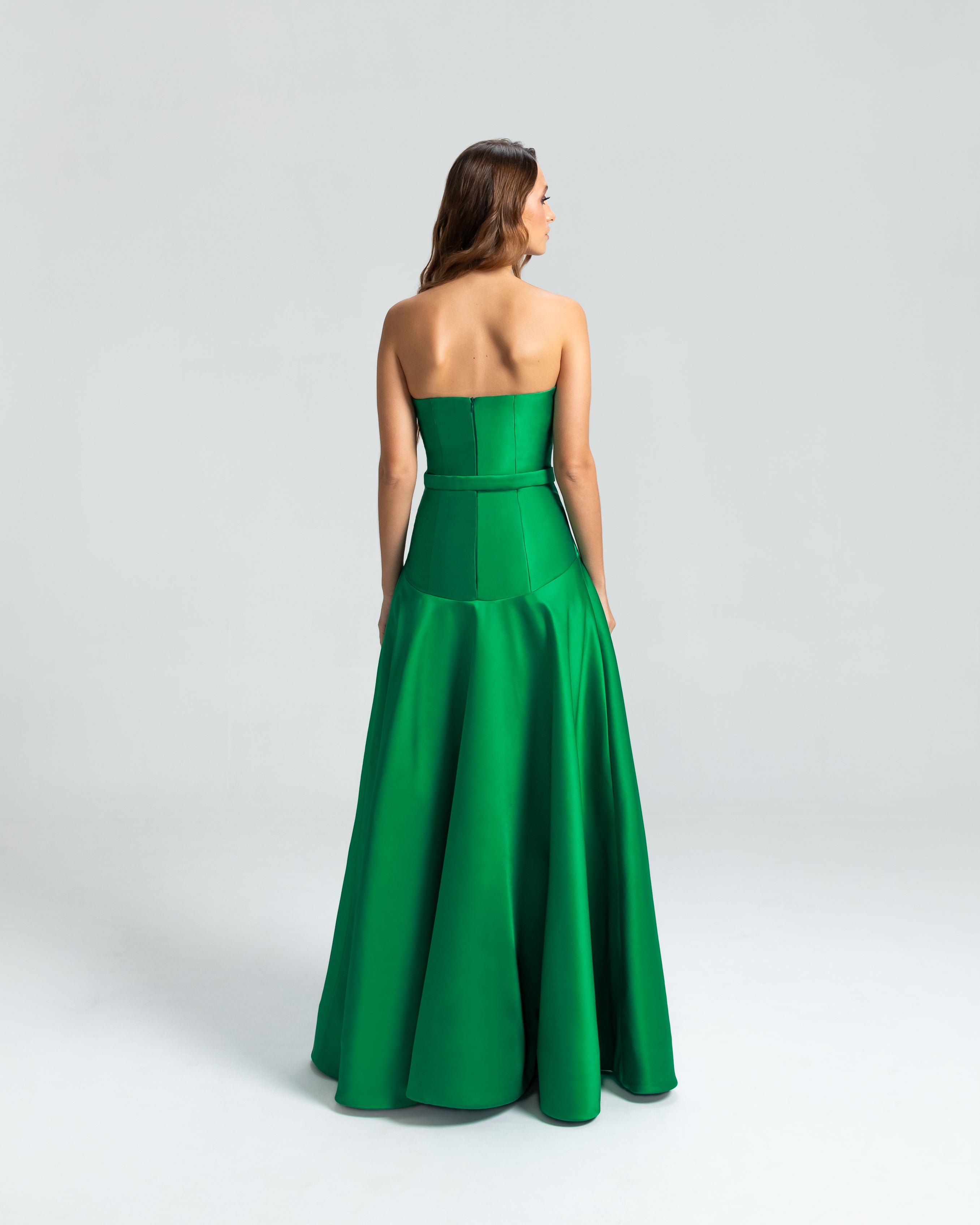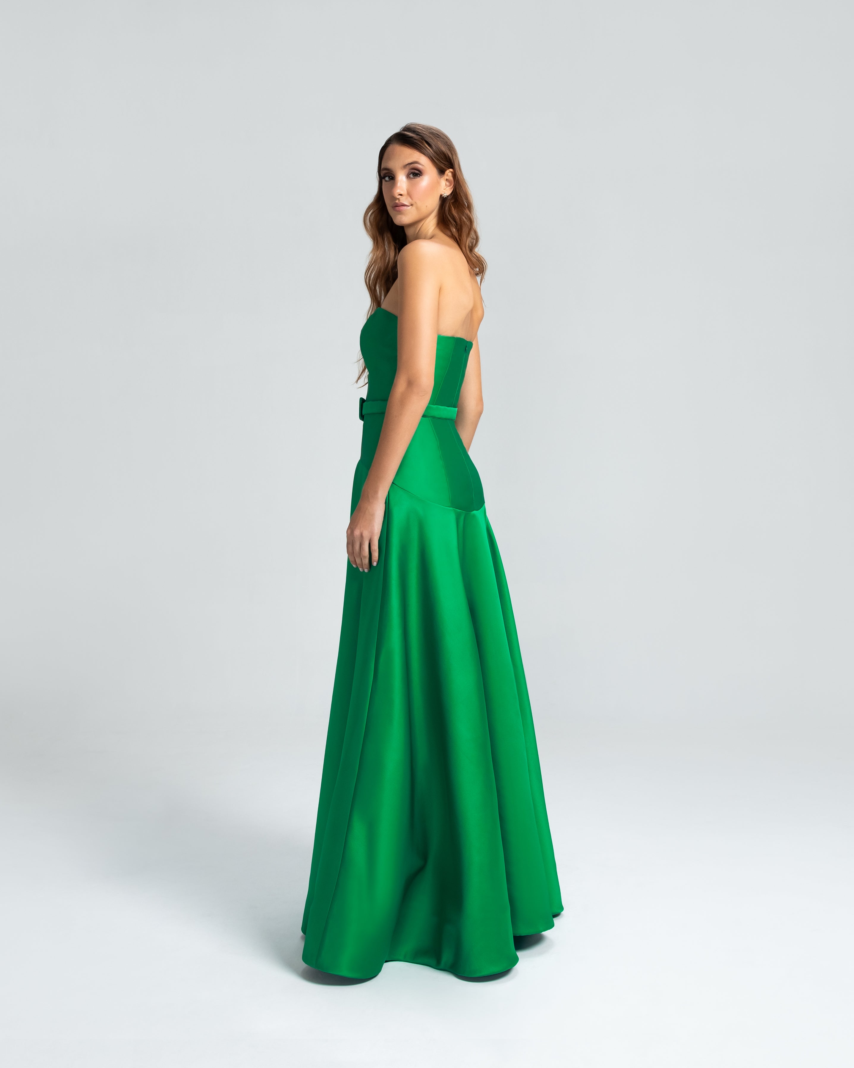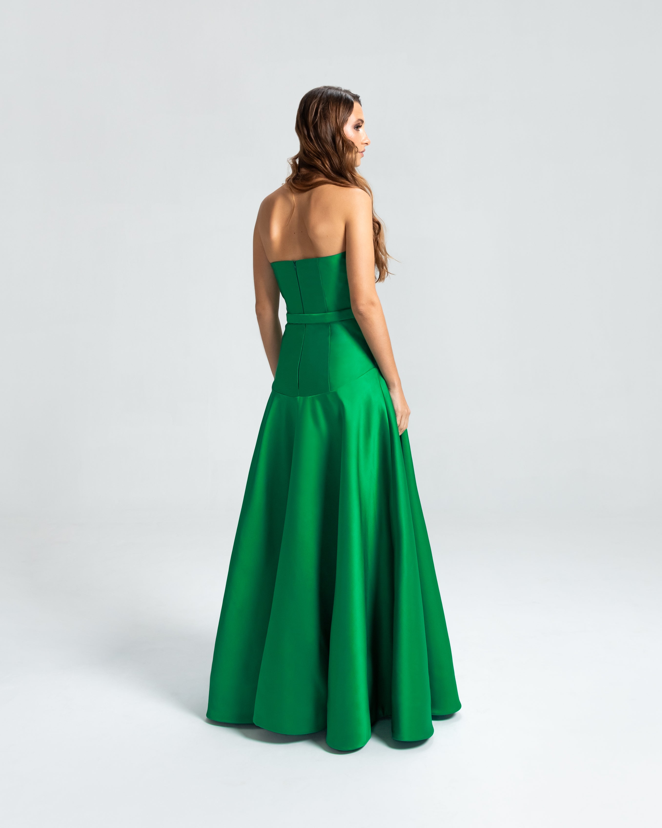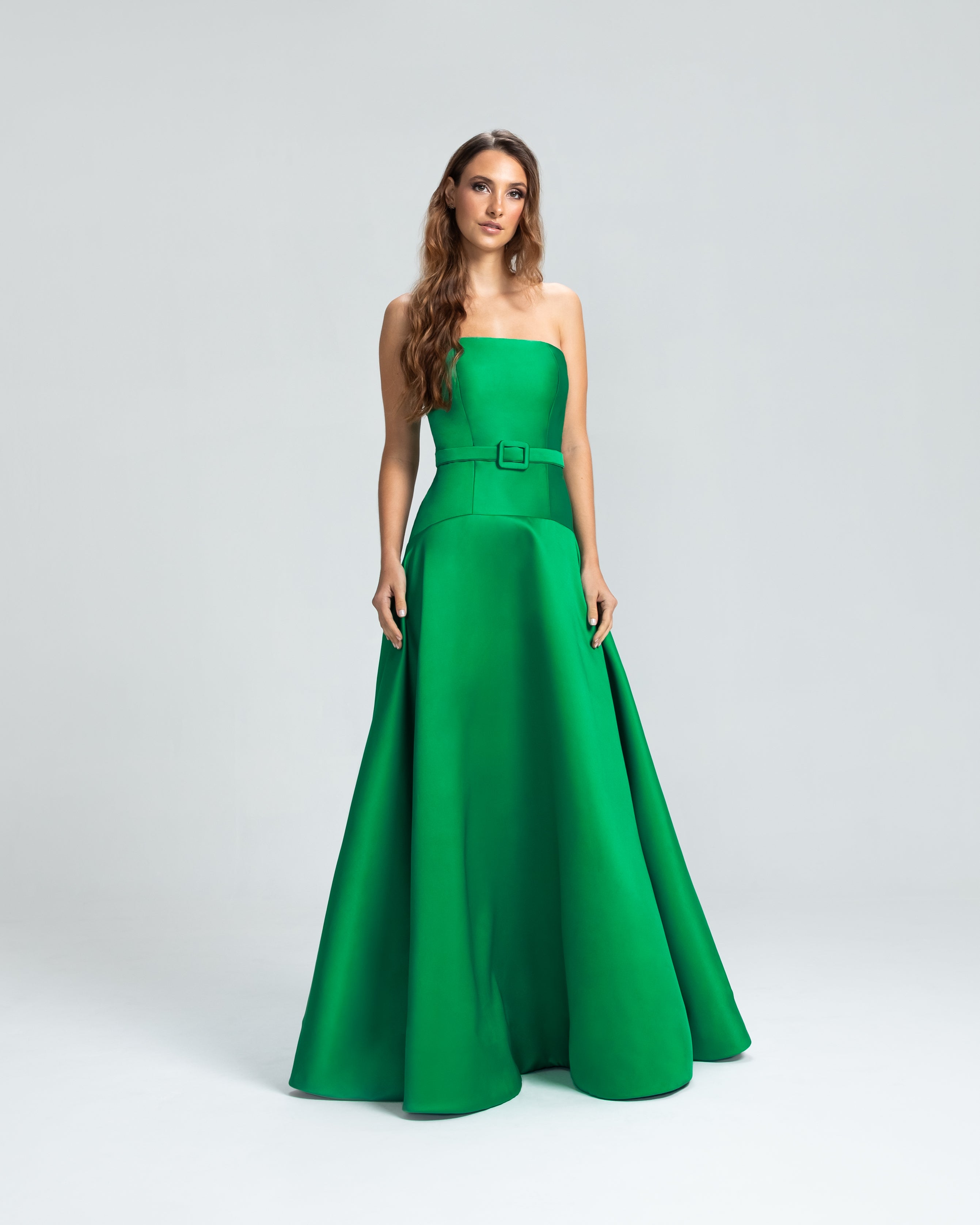 Este vestido apresenta um decote tomara que caia e um corpo ajustado, com a cintura levemente baixa e acentuada por um cinto forrado que define as curvas com delicadeza. A saia godê se abre de forma ampla, proporcionando um visual elegante e cheio de movimento. Uma peça sofisticada, ideal para mulheres que valorizam elegância e estilo sem excessos.