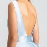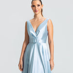 Confeccionado em zibeline de alta qualidade, este vestido exibe um decote em V tanto na frente quanto nas costas, com um design transpassado e leves pregas que realçam o corpo. A cintura é elegantemente marcada por um cinto forrado do mesmo tecido, enquanto a saia ampla com fenda compõem um visual ousado e sofisticado. Ideal para quem aprecia decotes profundos sem abrir mão da elegância.