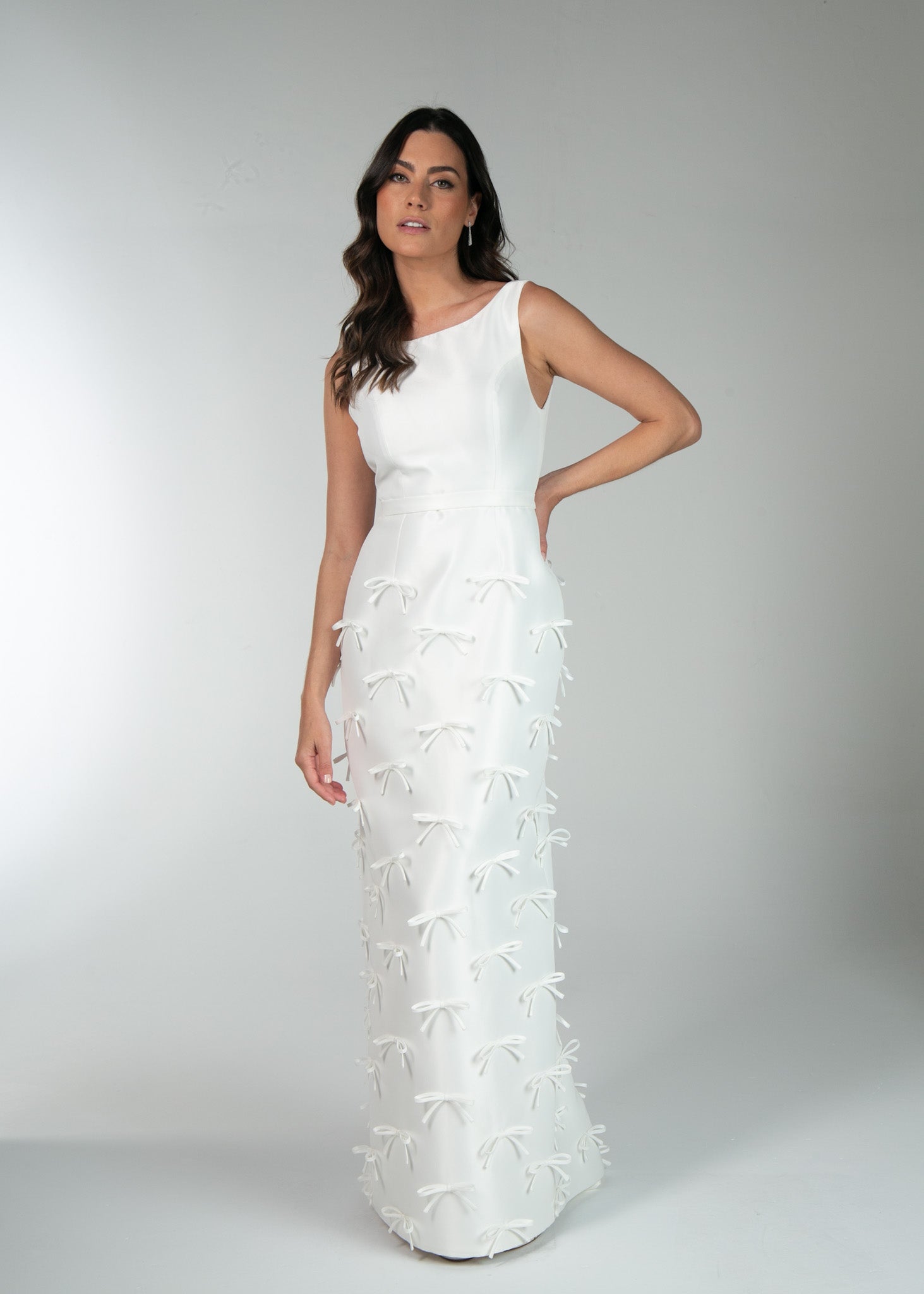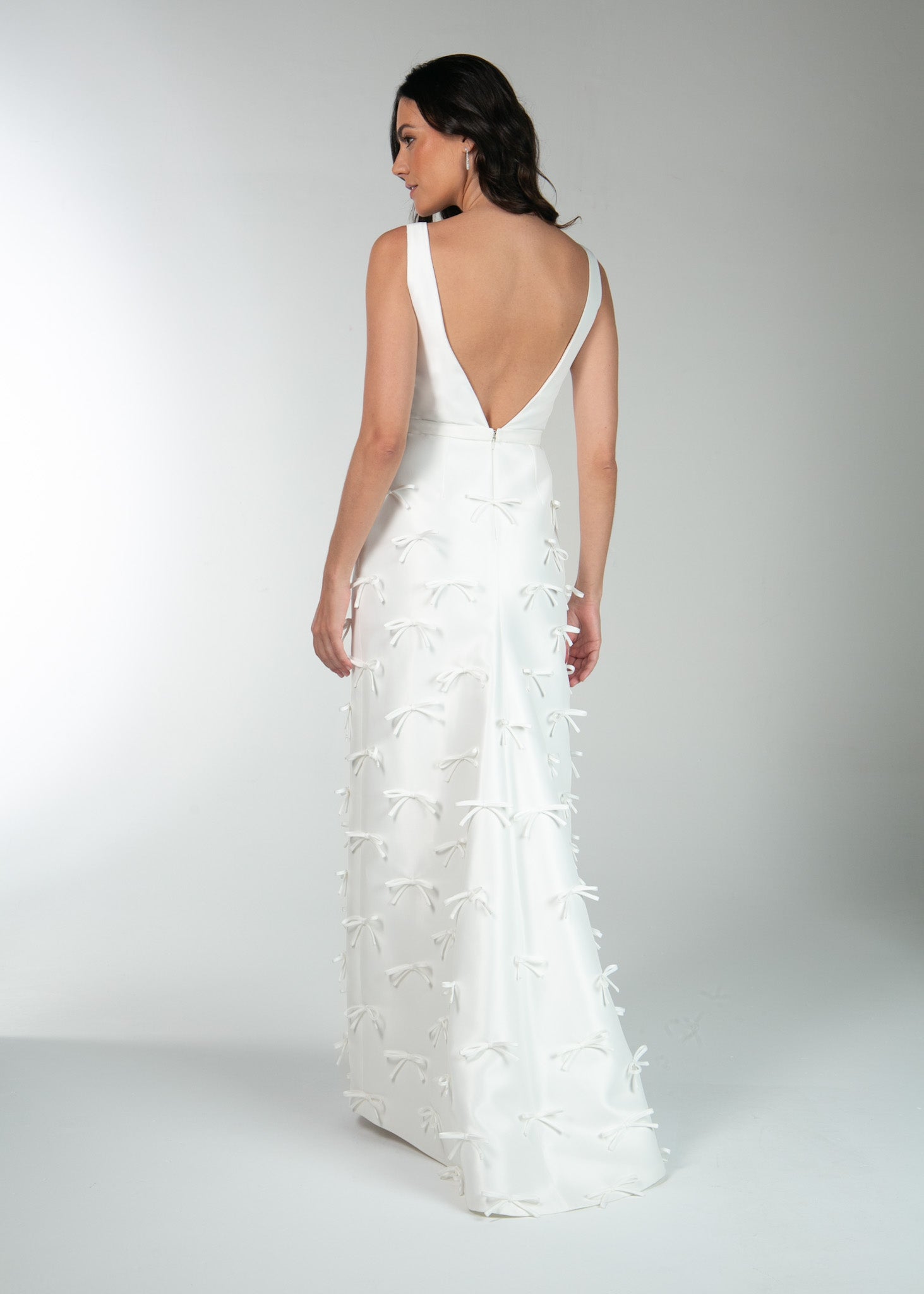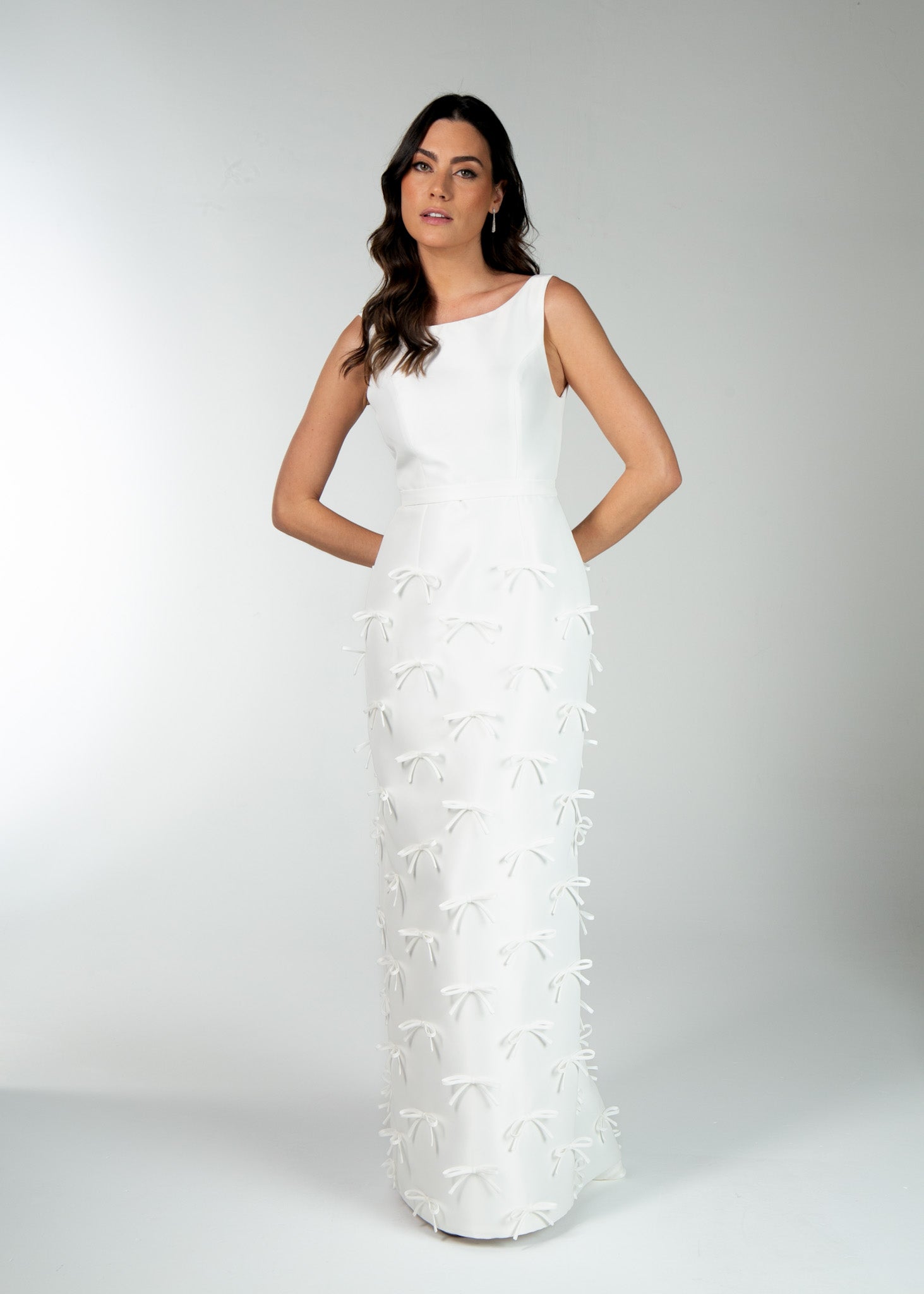 Um clássico reinventado com charme e feminilidade. Confeccionado em zibeline, este vestido apresenta um decote canoa elegante na frente e um decote em V profundo nas costas, revelando a pele com sutileza. A saia reta, levemente sereia, conta com uma abertura abaixo do joelho e uma leve cauda, proporcionando movimento e sofisticação. O grande destaque está nos quase 200 lacinhos aplicados manualmente, do mesmo tecido, que criam um efeito visual delicado e absolutamente único. Minimalista, luxuoso e inesquecível.
