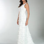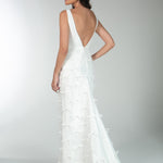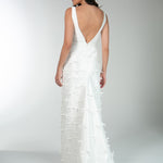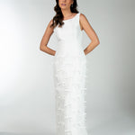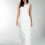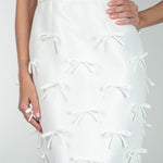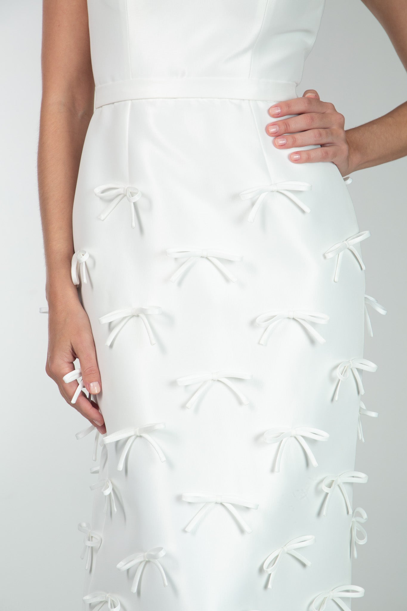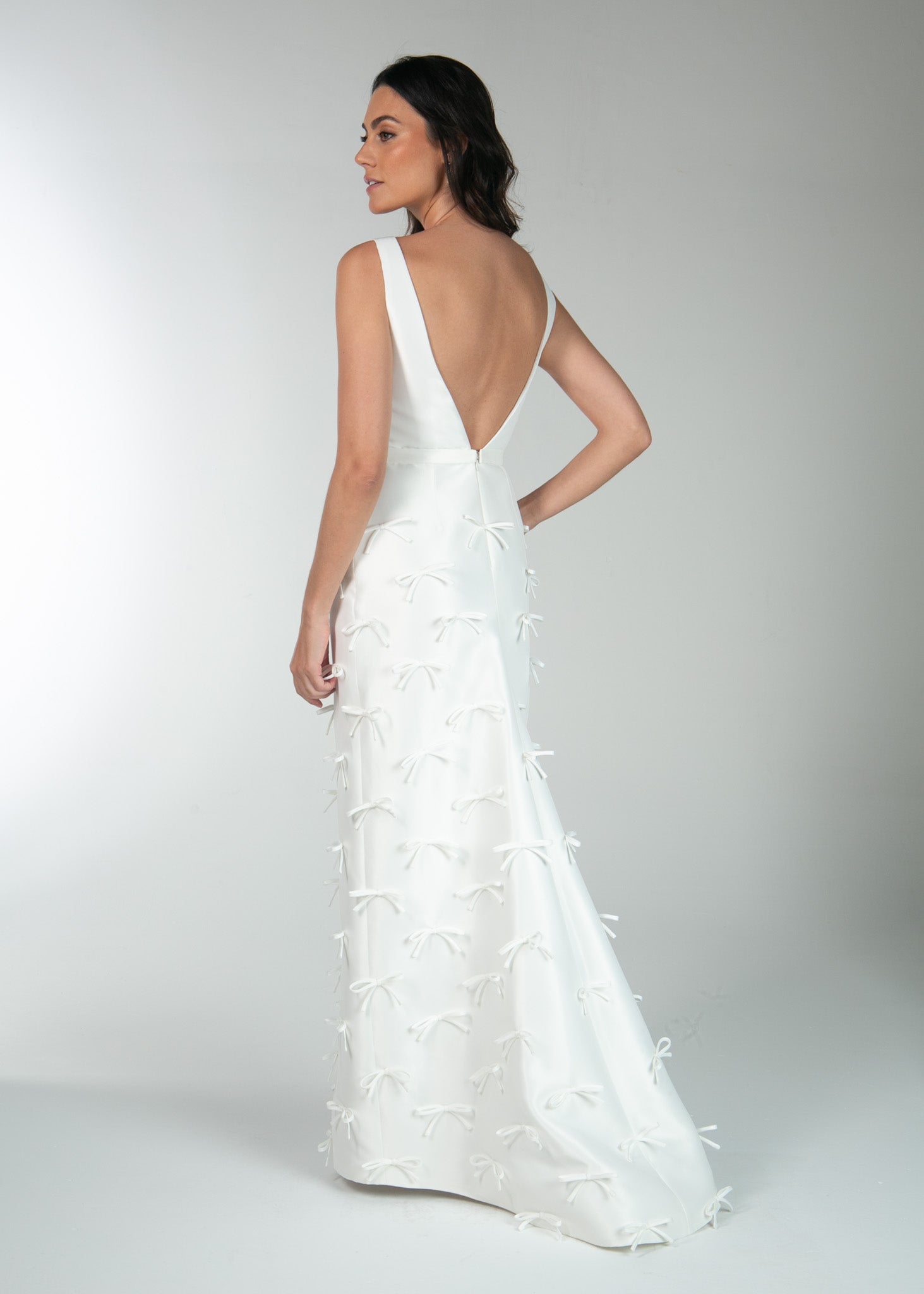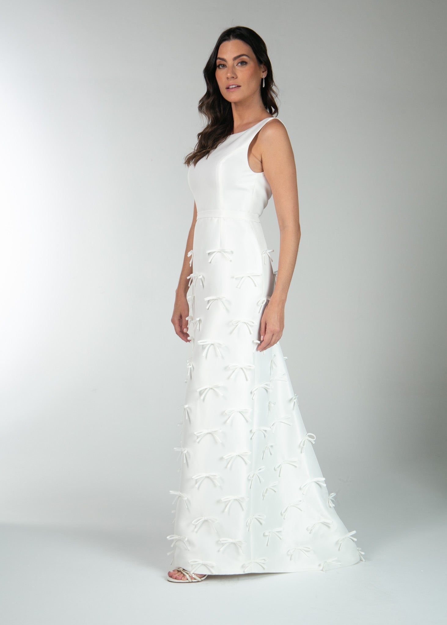 Um clássico reinventado com charme e feminilidade. Confeccionado em zibeline, este vestido apresenta um decote canoa elegante na frente e um decote em V profundo nas costas, revelando a pele com sutileza. A saia reta, levemente sereia, conta com uma abertura abaixo do joelho e uma leve cauda, proporcionando movimento e sofisticação. O grande destaque está nos quase 200 lacinhos aplicados manualmente, do mesmo tecido, que criam um efeito visual delicado e absolutamente único. Minimalista, luxuoso e inesquecível.