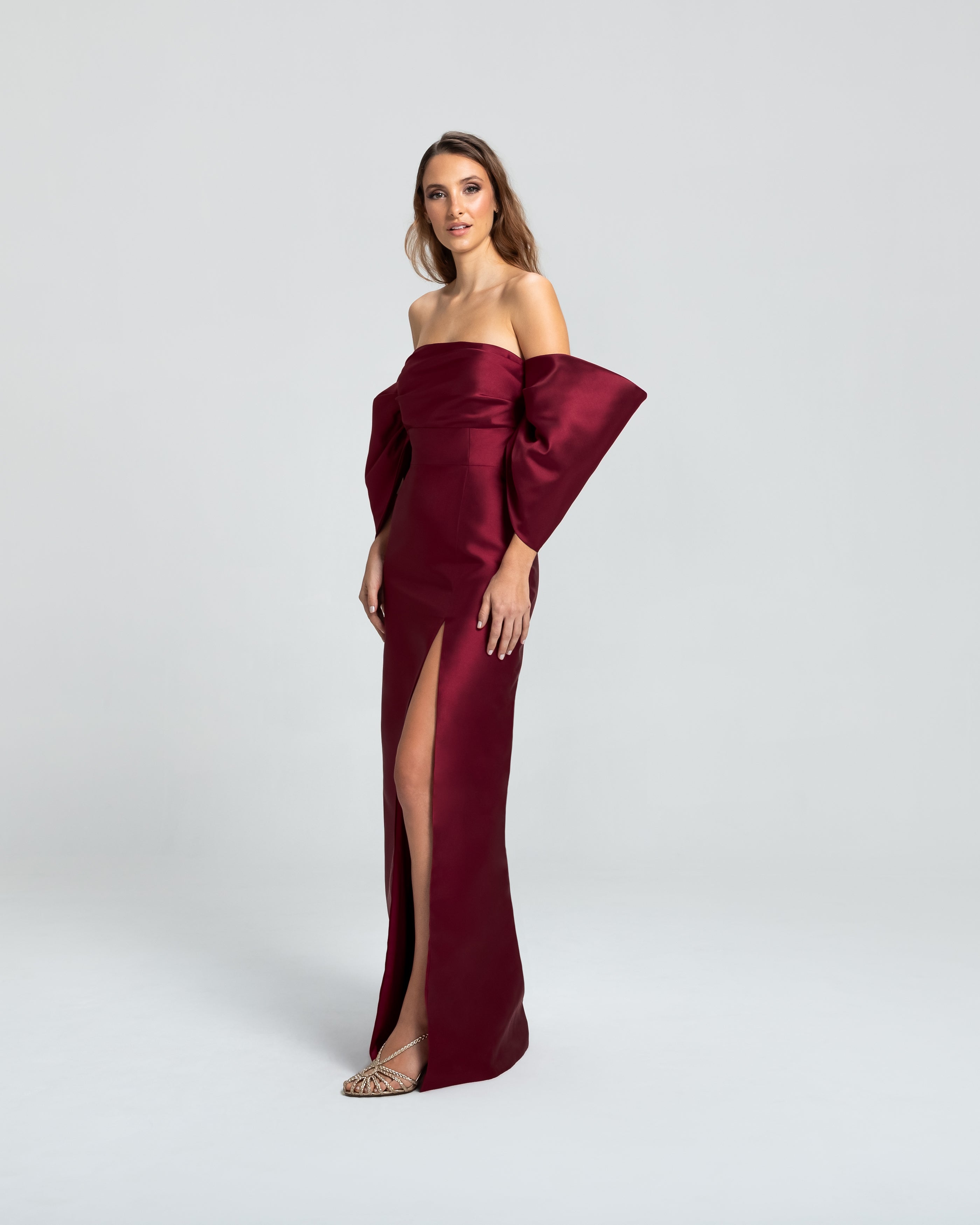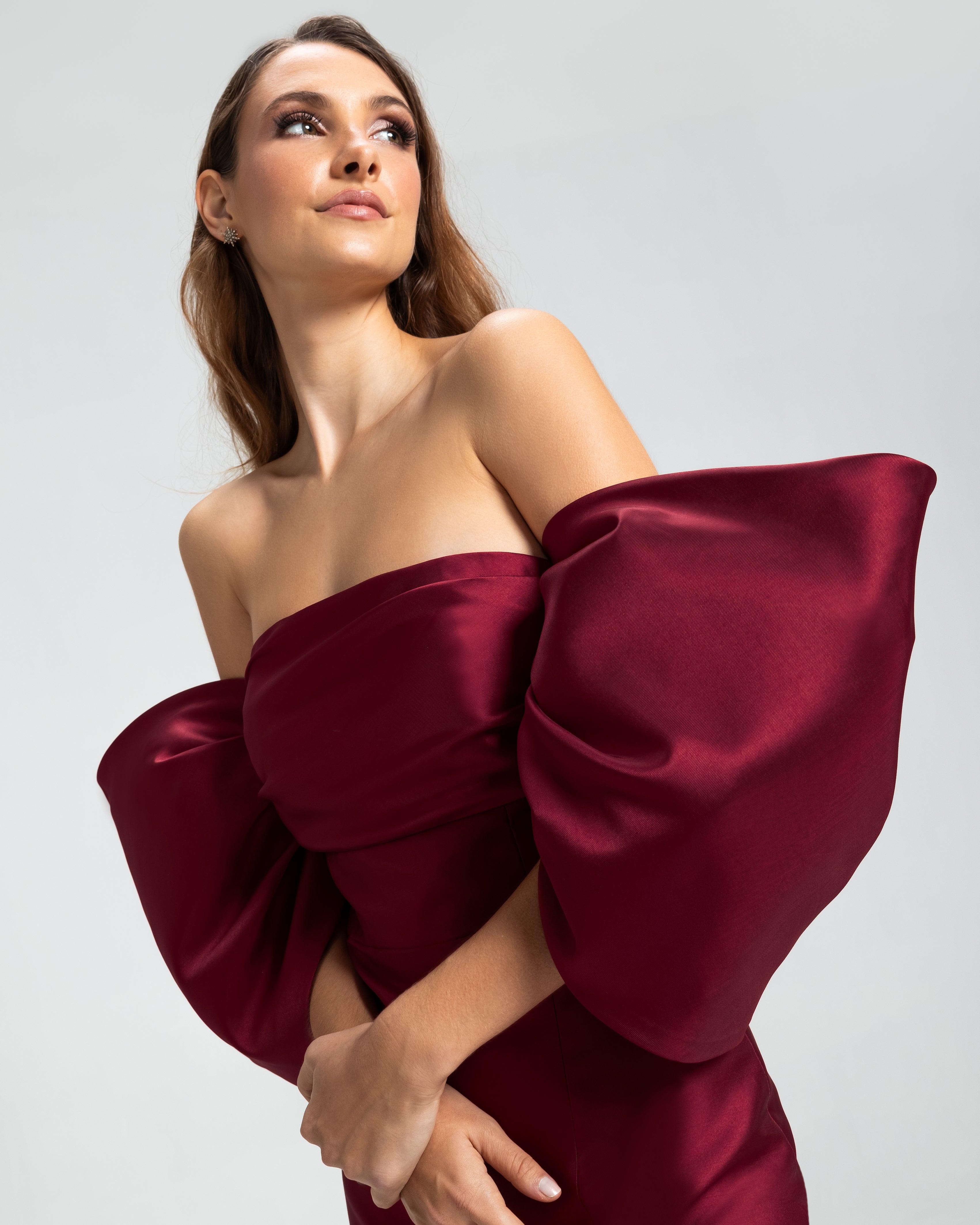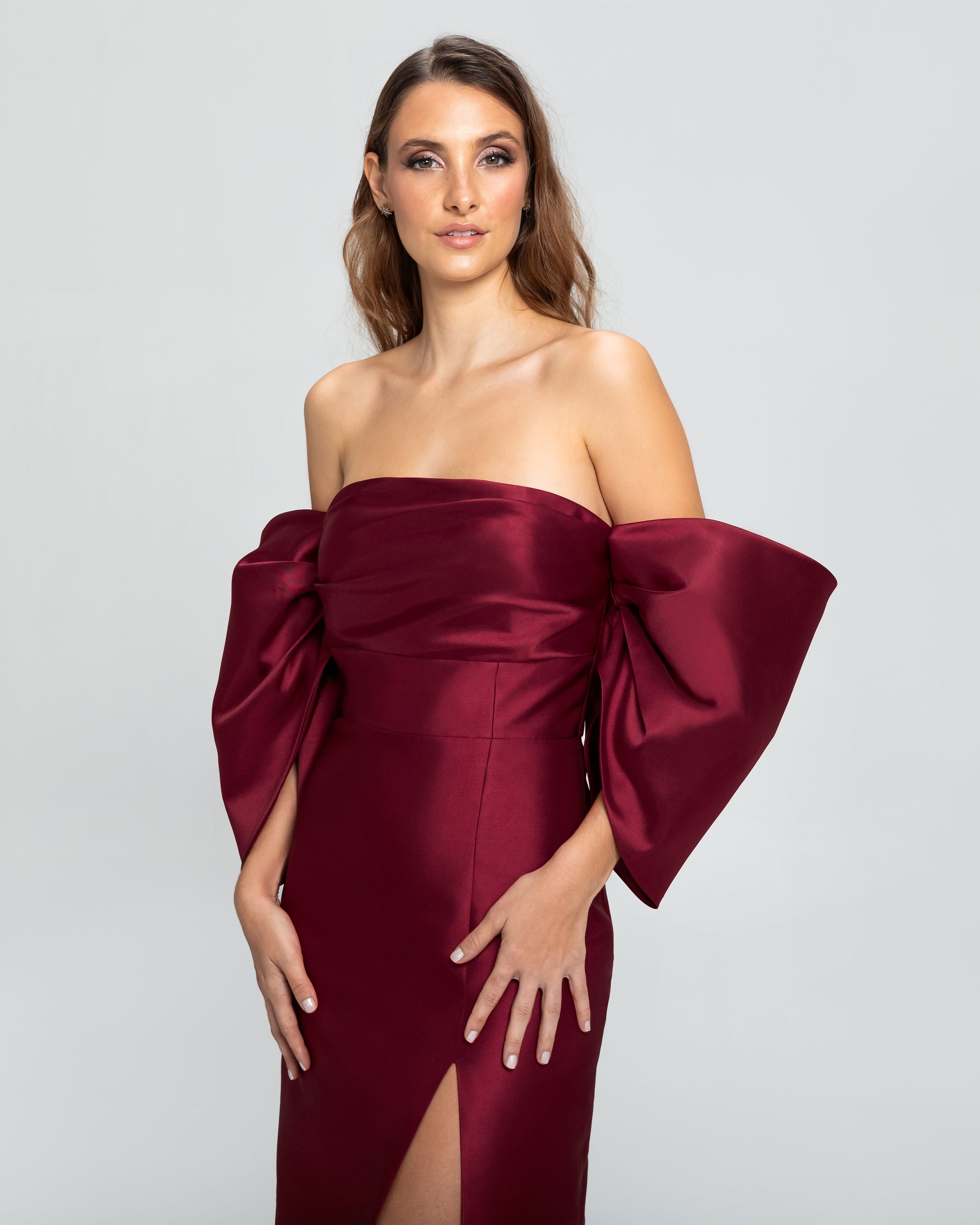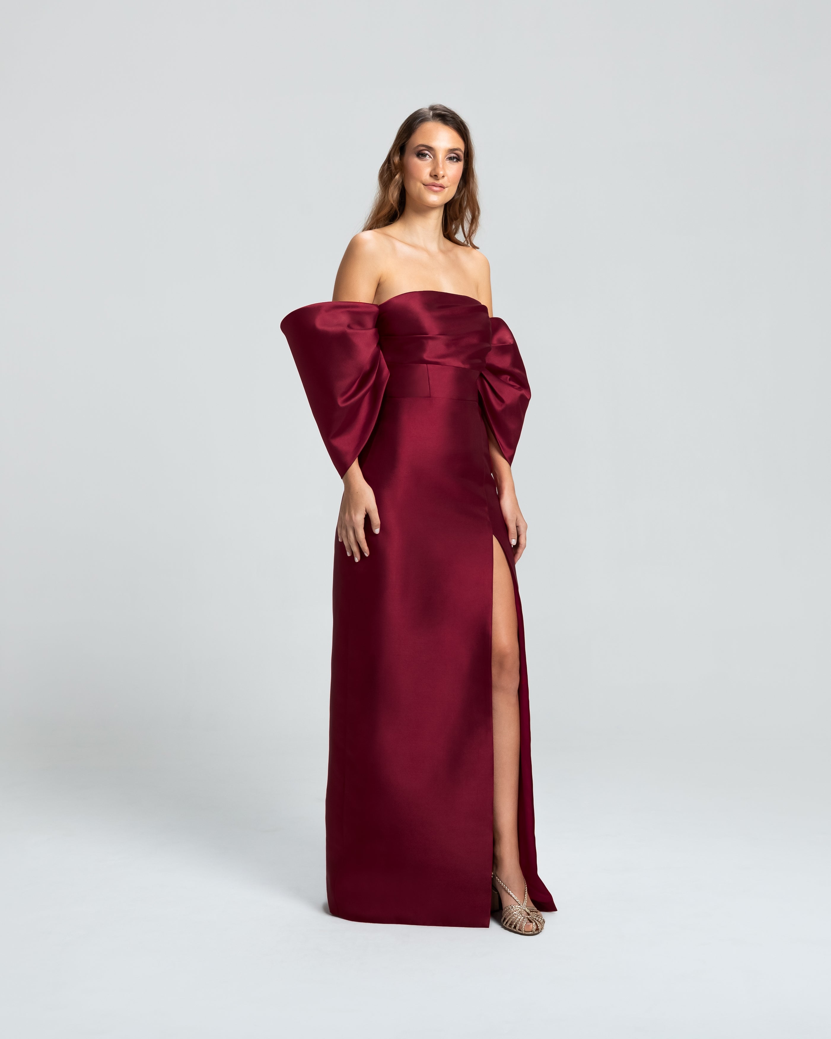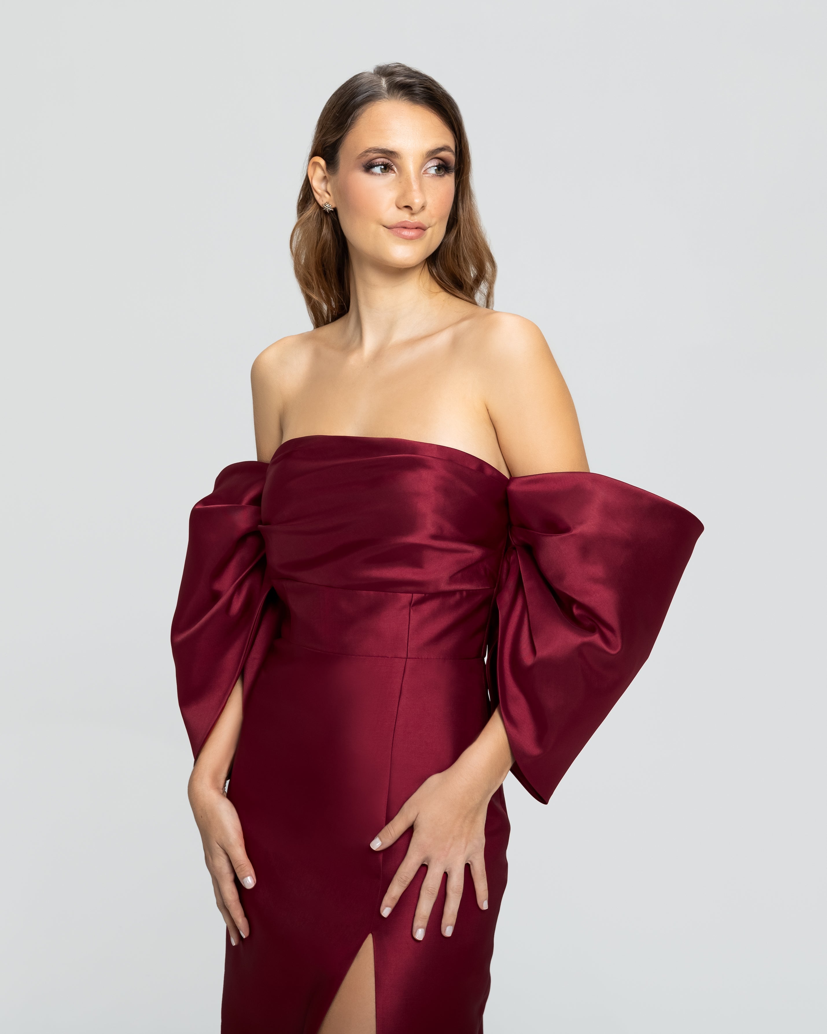 Este modelo combina um decote ombro a ombro e um corpo ajustado com uma cintura definida, acentuando a silhueta com sutileza. A saia reta, com uma super fenda frontal, contrasta com as mangas de grandes volumes, levemente drapeadas e estruturadas com barbatanas, que adicionam um toque fashionista e ousado. Perfeito para quem não abre mão de detalhes impactantes mesmo em um vestido mais tradicional.