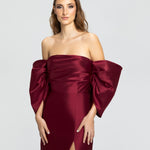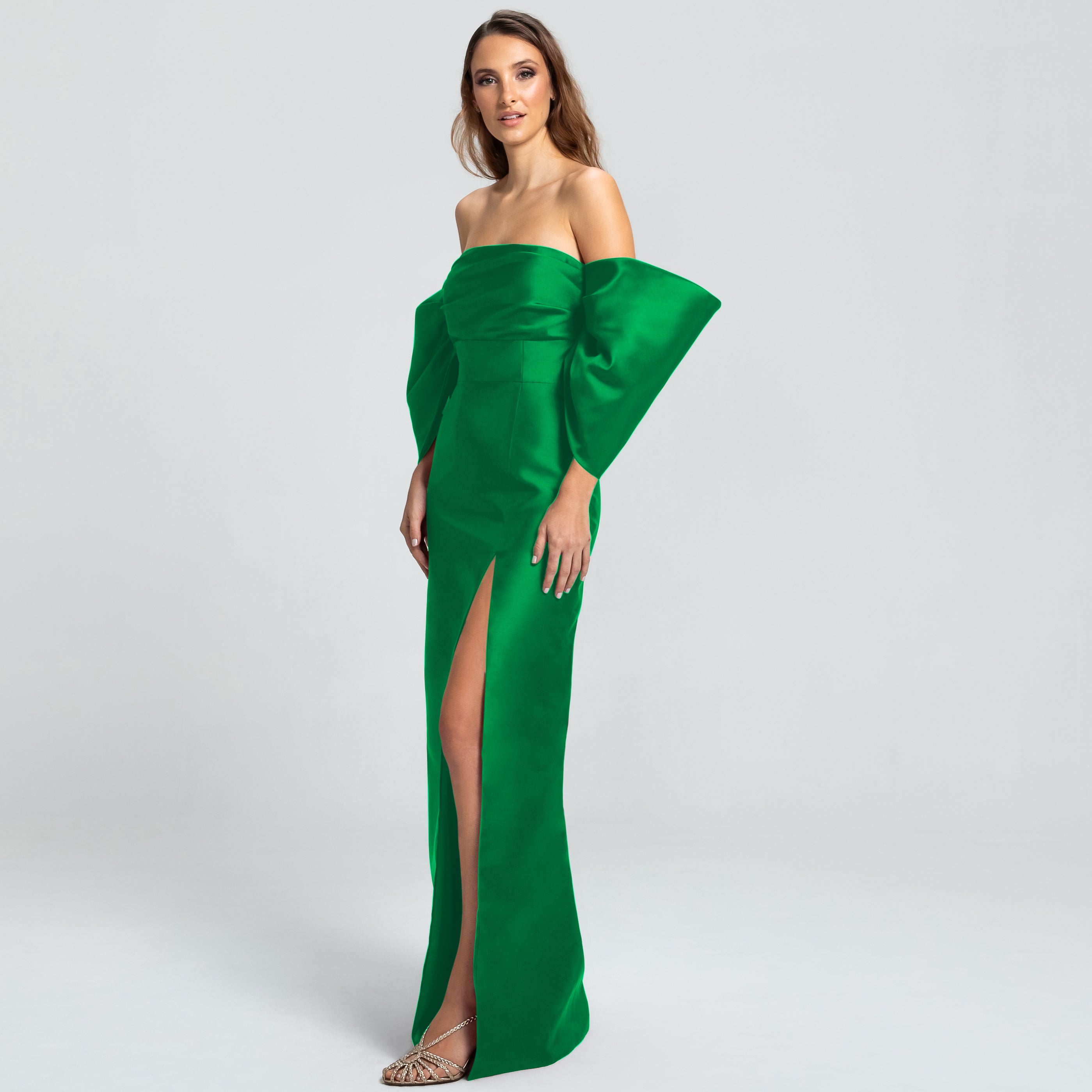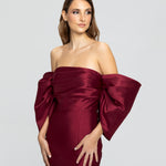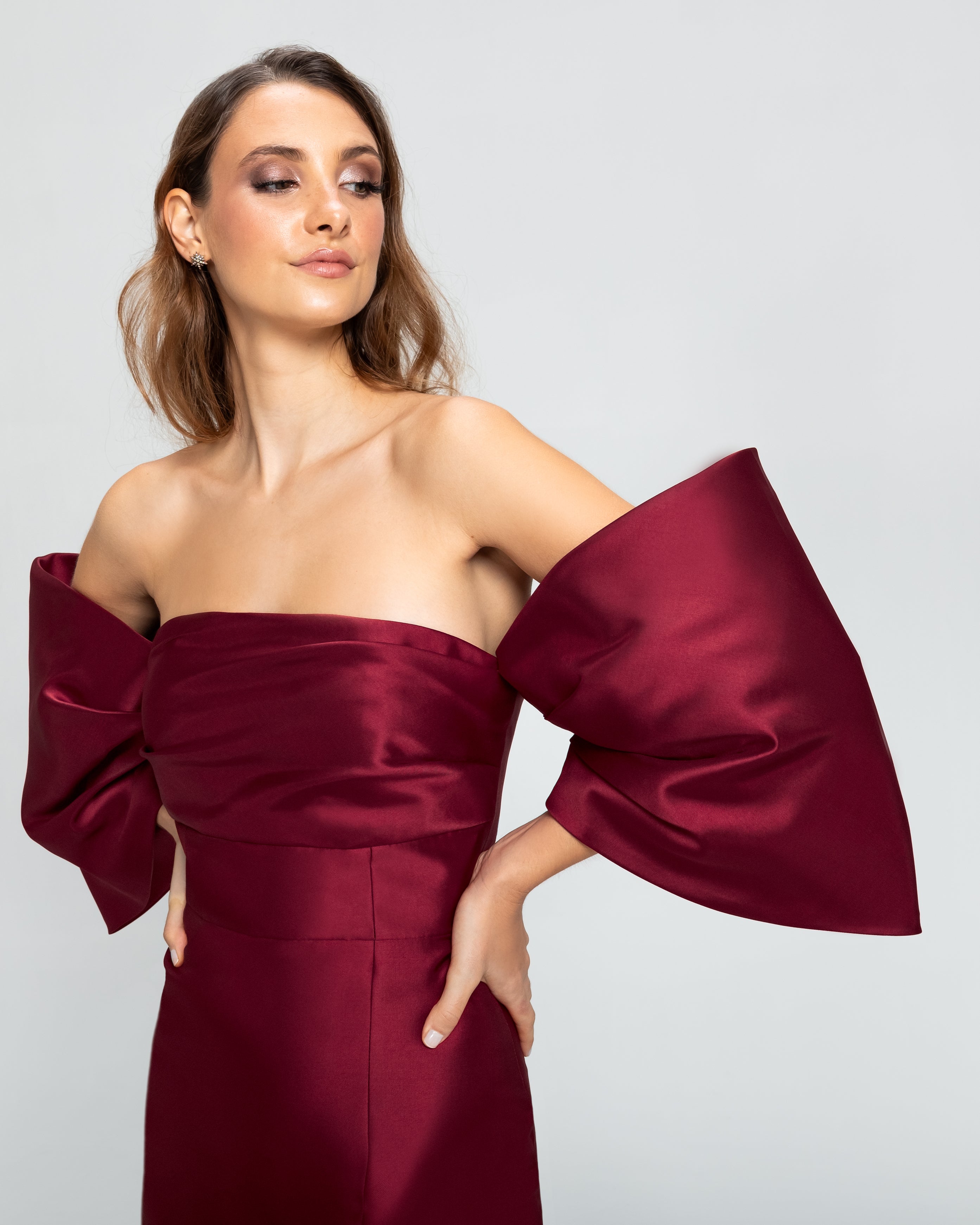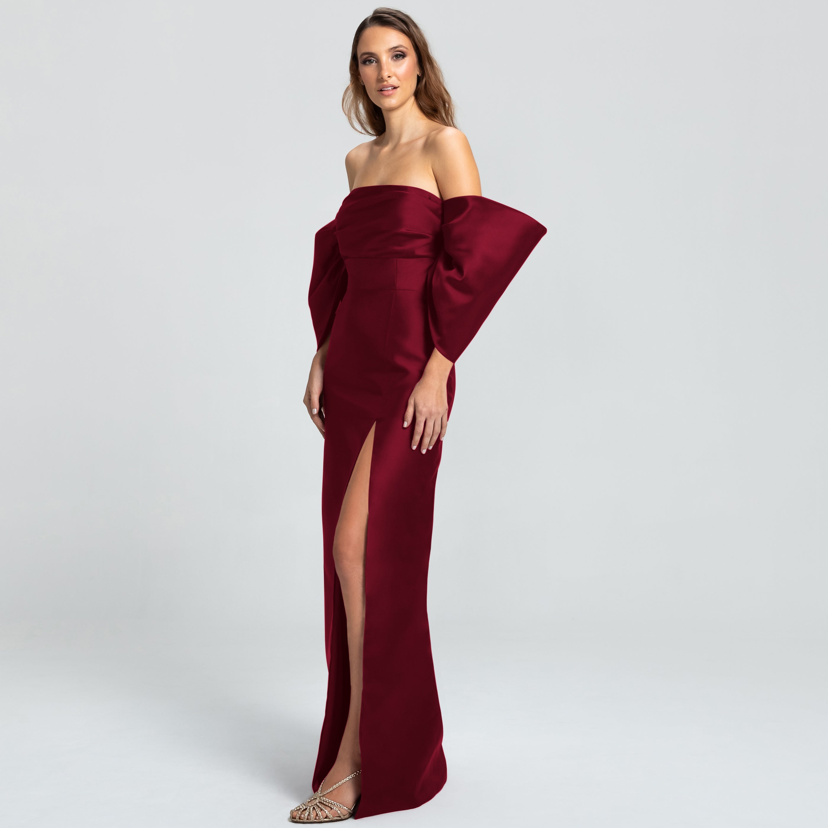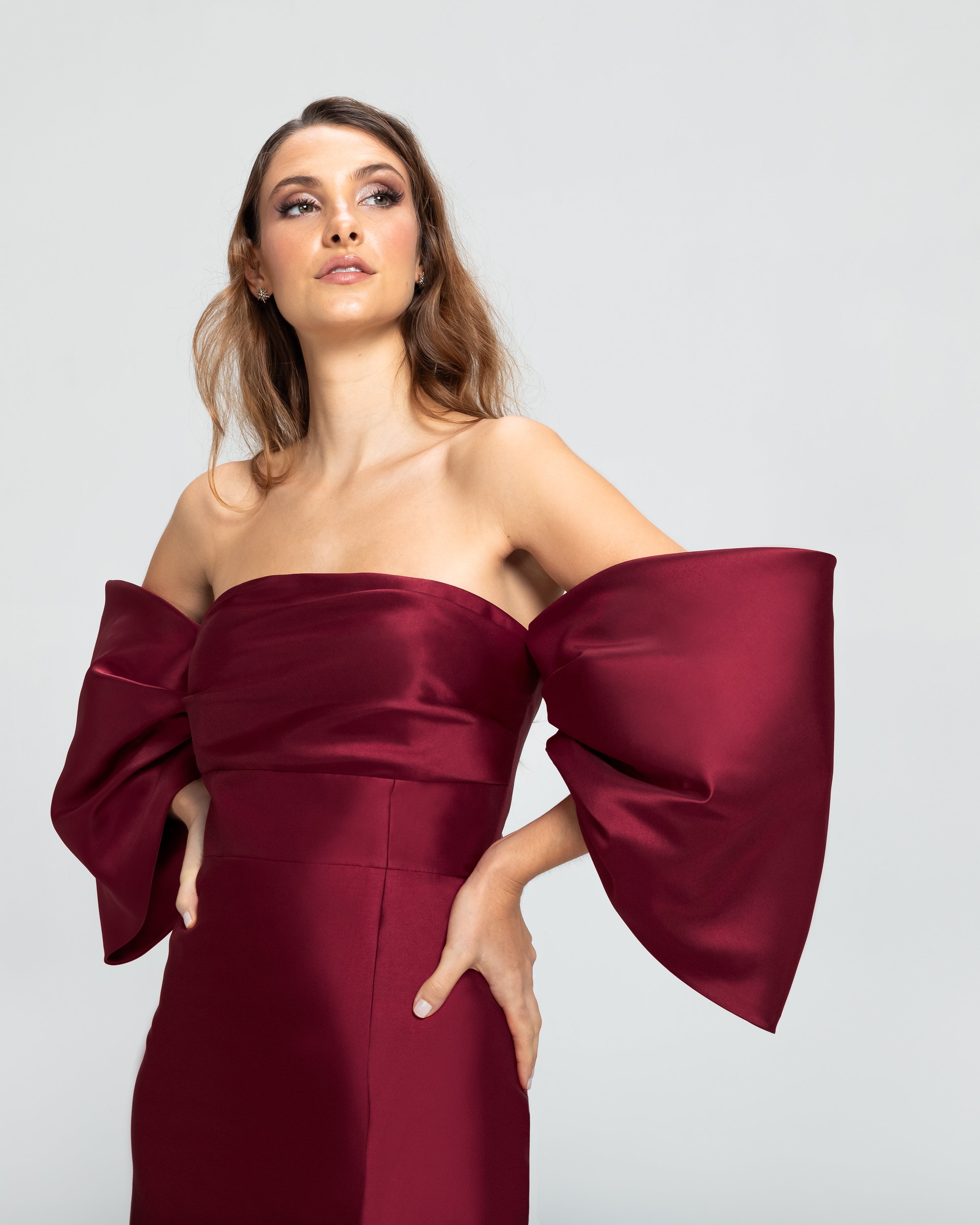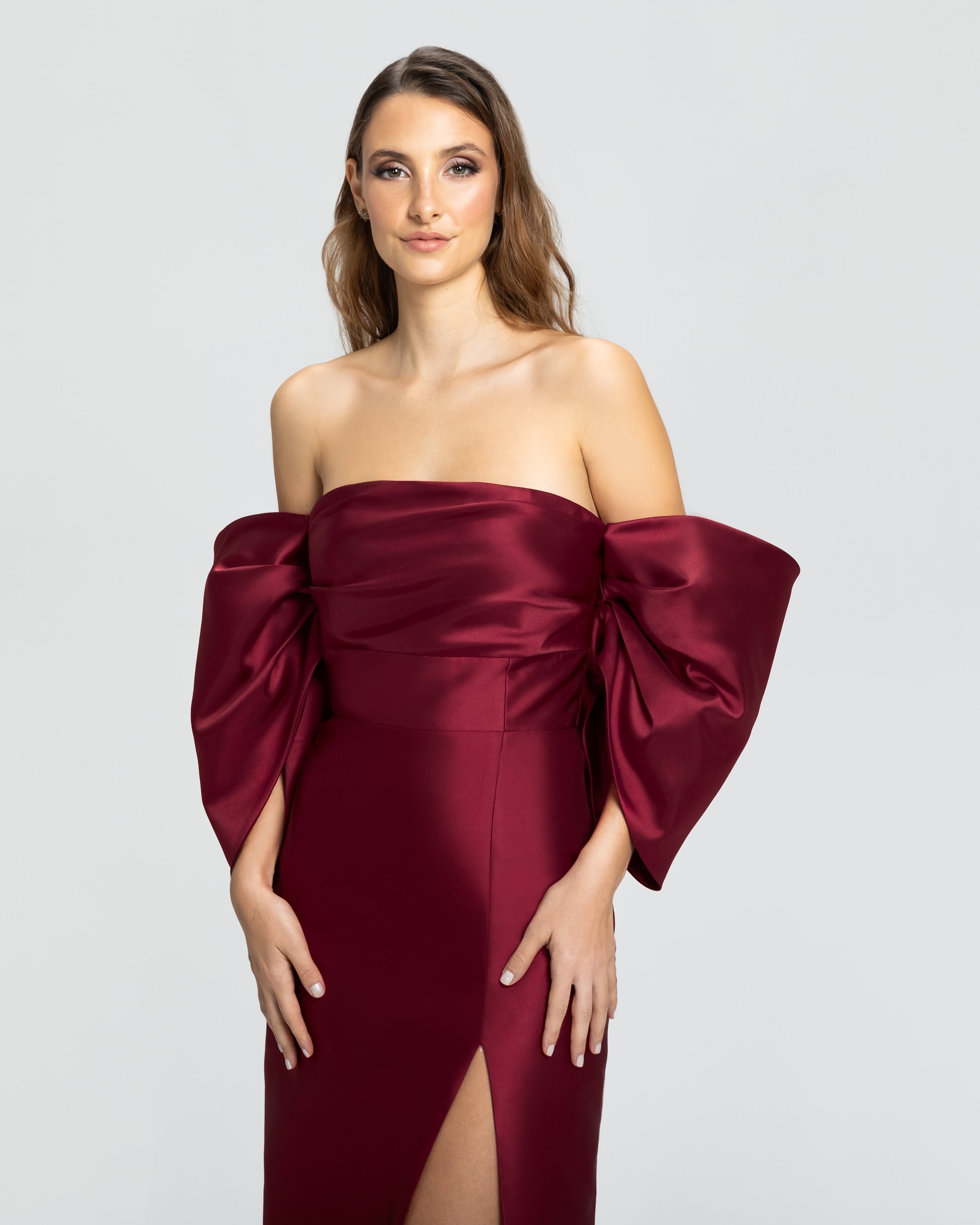 Este modelo combina um decote ombro a ombro e um corpo ajustado com uma cintura definida, acentuando a silhueta com sutileza. A saia reta, com uma super fenda frontal, contrasta com as mangas de grandes volumes, levemente drapeadas e estruturadas com barbatanas, que adicionam um toque fashionista e ousado. Perfeito para quem não abre mão de detalhes impactantes mesmo em um vestido mais tradicional.