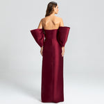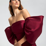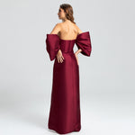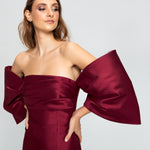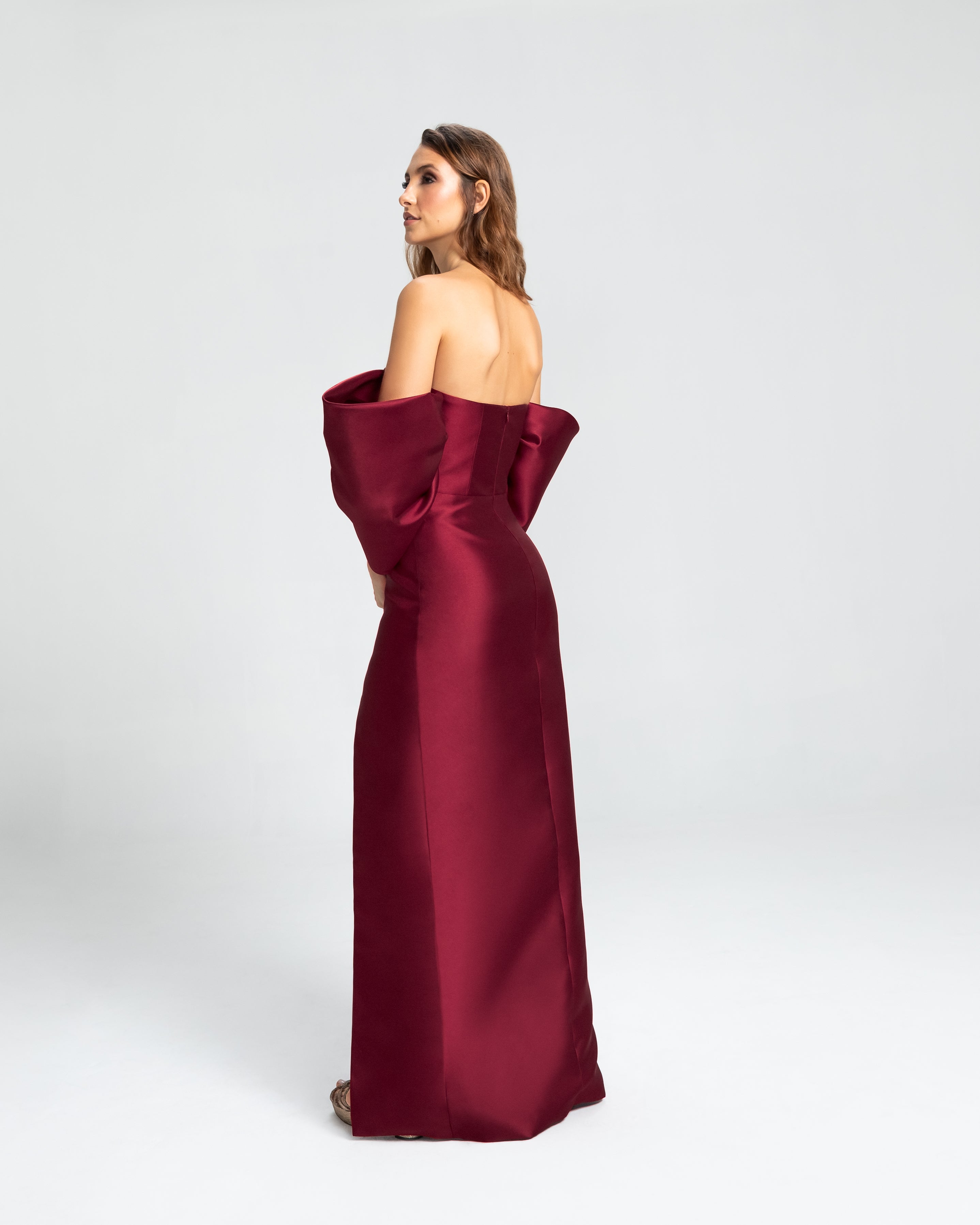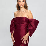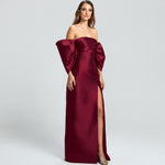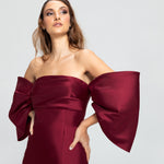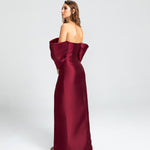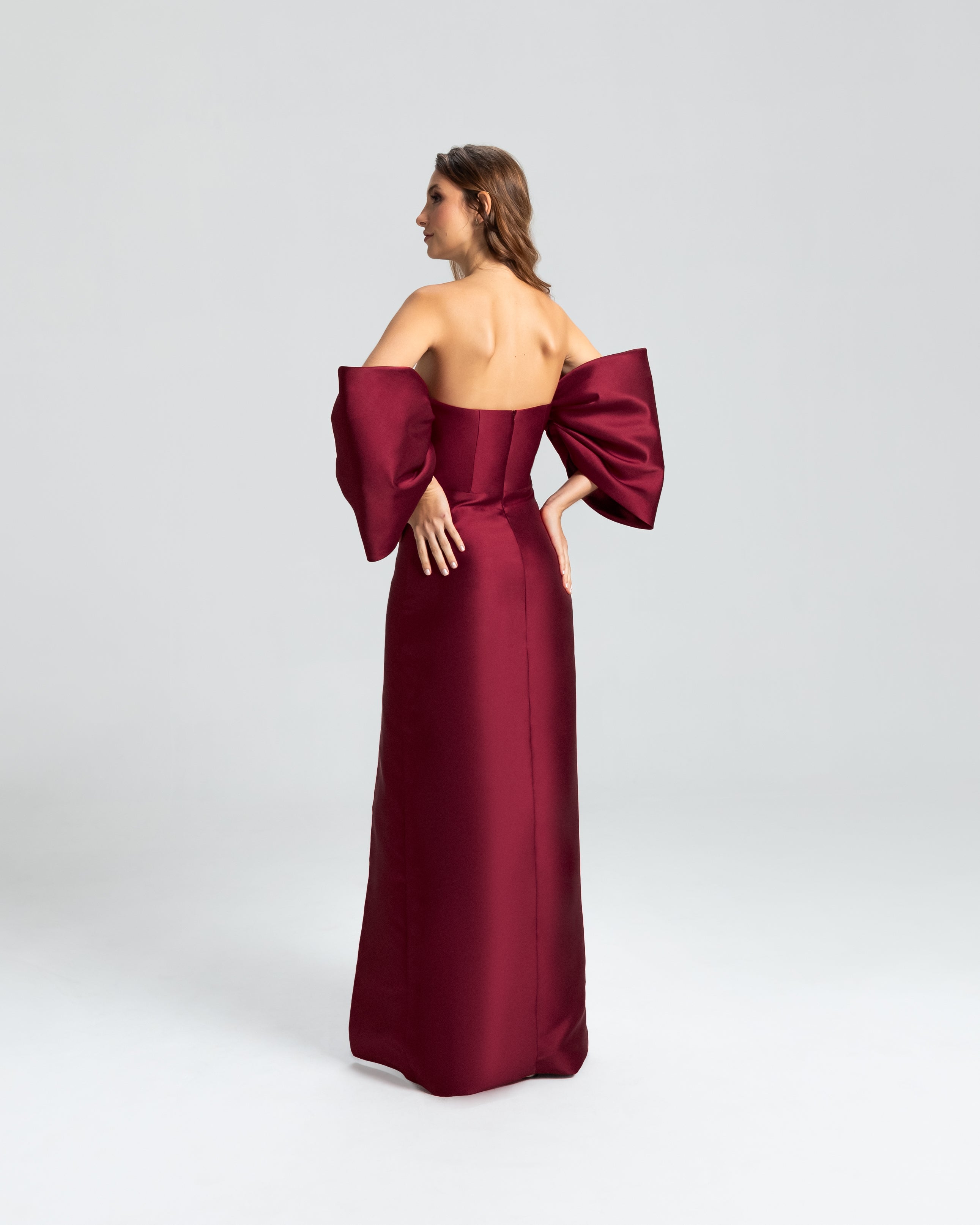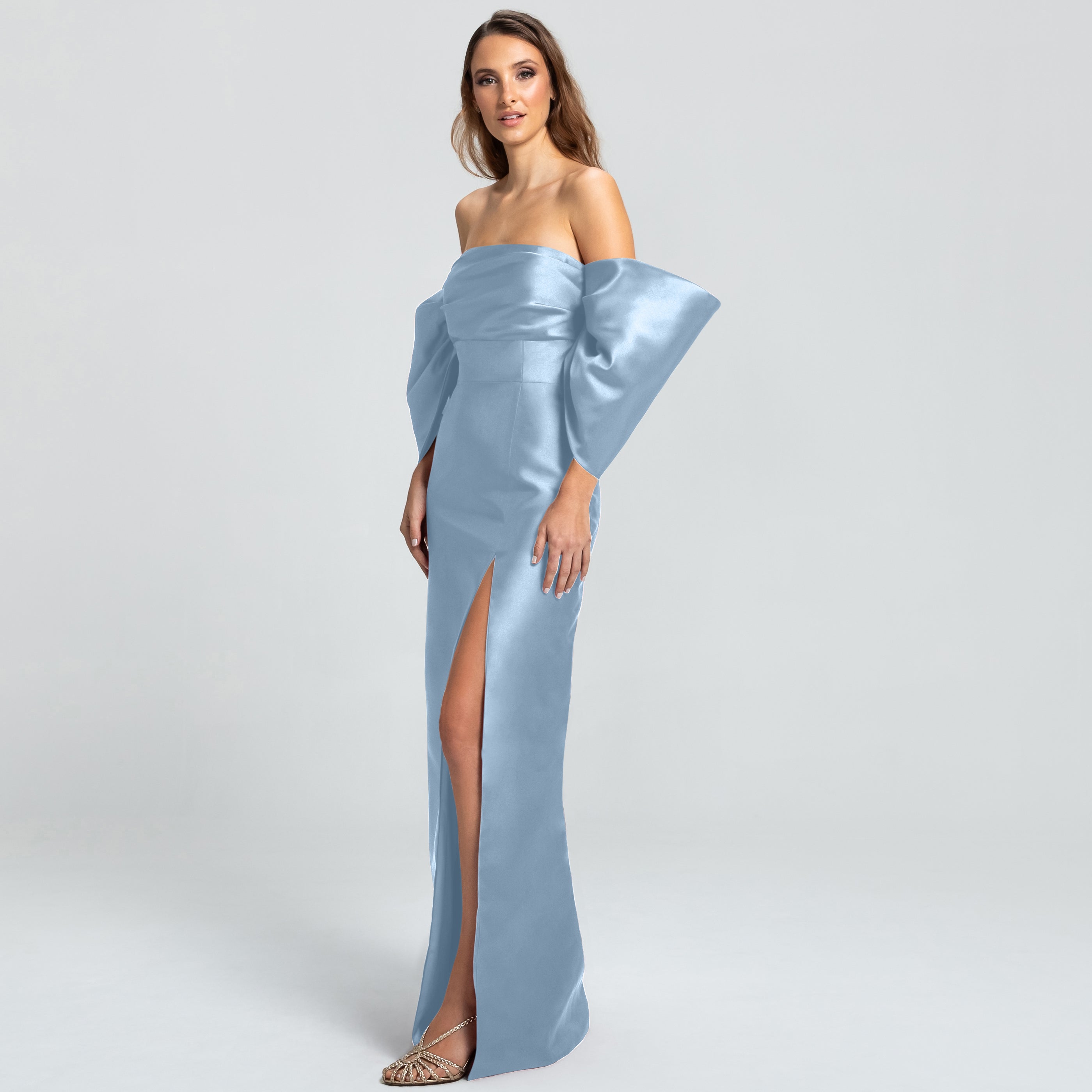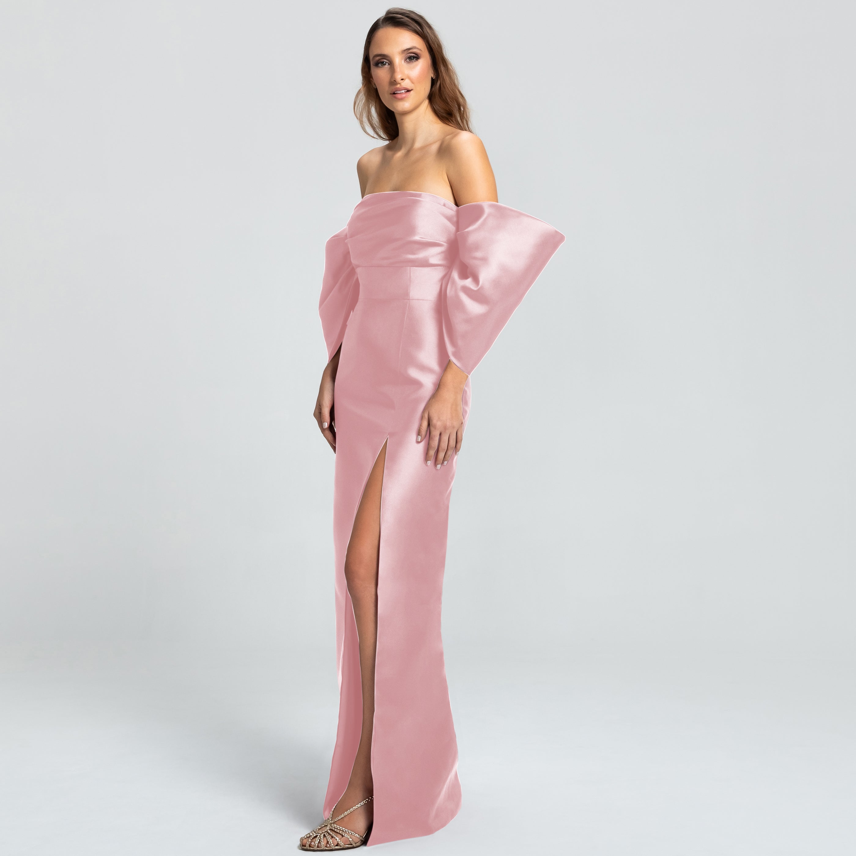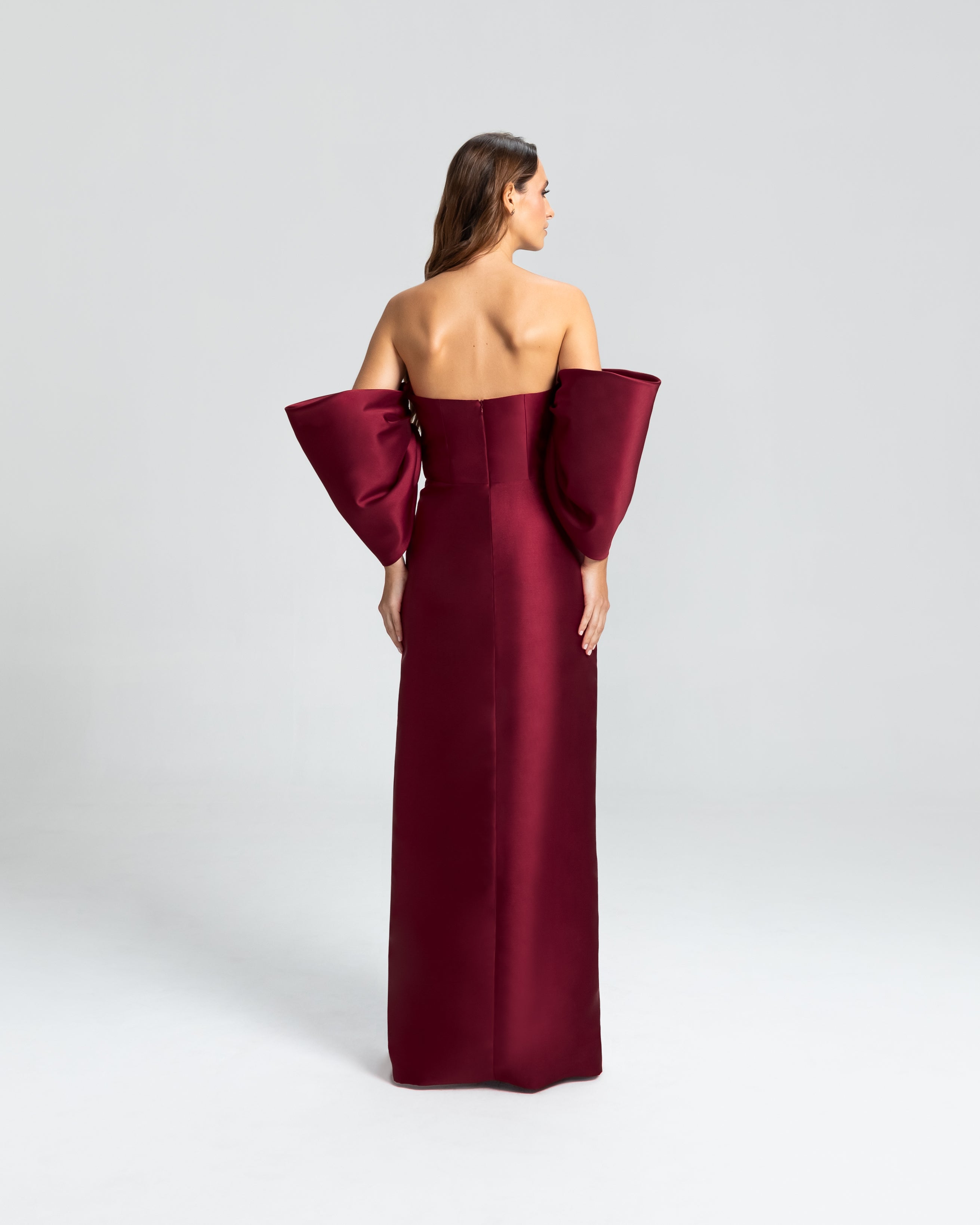 Este modelo combina um decote ombro a ombro e um corpo ajustado com uma cintura definida, acentuando a silhueta com sutileza. A saia reta, com uma super fenda frontal, contrasta com as mangas de grandes volumes, levemente drapeadas e estruturadas com barbatanas, que adicionam um toque fashionista e ousado. Perfeito para quem não abre mão de detalhes impactantes mesmo em um vestido mais tradicional.