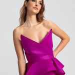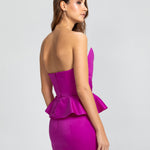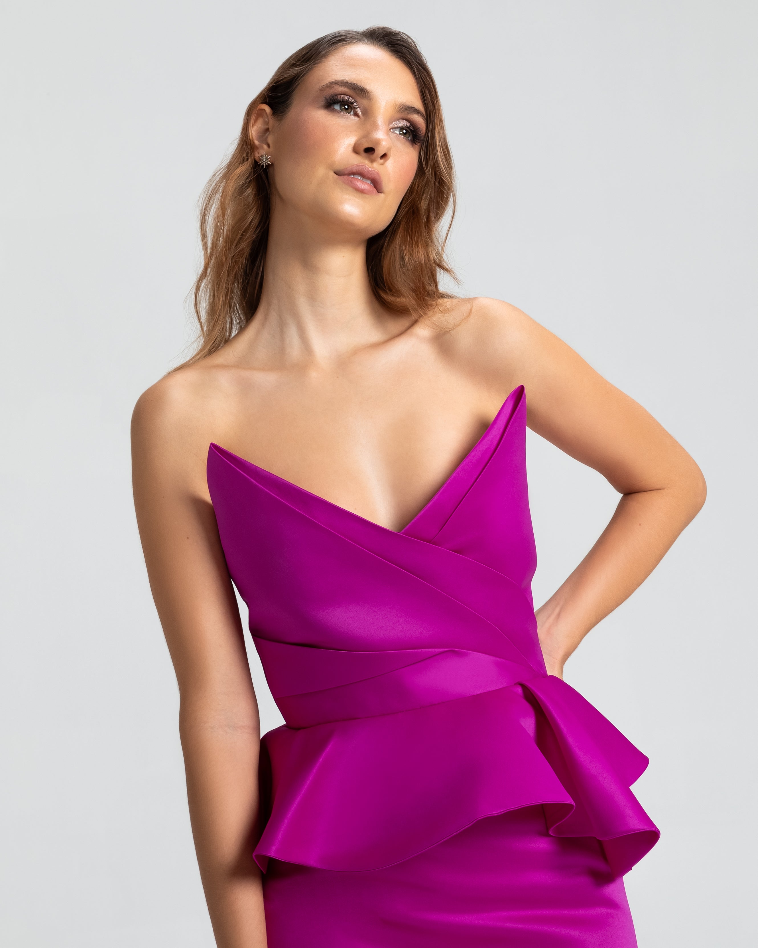 Confeccionado em zibeline, este vestido exibe um decote em pontas, realçado por dobraduras sobrepostas com bojo e barbatanas que esculpem a peça de forma única. A cintura ajustada valoriza a silhueta, enquanto a saia shape sereia com peplum confere um charme ousado e sofisticado. Ideal para mulheres poderosas que desejam destacar suas curvas com elegância e atitude.