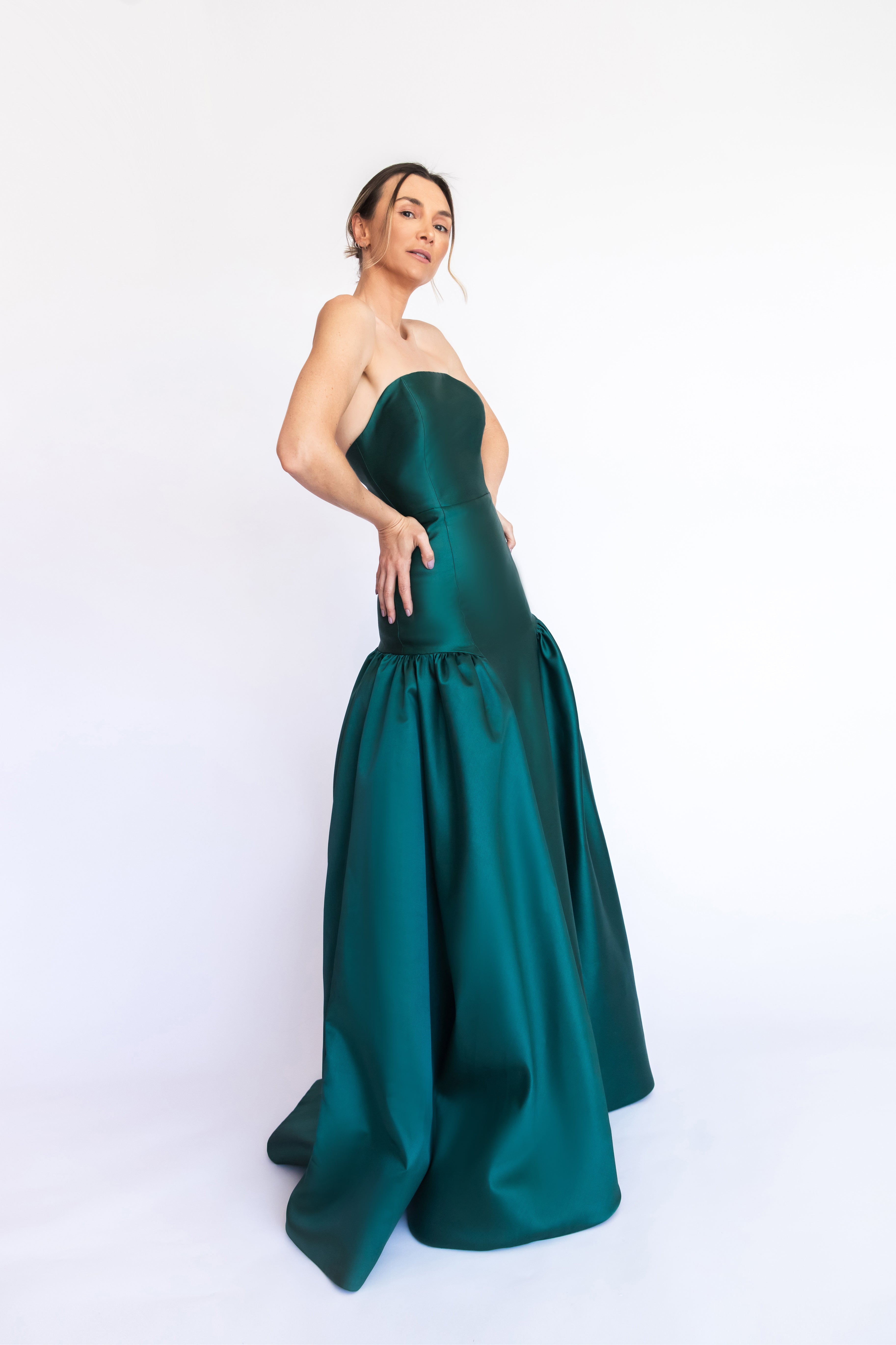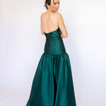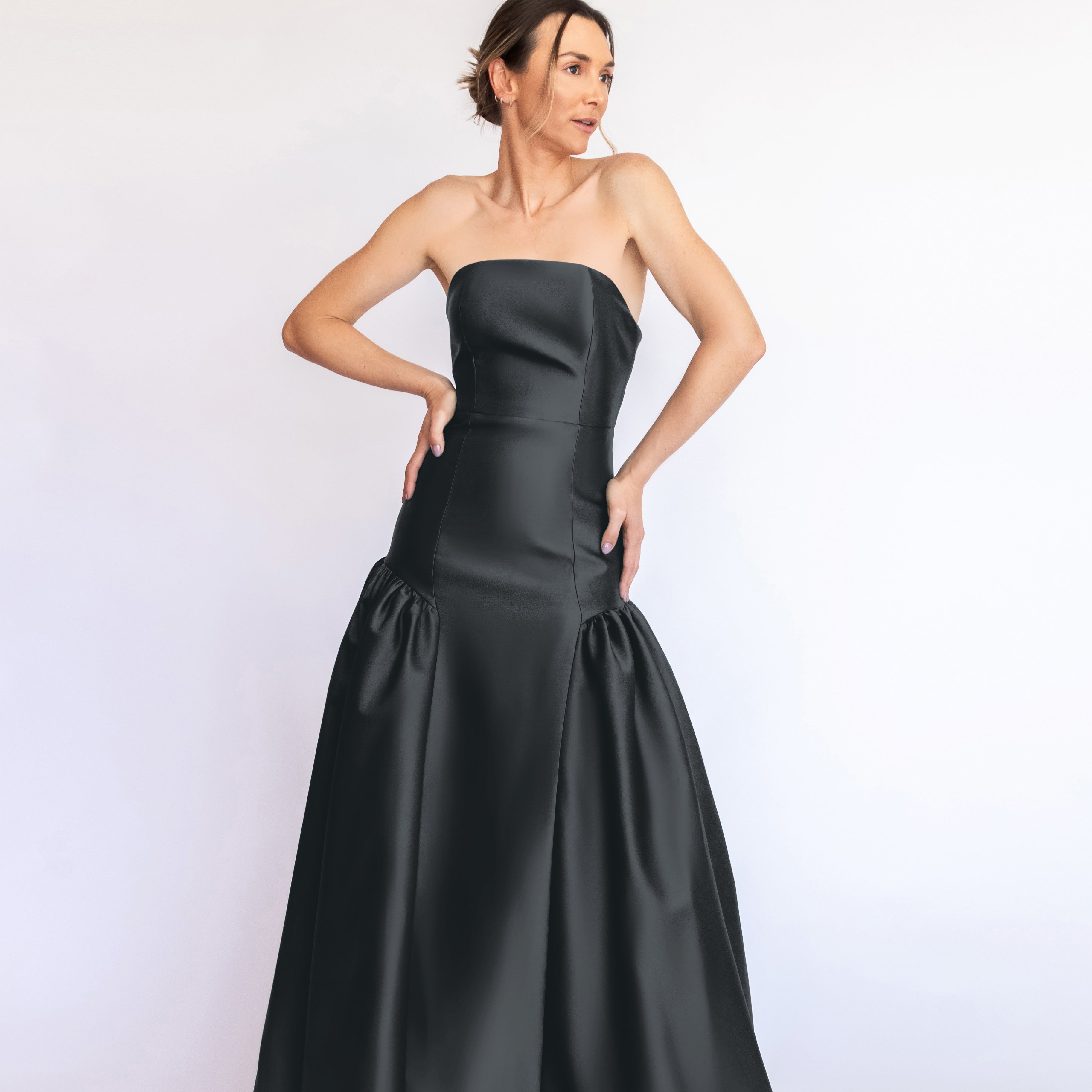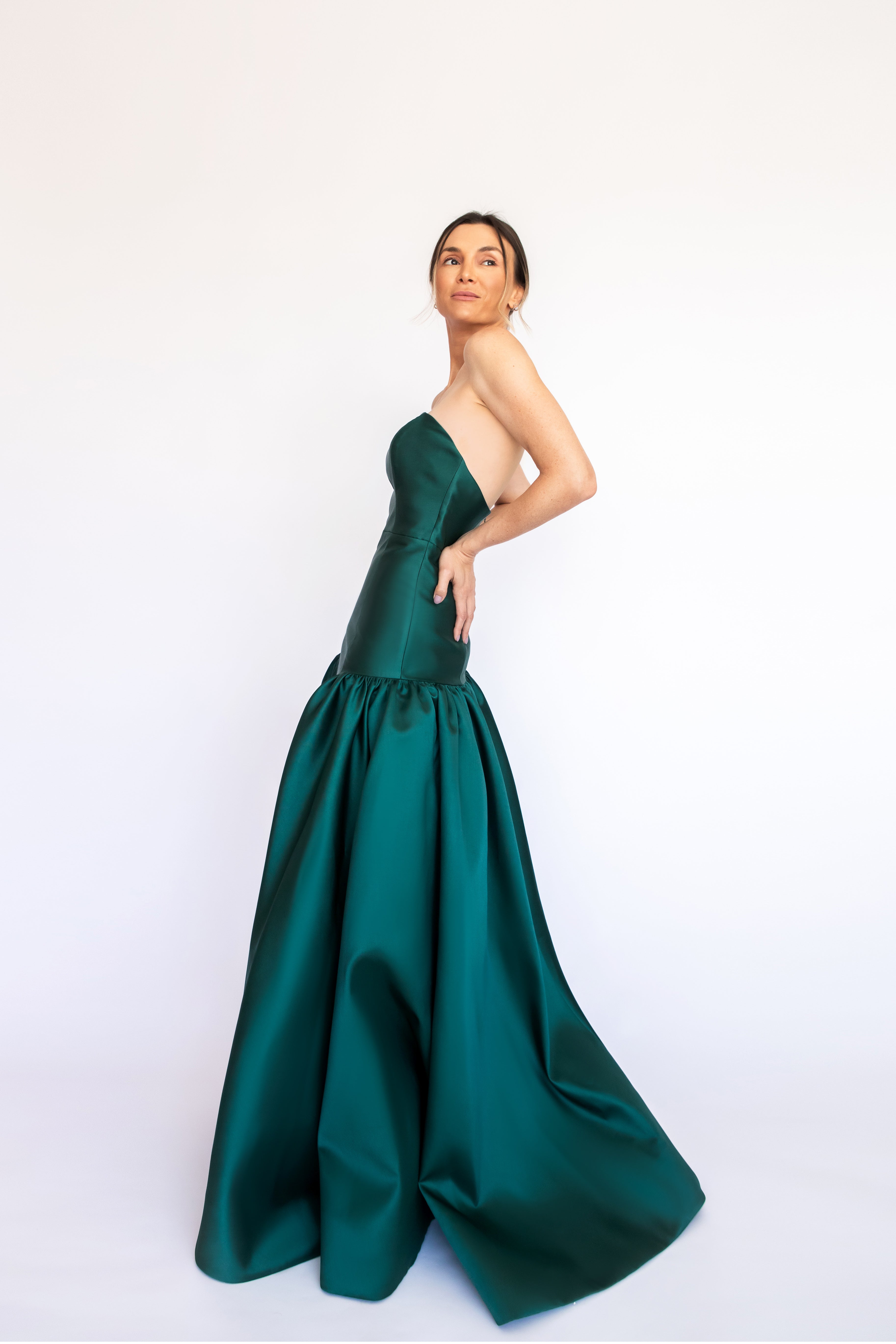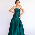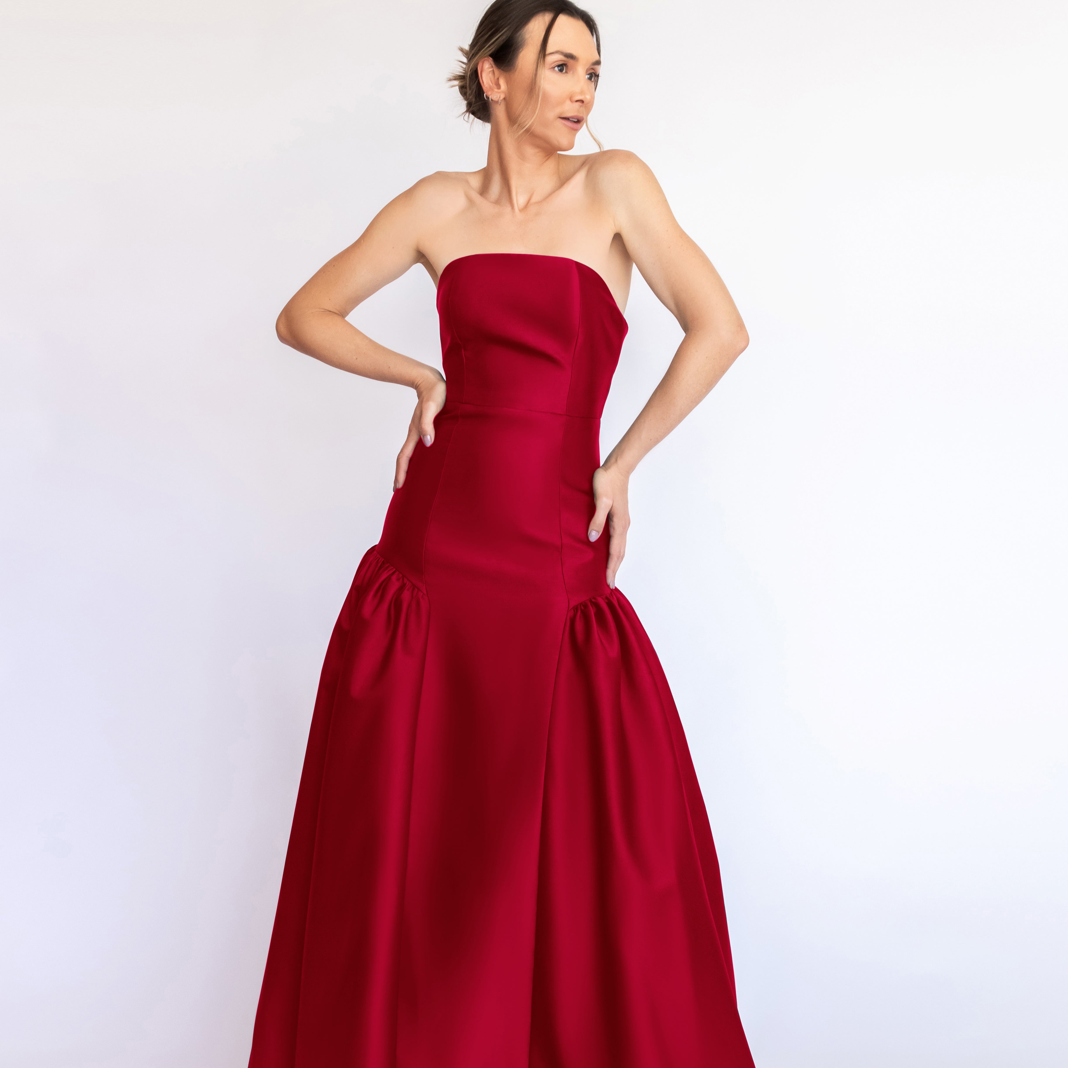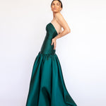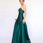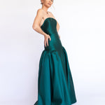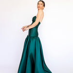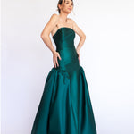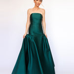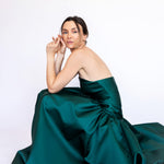 Um clássico digno de tapete vermelho, este vestido nasceu para as noivas e conquistou espaço também em versões coloridas. Com decote tomara que caia mais baixo nas costas, ele valoriza as costas de forma elegante. Todo ajustado ao corpo, cria uma silhueta marcante que ganha imponência com a saia super ampla e franzida, contornando o corpo abaixo do cadeirão. Na frente, a base reta dá a impressão de um vestido justo com uma saia sobreposta — um efeito à la Maria Antonieta, que une drama e sofisticação em perfeita harmonia.
