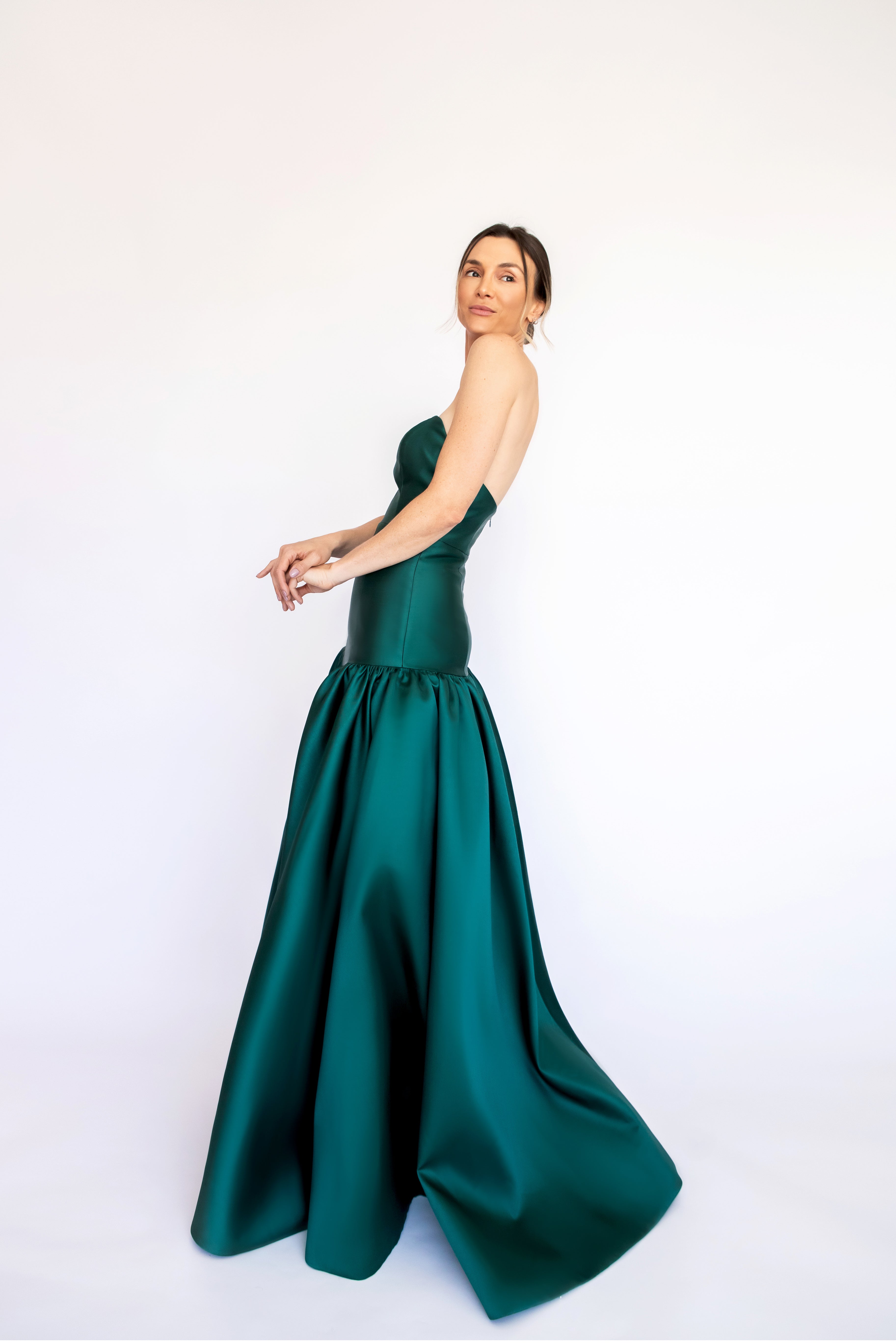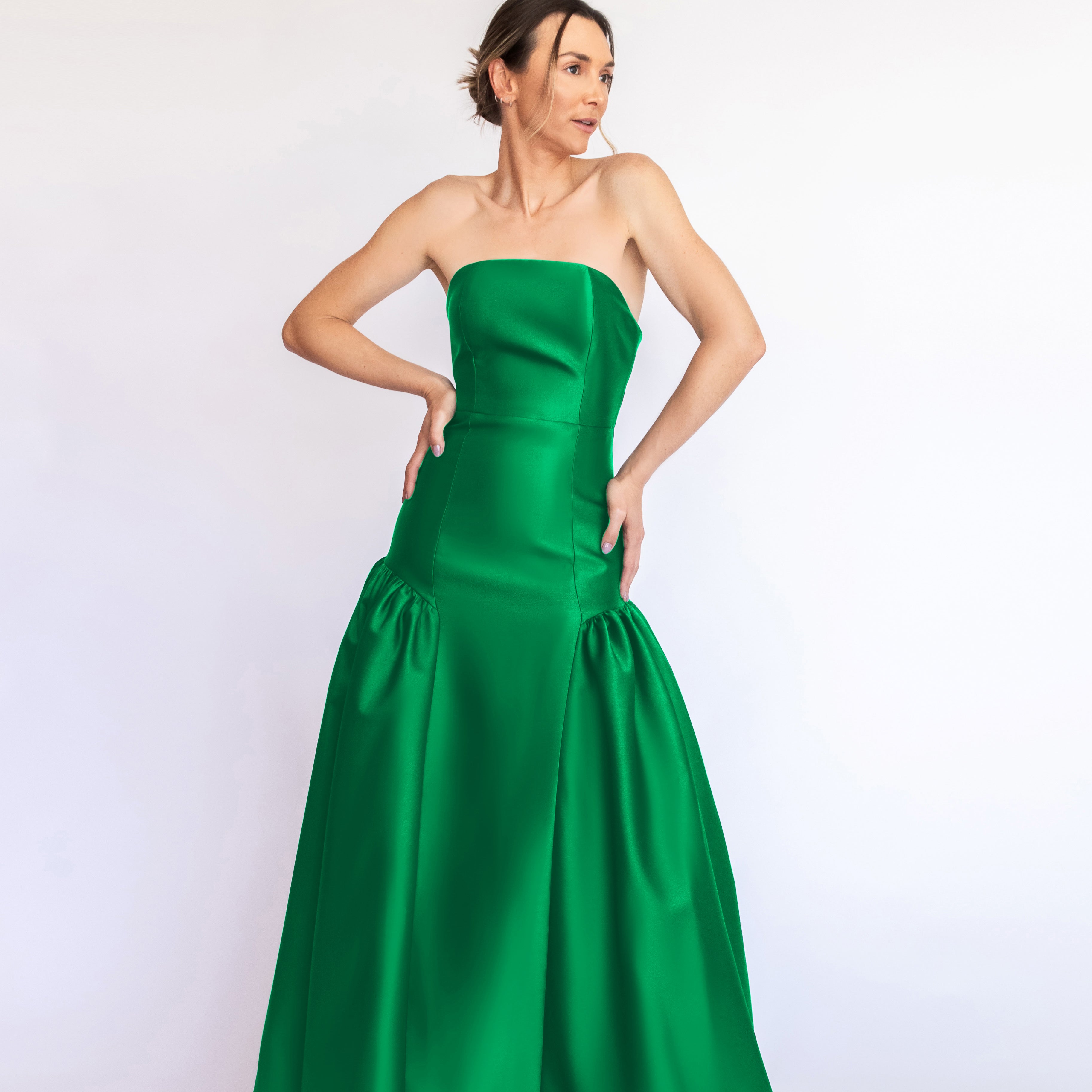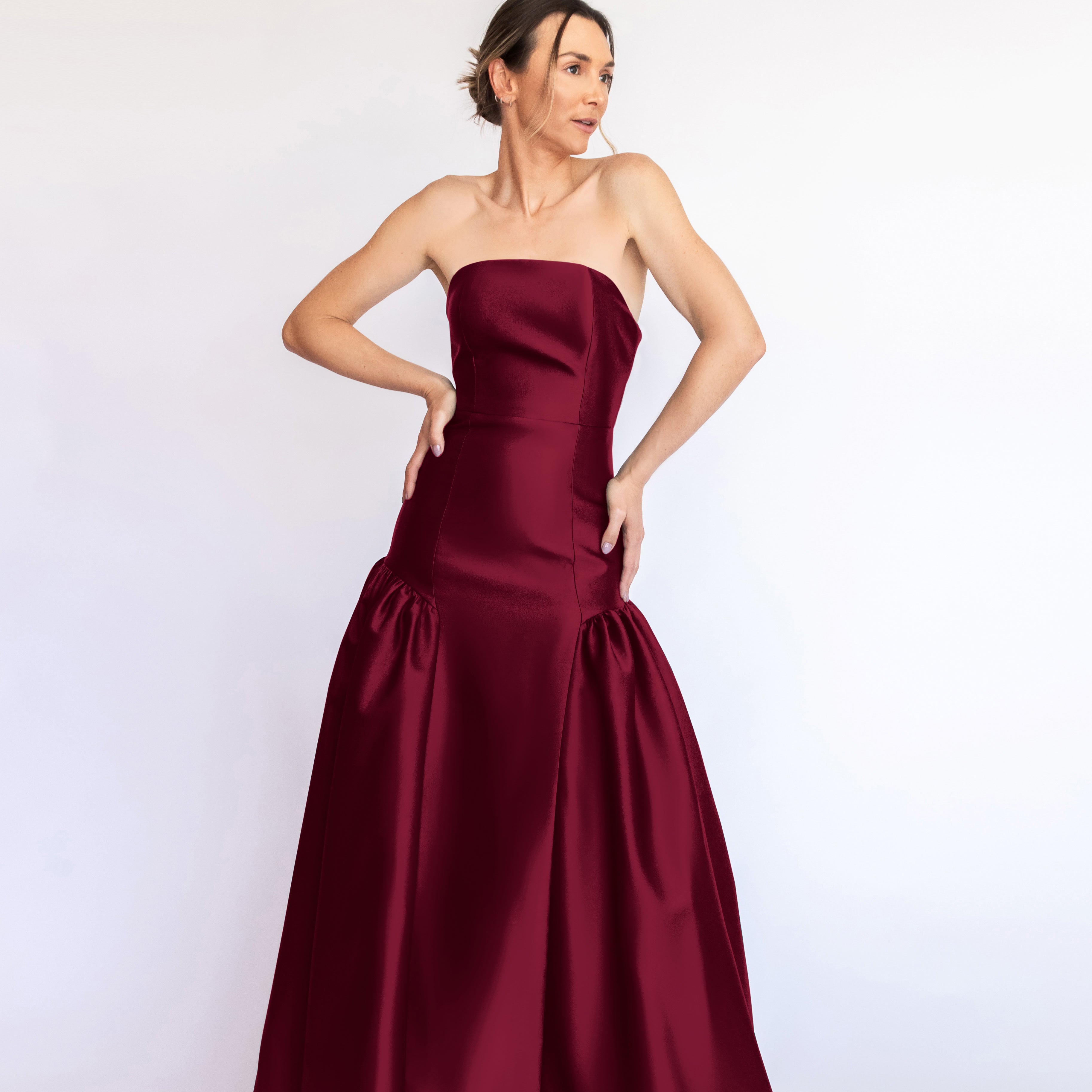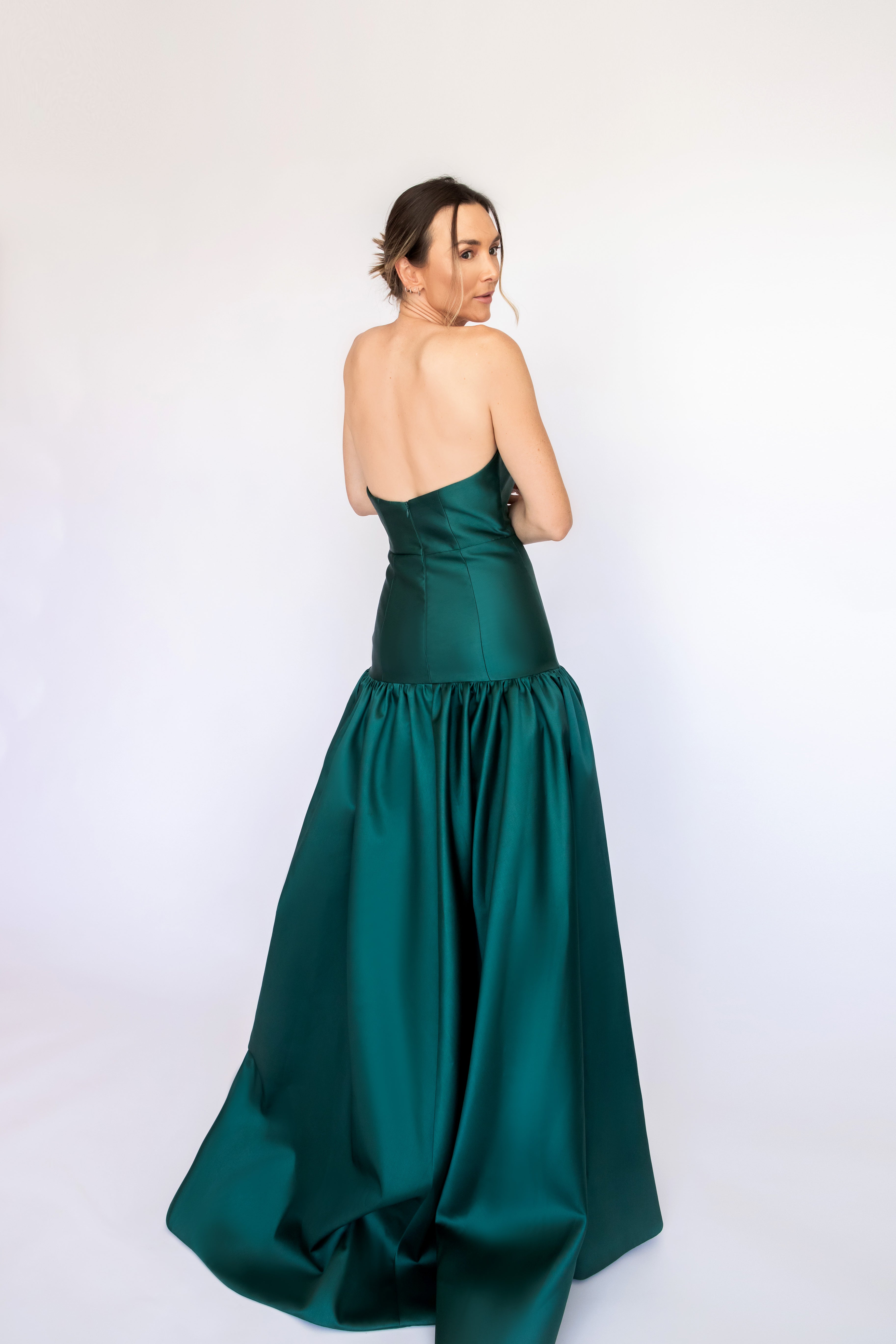 Um clássico digno de tapete vermelho, este vestido nasceu para as noivas e conquistou espaço também em versões coloridas. Com decote tomara que caia mais baixo nas costas, ele valoriza as costas de forma elegante. Todo ajustado ao corpo, cria uma silhueta marcante que ganha imponência com a saia super ampla e franzida, contornando o corpo abaixo do cadeirão. Na frente, a base reta dá a impressão de um vestido justo com uma saia sobreposta — um efeito à la Maria Antonieta, que une drama e sofisticação em perfeita harmonia.