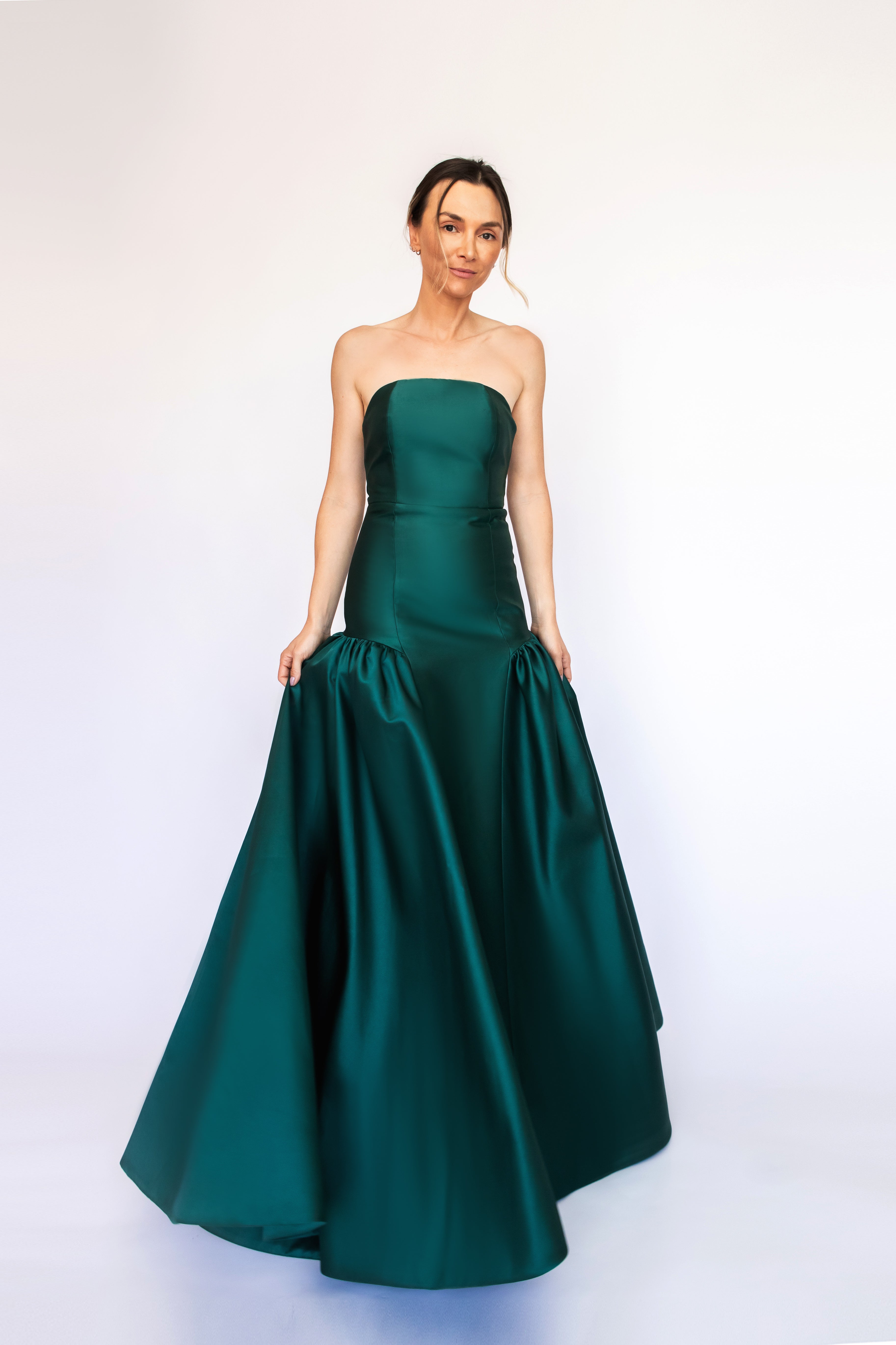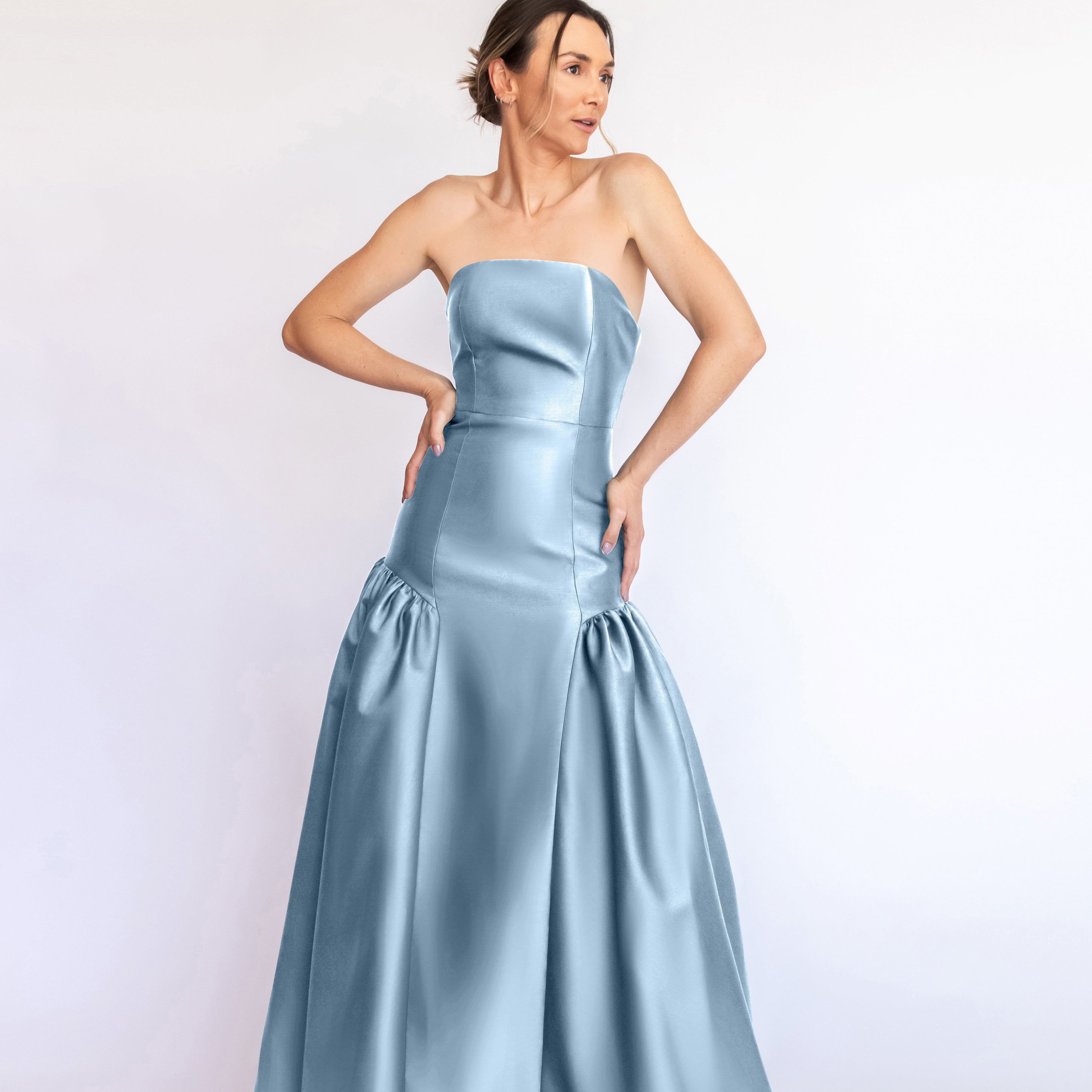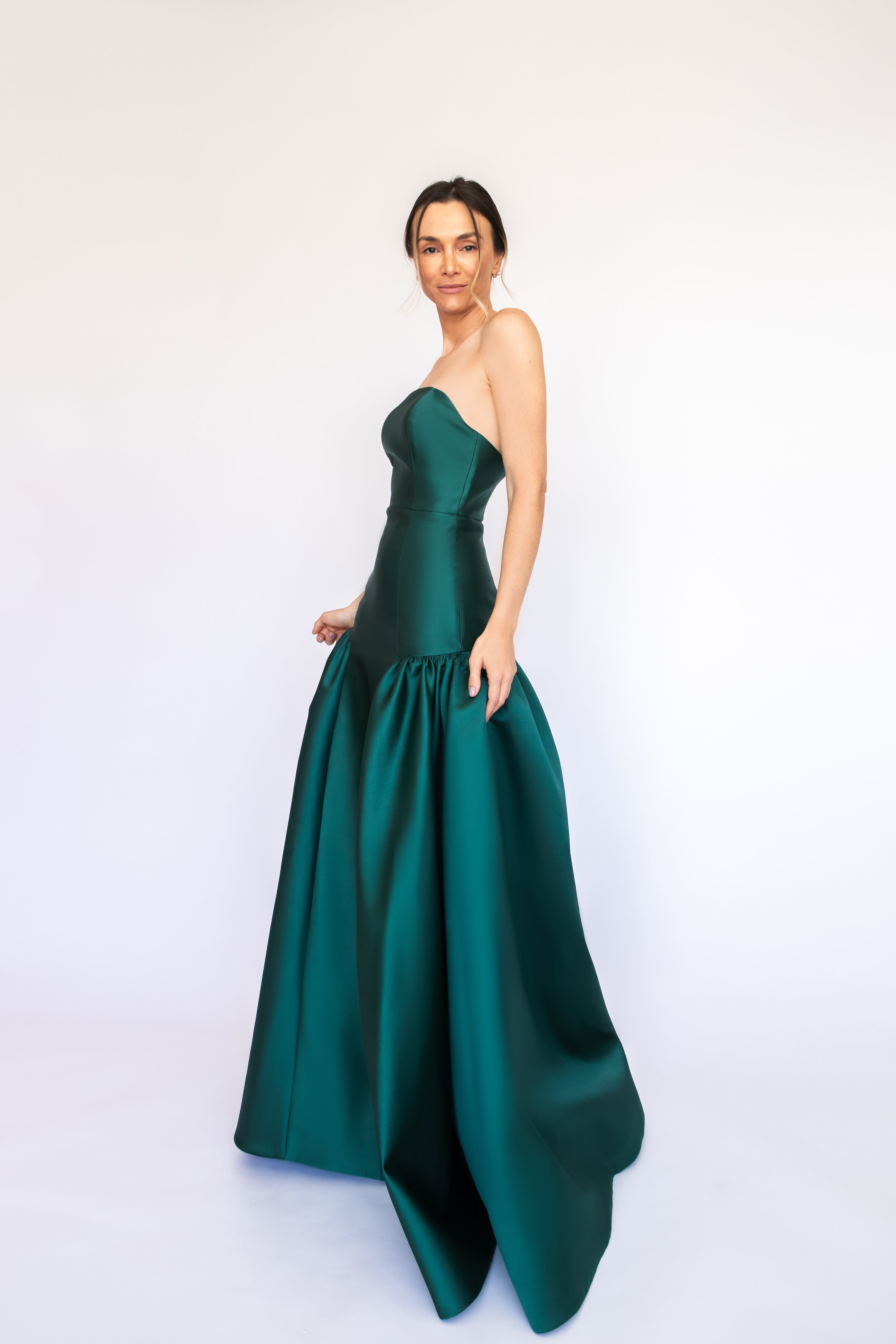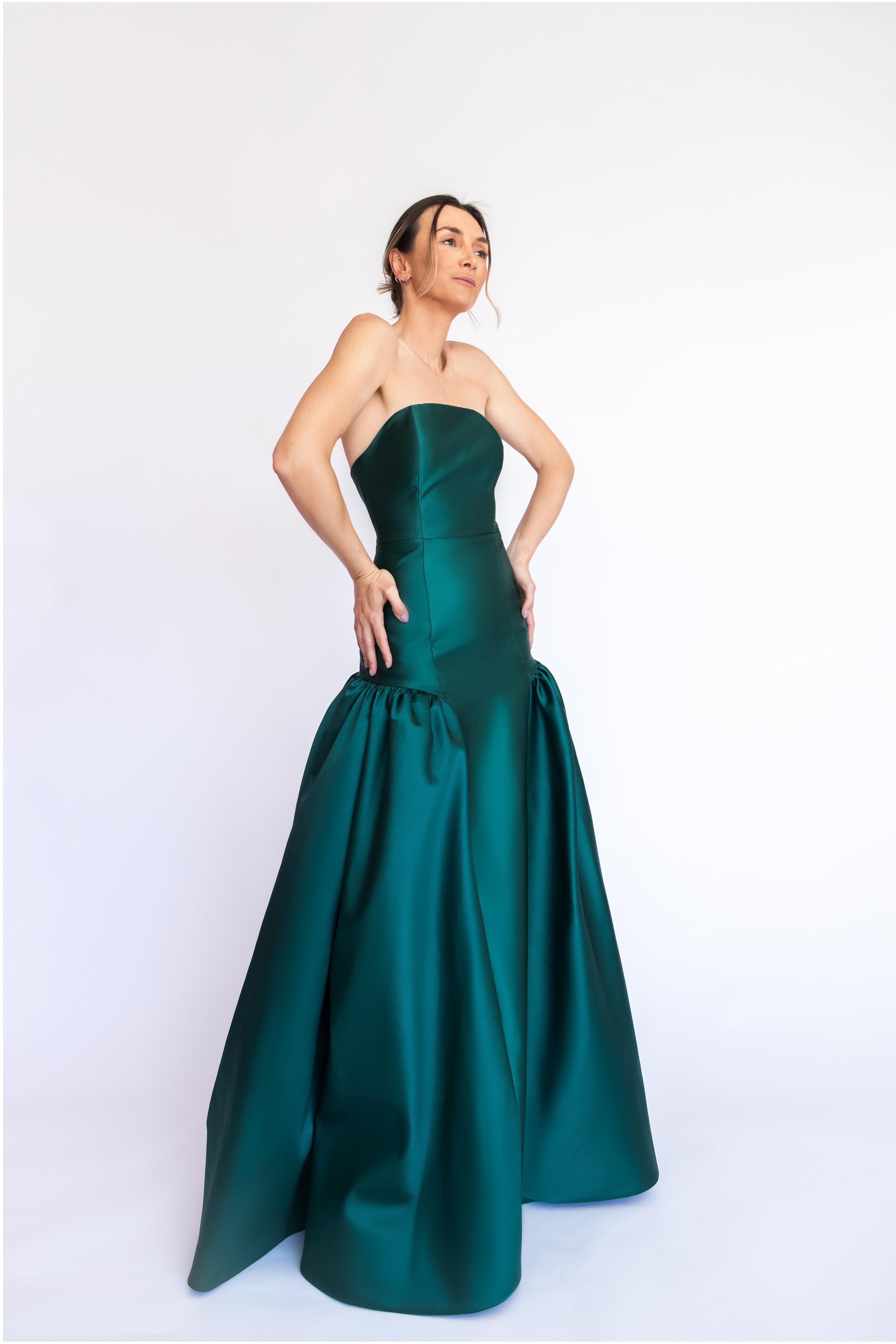Um clássico digno de tapete vermelho, este vestido nasceu para as noivas e conquistou espaço também em versões coloridas. Com decote tomara que caia mais baixo nas costas, ele valoriza as costas de forma elegante. Todo ajustado ao corpo, cria uma silhueta marcante que ganha imponência com a saia super ampla e franzida, contornando o corpo abaixo do cadeirão. Na frente, a base reta dá a impressão de um vestido justo com uma saia sobreposta — um efeito à la Maria Antonieta, que une drama e sofisticação em perfeita harmonia.
