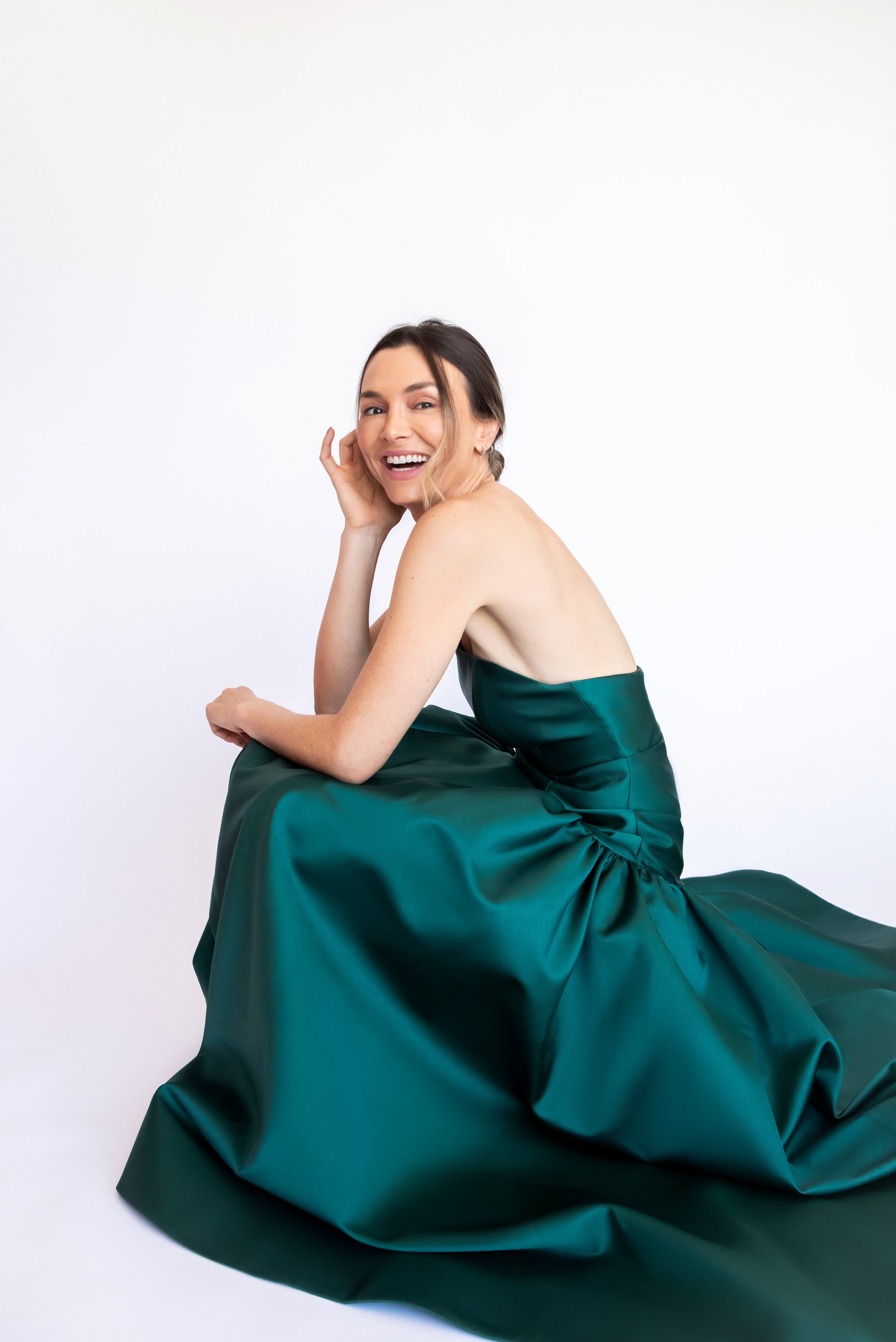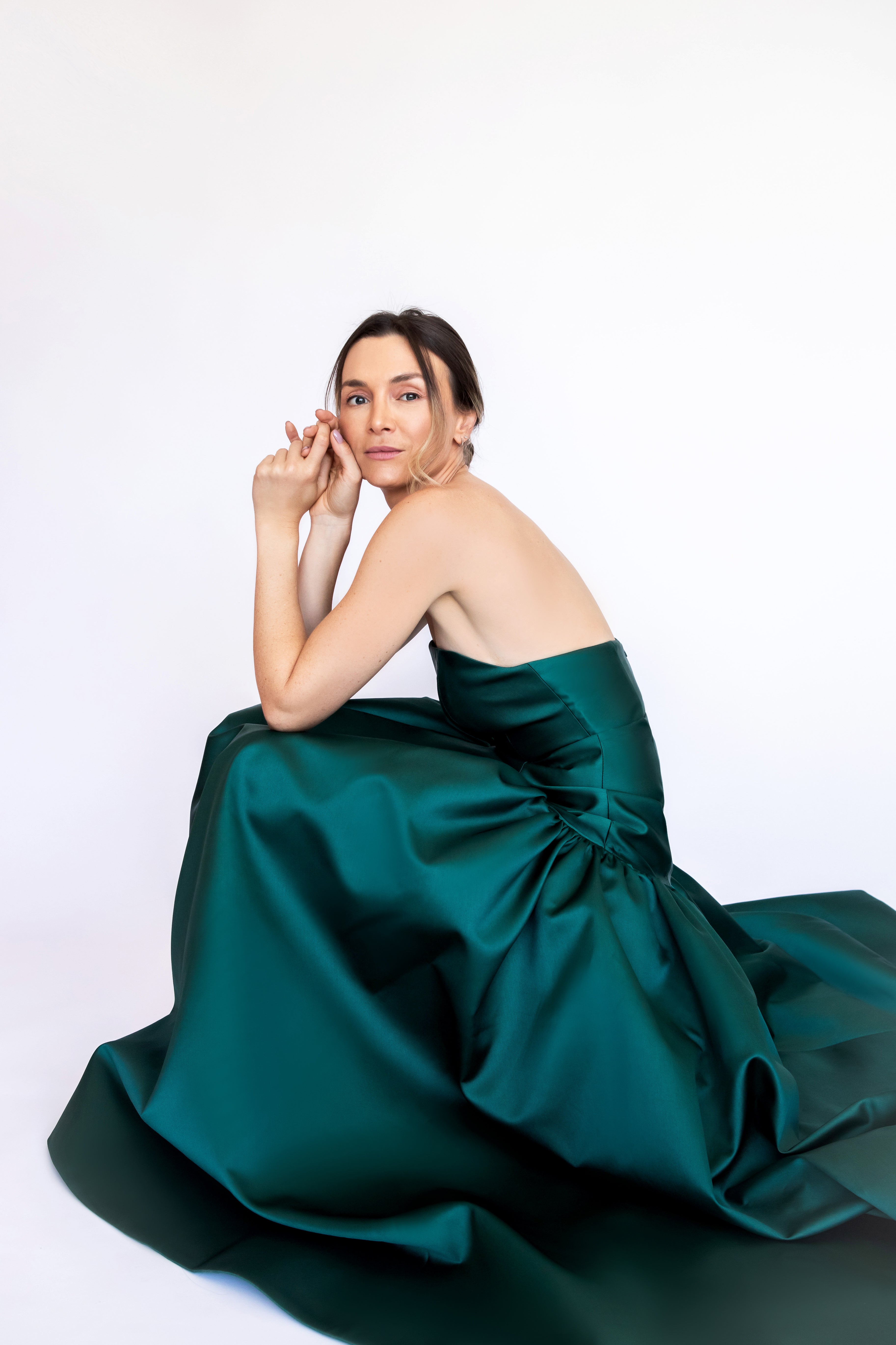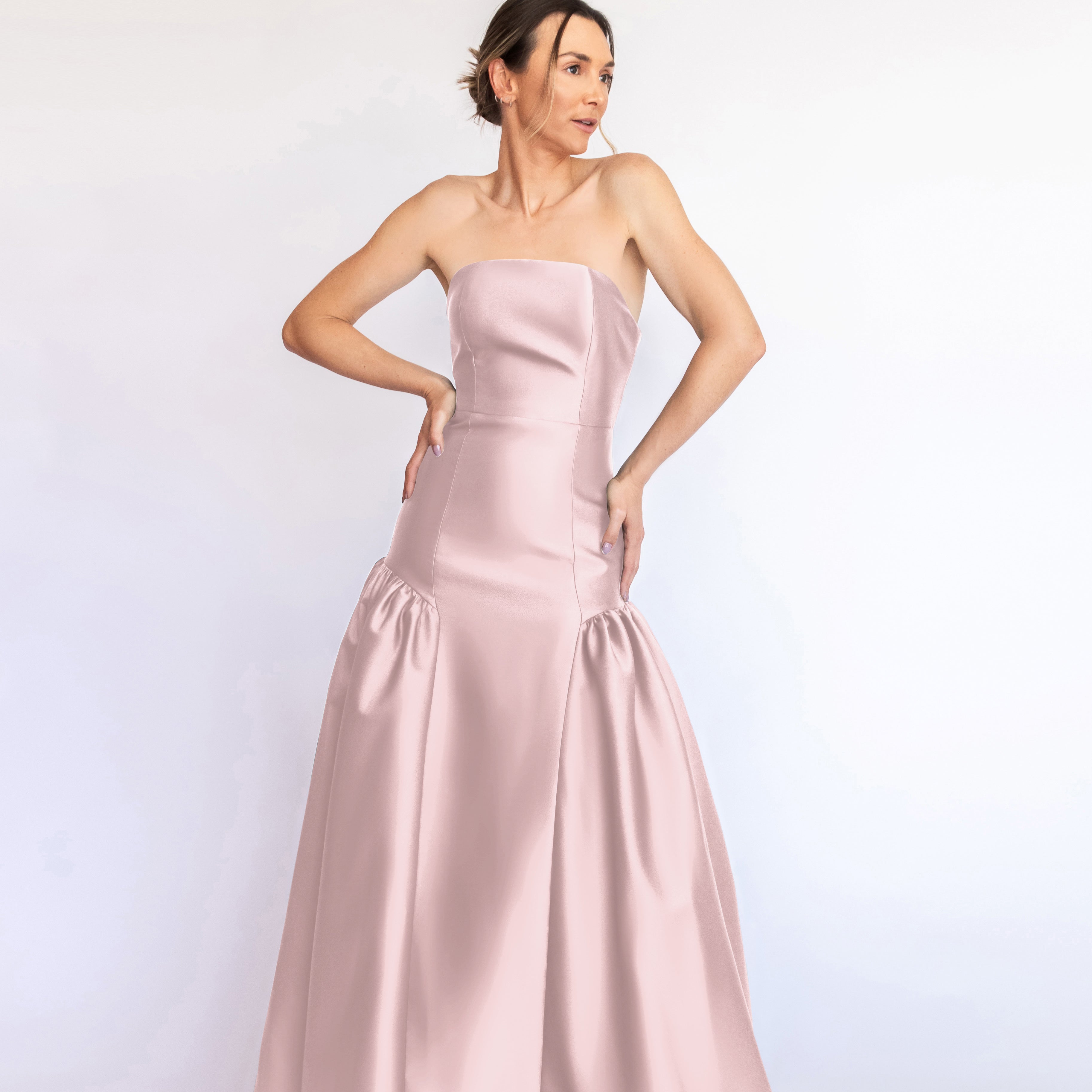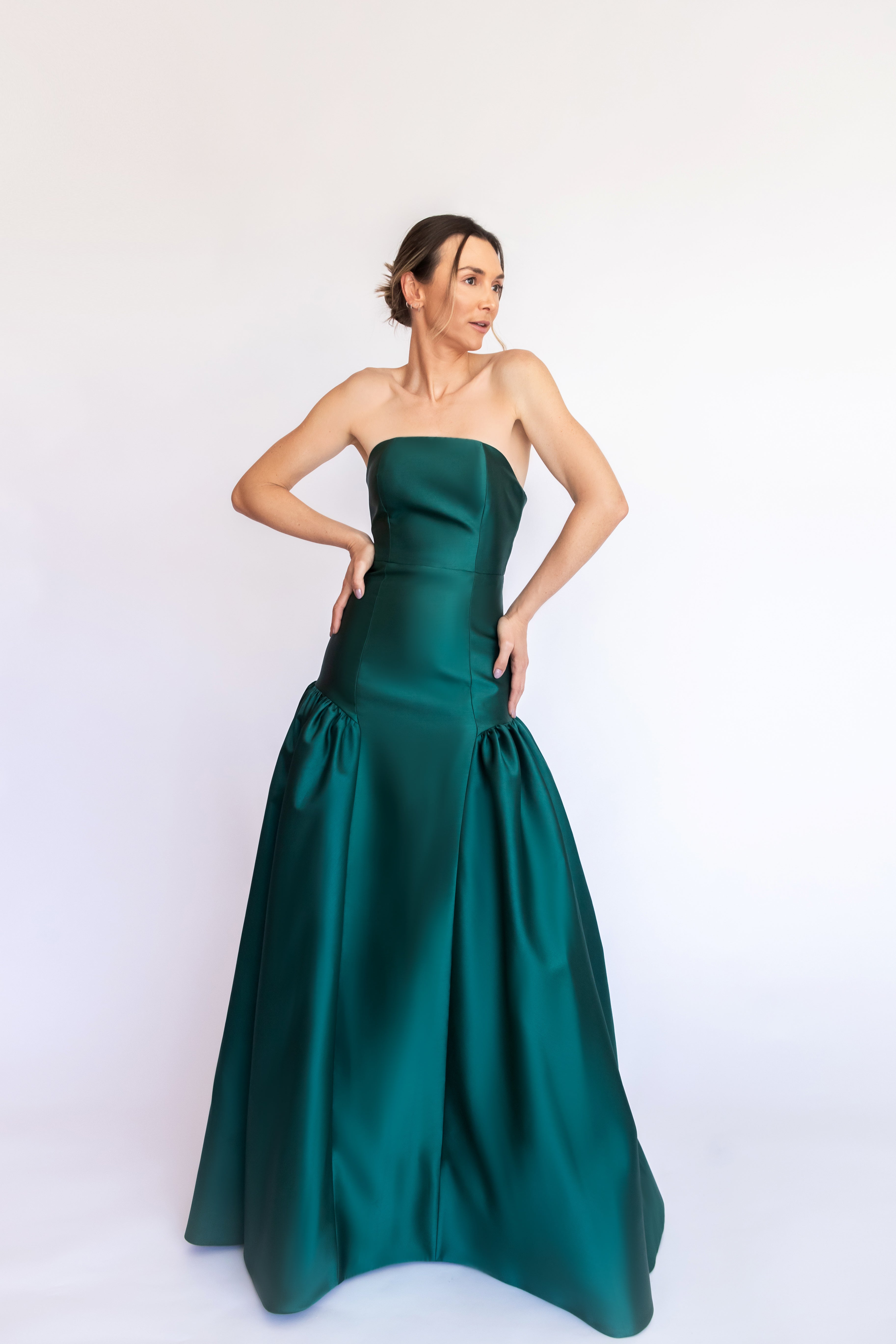 Um clássico digno de tapete vermelho, este vestido nasceu para as noivas e conquistou espaço também em versões coloridas. Com decote tomara que caia mais baixo nas costas, ele valoriza as costas de forma elegante. Todo ajustado ao corpo, cria uma silhueta marcante que ganha imponência com a saia super ampla e franzida, contornando o corpo abaixo do cadeirão. Na frente, a base reta dá a impressão de um vestido justo com uma saia sobreposta — um efeito à la Maria Antonieta, que une drama e sofisticação em perfeita harmonia.