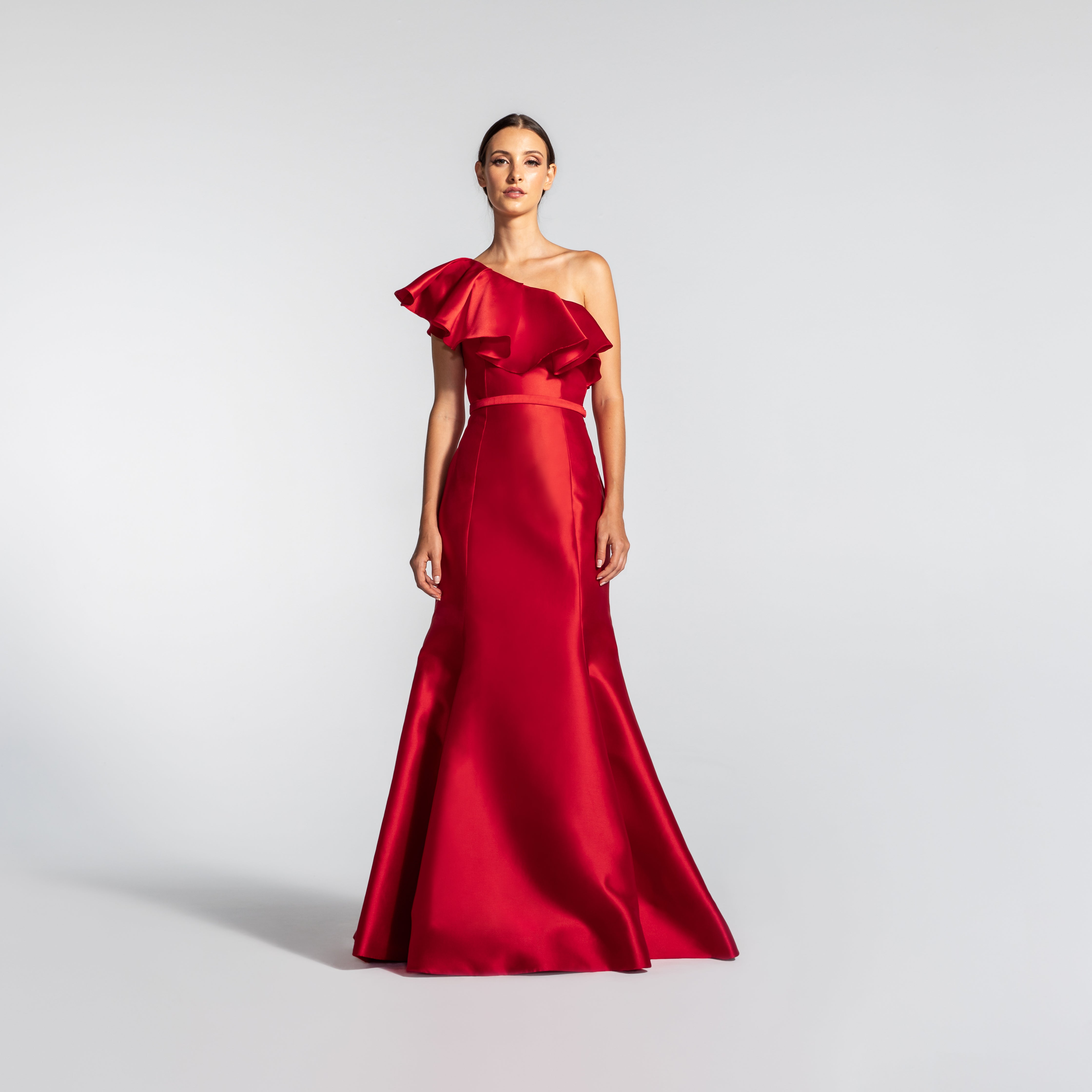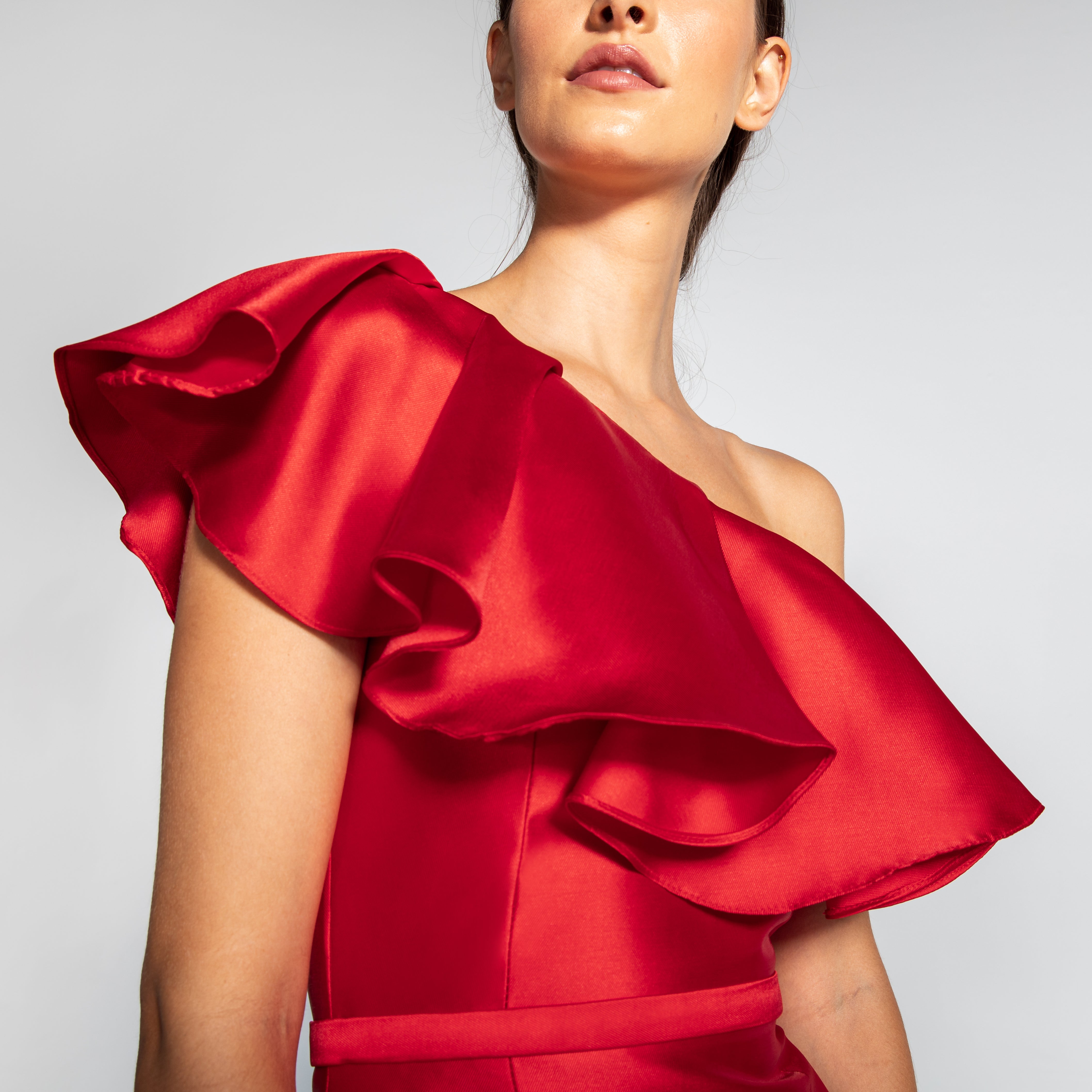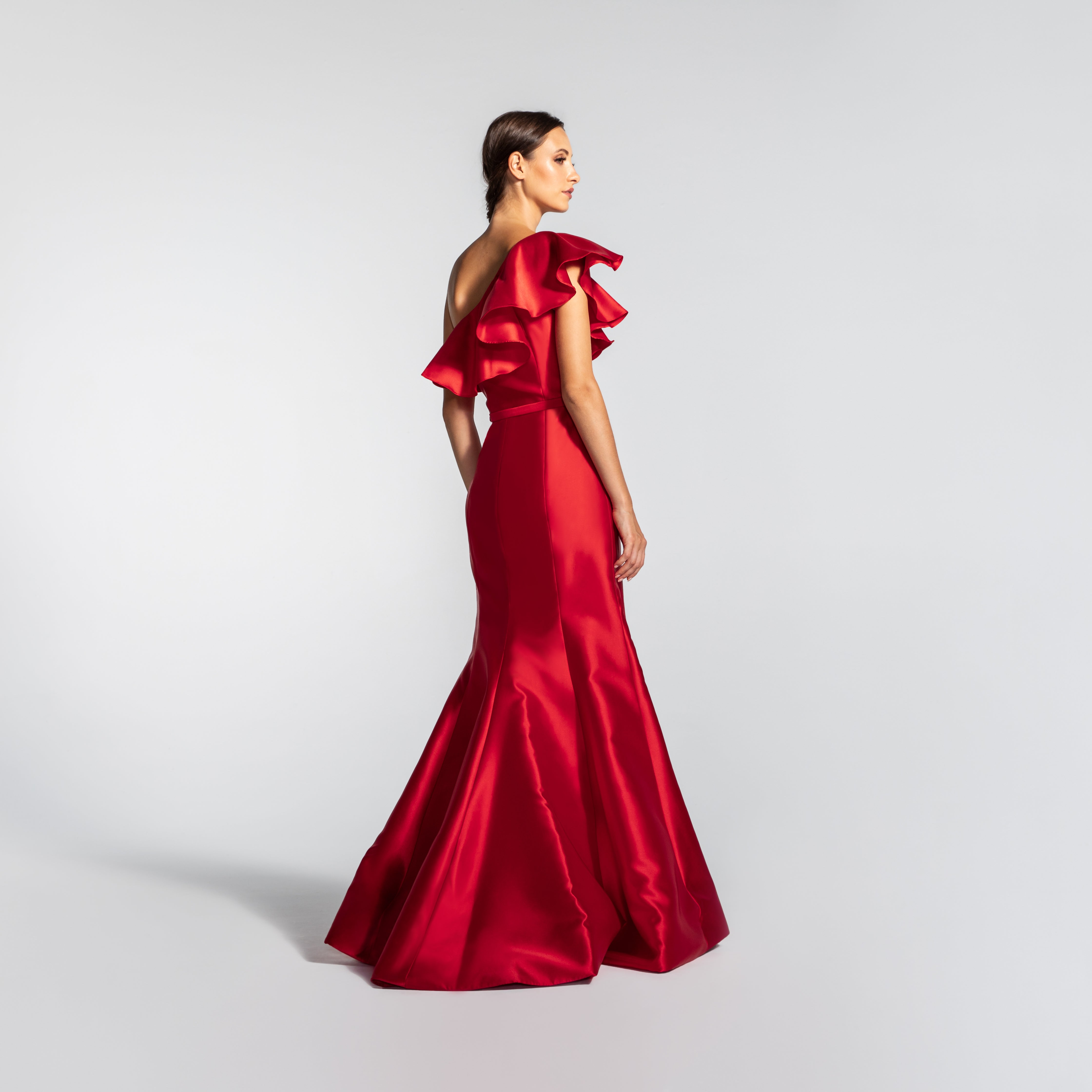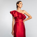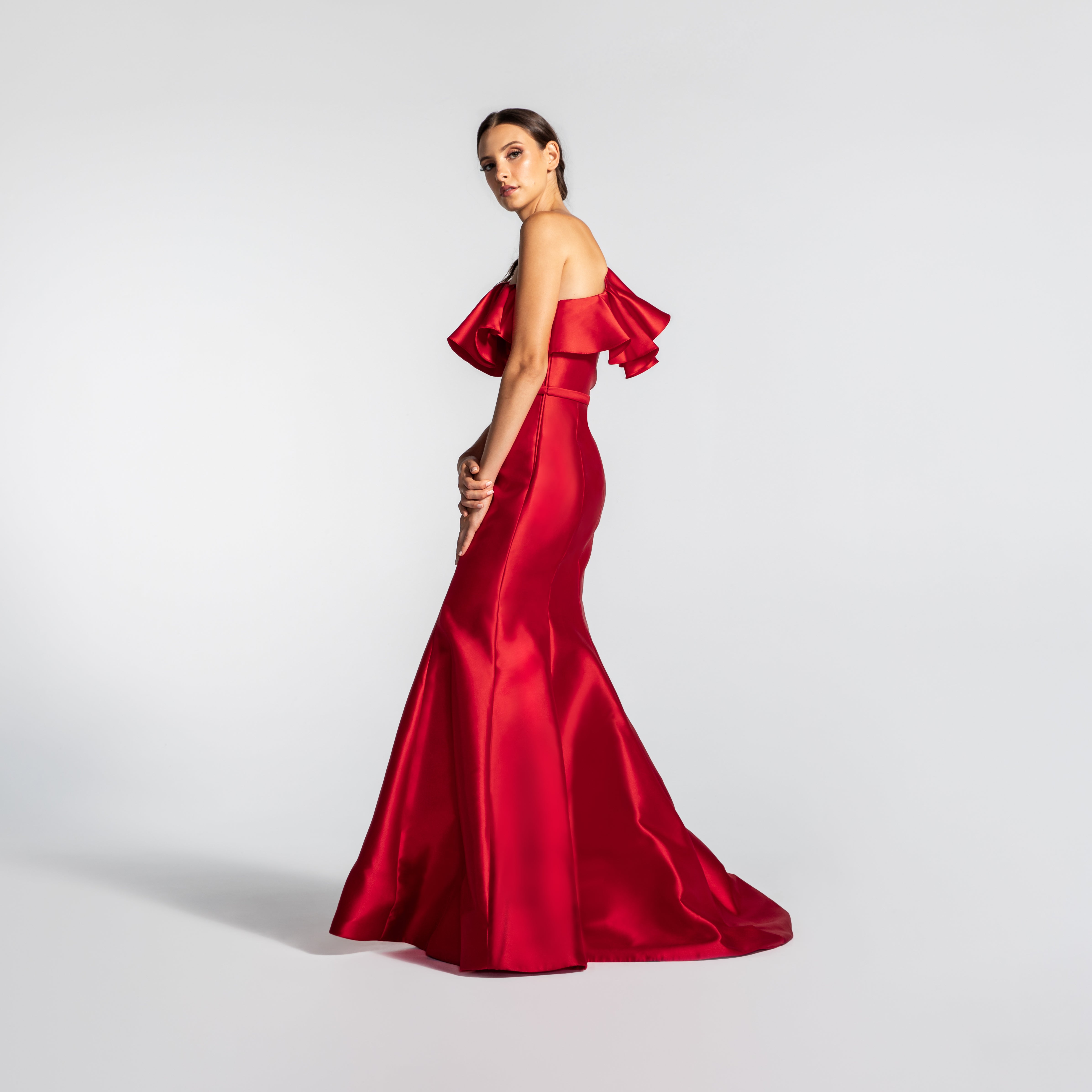 Com uma silhueta sereia marcante, este vestido combina elegância e ousadia. O decote de um ombro só é realçado por um babado escultural estilo jabô, que adiciona um toque de modernidade ao design ajustado. A cintura marcada por um cintinho fino realça as curvas, enquanto a saia sereia completa o visual sofisticado. Ideal para quem deseja evidenciar a silhueta com um detalhe dramático e impactante.