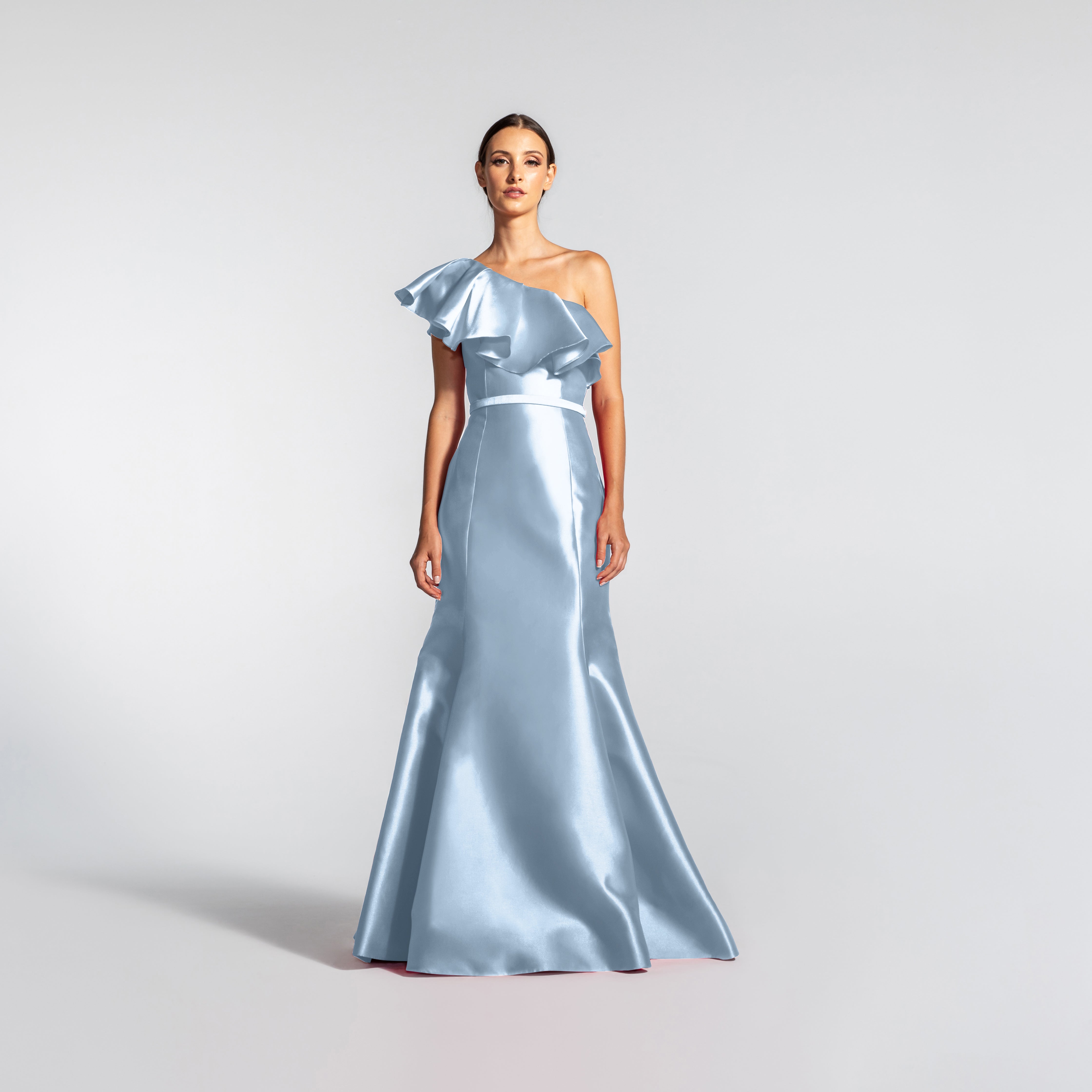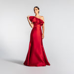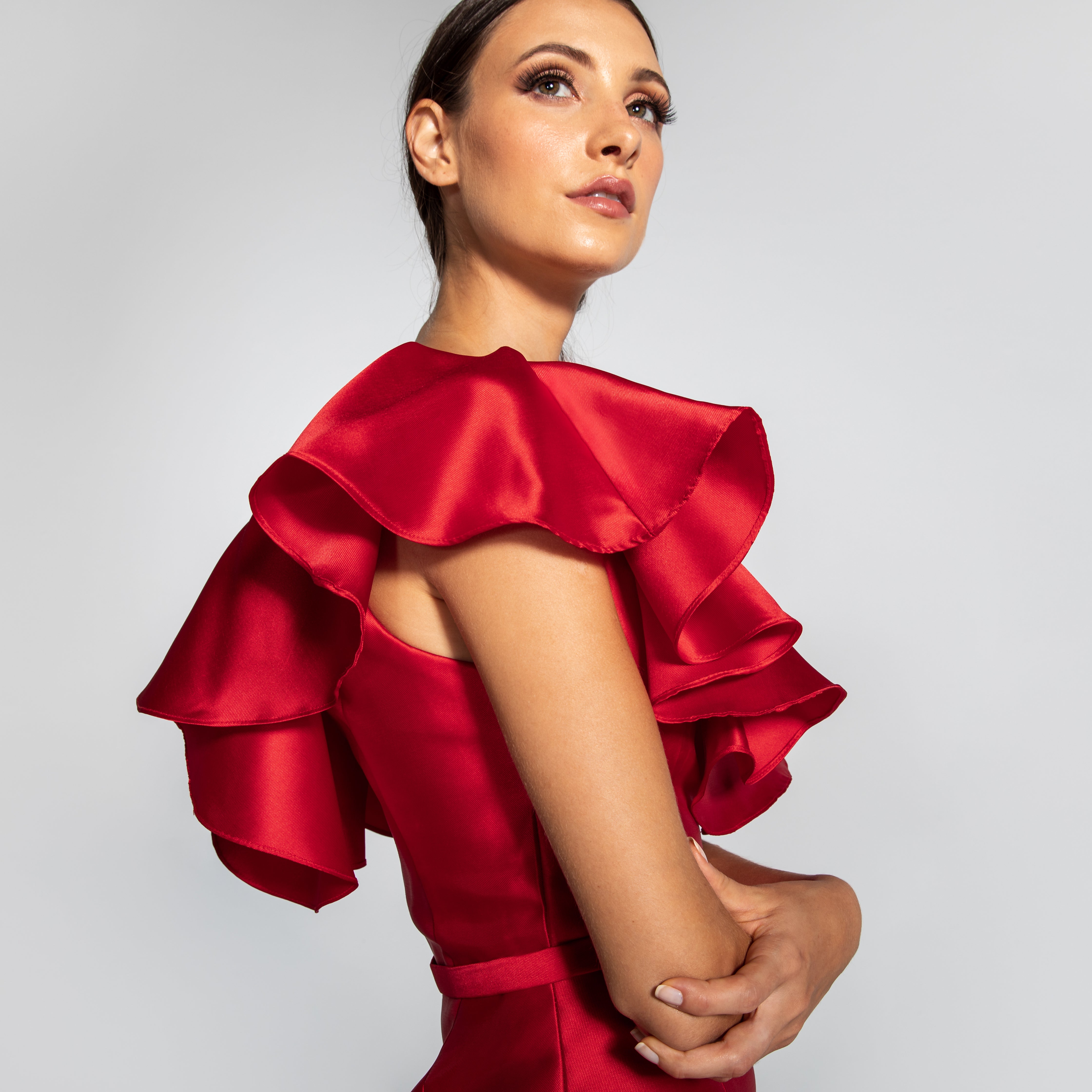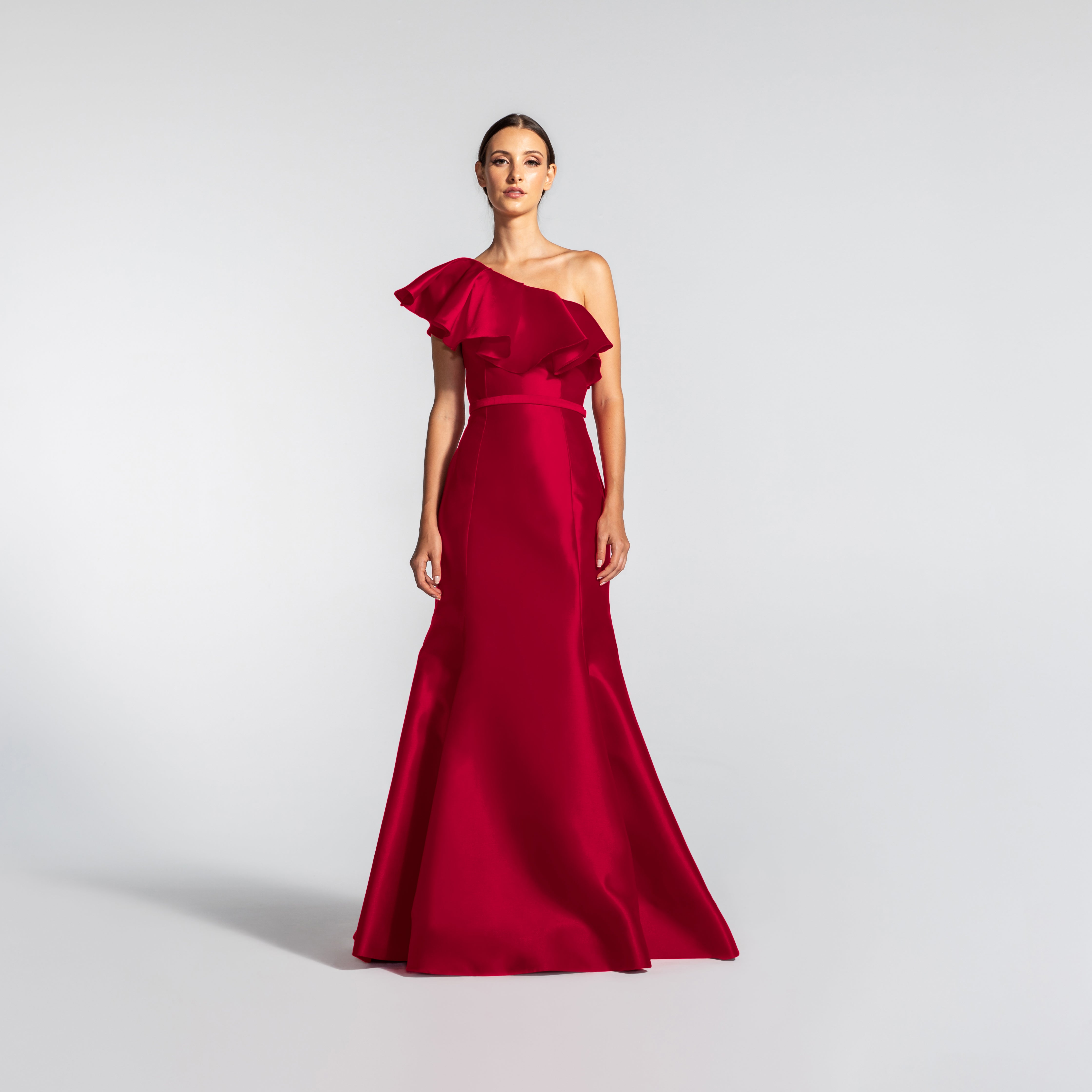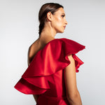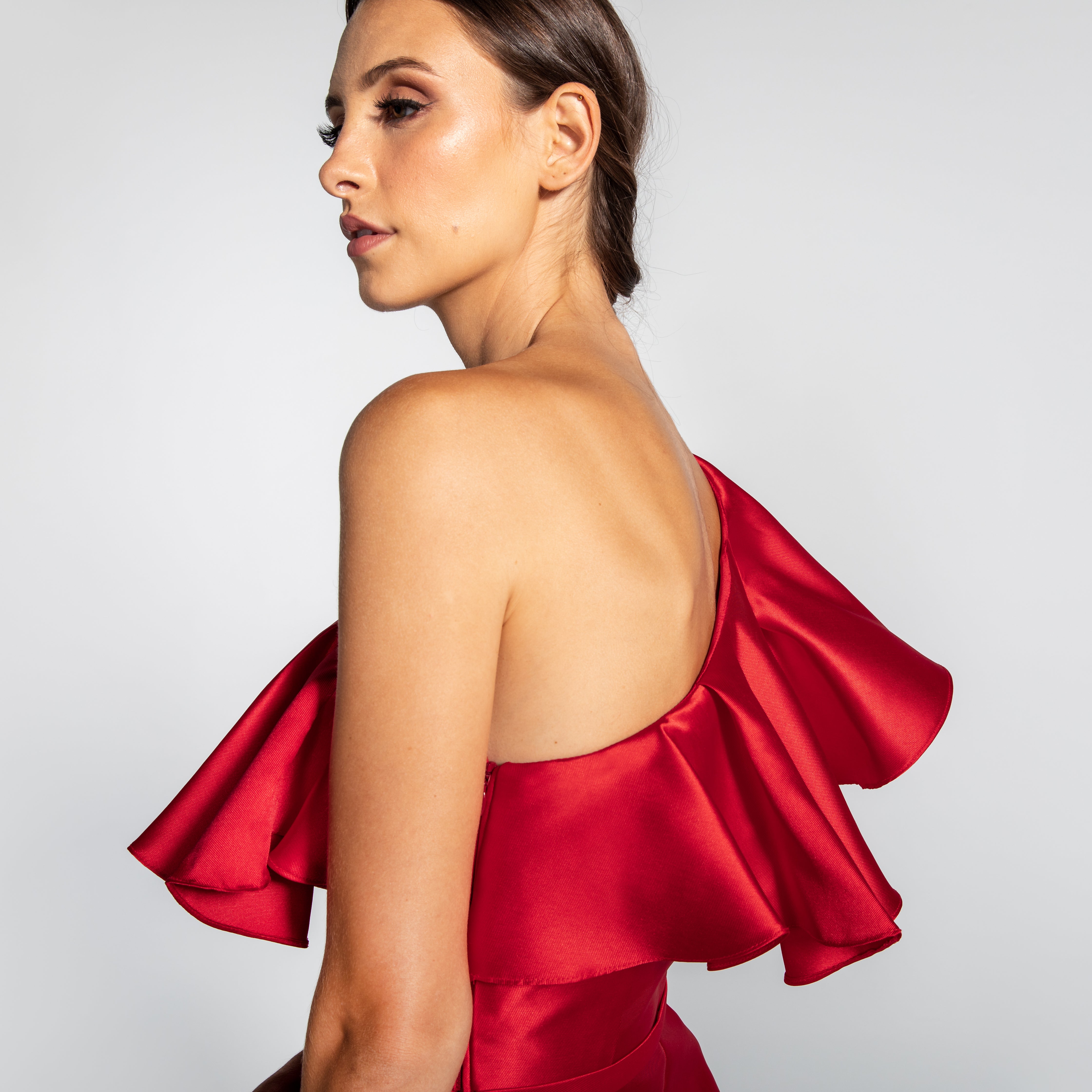 Com uma silhueta sereia marcante, este vestido combina elegância e ousadia. O decote de um ombro só é realçado por um babado escultural estilo jabô, que adiciona um toque de modernidade ao design ajustado. A cintura marcada por um cintinho fino realça as curvas, enquanto a saia sereia completa o visual sofisticado. Ideal para quem deseja evidenciar a silhueta com um detalhe dramático e impactante.
