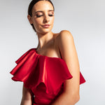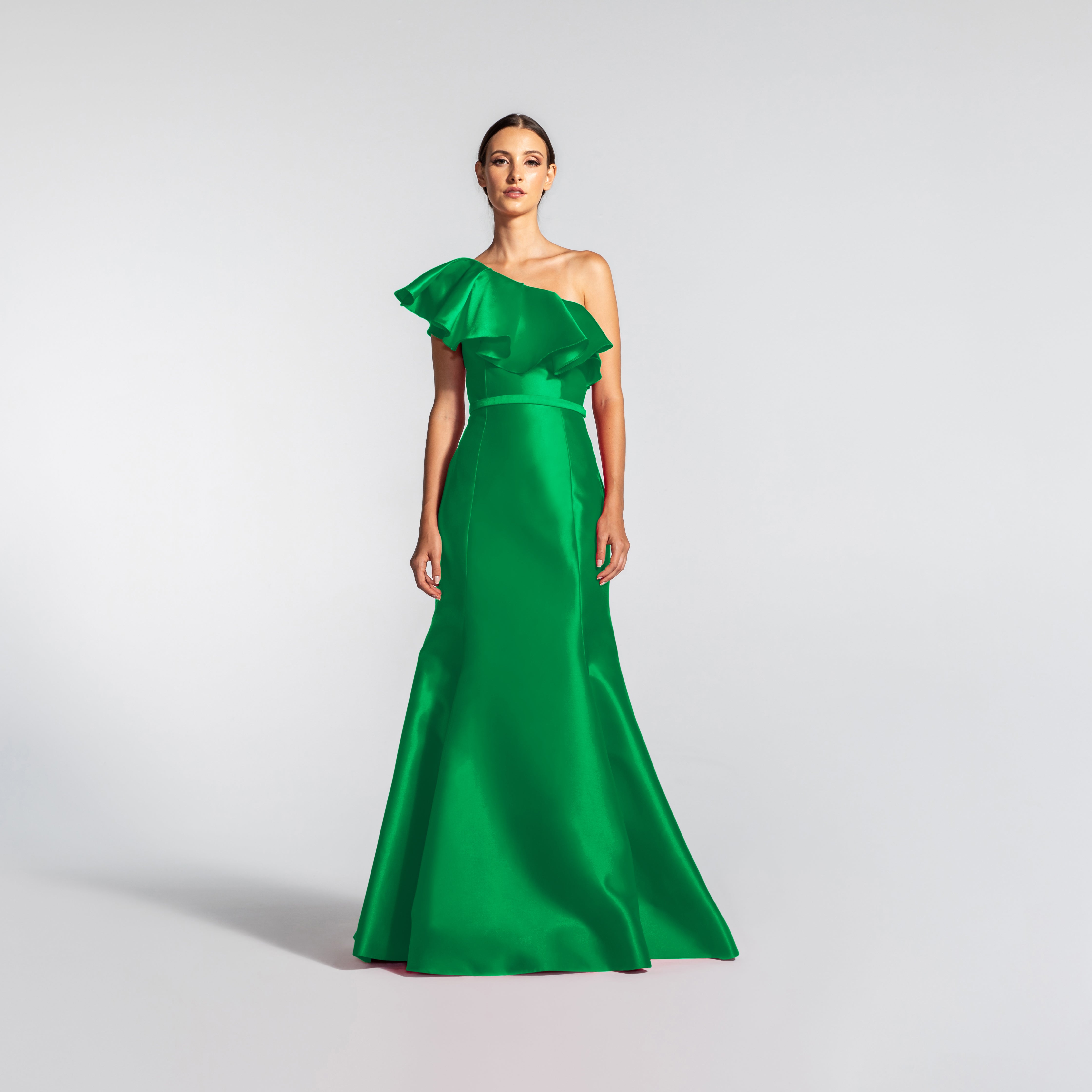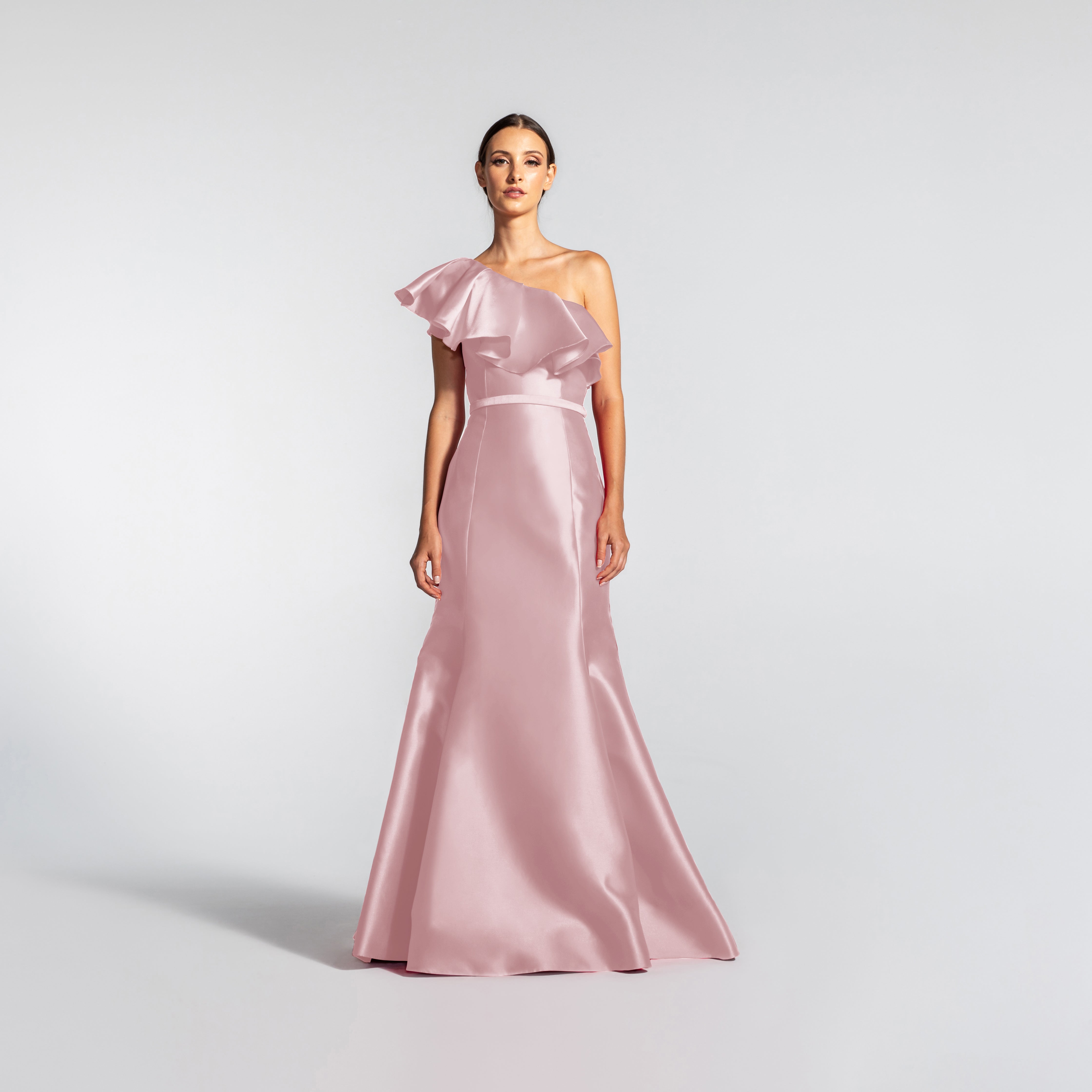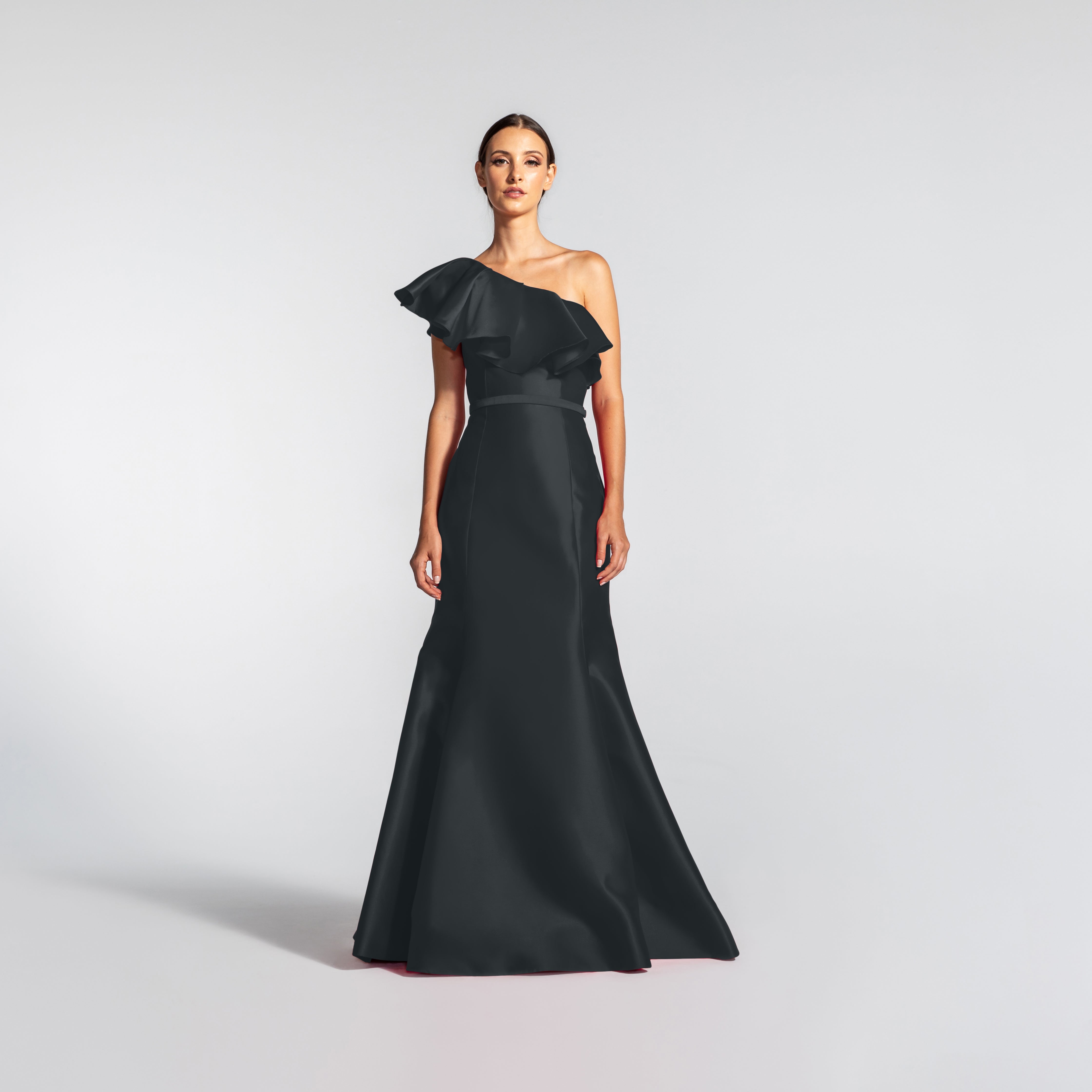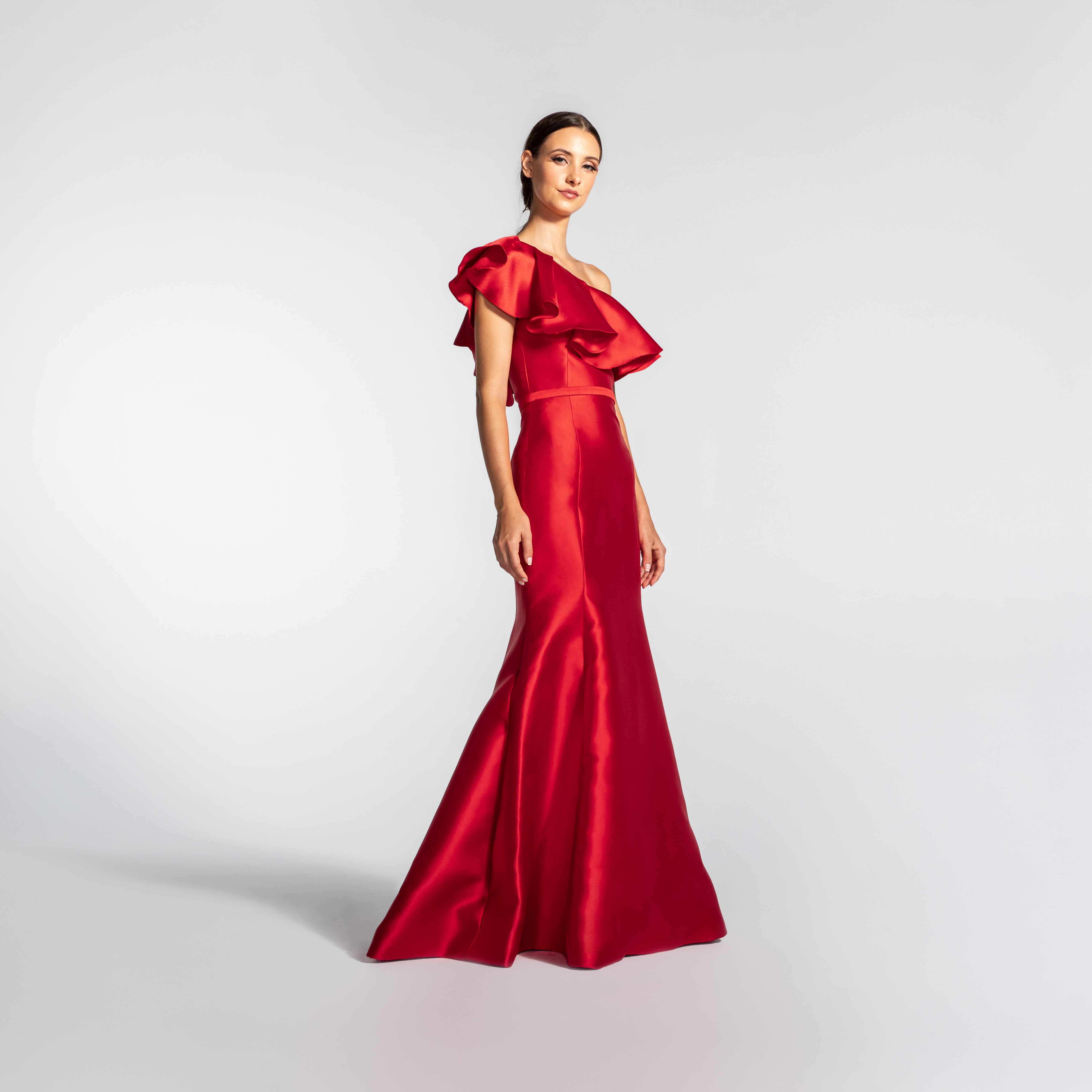 Com uma silhueta sereia marcante, este vestido combina elegância e ousadia. O decote de um ombro só é realçado por um babado escultural estilo jabô, que adiciona um toque de modernidade ao design ajustado. A cintura marcada por um cintinho fino realça as curvas, enquanto a saia sereia completa o visual sofisticado. Ideal para quem deseja evidenciar a silhueta com um detalhe dramático e impactante.