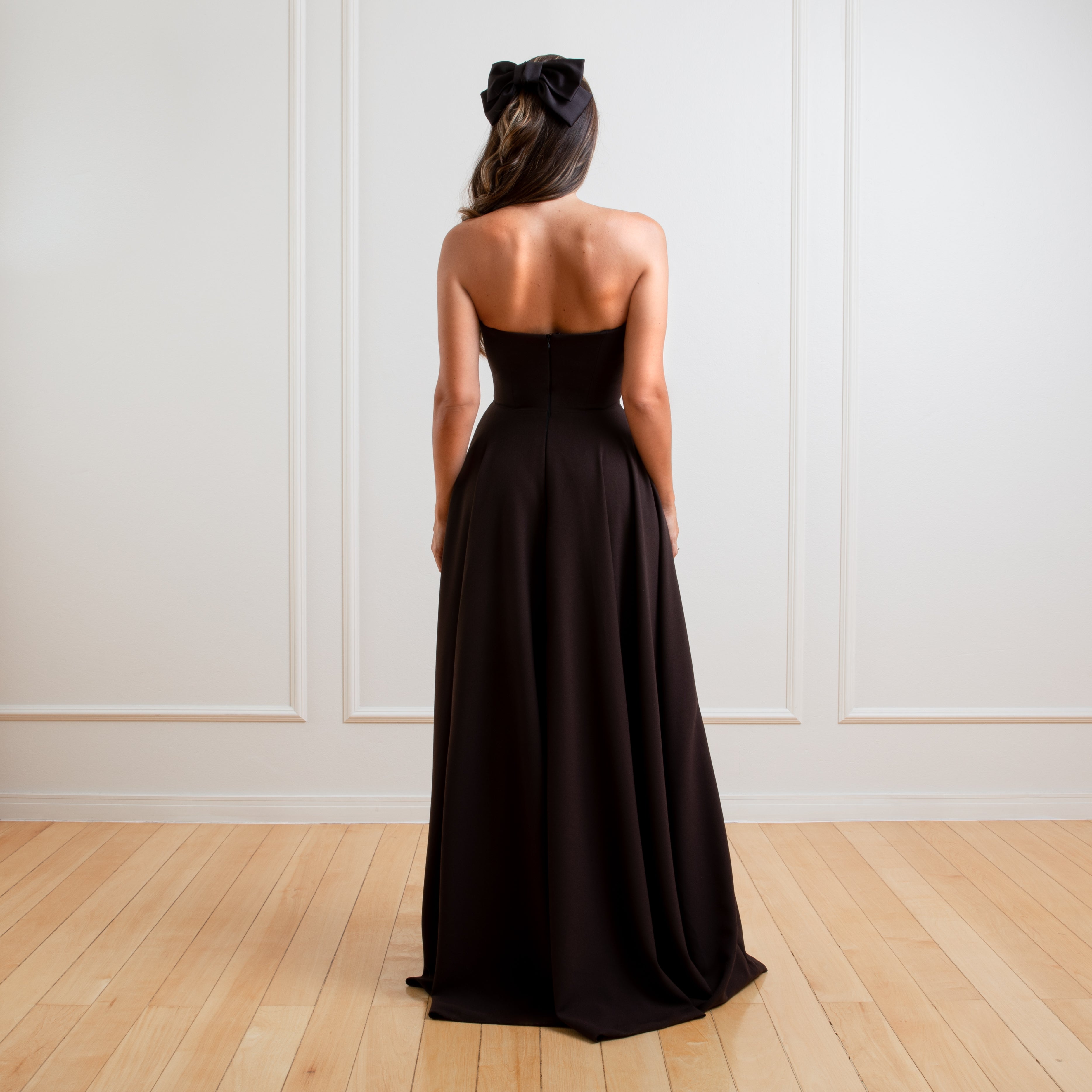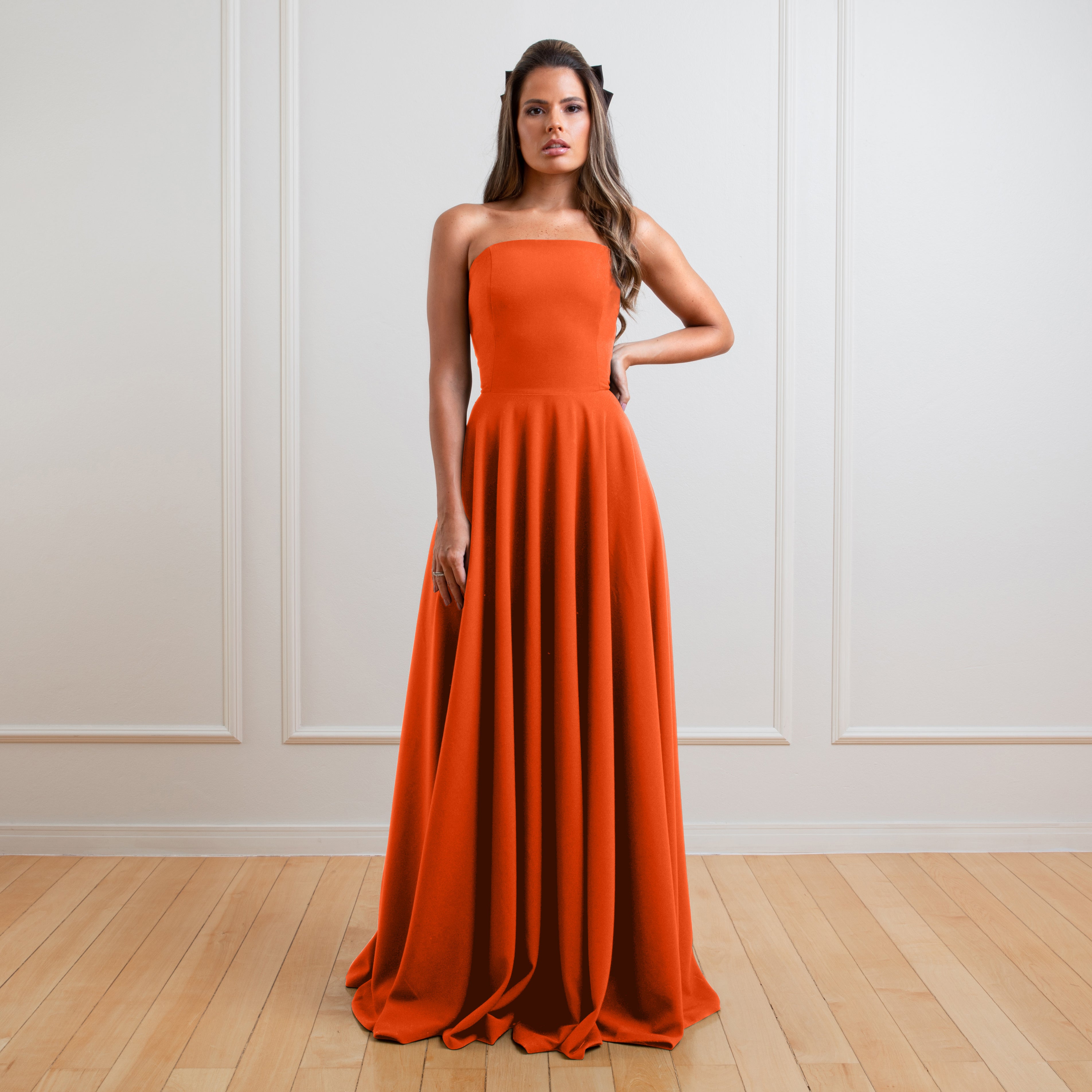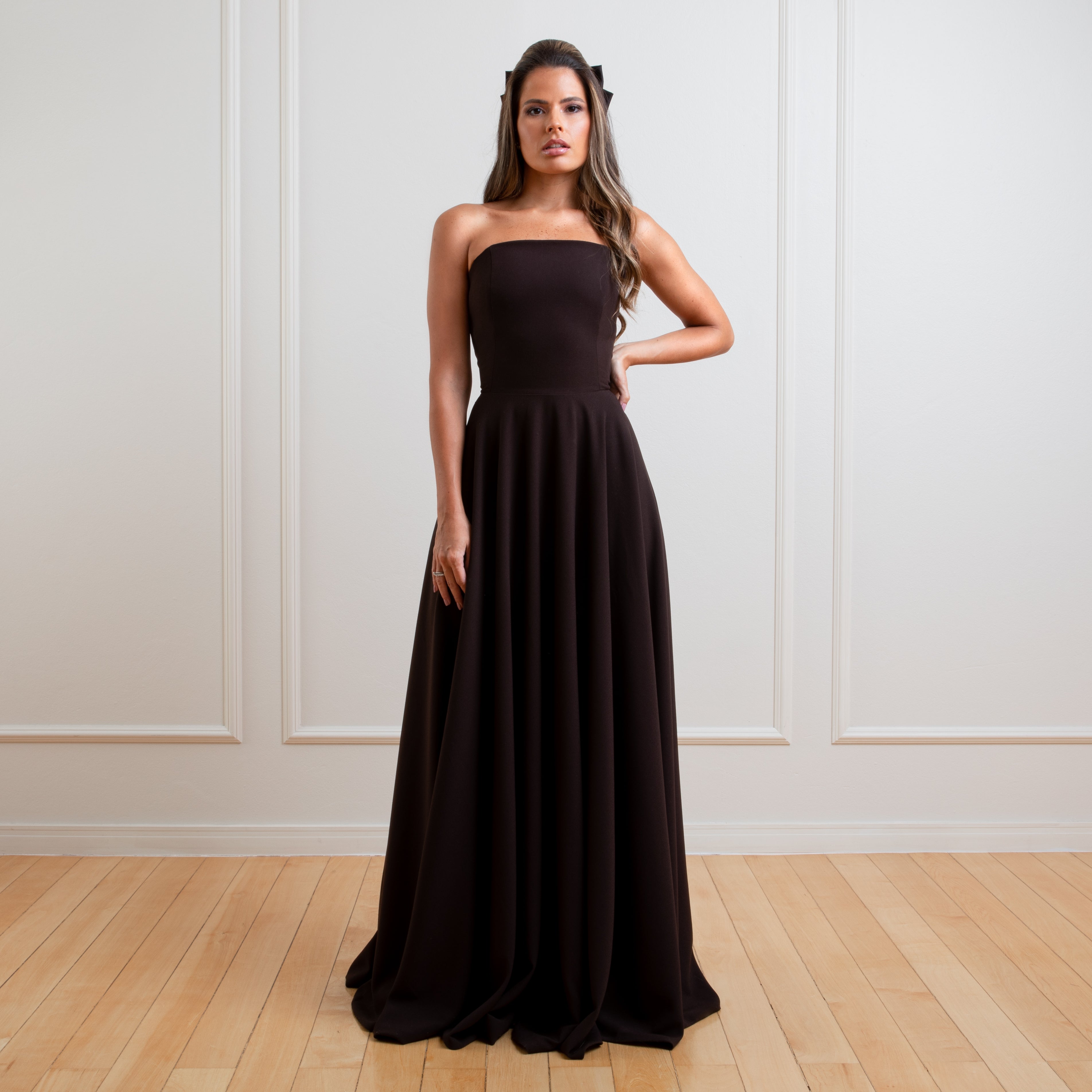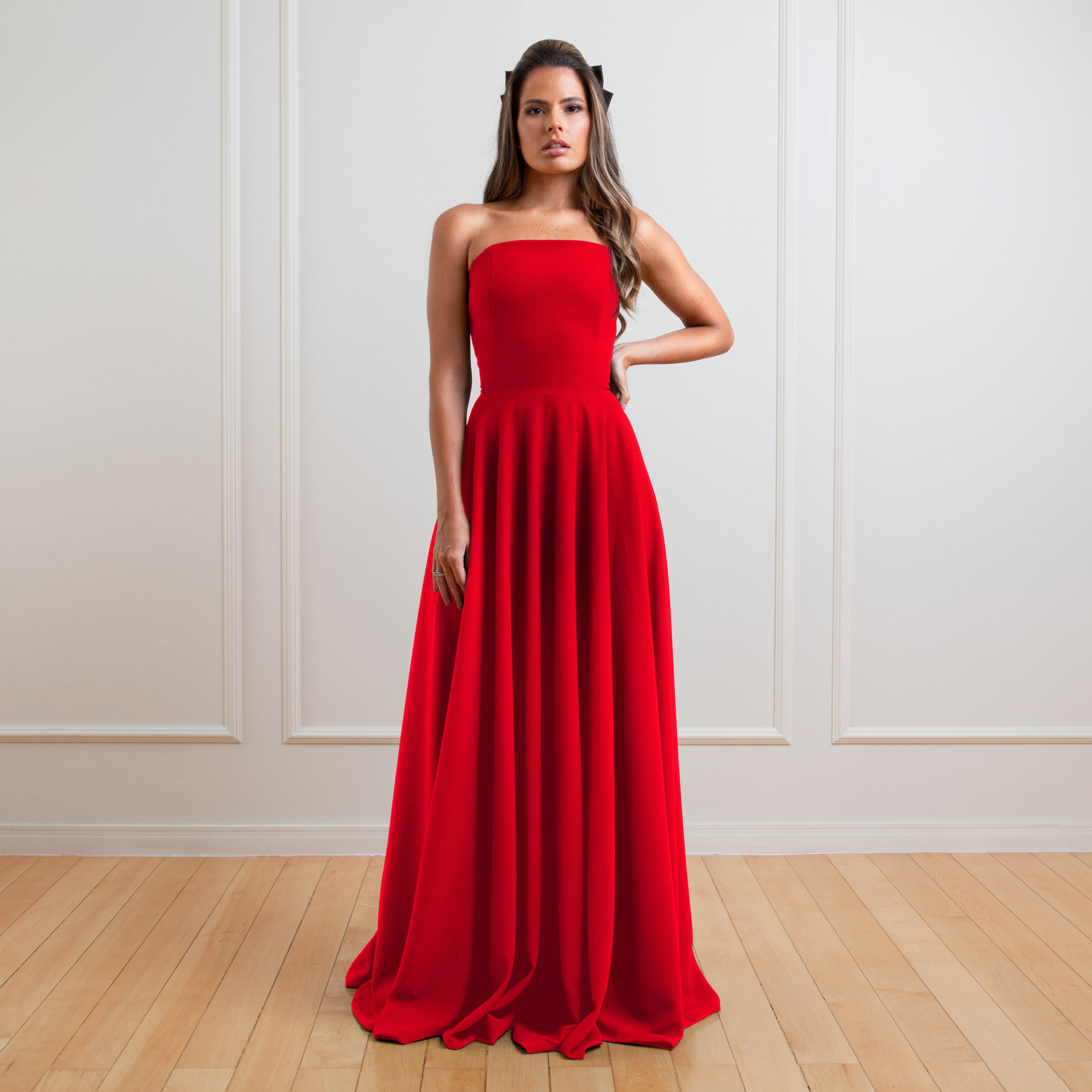 Um clássico reinventado. Este vestido tomara que caia, com estrutura impecável, valoriza a silhueta com um corpo ajustado e barbatanas que garantem firmeza. A saia ampla em godê confere movimento e leveza, tornando-se a base perfeita para ousar nos acessórios e criar diferentes estilos com um vestido atemporal e versátil.