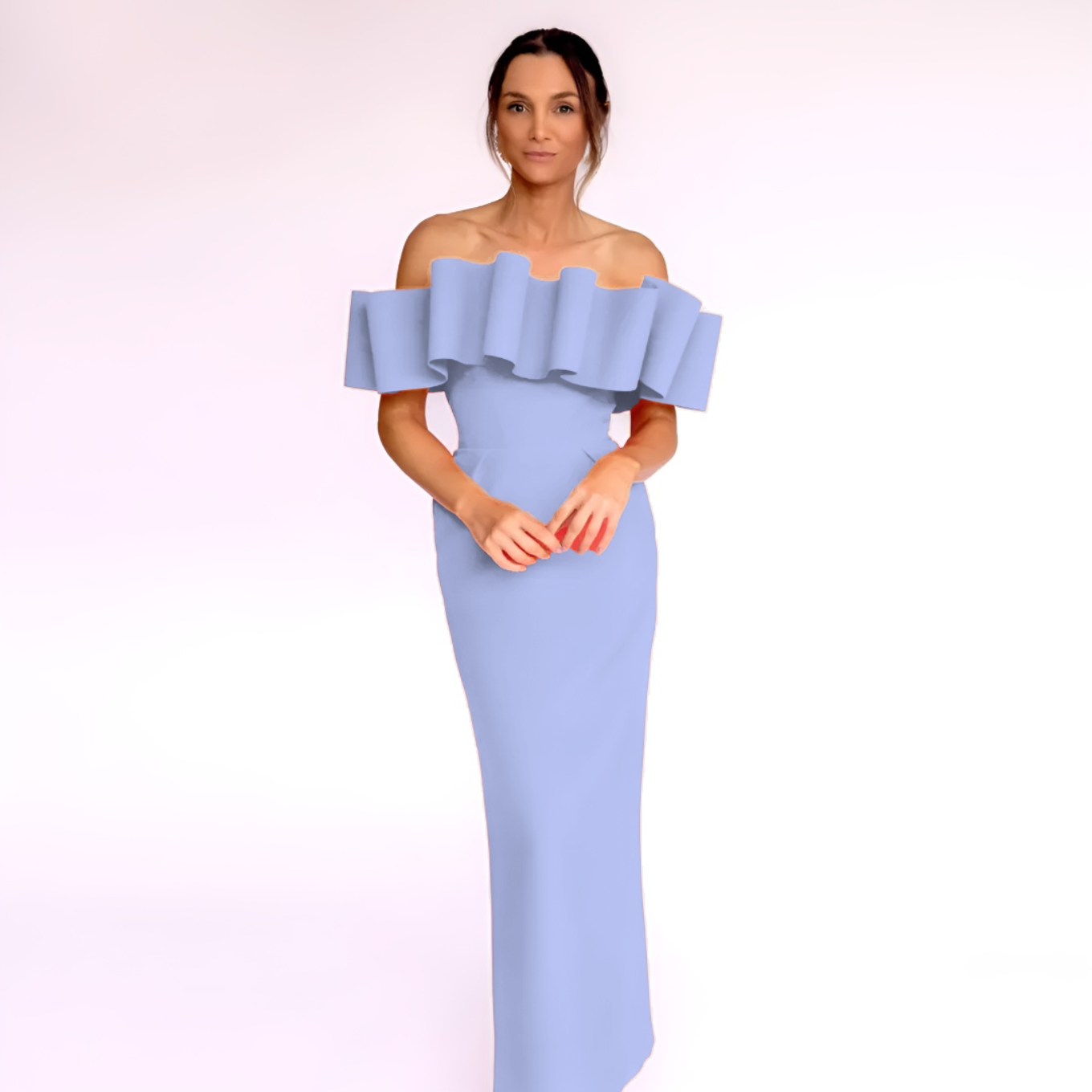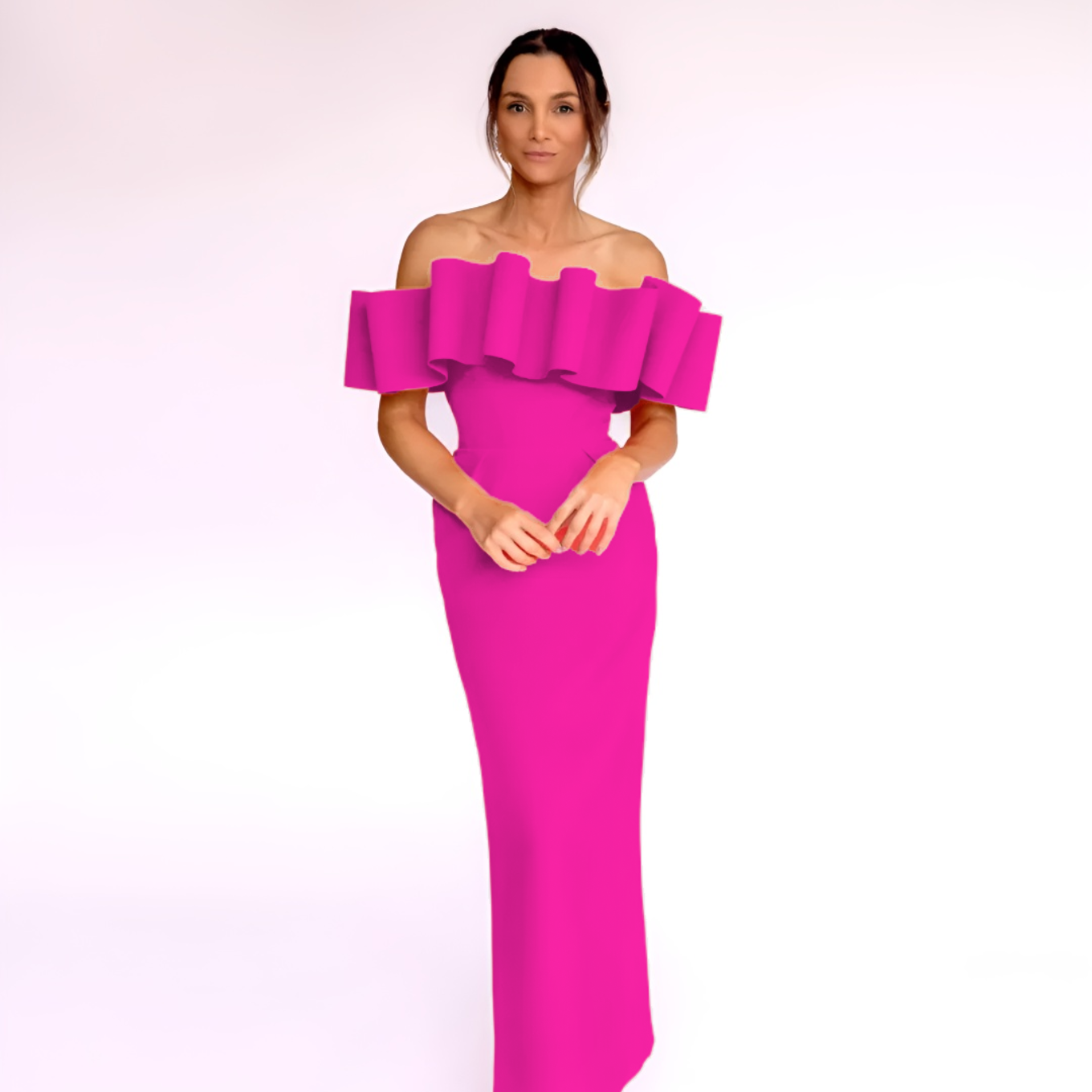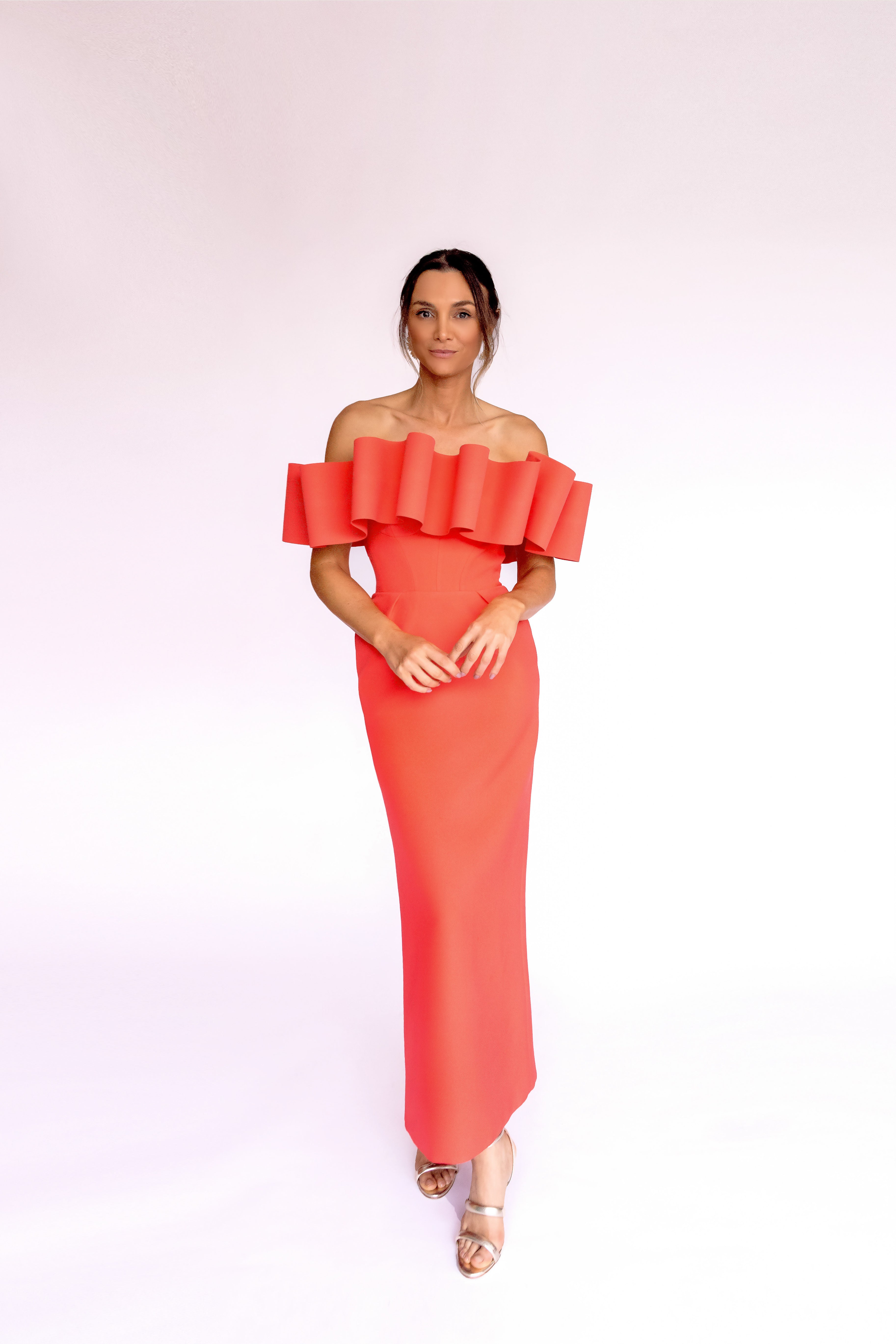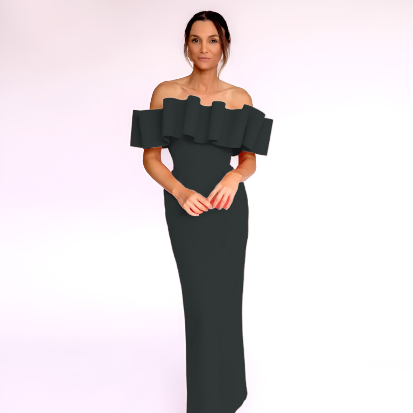 Simplesmente uma obra de arte. Confeccionado em crepe, este vestido une corte impecável e sofisticação absoluta. O corpo ajustado modela com perfeição, enquanto a saia reta com leves pregas garante um caimento elegante — justa na medida, sem colar ao corpo. O grande destaque é o decote ombro a ombro, formado por ondas esculturais que contornam o busto como uma verdadeira escultura em movimento. Um vestido feito para protagonistas: não compre se não estiver pronta para ser o centro de todos os olhares.