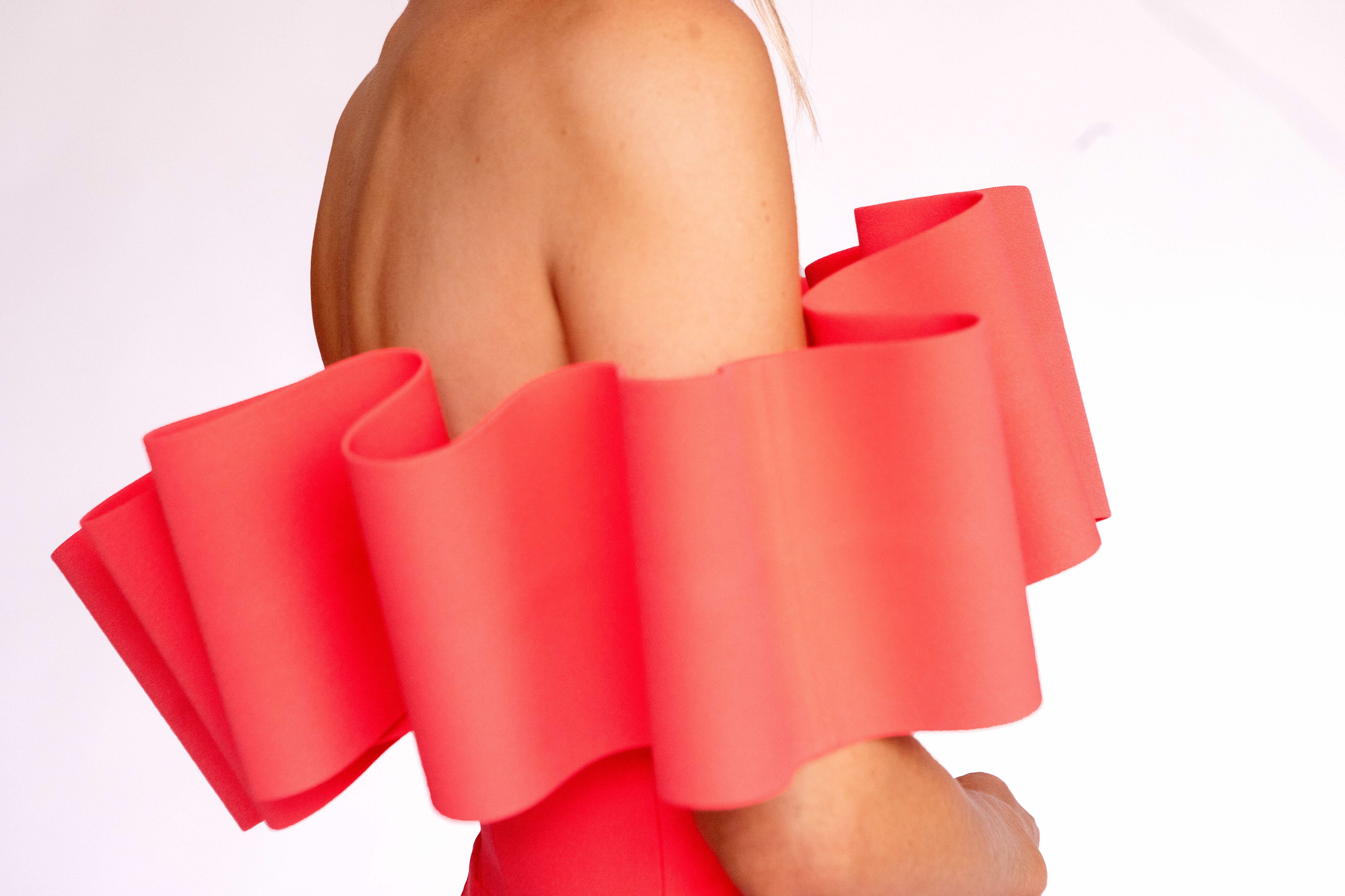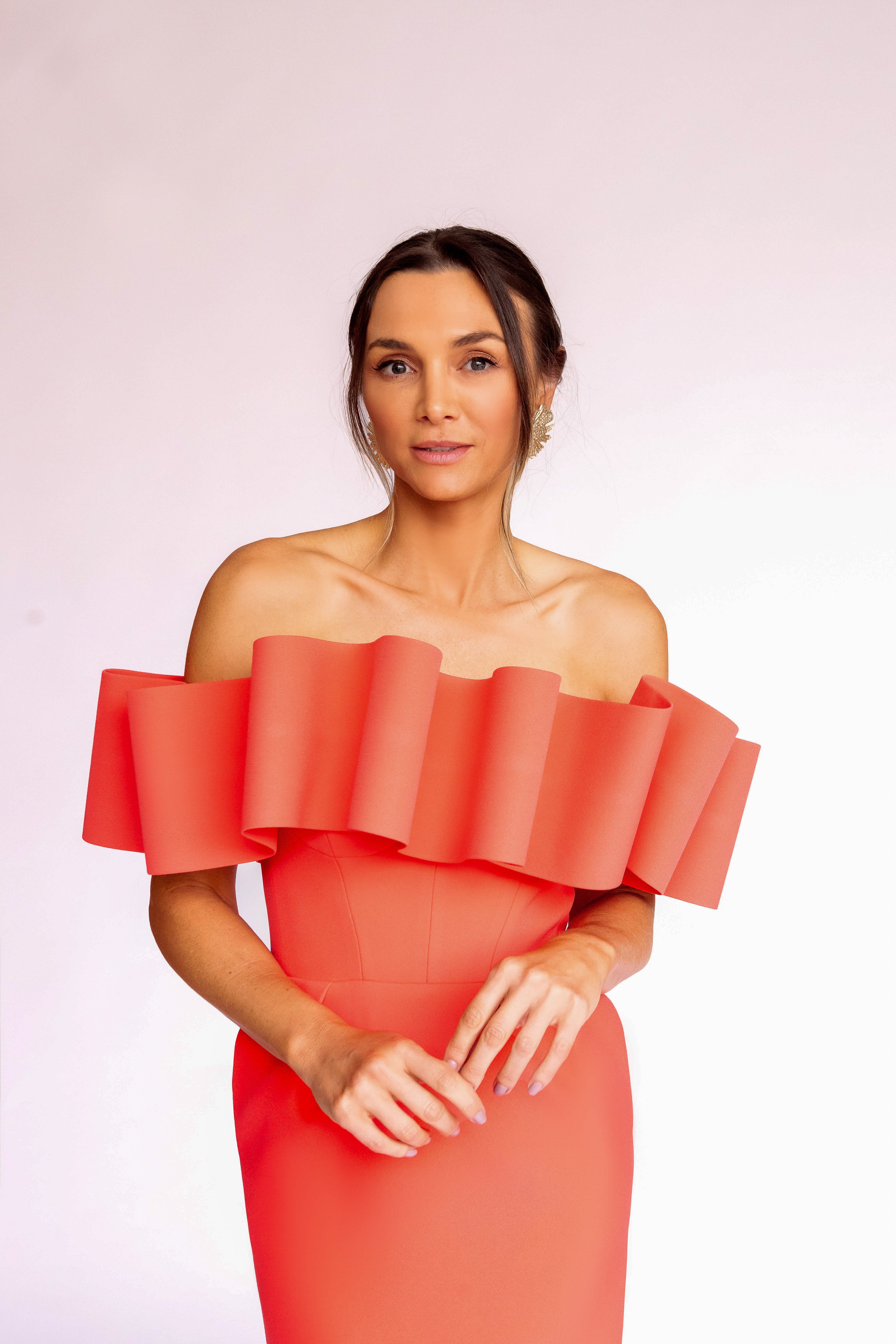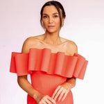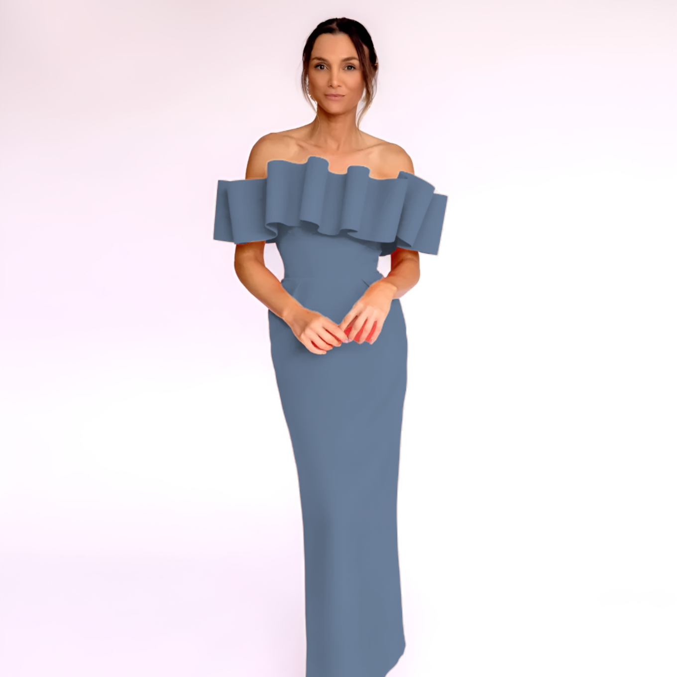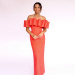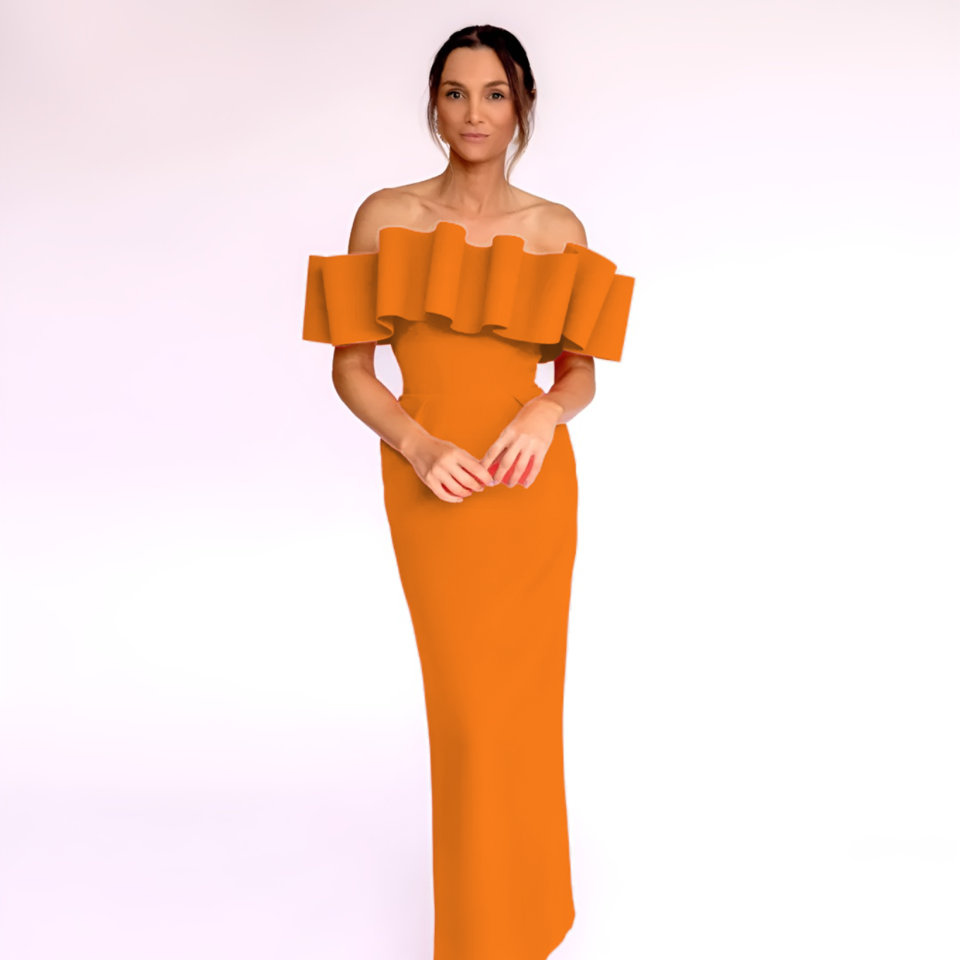 Simplesmente uma obra de arte. Confeccionado em crepe, este vestido une corte impecável e sofisticação absoluta. O corpo ajustado modela com perfeição, enquanto a saia reta com leves pregas garante um caimento elegante — justa na medida, sem colar ao corpo. O grande destaque é o decote ombro a ombro, formado por ondas esculturais que contornam o busto como uma verdadeira escultura em movimento. Um vestido feito para protagonistas: não compre se não estiver pronta para ser o centro de todos os olhares.