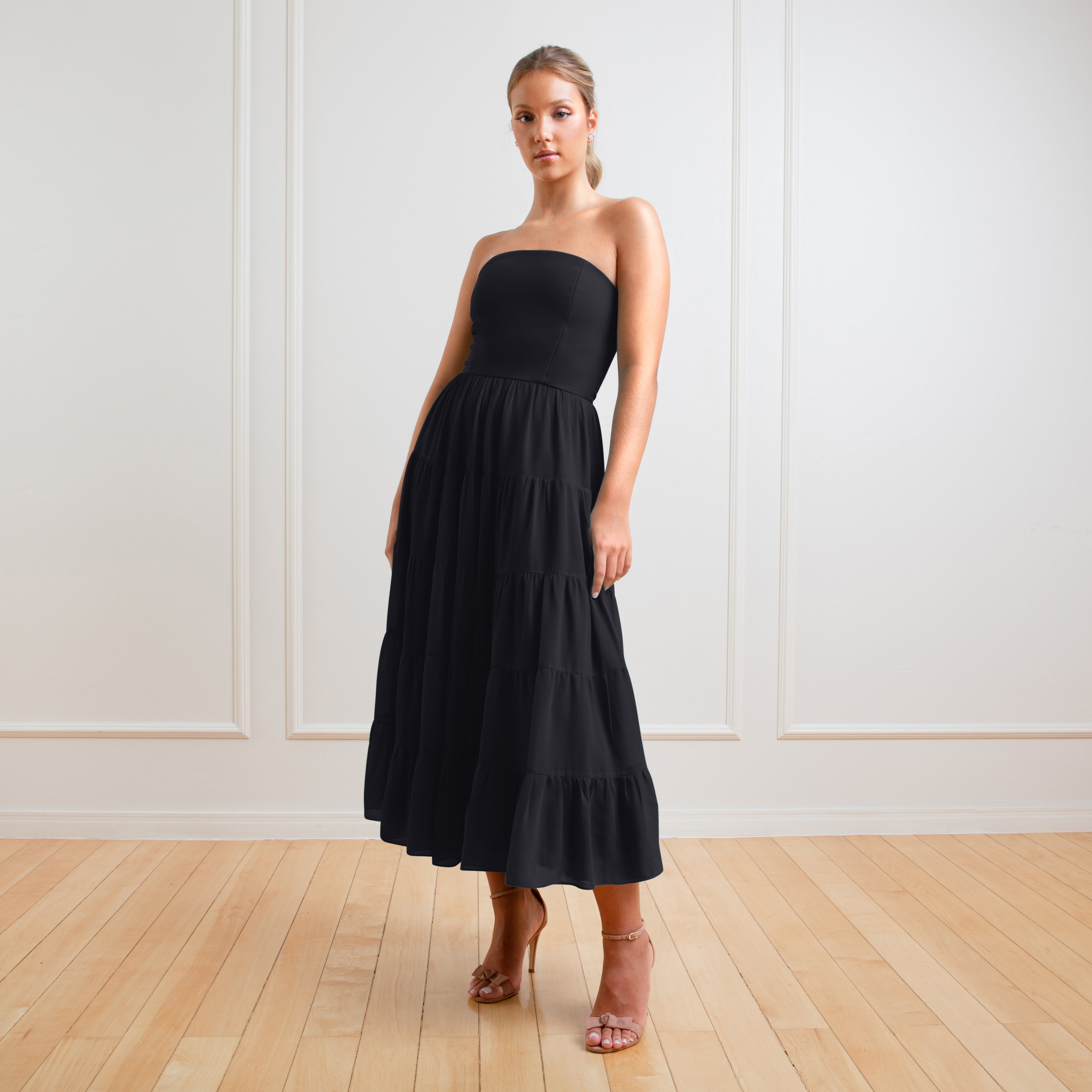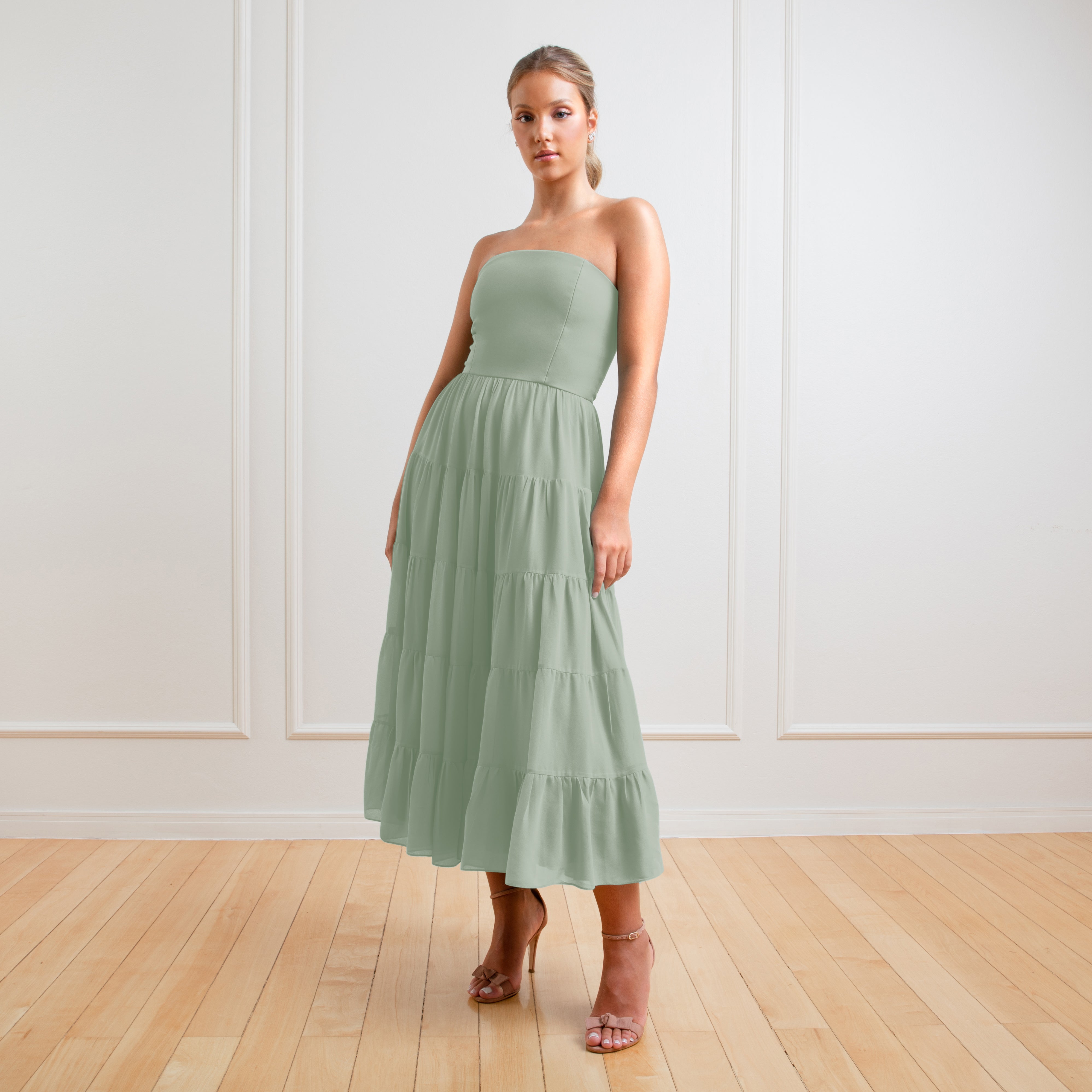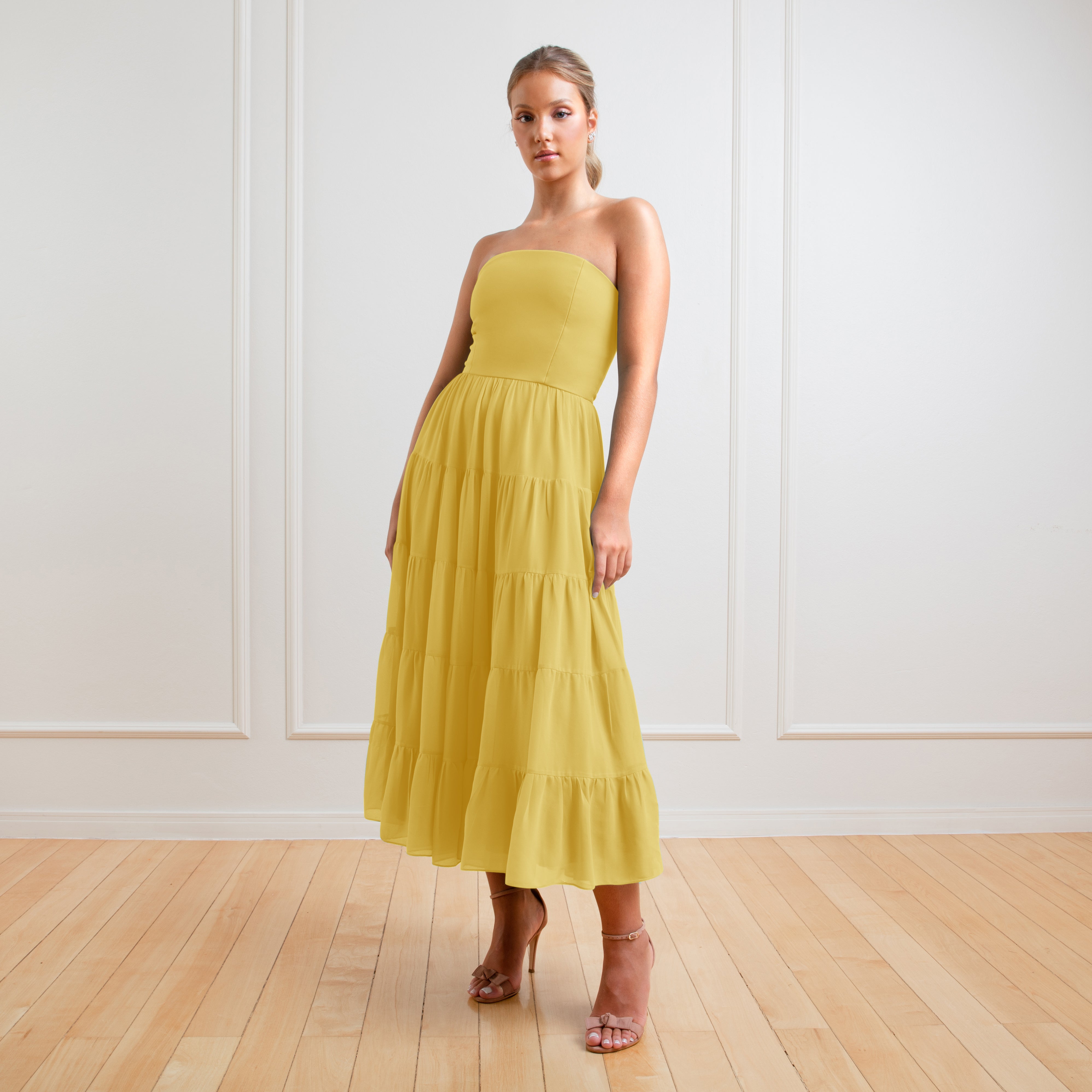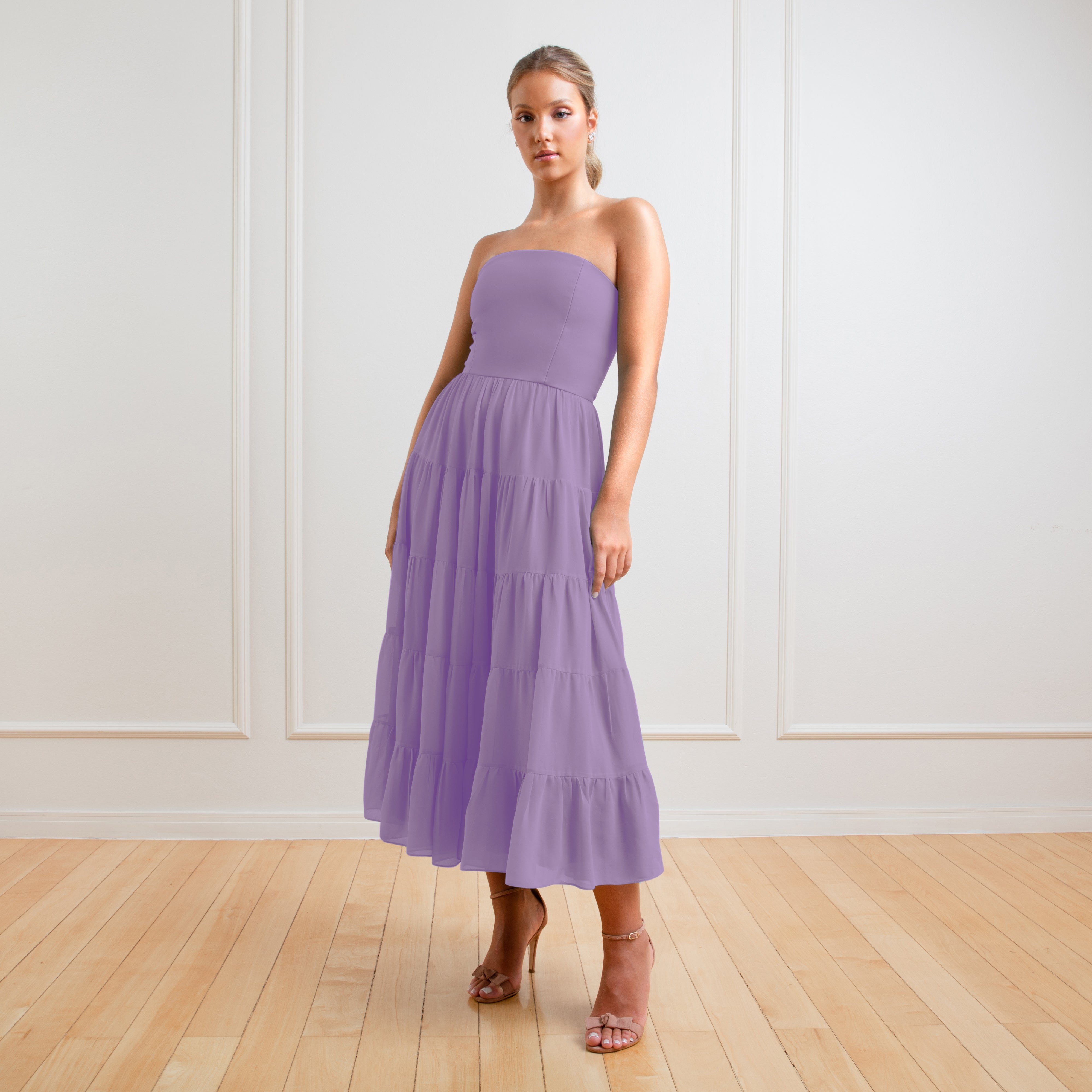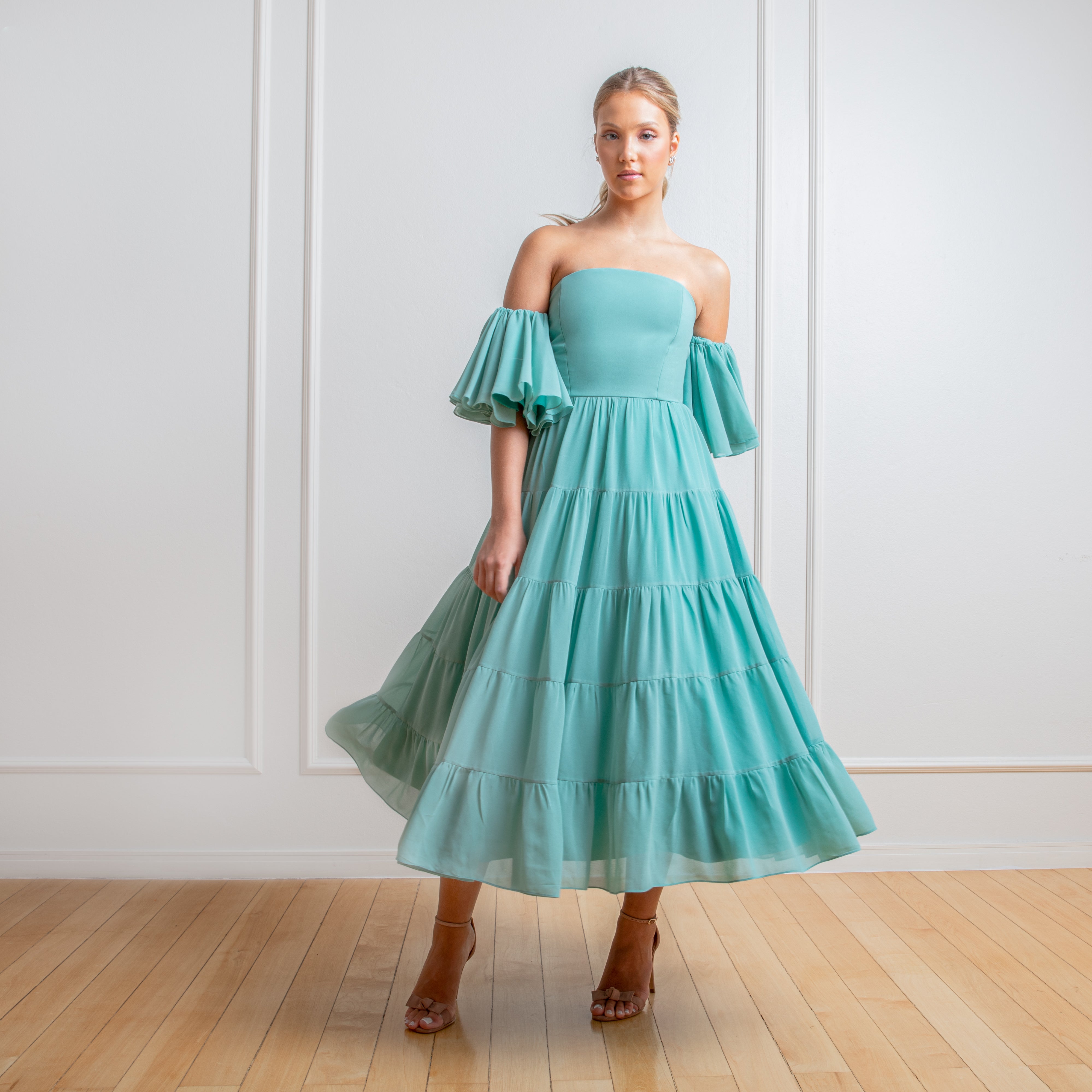 Com transparência leve e delicada, este vestido tomara que caia combina romance e modernidade. A saia em camadas estilo marias traz um movimento encantador, enquanto as mangas removíveis oferecem versatilidade para adaptar o look à ocasião. Uma peça cheia de charme e leveza, perfeita para momentos inesquecíveis. Conheça também as versões longa (EG01) e manga longa (EG01ML).