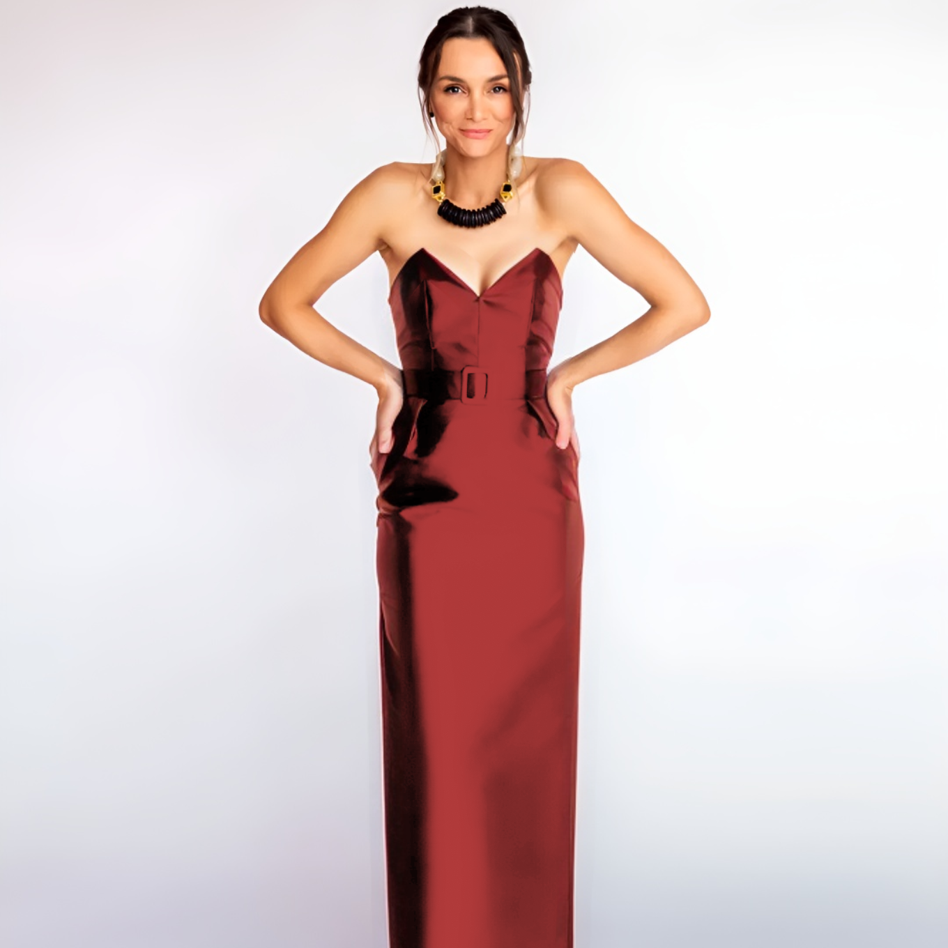 Nossos vestidos longos têm, por padrão, 117 cm de comprimento de saia, medidos a partir da cintura.