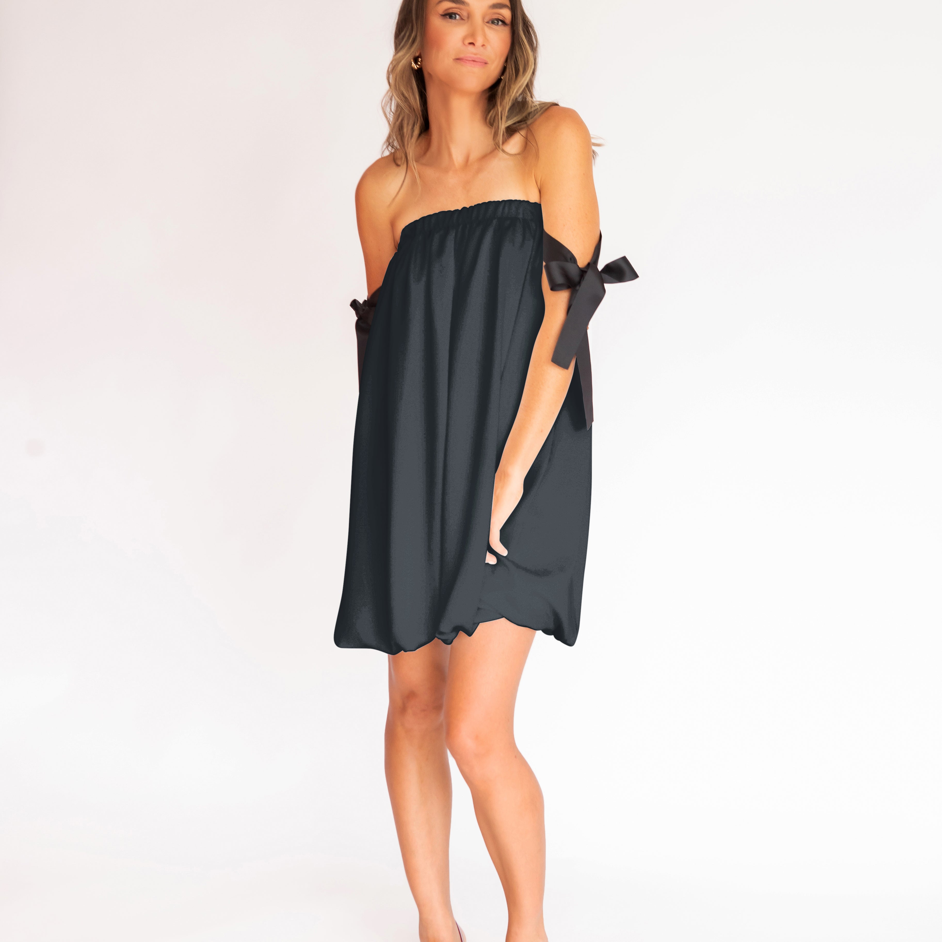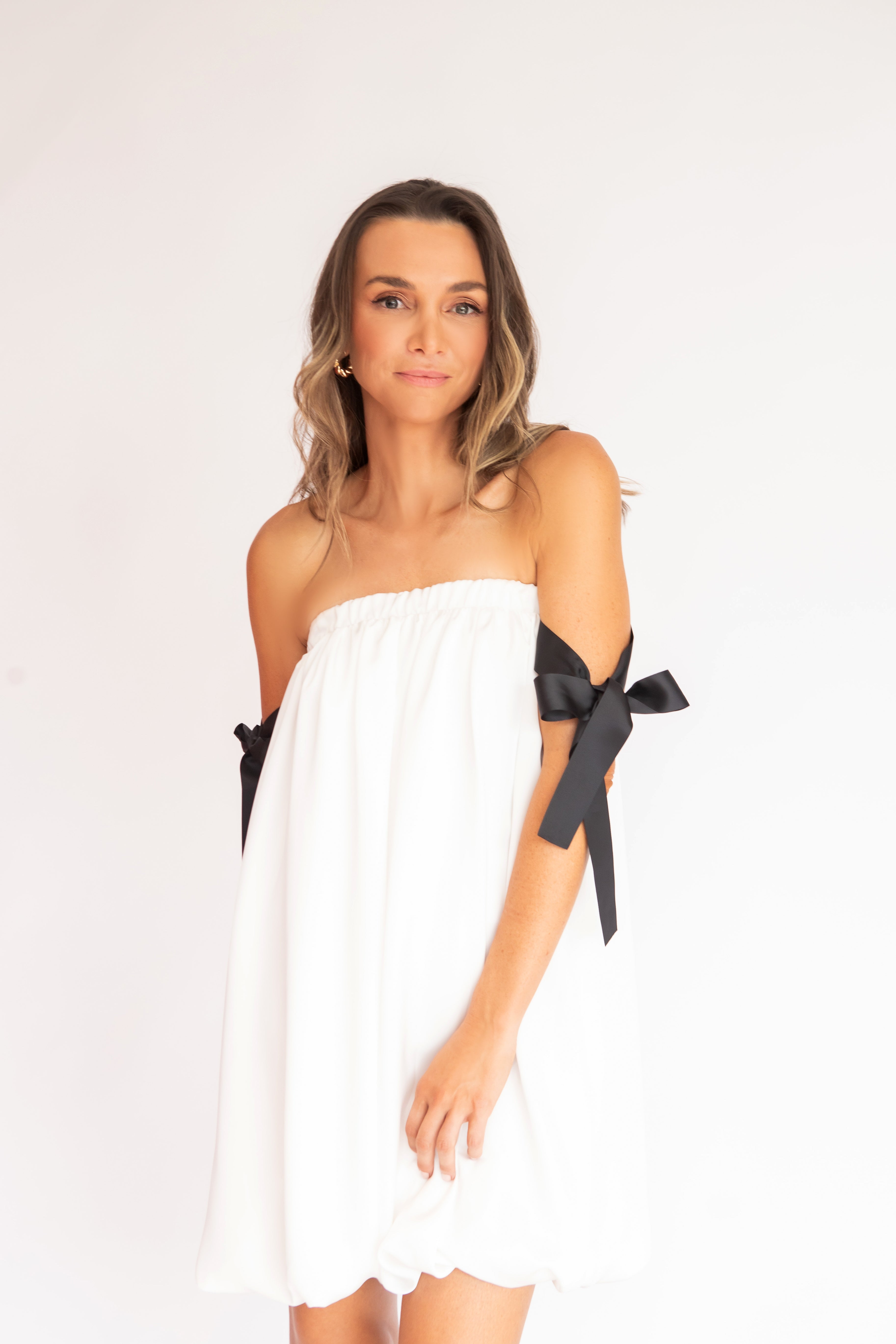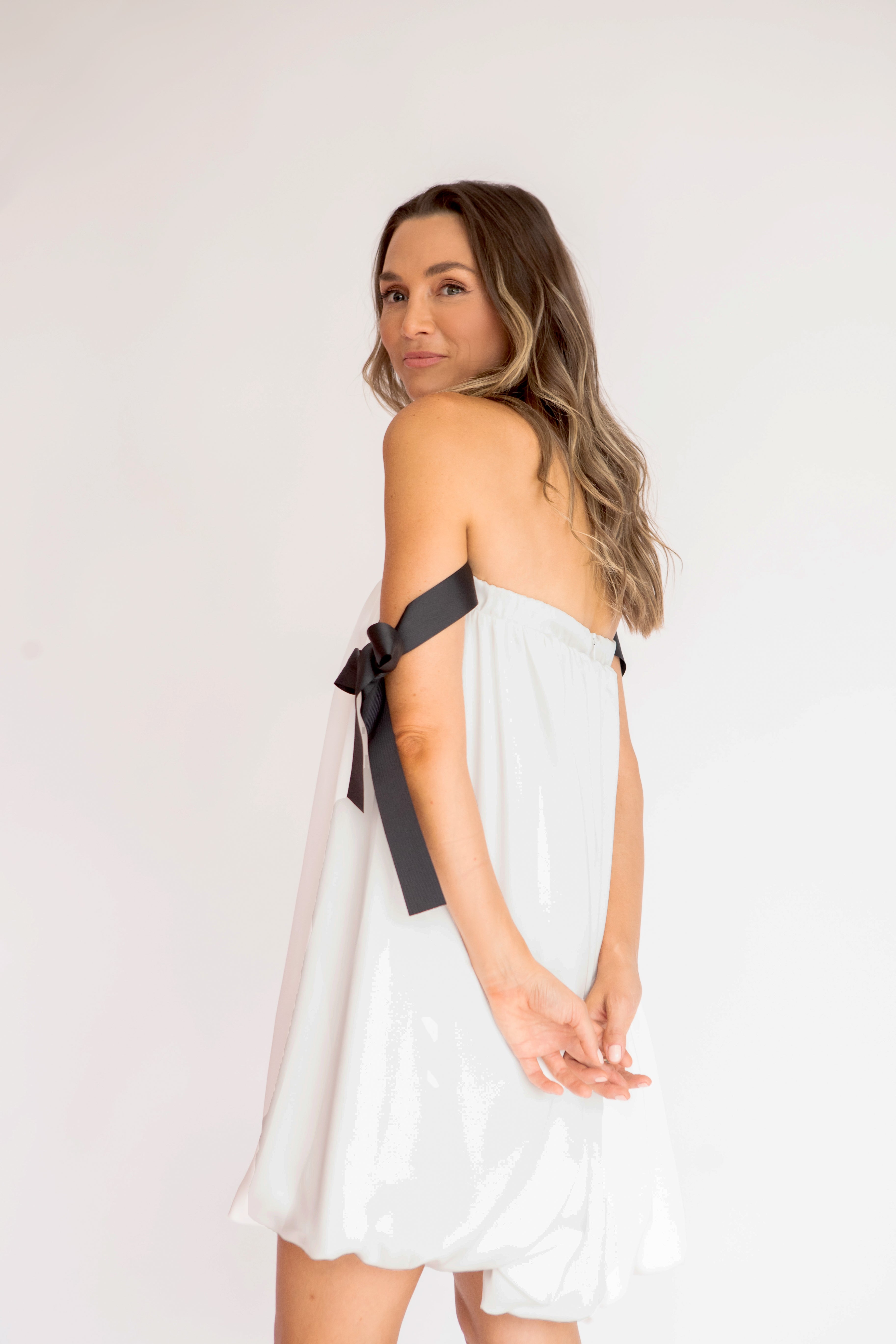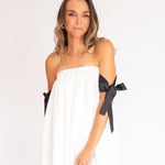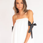 Charmoso e moderno, este vestido mini combina o decote tomara que caia franzido com alças laterais em fitas pretas estilo gorgurão, criando um contraste elegante e contemporâneo. O corpo solto com efeito balonê traz leveza e fluidez, sem marcar a cintura, ideal para quem busca conforto com estilo. Uma peça divertida, fluida e sofisticada na medida certa.