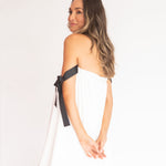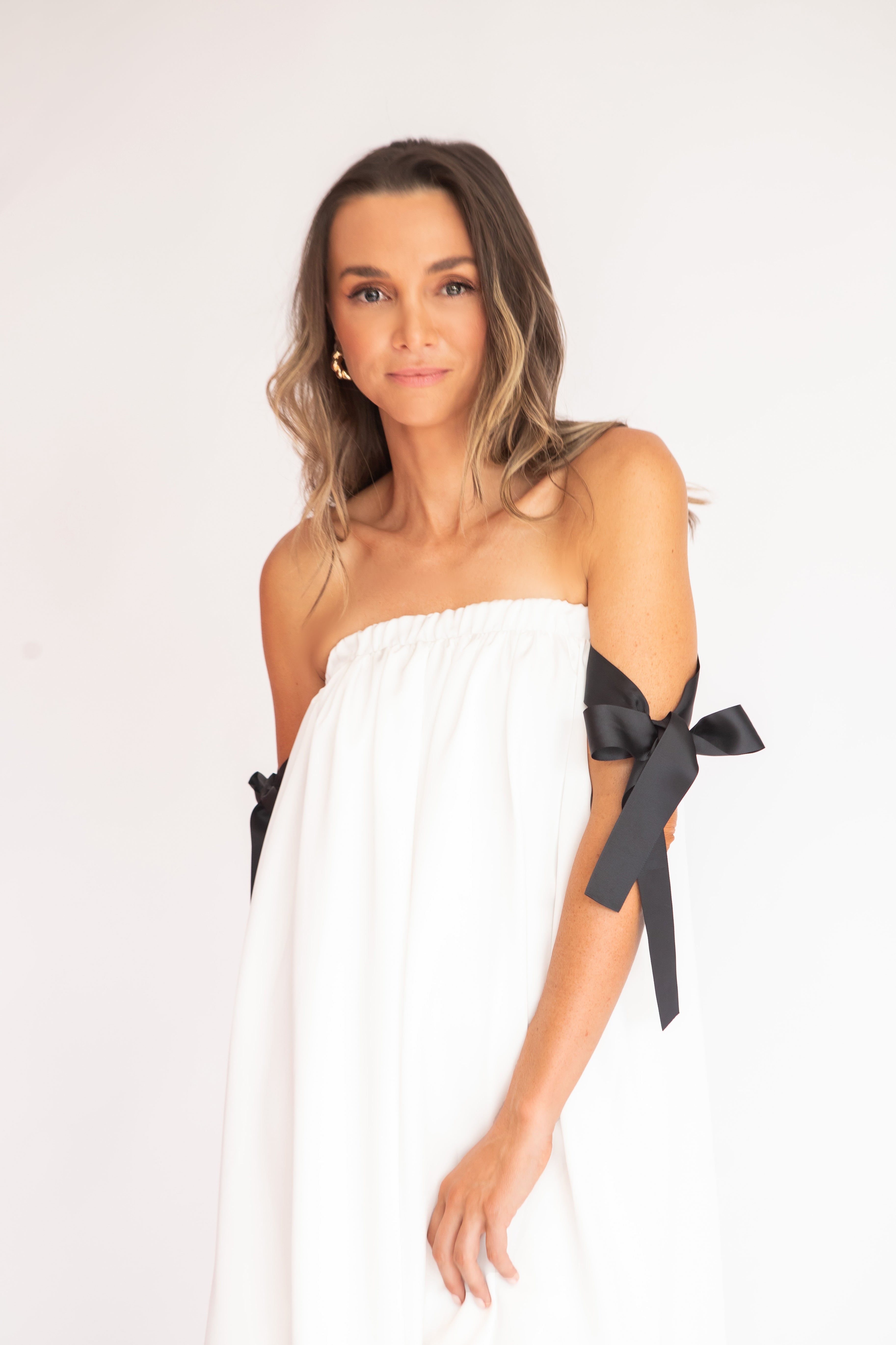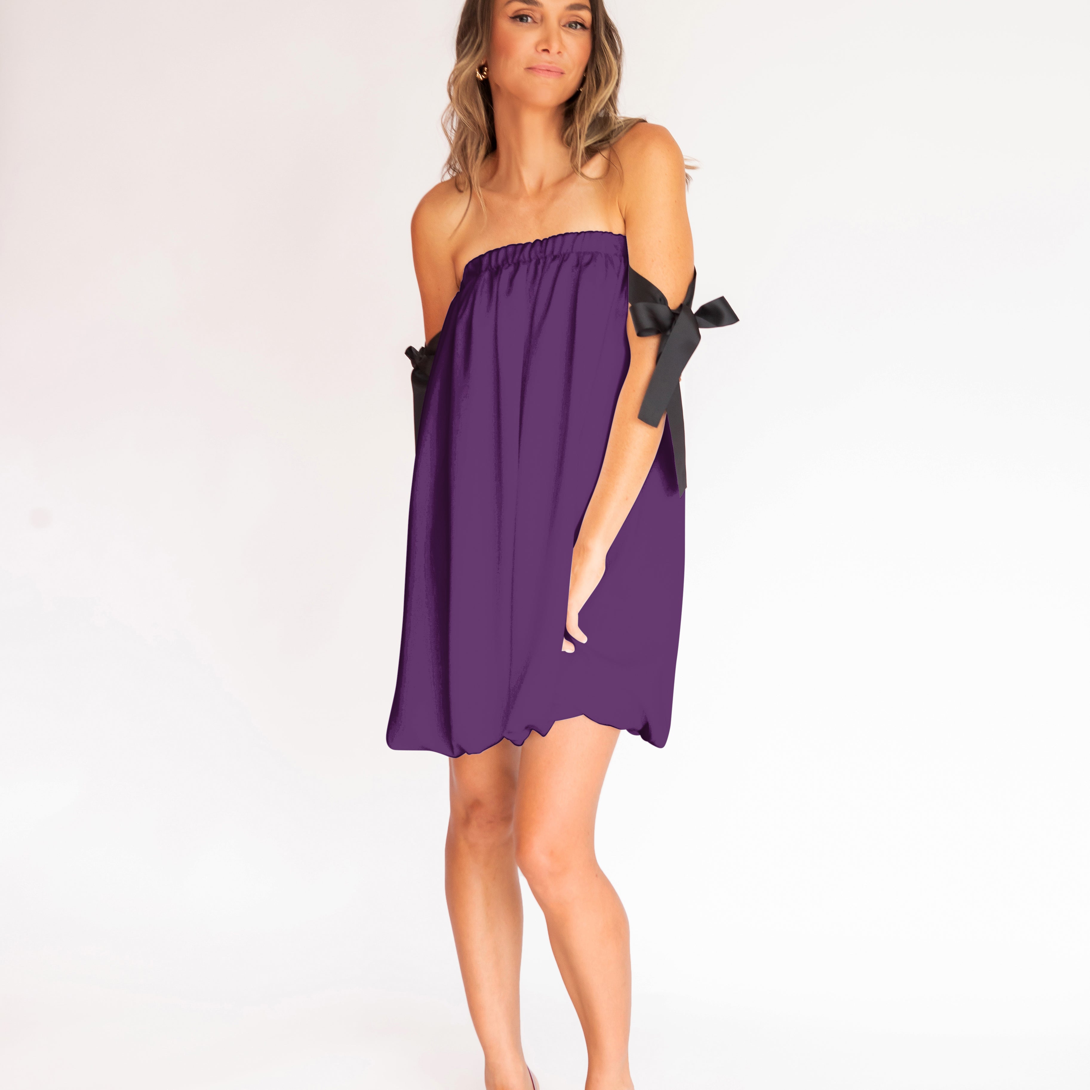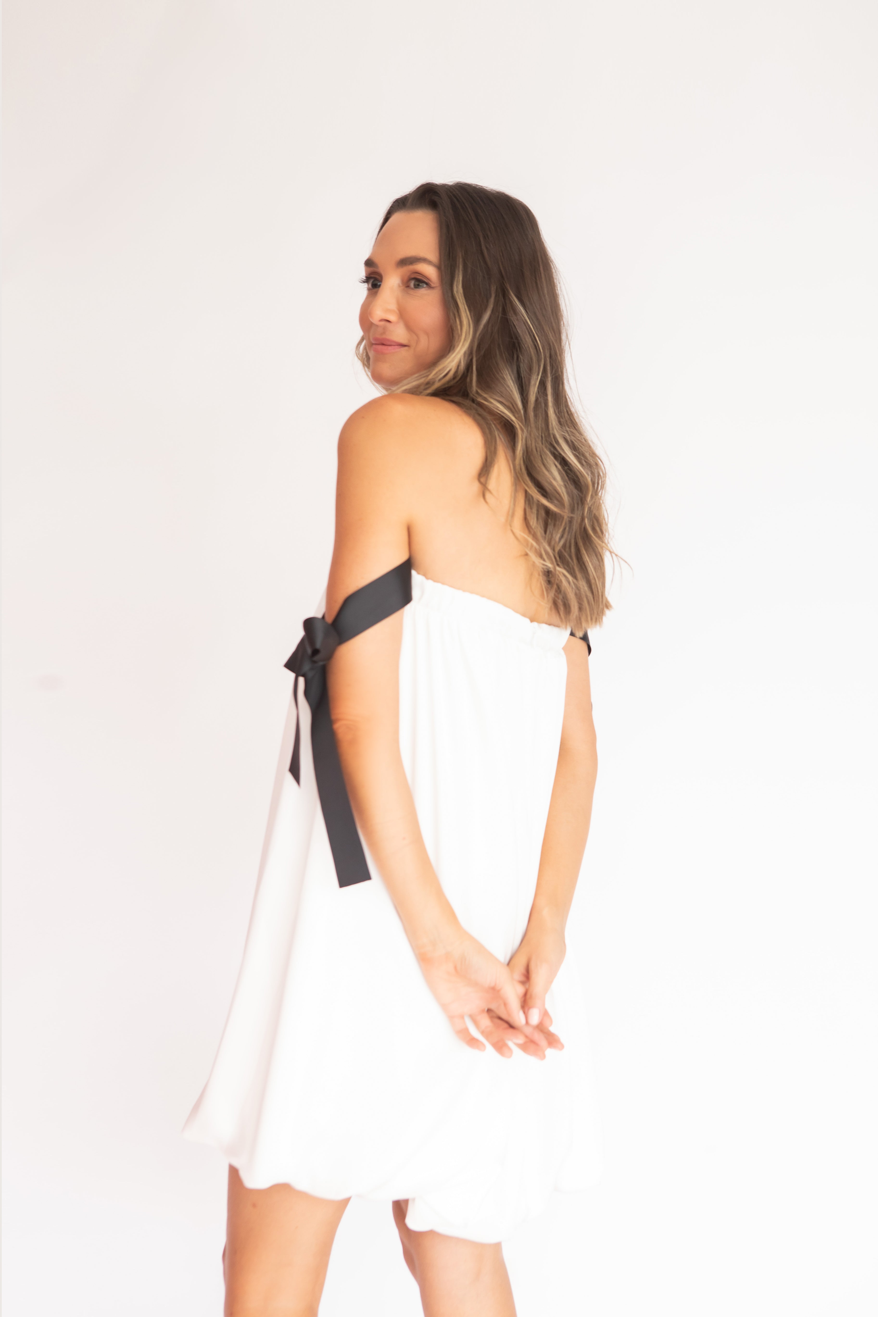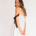 Charmoso e moderno, este vestido mini combina o decote tomara que caia franzido com alças laterais em fitas pretas estilo gorgurão, criando um contraste elegante e contemporâneo. O corpo solto com efeito balonê traz leveza e fluidez, sem marcar a cintura, ideal para quem busca conforto com estilo. Uma peça divertida, fluida e sofisticada na medida certa.